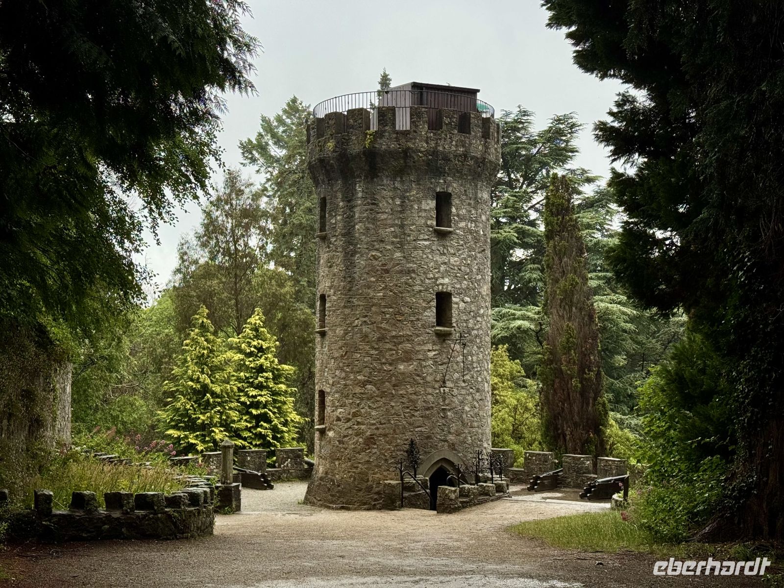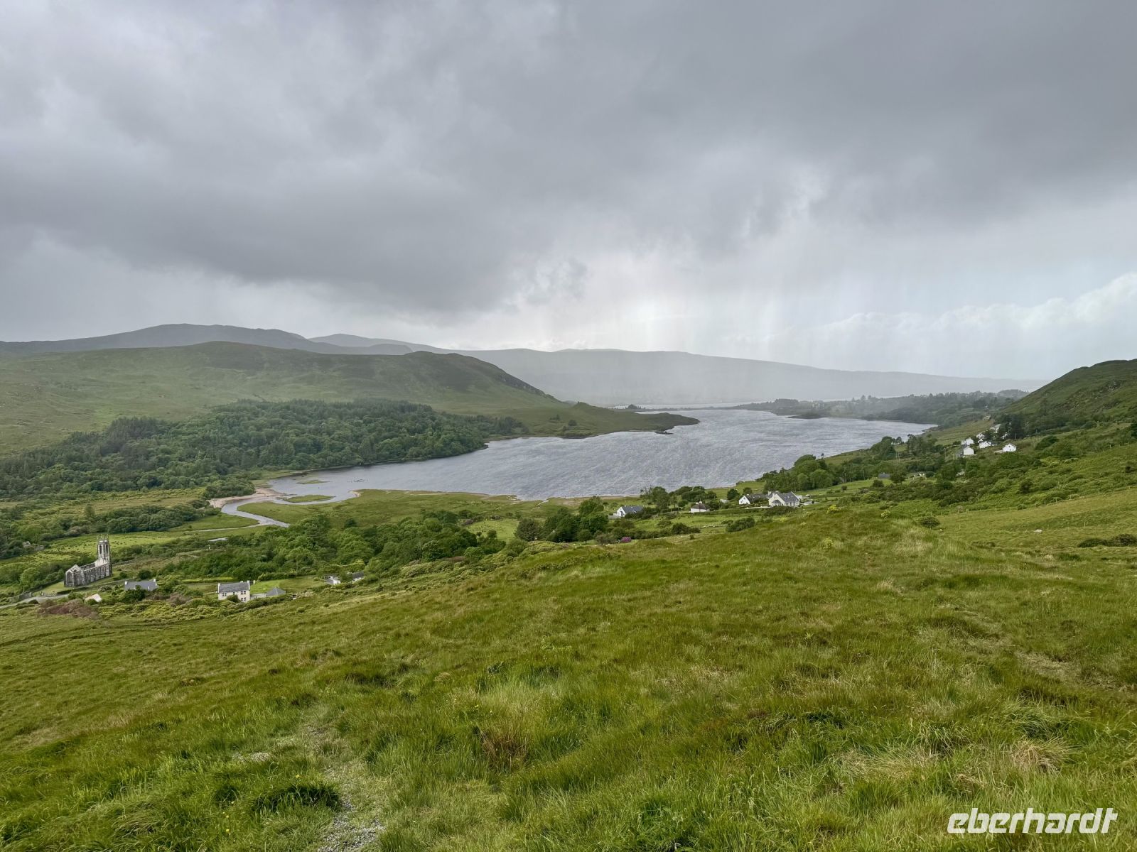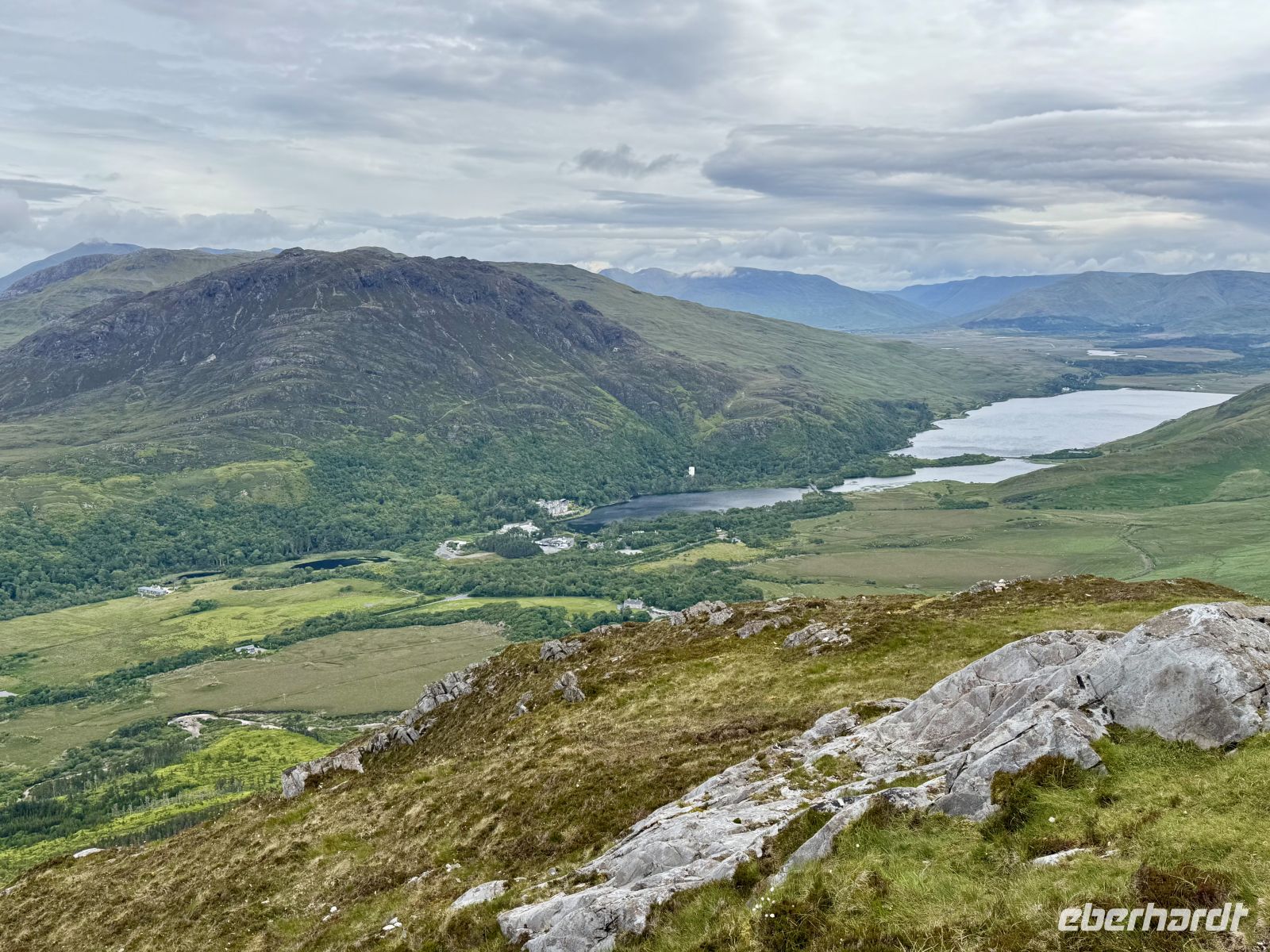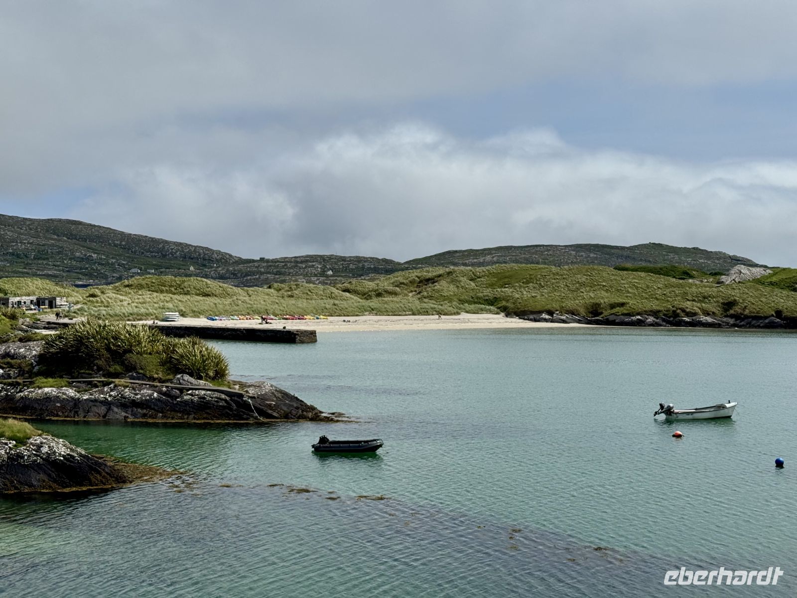 Bewölkt, aber kein Regen für den Tag — so lautet beim Frühstück Donals Prognose nach einem Blick auf sein Telefon. Nun, er ist zu seinem Glück (ein sehr guter) Busfahrer und kein Meteorologe, sonst hätte ich heute wohl Donald Trump zitieren müssen: „You're fired!“ Im Glenveagh-Nationalpark können wir nach der Filmvorführung im Besucherzentrum nämlich nicht direkt zu unserer Wanderung aufbrechen, sondern müssen uns am Castle erstmal einen Unterschlupf suchen. Um es positiv zu formulieren: perfekte Testbedingungen für meine neue Regenhose! Geduld ist in Irland wettertechnisch immer hilfreich, denn die nächste Jahreszeit ist meistens schon im Anmarsch. So können auch wir am Lough Veagh entlang tatsächlich eine sehr schöne und trockene Wanderung absolvieren. Wer hätte das vor zehn Minuten gedacht? Am Umkehrpunkt nehmen wir aber doch lieber im Inneren des kleinen Cottages Platz und nutzen die Pause gleich für eine Vorstellungsrunde. Von Schleswig-Holstein bis Bayern sind diesmal viele Bundesländer vertreten. Nachdem wir wieder zurück am Castle sind, können meine Gäste mit Donal noch hinauf zum Aussichtspunkt laufen. (Aufgrund meiner Bronchitis setze ich hier diesmal aus.) Von oben hat man einen tollen Blick über das ganze Tal. Schnell ein paar Fotos knipsen, denn die nächste Regenwolke ist schon im Anmarsch! Es bleibt noch ausreichend Freizeit für einen Bummel durch die Parkanlagen und den viktorianischen Walled Garden, einen Besuch im Schlosscafé oder auch im neuen Restaurant im Besucherzentrum. Im weiteren Verlauf des Nachmittags machen wir noch eine kleine Spritztour durch den Norden von Donegal, bei der wir auch den höchsten Berg der Grafschaft sehen, den Mount Errigal. Am Strand von Dunfanaghy sorgen heftiger Wind und Regen für nasse Rückenpartien, was ein ganz mutiges Exemplar der Gattung Reisegast jedoch nicht von einem Gang ins Meer abhält. Mit der Abfahrt wird es wieder schön — na ja, nicht immer kommt das bestellte Wetterpaket zum gewünschten Zeitpunkt, was jeder DHL- und Amazon-Kunde gewiss nachvollziehen kann. Etwa eine halbe Stunde später fahren wir auf der von vielen Pubs gesäumten Main Street durch Letterkenny und erreichen alsbald das Station House Hotel. Donal darf nun noch den Sand aus dem Bus kehren, dann hat auch er seinen wohlverdienten Feierabend.