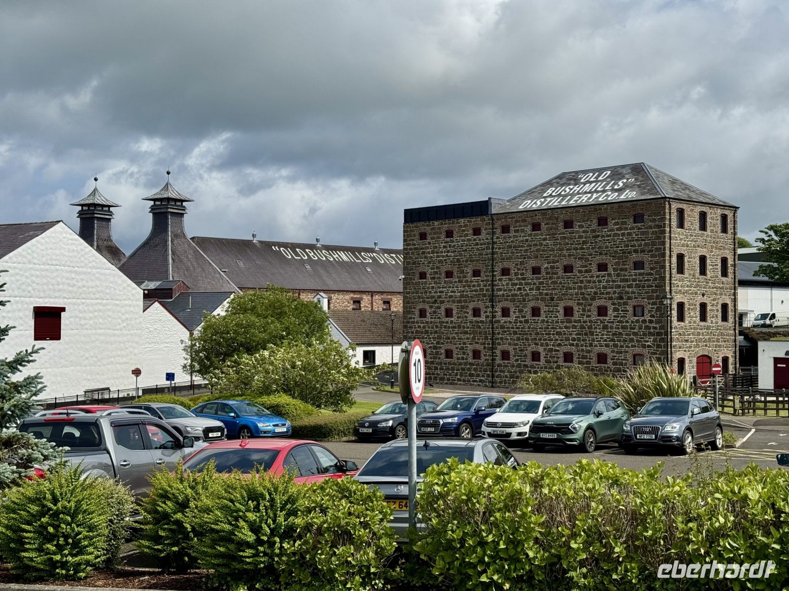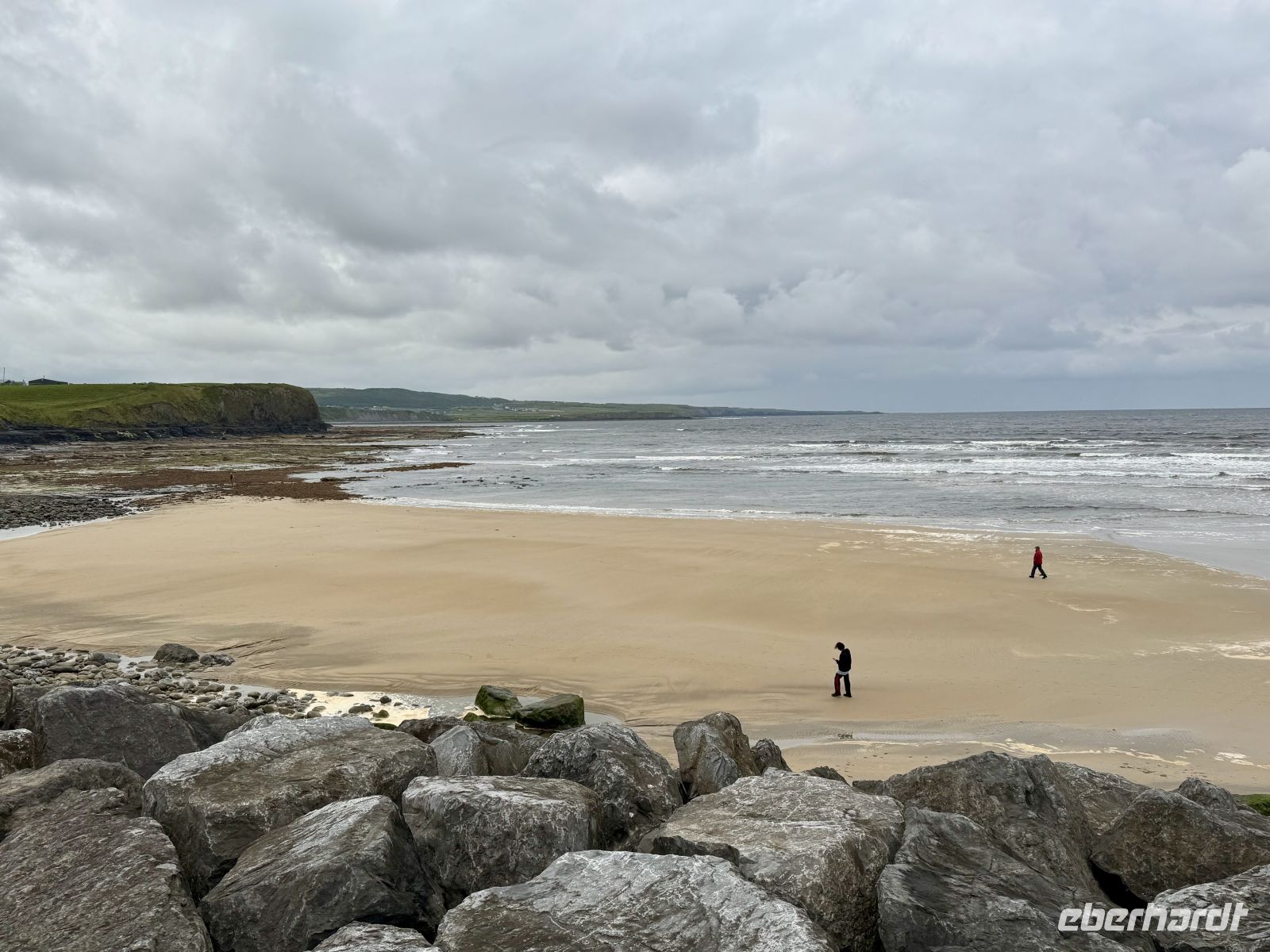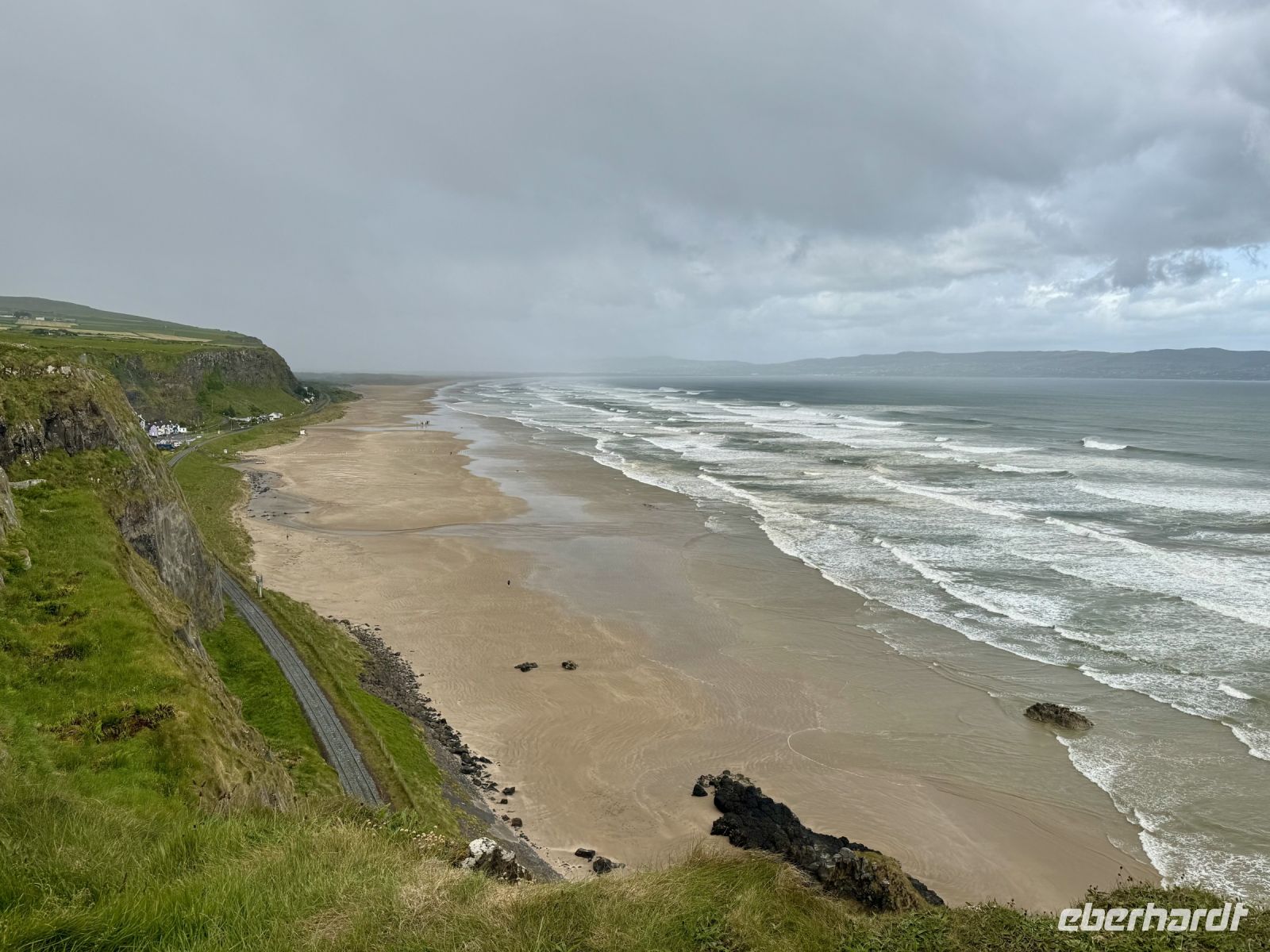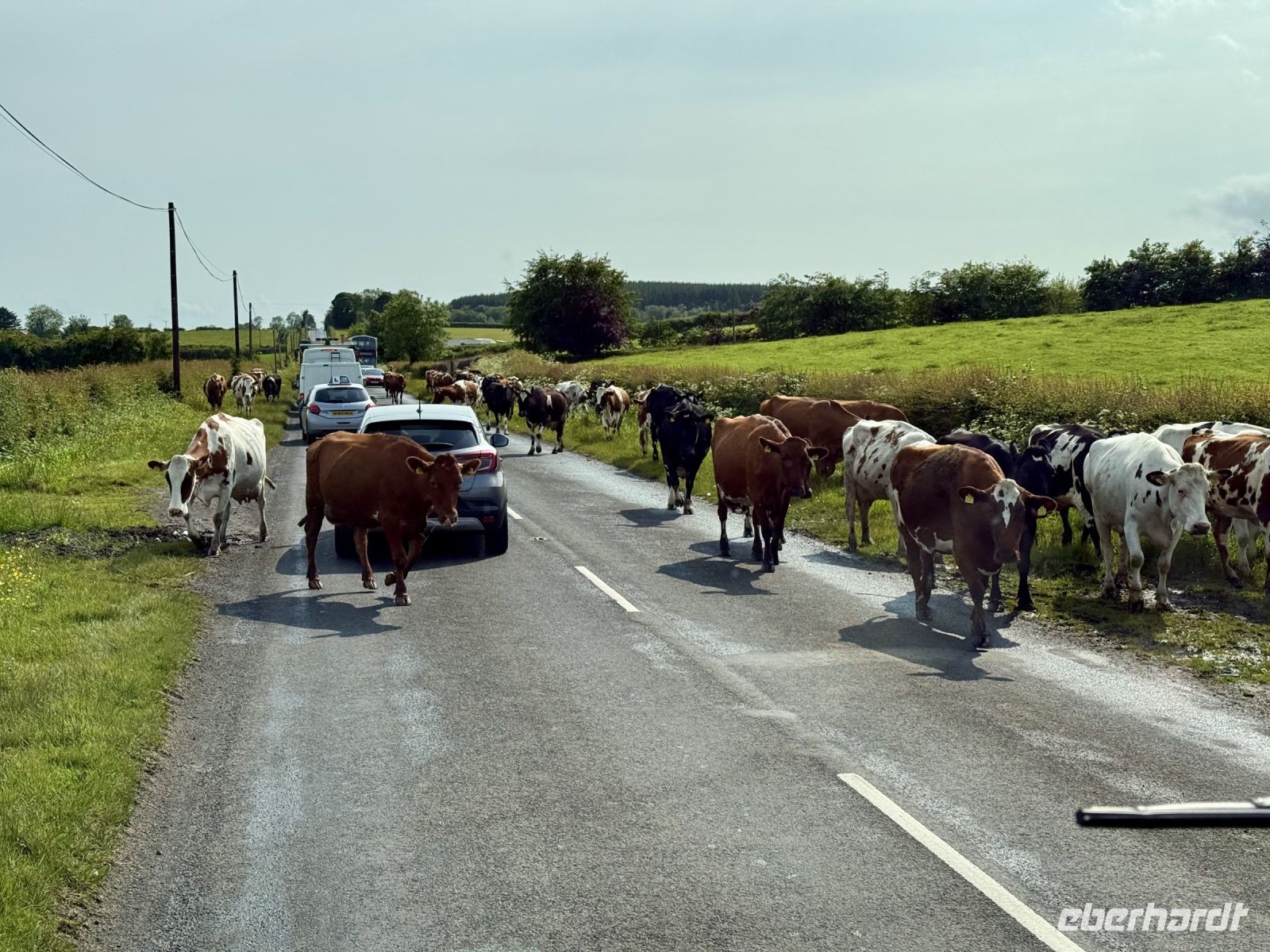 Beim Frühstück in der Hotelbar sieht es draußen sehr freundlich aus. Kein Grund aber für Optimismus! Der nächste Wetterumschwung ist derzeit so sicher wie das Amen in der Kirche. Als wir in unseren Bus einsteigen, fallen auch schon die ersten Regentropfen. Es soll heute noch einmal nach Nordirland gehen, um den Giant's Causeway und die Stadt Londonderry/Derry zu besuchen. Unser erstes Zwischenziel soll allerdings der herrliche Strand bei Downhill sein. Diesmal haben wir Glück und passen ein sonniges Zeitfenster am Strand ab. Mit unseren ersten Fotos des Tages sind wir deshalb sehr zufrieden. Am Mussenden-Tempel erwischt uns dann allerdings der Wetterumschwung mit voller Wucht und wir geraten hinterrücks in einen Regen- und Hagelsturm. Schnell flüchten wir durch die Ruinen des Bischofspalastes zum Kaffeestand. Dort angekommen scheint plötzlich wieder die Sonne, obgleich die nächsten Regenwolken schon im Anmarsch sind. Vier Jahreszeiten an einem Tag. Doch langsam scheint sich das Wetter zu stabilisieren. Bis zum Nachmittag bleibt es sehr windig, aber trocken. Vorsichtshalber beschließen wir trotzdem, uns das irische Wetter schönzutrinken, und steuern deshalb nach einem Fotostopp an den Ruinen des Dunluce Castle die Old Bushmills Distillery an. Ob der Whiskey schmeckt? Ich empfehle den 12-jährigen Distillery Reserve als Kostprobe. Der Damm des Riesen läge für Finn MacCool nur einen Steinwurf entfernt. Ob an der Legende etwas Wahres dran ist? Von den Klippen sehen die Menschen, die über die vielen Basaltsäulen klettern, aus wie Ameisen. Es ist vor allem auch die Landschaft um den Giant's Causeway herum, die diesen Ort so eindrucksvoll macht. Auf einer kurzen Zusatzwanderung zum Golfplatz am Runkerry Beach saugen wir mehr davon auf. Das große Anwesen Runkerry House steht sicher an einer der schönsten Buchten Nordirlands. Wir haben wieder großes Glück, dass wir genau mit Beginn des nächsten Regenschauers am Bus eintreffen. Solange wir im Bus im Warmen sitzen, stört uns der Regen nicht. Dank einer Straßensperre und Umleitung geraten wir auf der Rückfahrt nach Londonderry/Derry in eine typisch irische Variante der Rush Hour — Kühe auf der Straße, die den Verkehr blockieren. Extra spontan für unsere Gäste arrangiert! Darüber hinaus ist die Umleitungsstrecke landschaftlich reizvoller und wir gelangen mindestens genauso schnell ans Ziel. Dort wartet nämlich noch ein Spaziergang auf der Stadtmauer auf uns, der uns mit dem Religionskonflikt zwischen Katholiken und Protestanten und der Zeit der Troubles konfrontiert. Durch den Brexit sind alte Wunden wieder aufgerissen, obgleich die Auseinandersetzung (noch) weitestgehend auf politischer Ebene stattfindet. Wann wird es endlich enden? Paradoxerweise bildet die teilweise begrünte Stadtmauer aus dem 17. Jahrhunder mit ihren Kanonen heute eine Oase der Ruhe in Londonderry/Derry. Nur wenige Fahrminuten später sind wir zurück in der Republik und haben es auch nicht mehr weit bis zu unserem Hotel in Letterkenny.