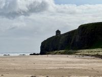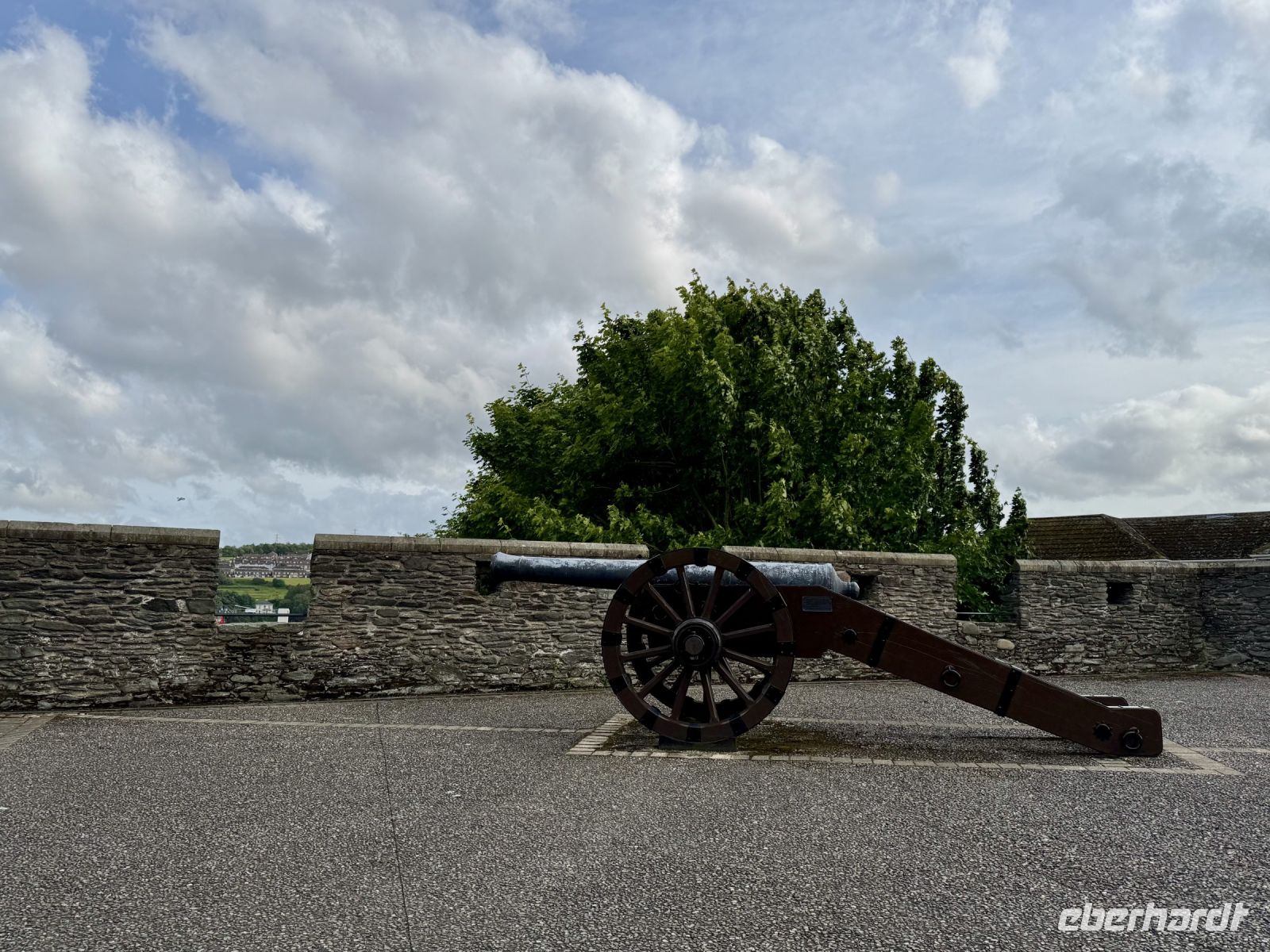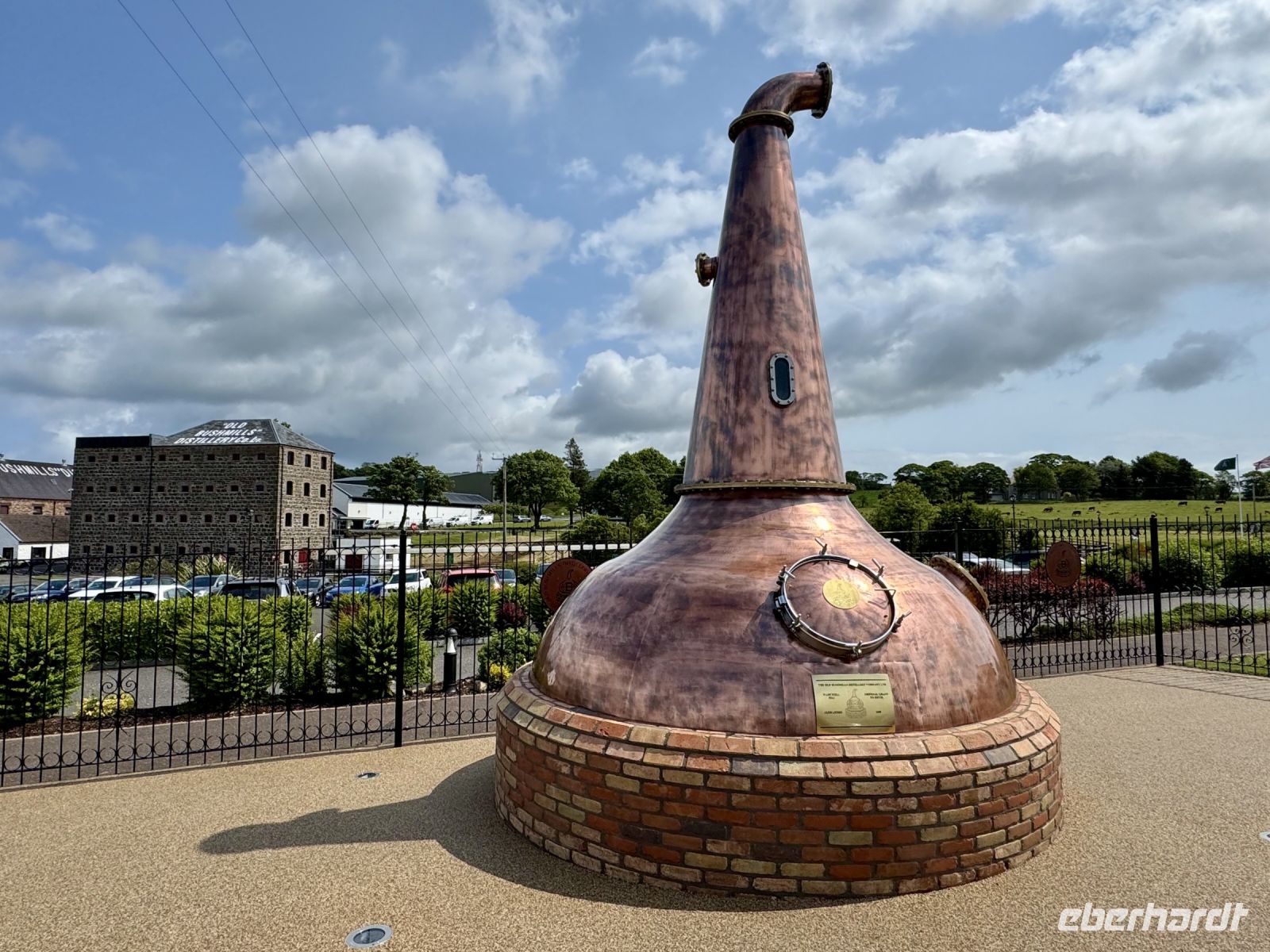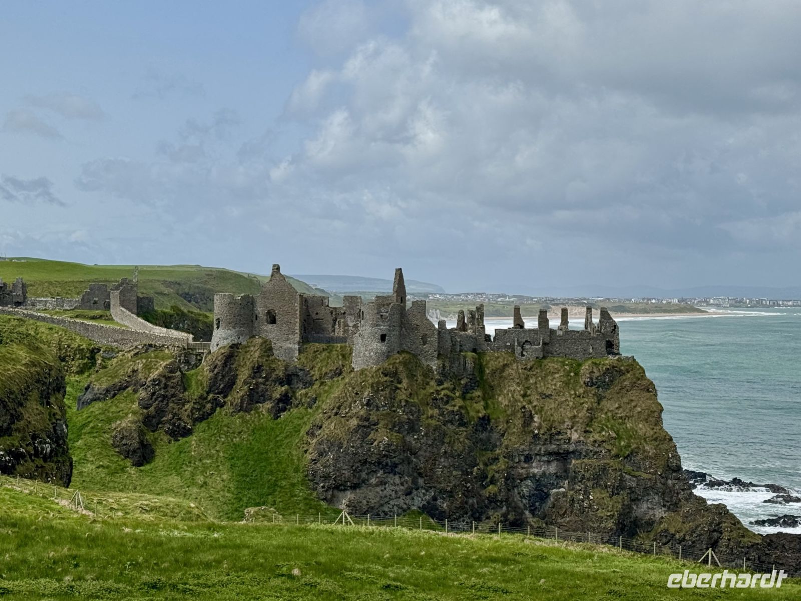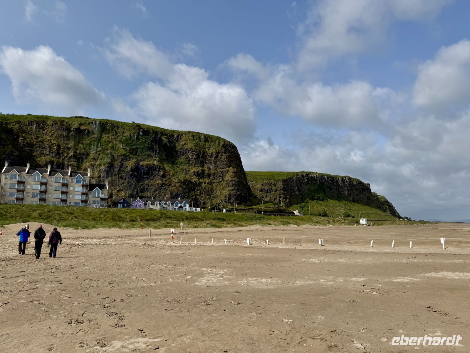 Beim Frühstück in der Hotelbar sieht es draußen sehr freundlich aus. Kein Grund aber für Optimismus! Der nächste Wetterumschwung ist derzeit so sicher wie das Amen in der Kirche. Als wir in unseren Bus einsteigen, fallen auch schon die ersten Regentropfen. Es soll heute noch einmal nach Nordirland gehen, um den Giant's Causeway und die Stadt Londonderry/Derry zu besuchen. Unser erstes Zwischenziel soll allerdings der herrliche Strand bei Downhill sein. Diesmal haben wir Glück und passen ein sonniges Zeitfenster am Strand ab. Mit unseren ersten Fotos des Tages sind wir deshalb sehr zufrieden. Am Mussenden-Tempel erwischt uns dann allerdings der Wetterumschwung mit voller Wucht und wir geraten hinterrücks in einen Regen- und Hagelsturm. Schnell flüchten wir durch die Ruinen des Bischofspalastes zum Kaffeestand. Dort angekommen scheint plötzlich wieder die Sonne, obgleich die nächsten Regenwolken schon im Anmarsch sind. Vier Jahreszeiten an einem Tag. Doch langsam scheint sich das Wetter zu stabilisieren. Bis zum Nachmittag bleibt es sehr windig, aber trocken. Vorsichtshalber beschließen wir trotzdem, uns das irische Wetter schönzutrinken, und steuern deshalb nach einem Fotostopp an den Ruinen des Dunluce Castle die Old Bushmills Distillery an. Ob der Whiskey schmeckt? Ich empfehle den 12-jährigen Distillery Reserve als Kostprobe. Der Damm des Riesen läge für Finn MacCool nur einen Steinwurf entfernt. Ob an der Legende etwas Wahres dran ist? Von den Klippen sehen die Menschen, die über die vielen Basaltsäulen klettern, aus wie Ameisen. Es ist vor allem auch die Landschaft um den Giant's Causeway herum, die diesen Ort so eindrucksvoll macht. Auf einer kurzen Zusatzwanderung zum Golfplatz am Runkerry Beach saugen wir mehr davon auf. Das große Anwesen Runkerry House steht sicher an einer der schönsten Buchten Nordirlands. Wir haben wieder großes Glück, dass wir genau mit Beginn des nächsten Regenschauers am Bus eintreffen. Solange wir im Bus im Warmen sitzen, stört uns der Regen nicht. Dank einer Straßensperre und Umleitung geraten wir auf der Rückfahrt nach Londonderry/Derry in eine typisch irische Variante der Rush Hour — Kühe auf der Straße, die den Verkehr blockieren. Extra spontan für unsere Gäste arrangiert! Darüber hinaus ist die Umleitungsstrecke landschaftlich reizvoller und wir gelangen mindestens genauso schnell ans Ziel. Dort wartet nämlich noch ein Spaziergang auf der Stadtmauer auf uns, der uns mit dem Religionskonflikt zwischen Katholiken und Protestanten und der Zeit der Troubles konfrontiert. Durch den Brexit sind alte Wunden wieder aufgerissen, obgleich die Auseinandersetzung (noch) weitestgehend auf politischer Ebene stattfindet. Wann wird es endlich enden? Paradoxerweise bildet die teilweise begrünte Stadtmauer aus dem 17. Jahrhunder mit ihren Kanonen heute eine Oase der Ruhe in Londonderry/Derry. Nur wenige Fahrminuten später sind wir zurück in der Republik und haben es auch nicht mehr weit bis zu unserem Hotel in Letterkenny.
