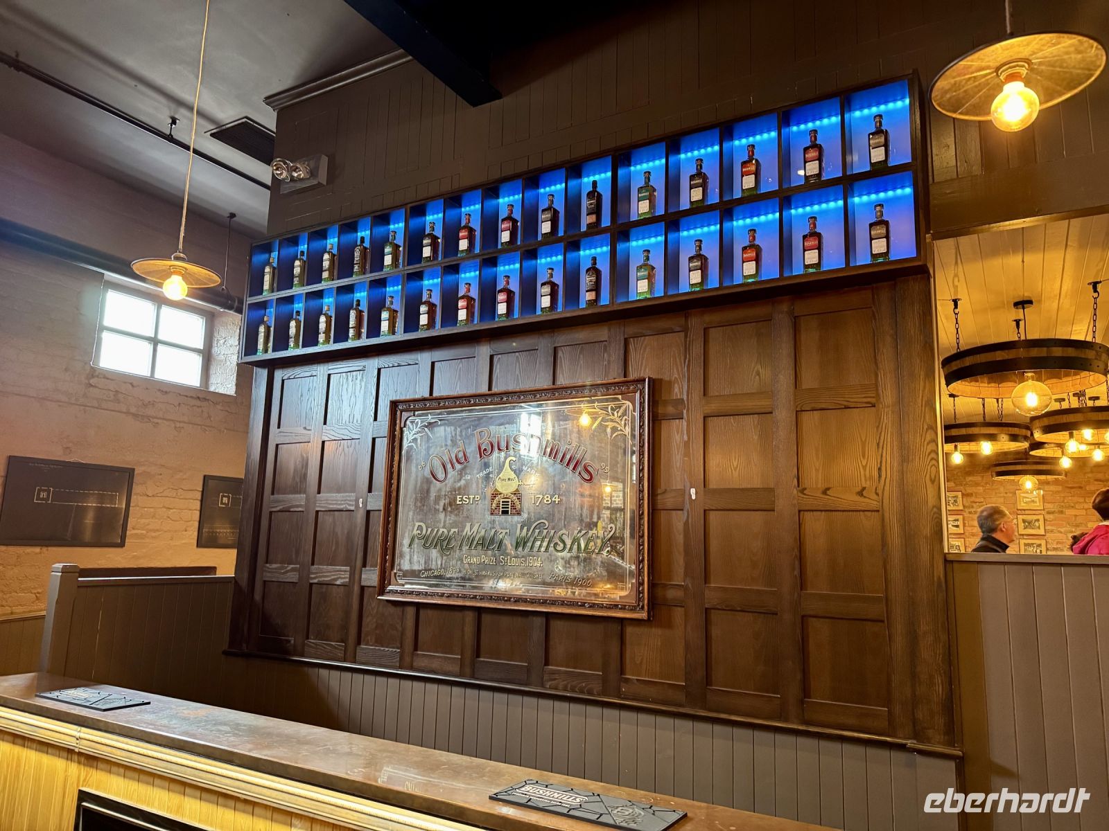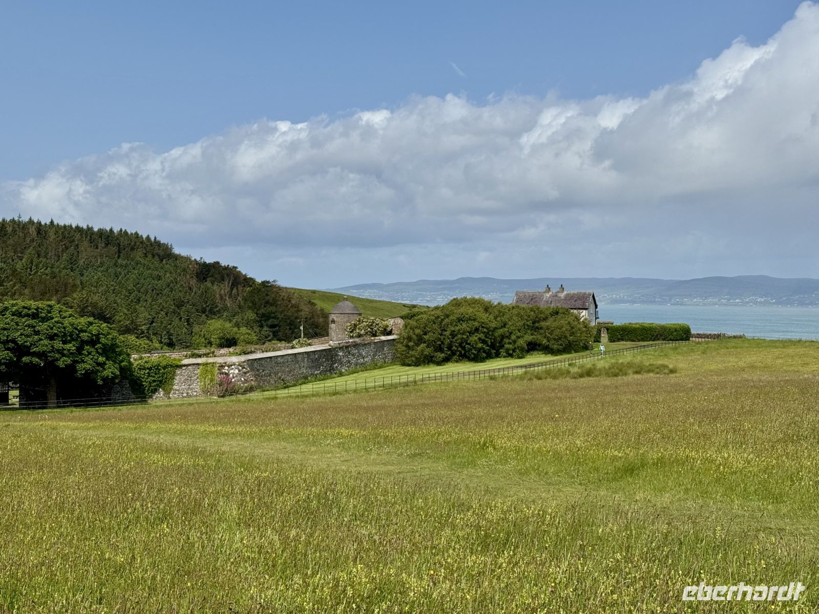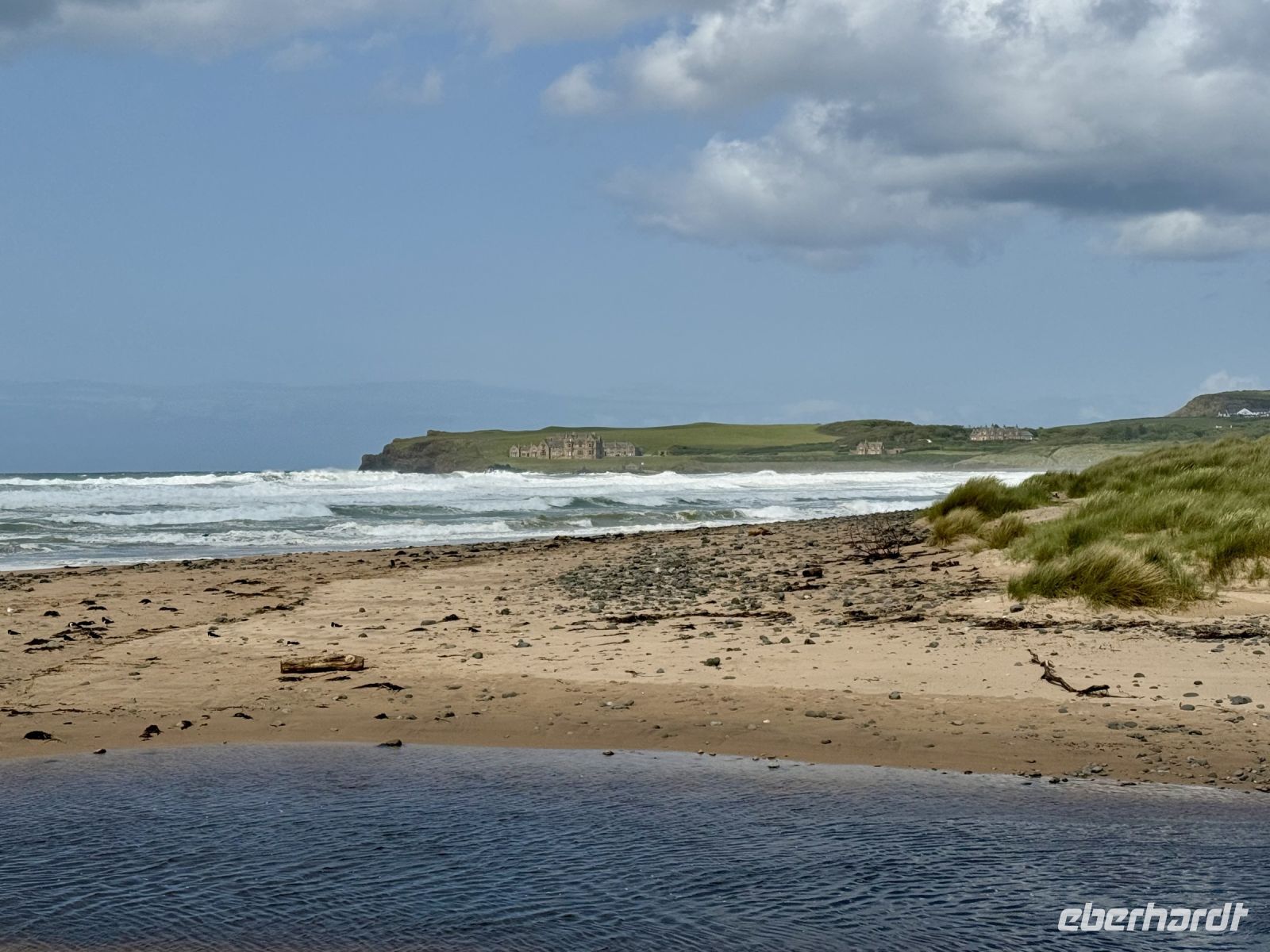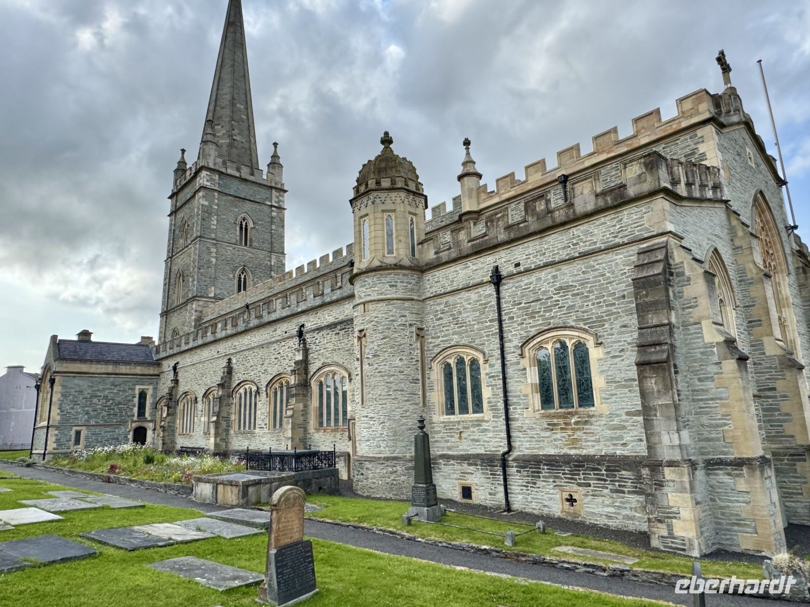 Beim Frühstück in der Hotelbar sieht es draußen sehr freundlich aus. Kein Grund aber für Optimismus! Der nächste Wetterumschwung ist derzeit so sicher wie das Amen in der Kirche. Als wir in unseren Bus einsteigen, fallen auch schon die ersten Regentropfen. Es soll heute noch einmal nach Nordirland gehen, um den Giant's Causeway und die Stadt Londonderry/Derry zu besuchen. Unser erstes Zwischenziel soll allerdings der herrliche Strand bei Downhill sein. Diesmal haben wir Glück und passen ein sonniges Zeitfenster am Strand ab. Mit unseren ersten Fotos des Tages sind wir deshalb sehr zufrieden. Am Mussenden-Tempel erwischt uns dann allerdings der Wetterumschwung mit voller Wucht und wir geraten hinterrücks in einen Regen- und Hagelsturm. Schnell flüchten wir durch die Ruinen des Bischofspalastes zum Kaffeestand. Dort angekommen scheint plötzlich wieder die Sonne, obgleich die nächsten Regenwolken schon im Anmarsch sind. Vier Jahreszeiten an einem Tag. Doch langsam scheint sich das Wetter zu stabilisieren. Bis zum Nachmittag bleibt es sehr windig, aber trocken. Vorsichtshalber beschließen wir trotzdem, uns das irische Wetter schönzutrinken, und steuern deshalb nach einem Fotostopp an den Ruinen des Dunluce Castle die Old Bushmills Distillery an. Ob der Whiskey schmeckt? Ich empfehle den 12-jährigen Distillery Reserve als Kostprobe. Der Damm des Riesen läge für Finn MacCool nur einen Steinwurf entfernt. Ob an der Legende etwas Wahres dran ist? Von den Klippen sehen die Menschen, die über die vielen Basaltsäulen klettern, aus wie Ameisen. Es ist vor allem auch die Landschaft um den Giant's Causeway herum, die diesen Ort so eindrucksvoll macht. Auf einer kurzen Zusatzwanderung zum Golfplatz am Runkerry Beach saugen wir mehr davon auf. Das große Anwesen Runkerry House steht sicher an einer der schönsten Buchten Nordirlands. Wir haben wieder großes Glück, dass wir genau mit Beginn des nächsten Regenschauers am Bus eintreffen. Solange wir im Bus im Warmen sitzen, stört uns der Regen nicht. Dank einer Straßensperre und Umleitung geraten wir auf der Rückfahrt nach Londonderry/Derry in eine typisch irische Variante der Rush Hour — Kühe auf der Straße, die den Verkehr blockieren. Extra spontan für unsere Gäste arrangiert! Darüber hinaus ist die Umleitungsstrecke landschaftlich reizvoller und wir gelangen mindestens genauso schnell ans Ziel. Dort wartet nämlich noch ein Spaziergang auf der Stadtmauer auf uns, der uns mit dem Religionskonflikt zwischen Katholiken und Protestanten und der Zeit der Troubles konfrontiert. Durch den Brexit sind alte Wunden wieder aufgerissen, obgleich die Auseinandersetzung (noch) weitestgehend auf politischer Ebene stattfindet. Wann wird es endlich enden? Paradoxerweise bildet die teilweise begrünte Stadtmauer aus dem 17. Jahrhunder mit ihren Kanonen heute eine Oase der Ruhe in Londonderry/Derry. Nur wenige Fahrminuten später sind wir zurück in der Republik und haben es auch nicht mehr weit bis zu unserem Hotel in Letterkenny.