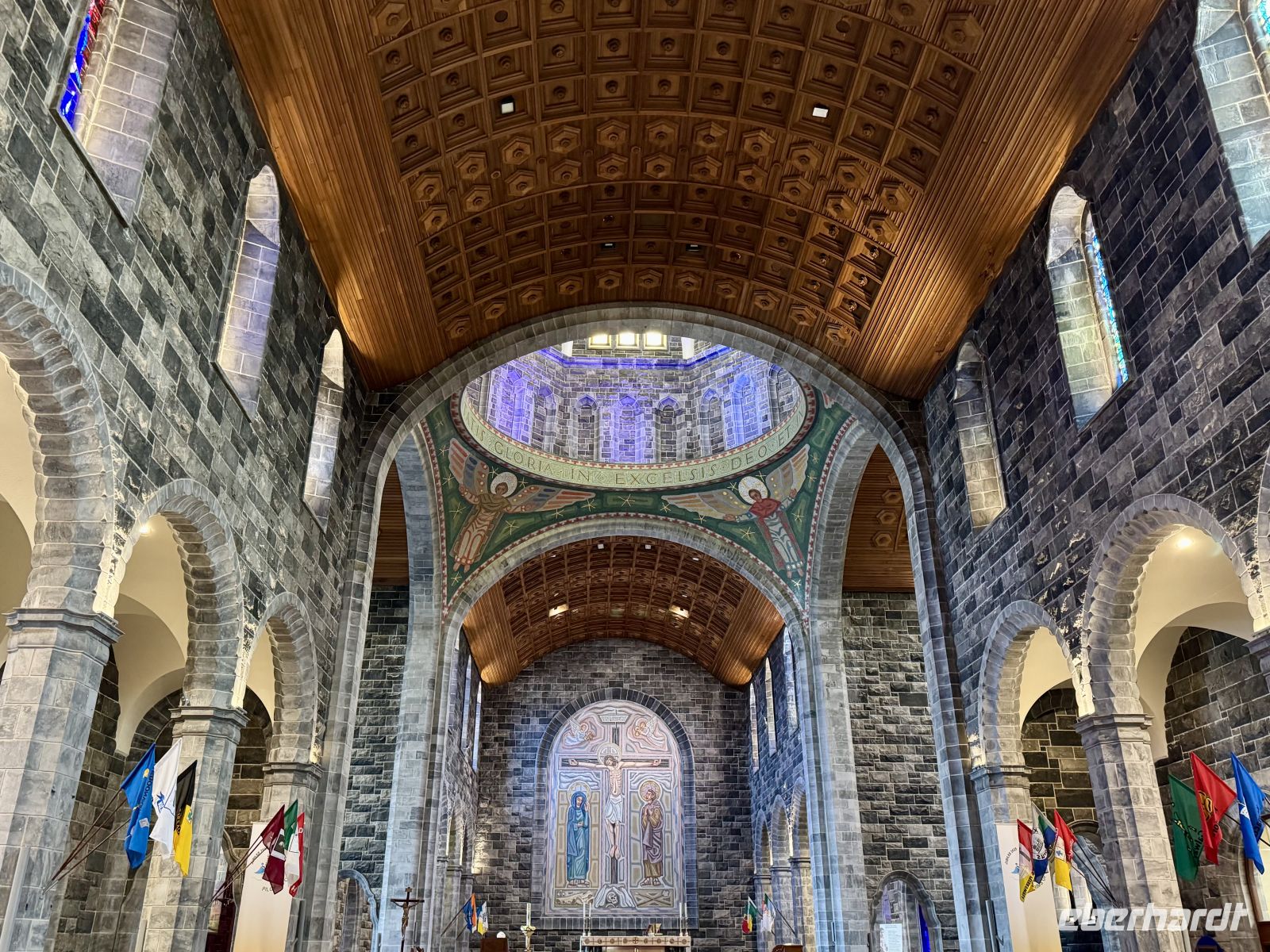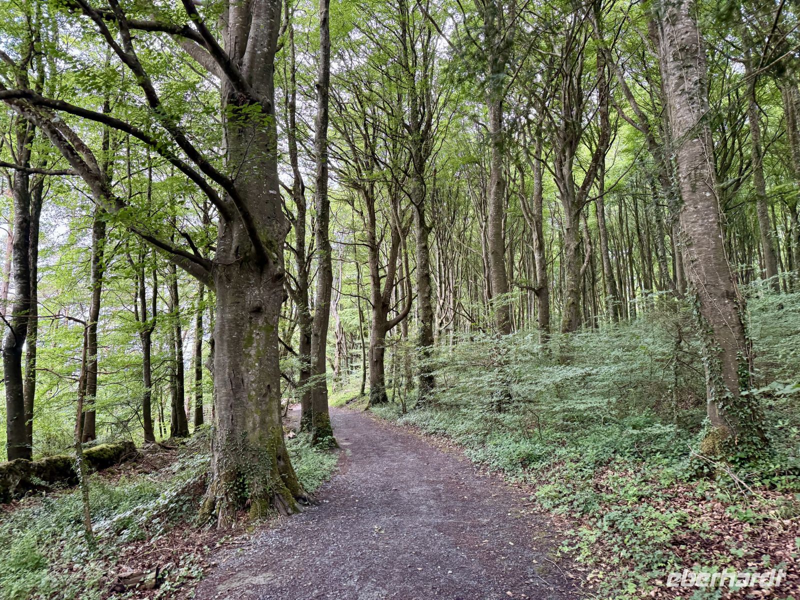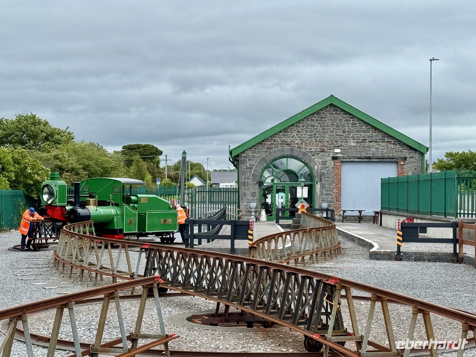 Auch am neunten Tag sind wir eher entspannt unterwegs. Die kurze Wanderung auf dem 7 Woods Trail in Coole Park hält nur wenige Höhenmeter für uns bereit. Dafür spazieren wir im Schatten eines Waldes, der nach dem Regen der vergangenen Tage in saftigen Grüntönen erstrahlt. Waldbaden soll ja der Seele guttun. Wir fotografieren eine riesige Rotzeder und gelangen schließlich zum Autograph Tree im ehemaligen Küchengarten. Wieder habe ich kein langes Messer dabei, um meinen Namen neben die von Yeats und Shaw zu ritzen. Wir picknicken entweder gleich hier an überdachten Bänken oder gehen weiter ins kleine Café. Nach diesem gemütlichen Vormittag fährt uns Donal über die Autobahn an den Shannon. Durch einen Tunnel gelangen wir ans Südufer und machen in Foynes eine kurze Pause am Flying Boats Museum, das an die Flugboote der 30er- und 40er-Jahre sowie an die Geburtsstunde des Irish Coffee erinnert. In Listowel wartet dann ein Stück Eisenbahngeschichte, denn wir fahren mit der Lartigue Monorail und kommen aus dem Lachen und Grinsen nicht heraus. Die eigenwillige Konstruktion kam weltweit nur im County Kerry kommerziell zum Einsatz und wurde liebevoll restauriert. Wir sind dennoch froh, dass uns Donal mit dem Bus nach Tralee fährt. Schon nach 500 Metern waren wir im Zug gut durchgerüttelt. Apropos liebevoll restauriert: im Grand Hotel in Tralee gefällt es uns richtig gut und auch das Essen überzeugt! Fast alle Gäste kommen am Abend mit in die Show Celtic Steps und erleben ein rundum tolles Programm mit irischem Stepptanz (vorgeführt u. a. von zweifachen Weltmeistern), Musik und Gesang.