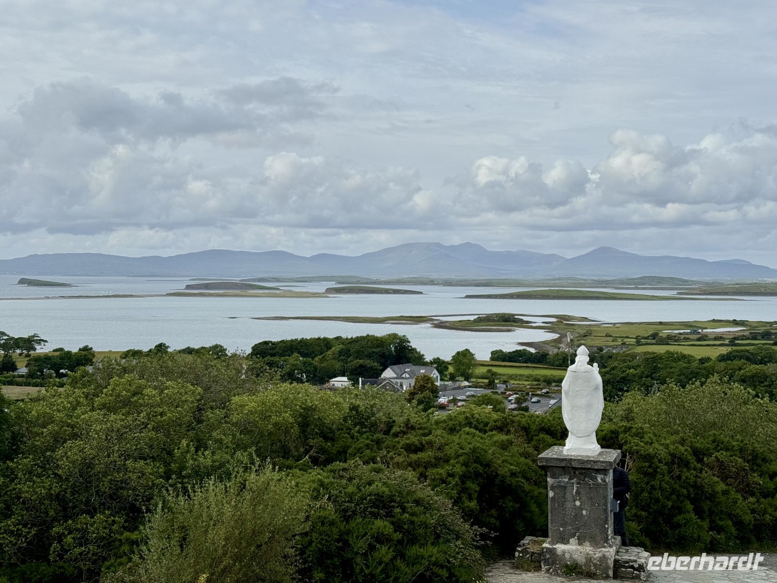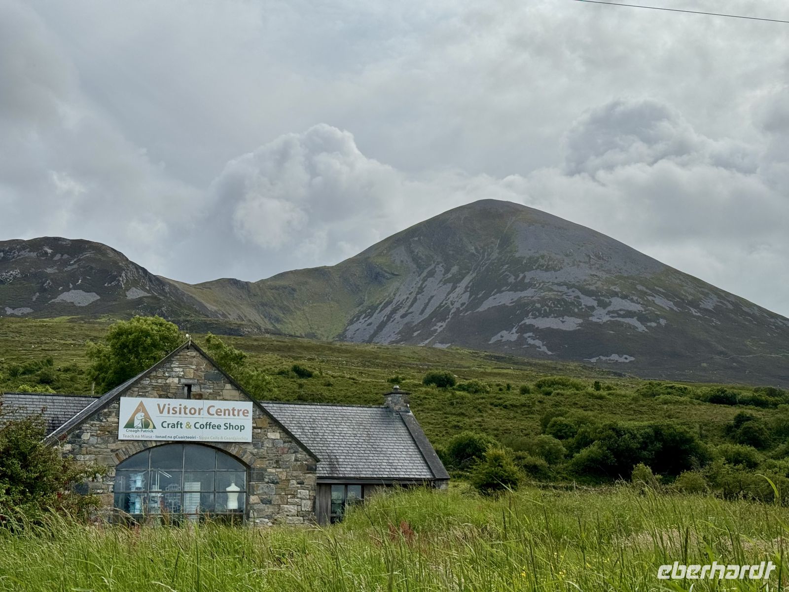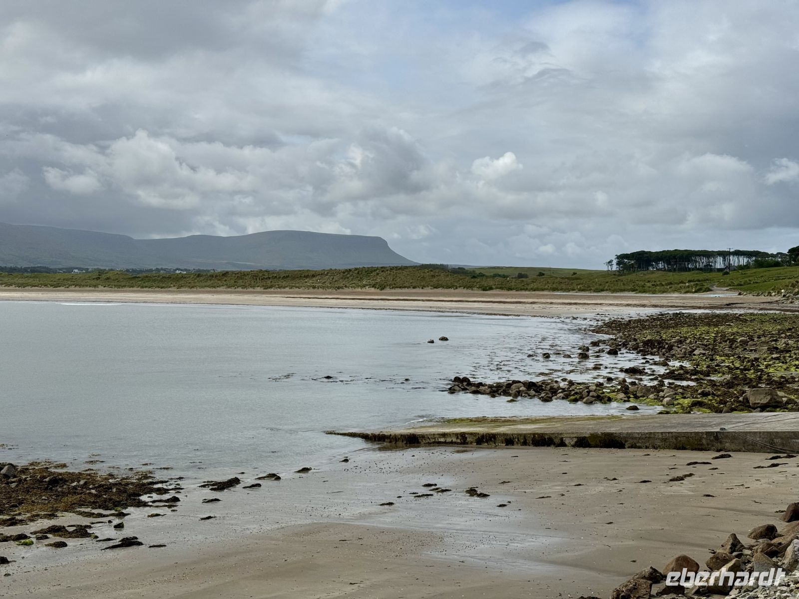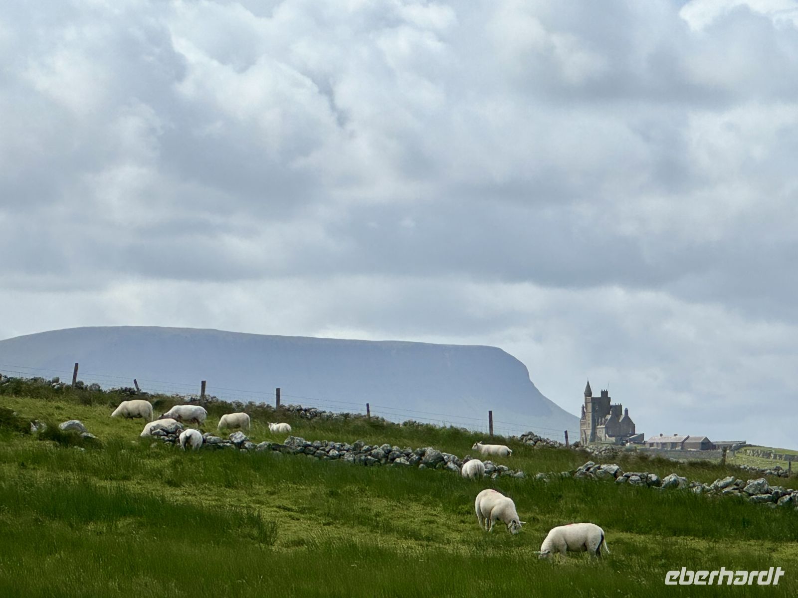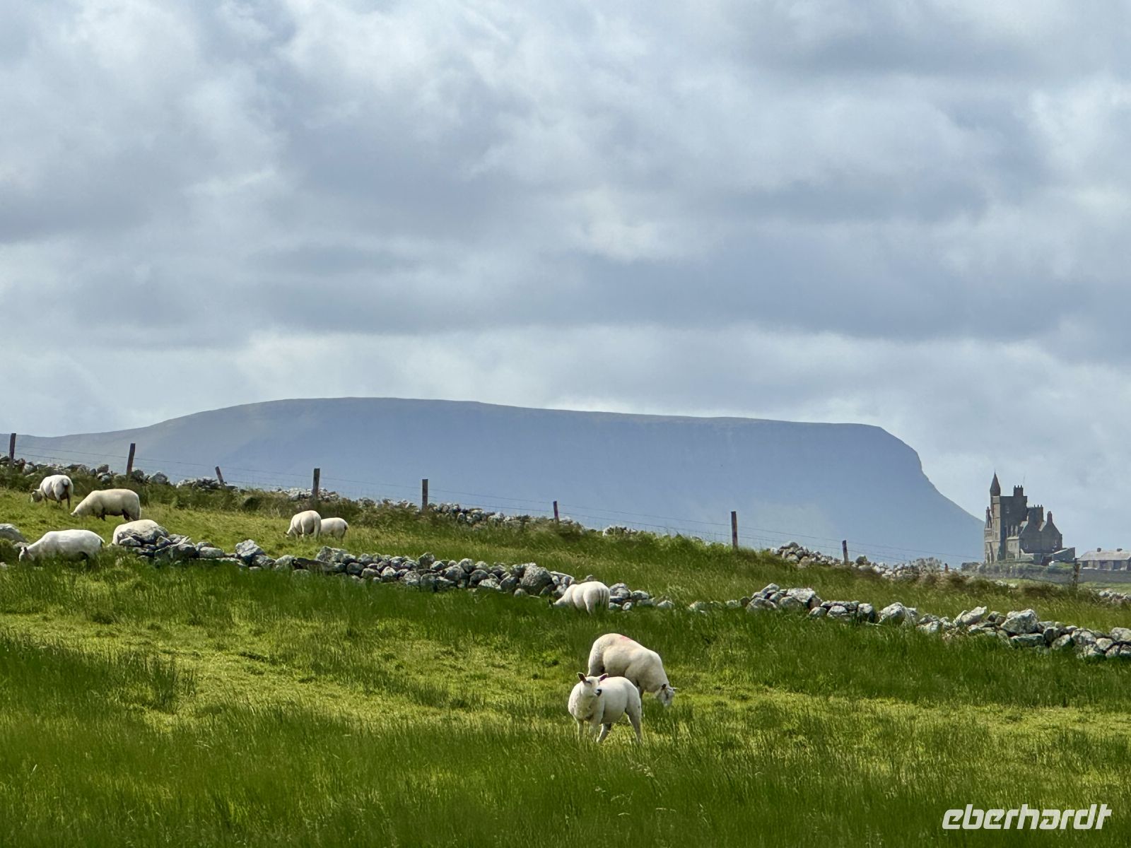 Regen in der Barnesmore Gap muss noch keinen Weltuntergang bedeuten, stellen wir auf unserer Fahrt nach Donegal fest. In der niedlichen kleinen Hauptstadt des gleichnamigen Countys bleibt es bei unserem Aufenthalt nämlich trocken und auch von den Temperaturen her angenehm. Wir machen Fotos vom Castle, Obelisken und Hafen und kaufen uns ganz optimistisch Verpflegung für unser Picknick am Hafen von Mullaghmore. Der Wettergott muss es heute wirklich gut mit uns meinen, denn während unserer Küstenwanderung um die Insel fällt kein einziger Tropfen. Mehr noch — die Wolkendecke reißt auf und wir sehen blauen Himmel. Ich muss tatsächlich meine Sonnenbrille aus dem Rucksack holen! Wir kommen in den Genuss einer wunderbaren Fernsicht. Weiße Schafe vor dem Classiebawn Castle vor dem Ben Bulben. Mehr Irland-Klischee geht fast nicht. Gen Westen am Horizont die Klippen von Slieve League. Hach, was für eine schöne kleine Wanderung! Am Hafen von Mullaghmore wartet dann unser Bus mit dem eingekauften Mittagssnack. Mit Aussicht auf den Sandstrand und die Berge lässt es sich gar herrlich speisen. Während wir den Ben Bulben, Drumcliff, Sligo und den Knocknarea passieren/durchqueren, tauchen wir in die reichhaltige Sagenwelt Irlands ein. Dann dürfen meine Gäste bis Westport schlafen. Der nackte Gipfel des Croagh Patrick am Horizont ist ein weiterer Beweis für die gute Fernsicht und den gnädigen Wettergott. Doch bevor wir uns dem heiligen Berg widmen, machen wir die angekündigte Kaffee- und Einkaufspause im malerischen Westport. Die schwierigste Entscheidung ist die Auswahl des Cafés, denn alle sehen einladend und gemütlich aus. Oder doch lieber ein Eis? Wer ist verrückt genug, DIESEN Weg barfuß und auf Knien zurückzulegen, fragen wir uns am Anfang des Pilgerpfads auf den Gipfel. Auch der Heilige Patrick mag gar nicht hinschauen und blickt lieber auf die Inseln in der Clew Bay. Auf Vorschlag von Donal nehmen wir die Scenic Route durch das Doolough Valley zum Fjord und machen dort einen letzten Fotostopp. Als das Leenane Hotel am Killary Harbour schließlich in Sichtweite kommt, fängt mein Magen vor Vorfreude schon an zu knurren. Nach dem leckeren Abendessen erwartet uns im Salon noch gute hausgemachte traditionelle Live-Musik, um den schönen Tag abzurunden.