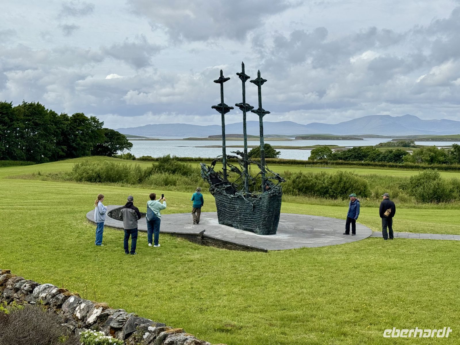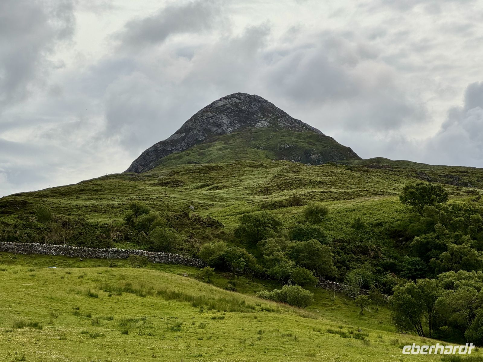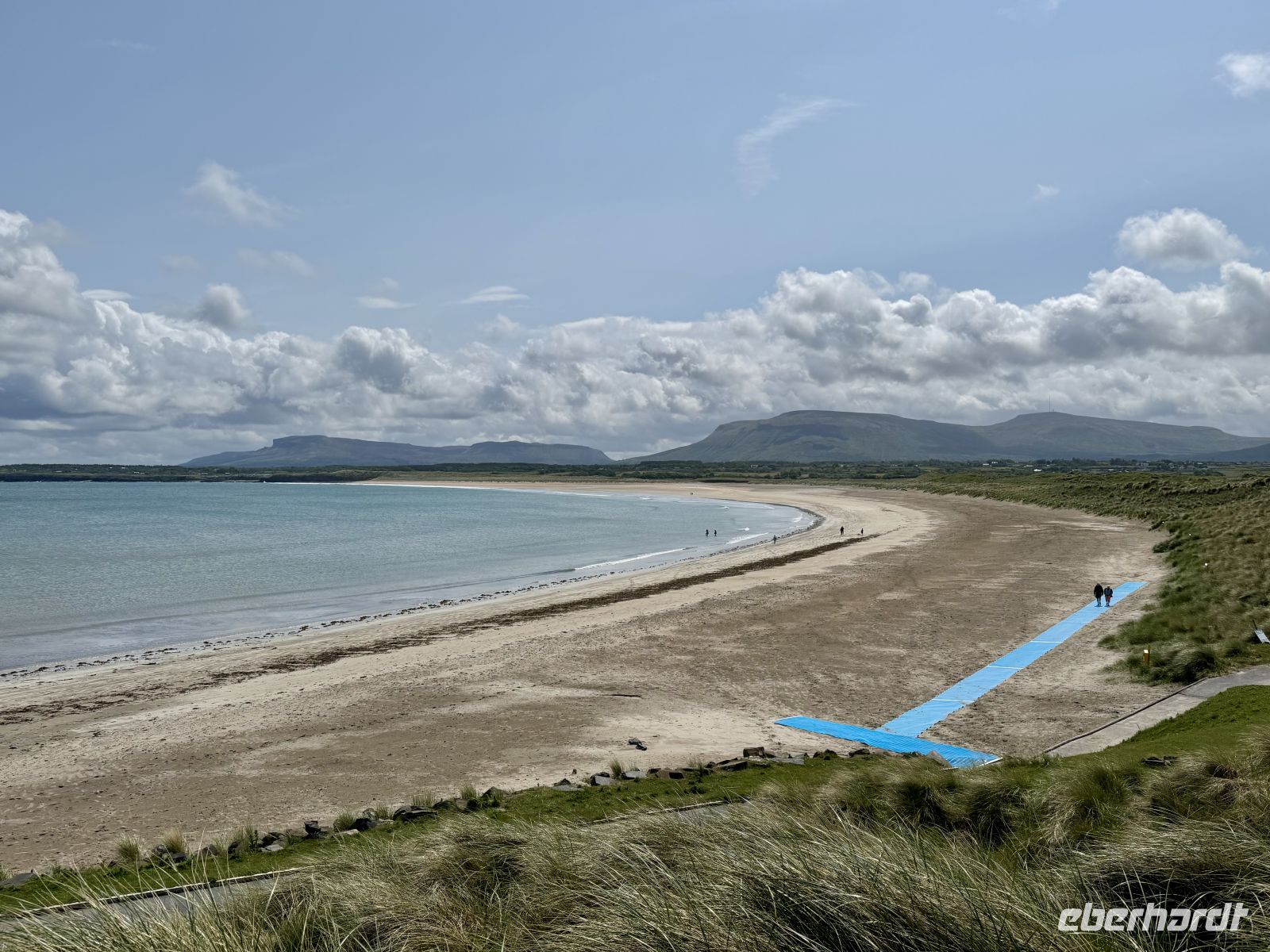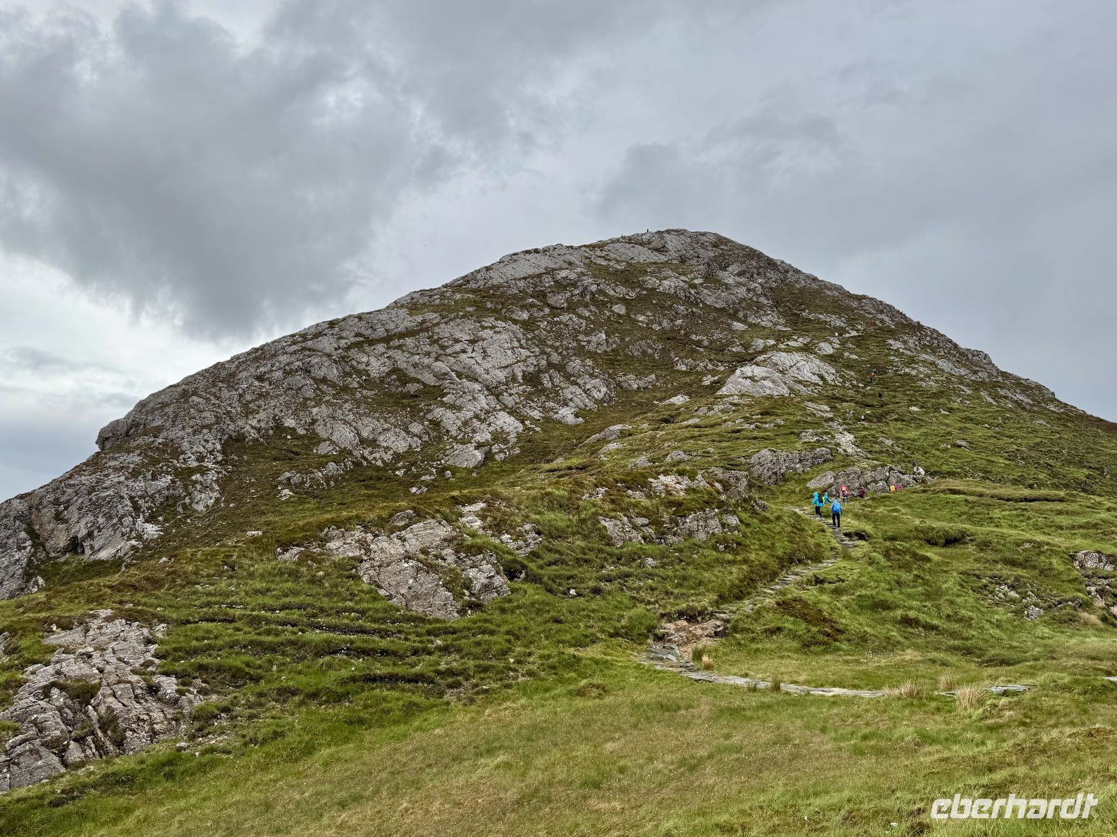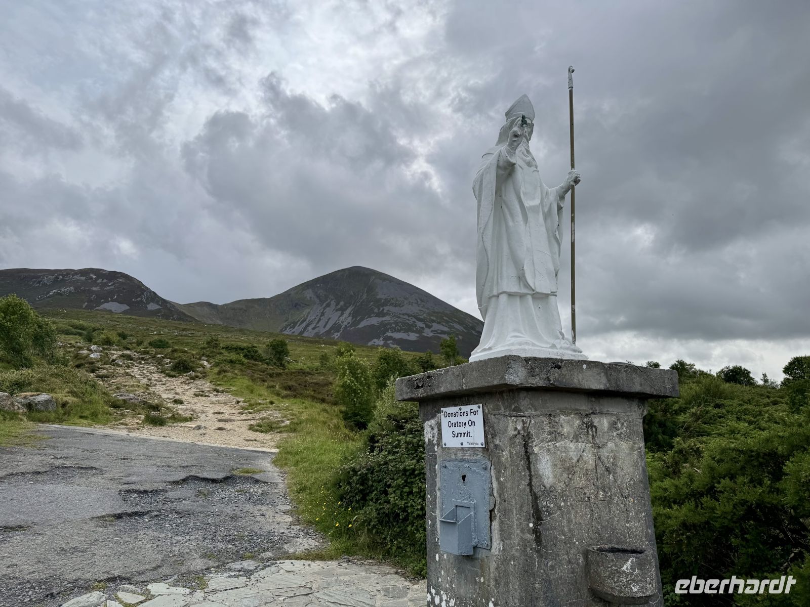 Regen in der Barnesmore Gap muss noch keinen Weltuntergang bedeuten, stellen wir auf unserer Fahrt nach Donegal fest. In der niedlichen kleinen Hauptstadt des gleichnamigen Countys bleibt es bei unserem Aufenthalt nämlich trocken und auch von den Temperaturen her angenehm. Wir machen Fotos vom Castle, Obelisken und Hafen und kaufen uns ganz optimistisch Verpflegung für unser Picknick am Hafen von Mullaghmore. Der Wettergott muss es heute wirklich gut mit uns meinen, denn während unserer Küstenwanderung um die Insel fällt kein einziger Tropfen. Mehr noch — die Wolkendecke reißt auf und wir sehen blauen Himmel. Ich muss tatsächlich meine Sonnenbrille aus dem Rucksack holen! Wir kommen in den Genuss einer wunderbaren Fernsicht. Weiße Schafe vor dem Classiebawn Castle vor dem Ben Bulben. Mehr Irland-Klischee geht fast nicht. Gen Westen am Horizont die Klippen von Slieve League. Hach, was für eine schöne kleine Wanderung! Am Hafen von Mullaghmore wartet dann unser Bus mit dem eingekauften Mittagssnack. Mit Aussicht auf den Sandstrand und die Berge lässt es sich gar herrlich speisen. Während wir den Ben Bulben, Drumcliff, Sligo und den Knocknarea passieren/durchqueren, tauchen wir in die reichhaltige Sagenwelt Irlands ein. Dann dürfen meine Gäste bis Westport schlafen. Der nackte Gipfel des Croagh Patrick am Horizont ist ein weiterer Beweis für die gute Fernsicht und den gnädigen Wettergott. Doch bevor wir uns dem heiligen Berg widmen, machen wir die angekündigte Kaffee- und Einkaufspause im malerischen Westport. Die schwierigste Entscheidung ist die Auswahl des Cafés, denn alle sehen einladend und gemütlich aus. Oder doch lieber ein Eis? Wer ist verrückt genug, DIESEN Weg barfuß und auf Knien zurückzulegen, fragen wir uns am Anfang des Pilgerpfads auf den Gipfel. Auch der Heilige Patrick mag gar nicht hinschauen und blickt lieber auf die Inseln in der Clew Bay. Auf Vorschlag von Donal nehmen wir die Scenic Route durch das Doolough Valley zum Fjord und machen dort einen letzten Fotostopp. Als das Leenane Hotel am Killary Harbour schließlich in Sichtweite kommt, fängt mein Magen vor Vorfreude schon an zu knurren. Nach dem leckeren Abendessen erwartet uns im Salon noch gute hausgemachte traditionelle Live-Musik, um den schönen Tag abzurunden.