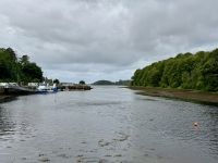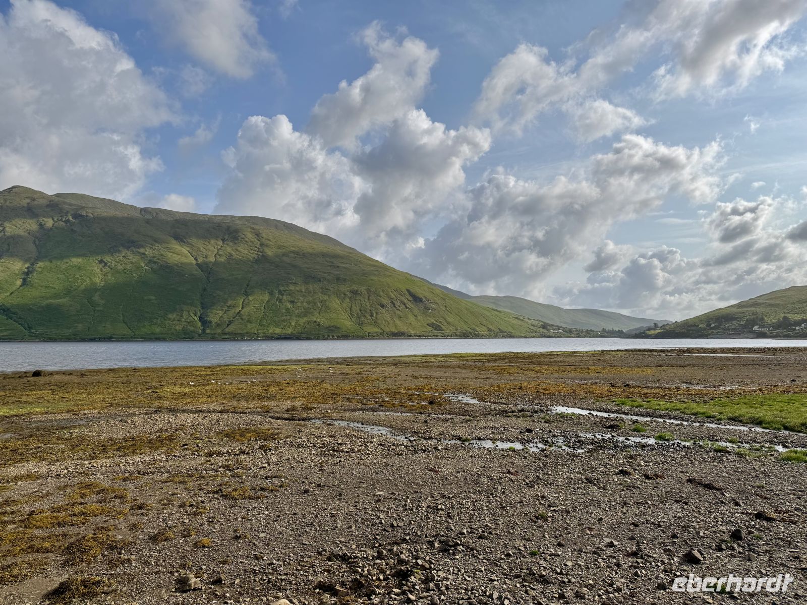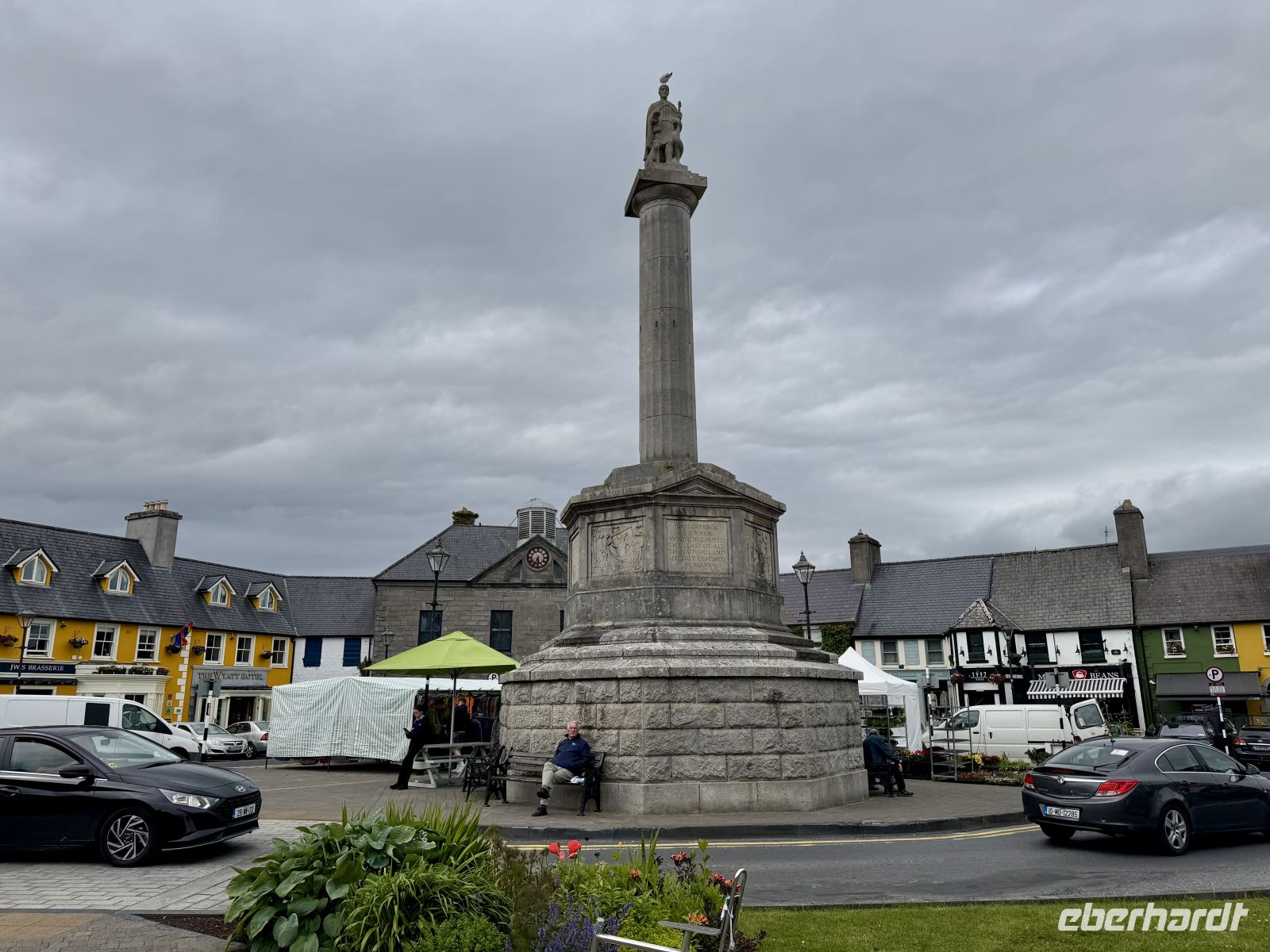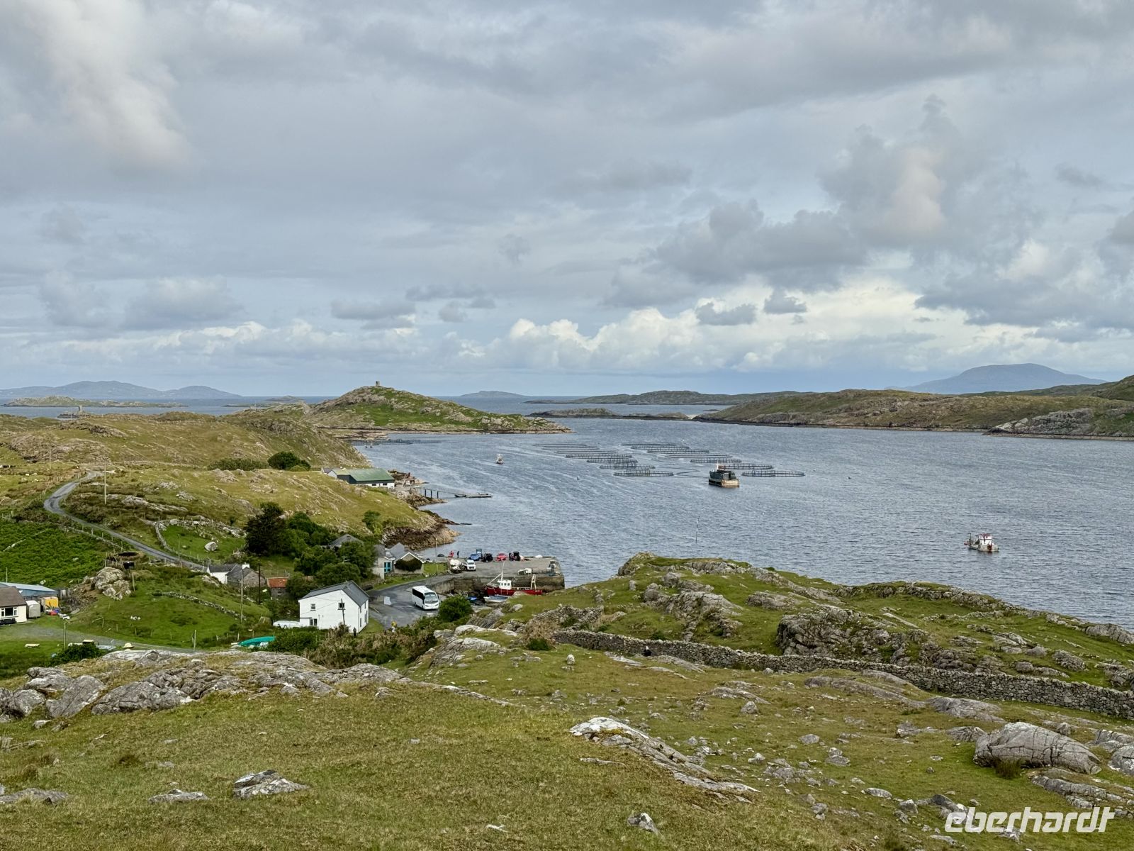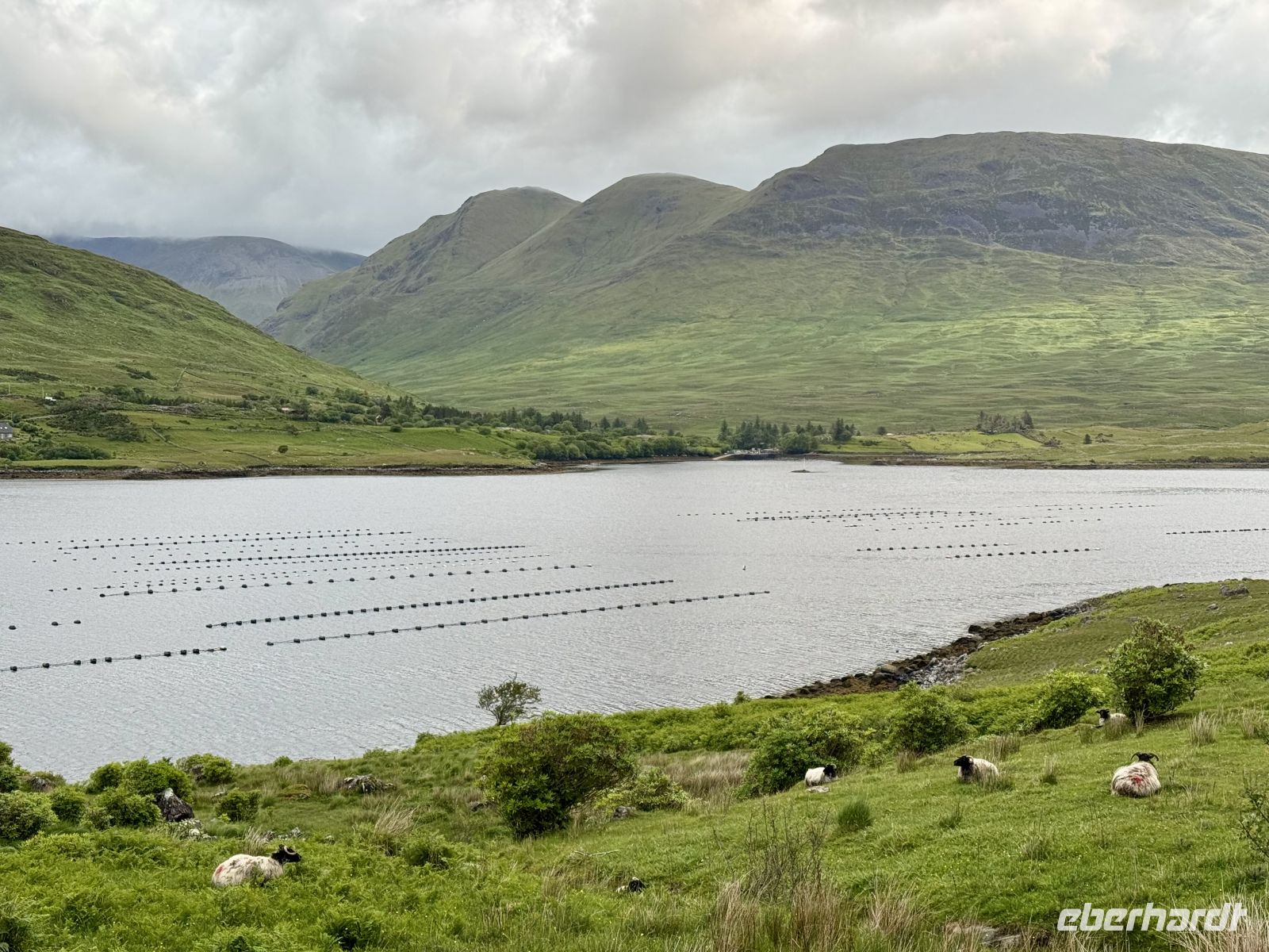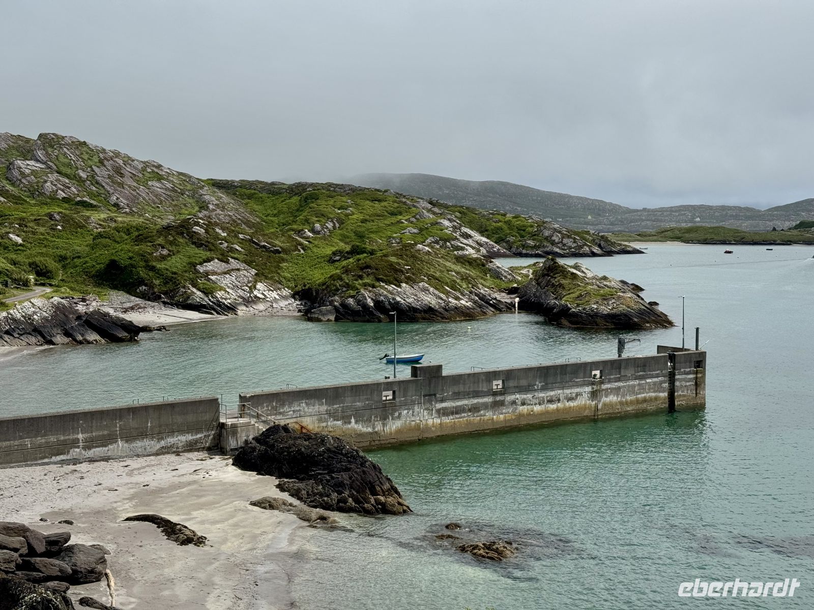 Regen in der Barnesmore Gap muss noch keinen Weltuntergang bedeuten, stellen wir auf unserer Fahrt nach Donegal fest. In der niedlichen kleinen Hauptstadt des gleichnamigen Countys bleibt es bei unserem Aufenthalt nämlich trocken und auch von den Temperaturen her angenehm. Wir machen Fotos vom Castle, Obelisken und Hafen und kaufen uns ganz optimistisch Verpflegung für unser Picknick am Hafen von Mullaghmore. Der Wettergott muss es heute wirklich gut mit uns meinen, denn während unserer Küstenwanderung um die Insel fällt kein einziger Tropfen. Mehr noch — die Wolkendecke reißt auf und wir sehen blauen Himmel. Ich muss tatsächlich meine Sonnenbrille aus dem Rucksack holen! Wir kommen in den Genuss einer wunderbaren Fernsicht. Weiße Schafe vor dem Classiebawn Castle vor dem Ben Bulben. Mehr Irland-Klischee geht fast nicht. Gen Westen am Horizont die Klippen von Slieve League. Hach, was für eine schöne kleine Wanderung! Am Hafen von Mullaghmore wartet dann unser Bus mit dem eingekauften Mittagssnack. Mit Aussicht auf den Sandstrand und die Berge lässt es sich gar herrlich speisen. Während wir den Ben Bulben, Drumcliff, Sligo und den Knocknarea passieren/durchqueren, tauchen wir in die reichhaltige Sagenwelt Irlands ein. Dann dürfen meine Gäste bis Westport schlafen. Der nackte Gipfel des Croagh Patrick am Horizont ist ein weiterer Beweis für die gute Fernsicht und den gnädigen Wettergott. Doch bevor wir uns dem heiligen Berg widmen, machen wir die angekündigte Kaffee- und Einkaufspause im malerischen Westport. Die schwierigste Entscheidung ist die Auswahl des Cafés, denn alle sehen einladend und gemütlich aus. Oder doch lieber ein Eis? Wer ist verrückt genug, DIESEN Weg barfuß und auf Knien zurückzulegen, fragen wir uns am Anfang des Pilgerpfads auf den Gipfel. Auch der Heilige Patrick mag gar nicht hinschauen und blickt lieber auf die Inseln in der Clew Bay. Auf Vorschlag von Donal nehmen wir die Scenic Route durch das Doolough Valley zum Fjord und machen dort einen letzten Fotostopp. Als das Leenane Hotel am Killary Harbour schließlich in Sichtweite kommt, fängt mein Magen vor Vorfreude schon an zu knurren. Nach dem leckeren Abendessen erwartet uns im Salon noch gute hausgemachte traditionelle Live-Musik, um den schönen Tag abzurunden.
