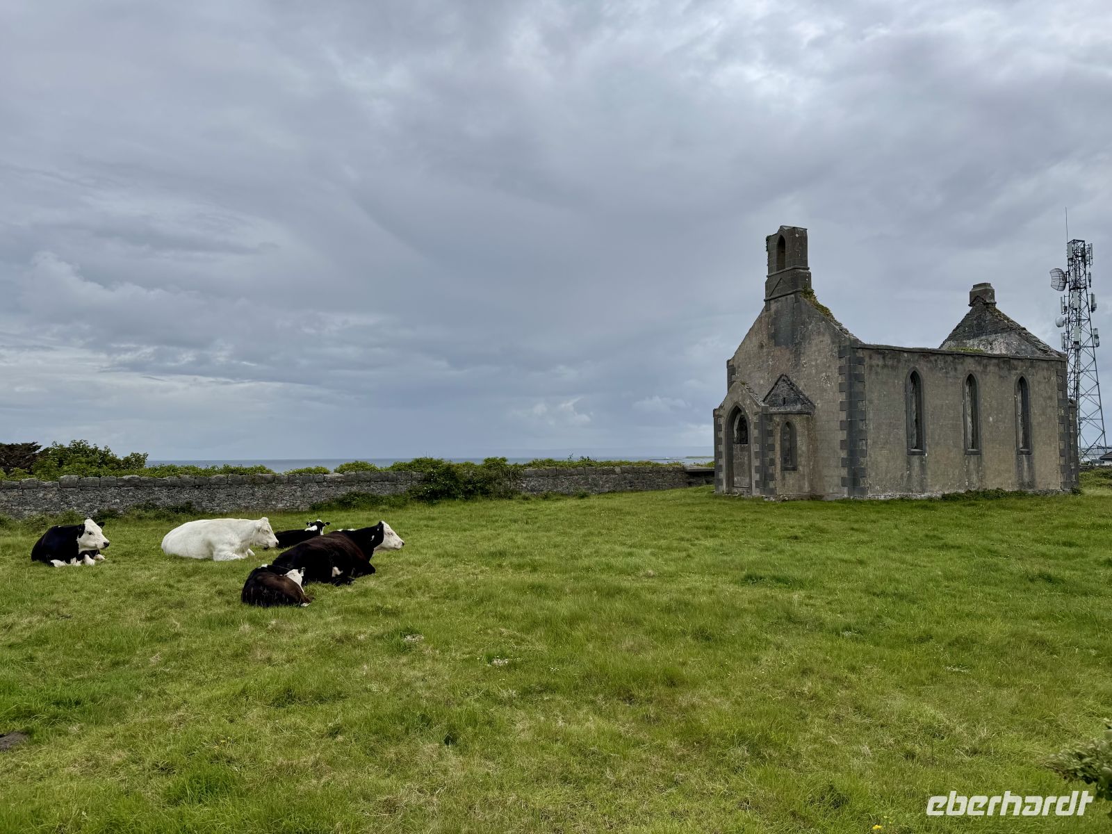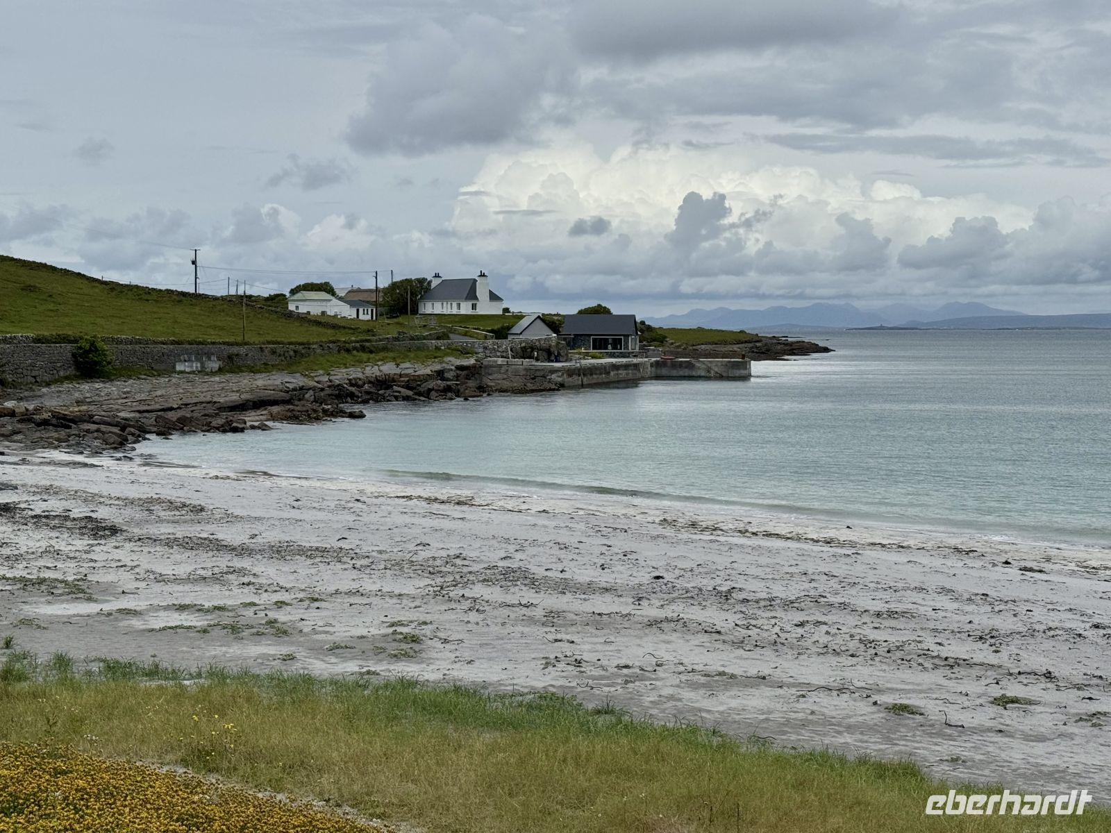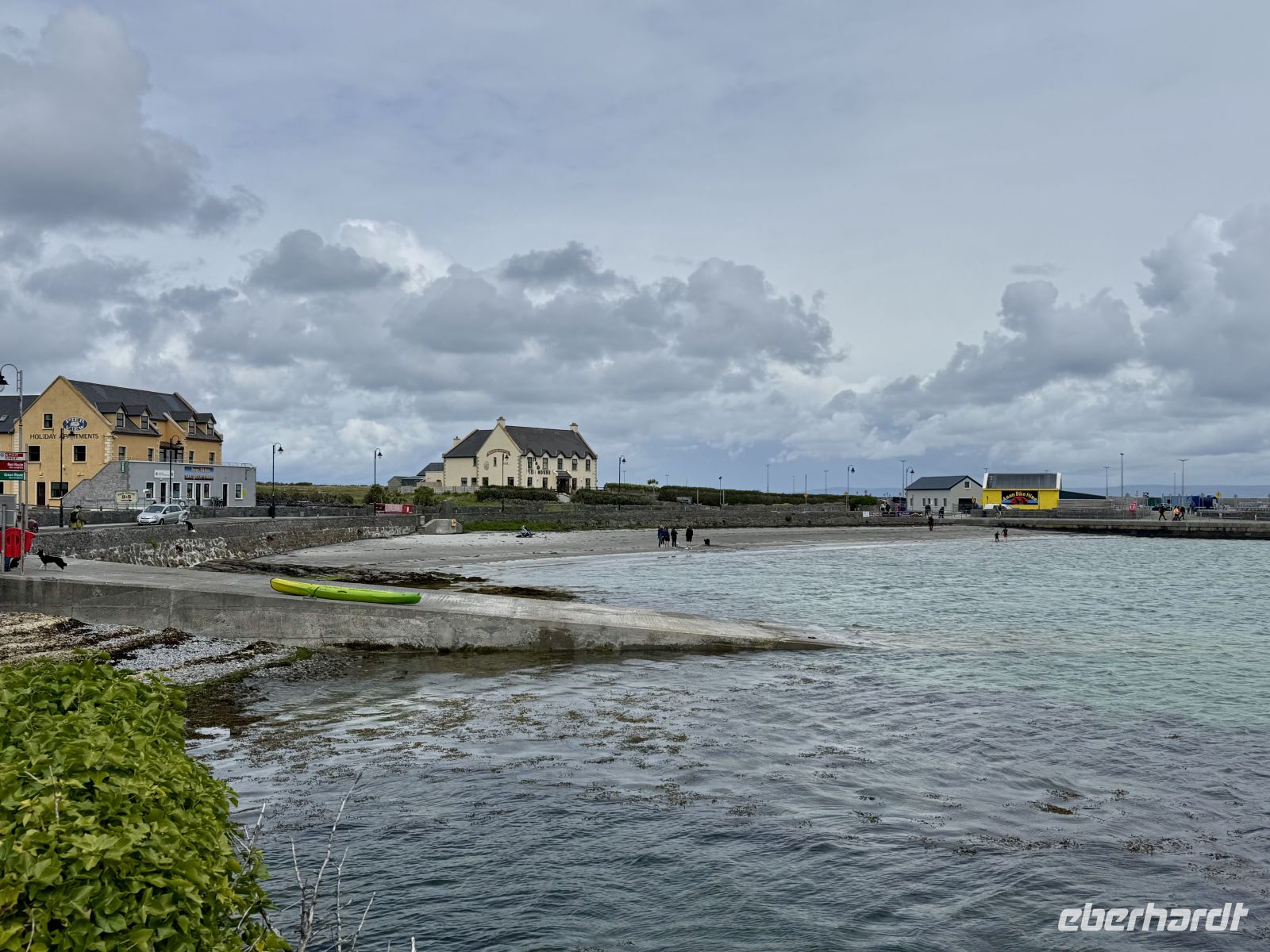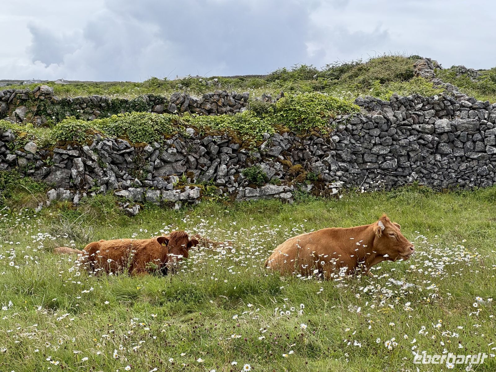 Durch die Berge Connemaras geht es nach einem reichhaltigen Frühstück zum Fährhafen von Rossaveel. Bei einem Fotostopp an einer kleinen Kirche können wir die grünen Hügel und grauen Gipfel der Maumturk Mountains fotografieren. Hätten wir doch lieber im Hotel bleiben sollen? Das fragen wir uns am Fährhafen, als wir von dunklen Regenwolken überrascht werden. Doch sie ziehen schnell vorüber und nach wenigen Minuten kommt die Sonne wieder raus. Trotzdem bleibt ein gewisses Unbehagen zurück. Nur Donal steht unbeeindruckt wie immer in kurzen Hosen neben uns. Mit fünf Minuten Verspätung legt die Fähre ab und nimmt Kurs auf Inishmore, die größte der Aran Islands. Unsere Wanderung beginnt in Kilronan und führt uns an der Nordküste der Insel entlang bis nach Killmurvey (Cill Mhuirbhigh). Wir folgen den charakteristischen Trockensteinmauern und freuen uns über Tierbegegnungen mit Pferden, Kühen und Eseln. Während der Picknickpause werden wir sogar neugierig von Kegelrobben beäugt, die ihre Köpfe aus dem Wasser recken. Einen leichten Hagelsturm stecken wir mit einem Achselzucken weg — inzwischen sind wir die Kapriolen des irischen Wetters gewohnt. Es hört ja bisher immer schnell wieder auf. Der Strand bei Killmurvey ist menschenleer. Nur ein verrückter junger Mann mit Vokuhila stürzt in einer blauen Badehose an uns vorbei und in die Fluten. Ich tippe auf Australier. Wahrscheinlich werden sich Haut und Badehose farblich schnell angleichen. Das Steinfort Dun Aengus oben auf den Klippen haben wir schon vor einer Weile erblickt. Nun sind wir fast da. Nur noch 15 Minuten Aufstieg, der sich auf jeden Fall lohnt: Auf uns warten die steilen Klippen, eine herrliche Panoramasicht über die Insel und natürlich die schützenden dicken Mauern des Steinforts selbst. Nach dem Abstieg wird es höchste Zeit für eine Kaffee-, Tee- oder Guinnesspause, bevor wir verteilt auf zwei Kleinbusse über die „Autobahn“ wieder nach Kilronan gebracht werden. Die Rückfahrt mit der Fähre nach Rossaveel verläuft deutlich holpriger, aber immer noch unter der — durch das Heraushängen gewisser Tüten markierten — Gefahrenschwelle. Donal wartet in Rossaveel bereits mit dem Bus auf uns und fährt uns durch die wunderschöne Landschaft Connemaras zurück an den Fjord, während wir gedanklich noch einmal in die Anderswelt abtauchen. Der Reiseleitervorschlag für das weitere Tagesprogramm lautet „warme Dusche, leckeres Abendessen, kuscheliges Bett“ und wird allgemein mit Wohlwollen aufgenommen.