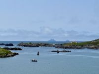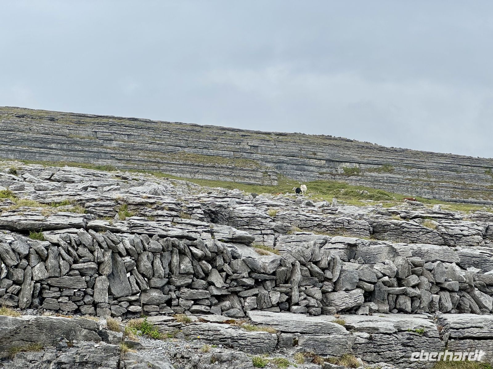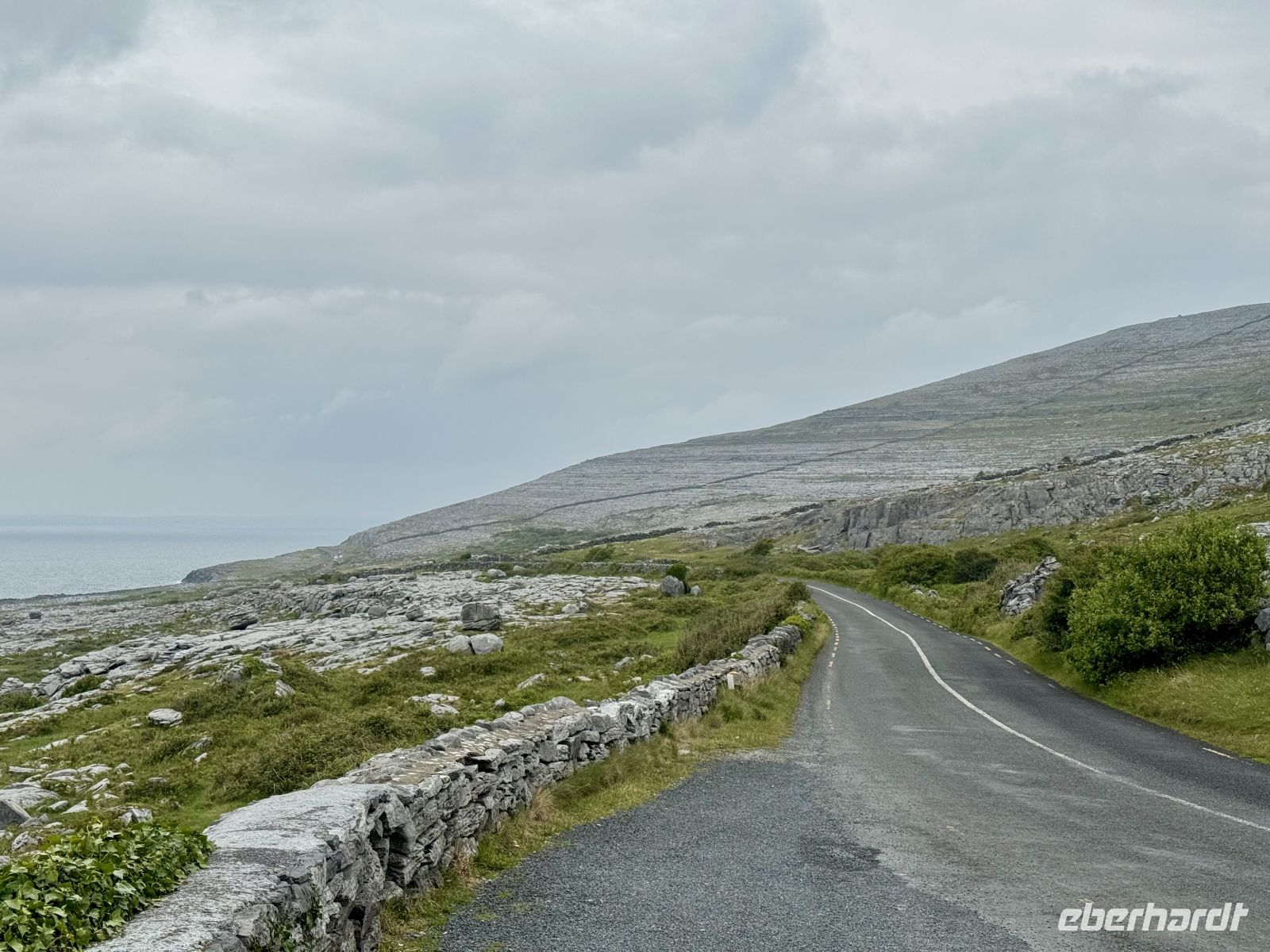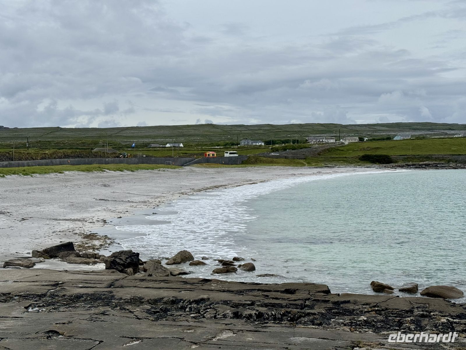 Durch die Berge Connemaras geht es nach einem reichhaltigen Frühstück zum Fährhafen von Rossaveel. Bei einem Fotostopp an einer kleinen Kirche können wir die grünen Hügel und grauen Gipfel der Maumturk Mountains fotografieren. Hätten wir doch lieber im Hotel bleiben sollen? Das fragen wir uns am Fährhafen, als wir von dunklen Regenwolken überrascht werden. Doch sie ziehen schnell vorüber und nach wenigen Minuten kommt die Sonne wieder raus. Trotzdem bleibt ein gewisses Unbehagen zurück. Nur Donal steht unbeeindruckt wie immer in kurzen Hosen neben uns. Mit fünf Minuten Verspätung legt die Fähre ab und nimmt Kurs auf Inishmore, die größte der Aran Islands. Unsere Wanderung beginnt in Kilronan und führt uns an der Nordküste der Insel entlang bis nach Killmurvey (Cill Mhuirbhigh). Wir folgen den charakteristischen Trockensteinmauern und freuen uns über Tierbegegnungen mit Pferden, Kühen und Eseln. Während der Picknickpause werden wir sogar neugierig von Kegelrobben beäugt, die ihre Köpfe aus dem Wasser recken. Einen leichten Hagelsturm stecken wir mit einem Achselzucken weg — inzwischen sind wir die Kapriolen des irischen Wetters gewohnt. Es hört ja bisher immer schnell wieder auf. Der Strand bei Killmurvey ist menschenleer. Nur ein verrückter junger Mann mit Vokuhila stürzt in einer blauen Badehose an uns vorbei und in die Fluten. Ich tippe auf Australier. Wahrscheinlich werden sich Haut und Badehose farblich schnell angleichen. Das Steinfort Dun Aengus oben auf den Klippen haben wir schon vor einer Weile erblickt. Nun sind wir fast da. Nur noch 15 Minuten Aufstieg, der sich auf jeden Fall lohnt: Auf uns warten die steilen Klippen, eine herrliche Panoramasicht über die Insel und natürlich die schützenden dicken Mauern des Steinforts selbst. Nach dem Abstieg wird es höchste Zeit für eine Kaffee-, Tee- oder Guinnesspause, bevor wir verteilt auf zwei Kleinbusse über die „Autobahn“ wieder nach Kilronan gebracht werden. Die Rückfahrt mit der Fähre nach Rossaveel verläuft deutlich holpriger, aber immer noch unter der — durch das Heraushängen gewisser Tüten markierten — Gefahrenschwelle. Donal wartet in Rossaveel bereits mit dem Bus auf uns und fährt uns durch die wunderschöne Landschaft Connemaras zurück an den Fjord, während wir gedanklich noch einmal in die Anderswelt abtauchen. Der Reiseleitervorschlag für das weitere Tagesprogramm lautet „warme Dusche, leckeres Abendessen, kuscheliges Bett“ und wird allgemein mit Wohlwollen aufgenommen.
