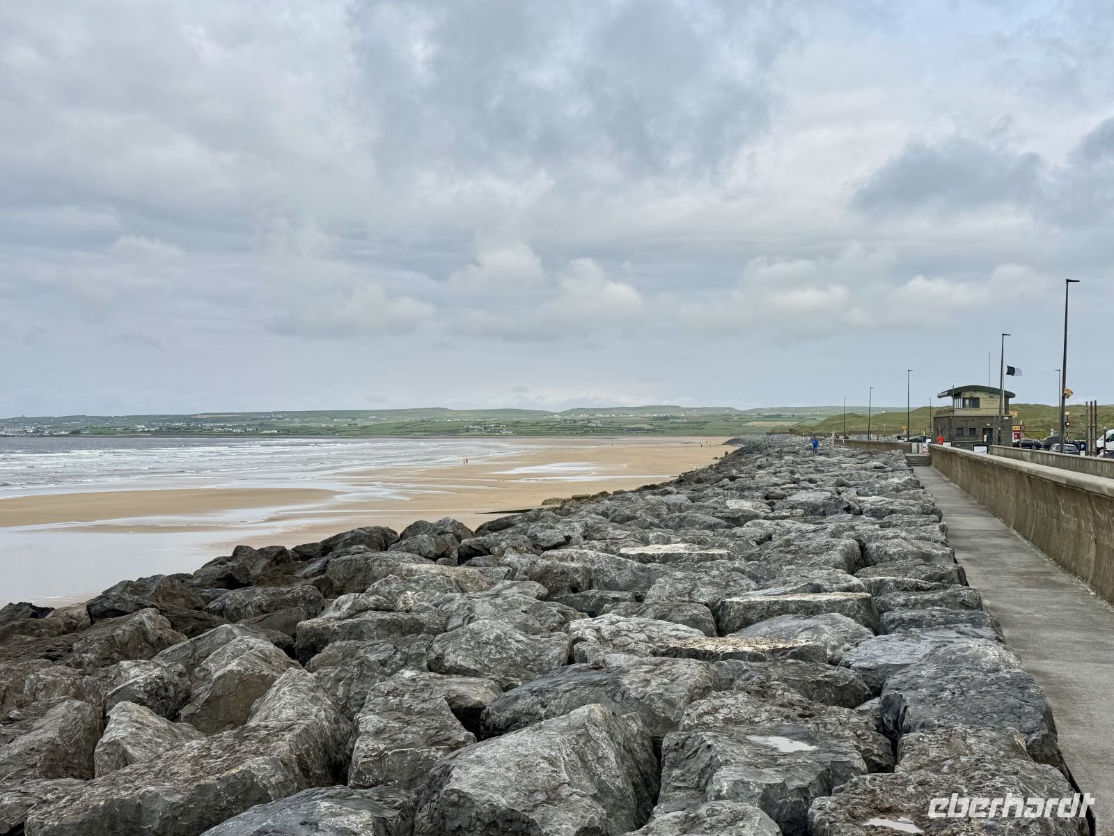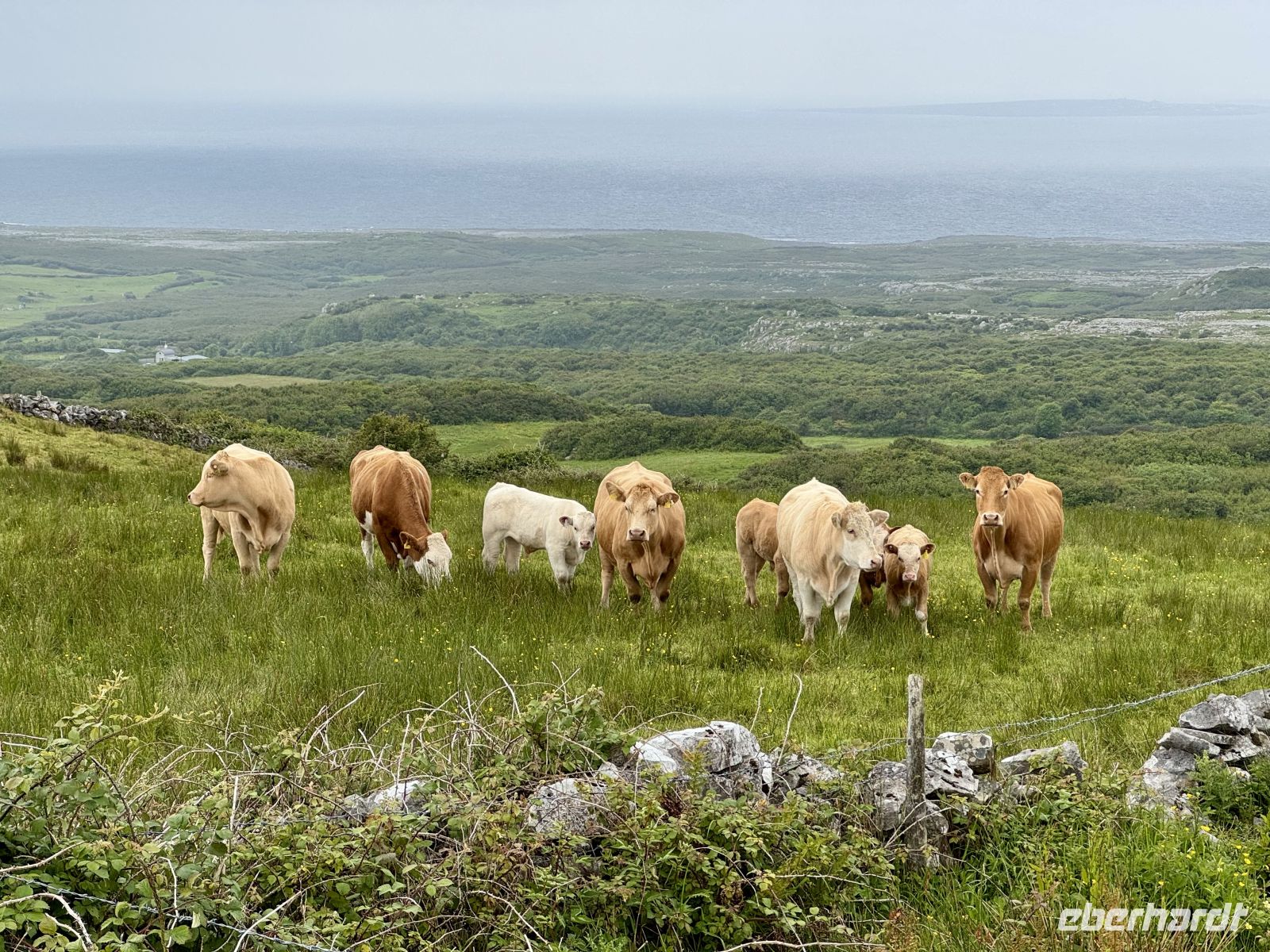 Der heutige Ausflug in den Burren führt uns zunächst an die Strandpromenade von Lahinch. Es herrscht gerade Ebbe, weshalb der breite gelbe Sandstrand gut sichtbar ist. Aber schönes Badewetter? Das haben wir heute wieder nicht. Es bleibt frisch und wechselhaft. Immer wieder treibt der Wind Regenwolken vom Atlantik an die Küste. Auch an den Cliffs of Moher behalten wir den Himmel immer gut im Auge, während wir gleichzeitig die vielen Seevögel beobachten. Wir glauben sogar, die Papageientaucher sehen zu können. Immerhin wird das Wetter ab dem Mittag wieder beständiger. Auf unserer Wanderung auf dem Burren Way regnet es nur noch einmal ganz leicht, weshalb ich mich fast ärgere, dass ich extra deswegen in meine Regenmontur geschlüpft bin. Die Kühe stehen derweil stoisch gelassen wiederkäuend auf ihrer Weide, beäugen uns und denken sich ihren Teil. Der Blick zu den Aran Islands wird am Horizont durch Nebel etwas getrübt. Wie schön, dass wir uns im Pub in Fanore aufwärmen und stärken können. Wir lassen uns Fish & Chips oder Chowder gut schmecken und/oder beugen mit Irish Coffee der Müdigkeit (Kaffee!) und einer evtl. anmarschierenden Erkältung (Whiskey!) vor — eine echte, gut schmeckende Allzweckwaffe! Während der Fahrt an die Bucht von Galway, die uns um die Landspitze Black Head führt, wähnen wir uns wahlweise in einer Steinwüste oder auf einem anderen Planeten. Der Burren macht hier seinem Namen alle Ehre. Trotzdem finden sich überall Spuren menschlicher Besiedelung — und sogar eine Schokoladenfabrik! Na so was! Und zu unserem Glück ist meine inzwischen gute Freundin Shonagh da und gibt uns eine kleine Einführung in die Schokoladenherstellung. Kosten dürfen wir natürlich auch. Mit Glückshormonen versorgt, treten wir die Rückfahrt nach Ennis an.
