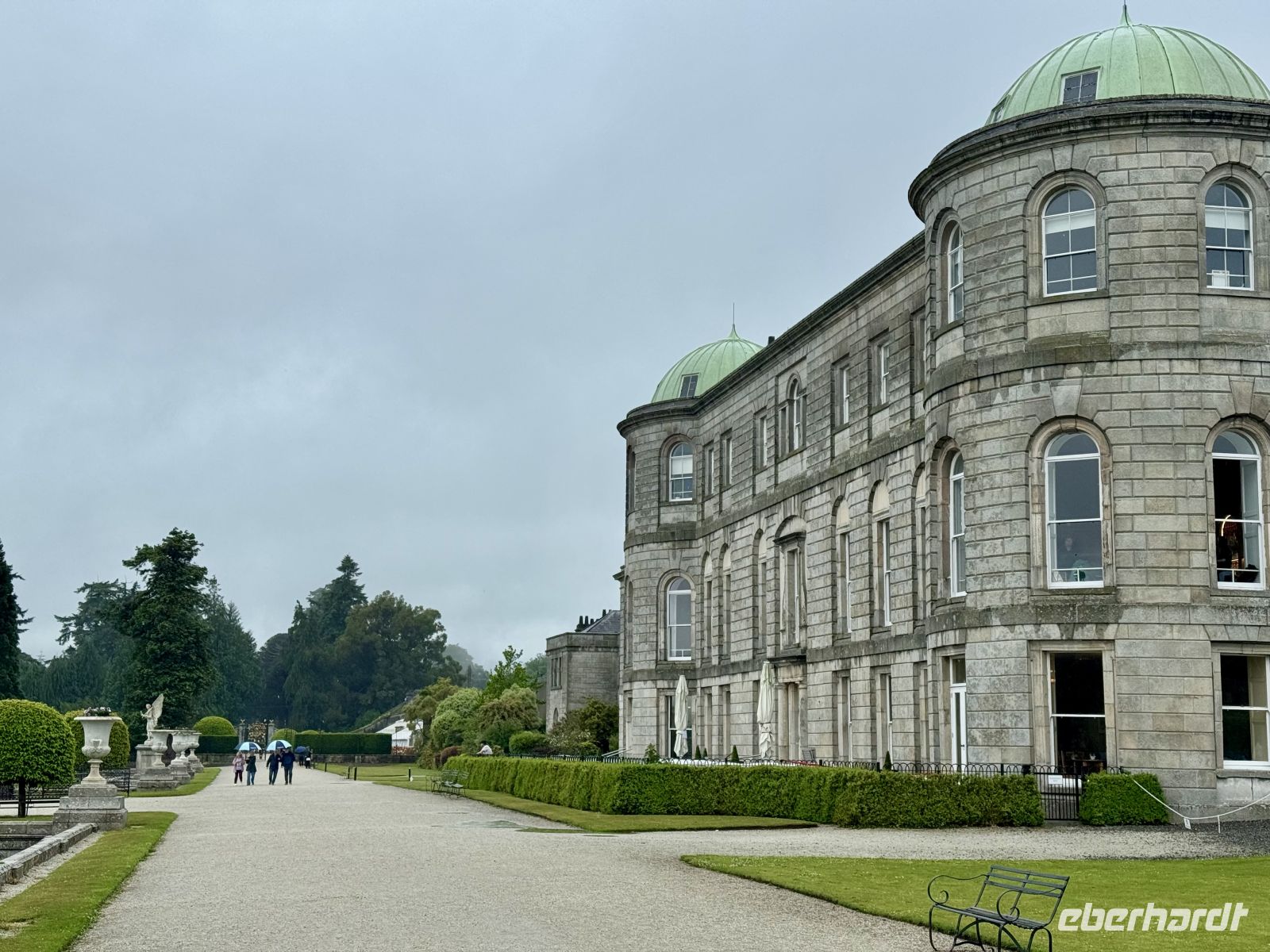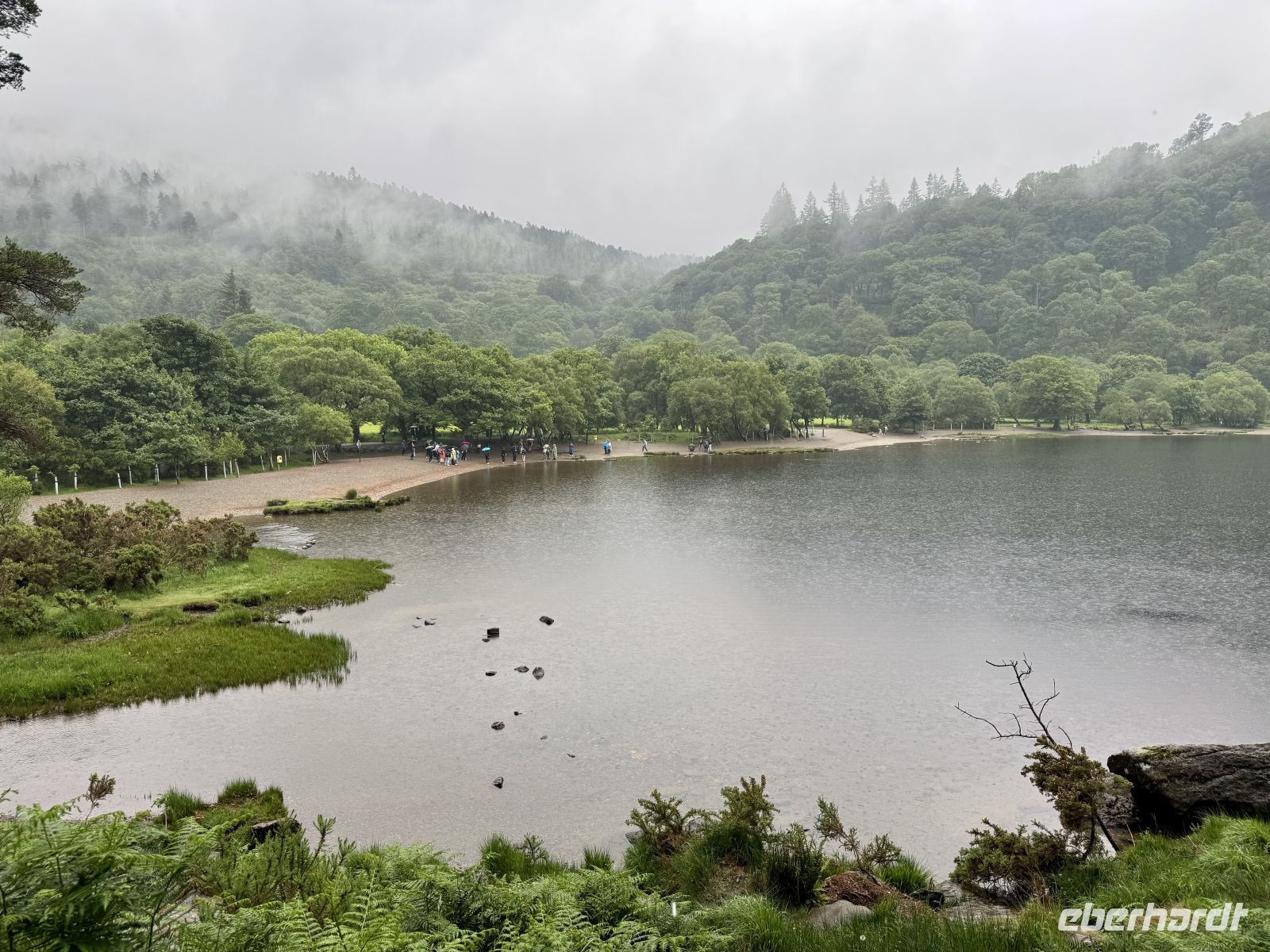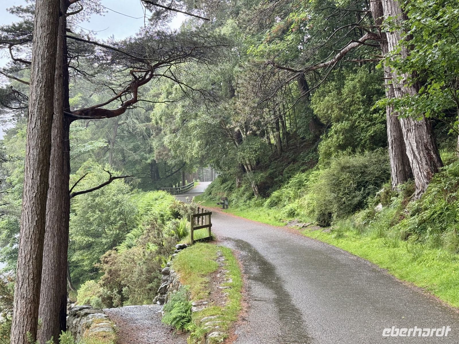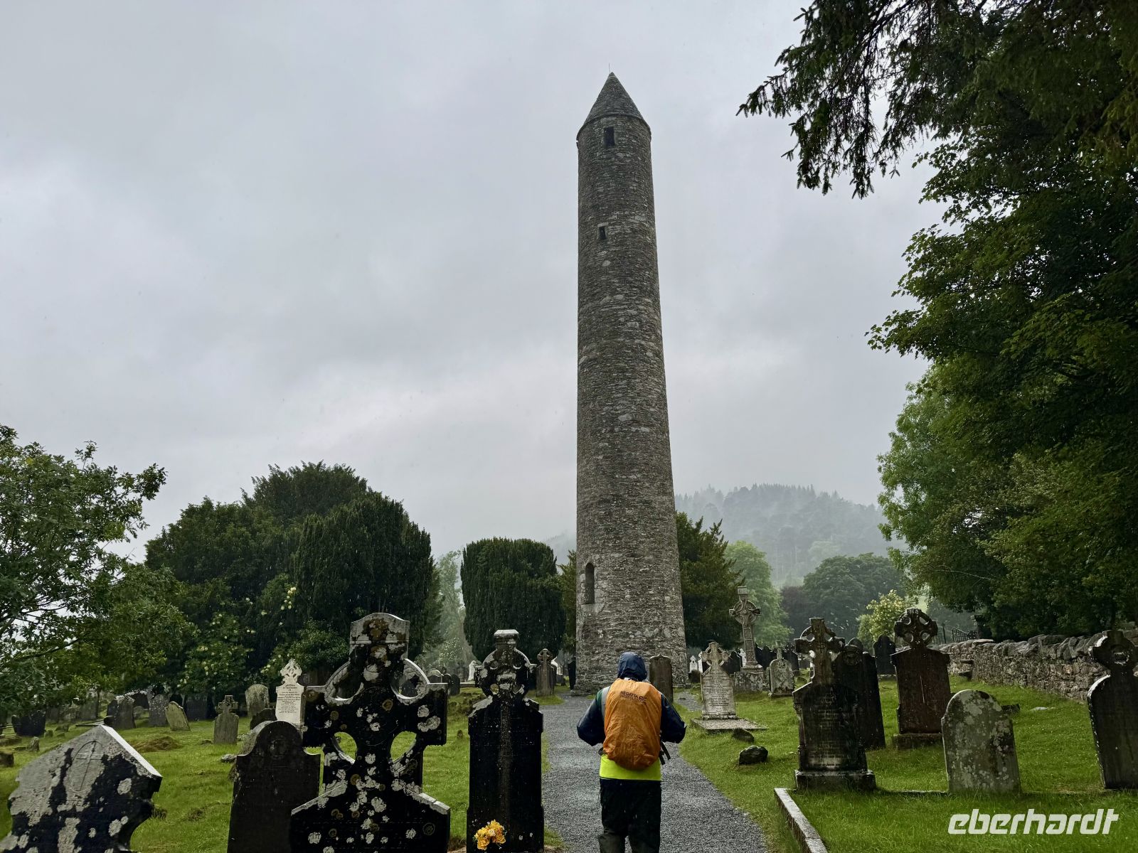 Neben den drei Nationalheiligen Patrick, Columba und Brigid gibt es auch noch den Heiligen Kevin, der inmitten der Wicklow Mountains, im schönen romantischen Tal von Glendalough, einst ein Kloster gründete. Mit seiner prächtigen Kathedrale und dem charakteristischen Rundturm entwickelte es sich sogar zu einer der größten frühchristlichen Klosteranlagen Irlands und bildete viele Missionare aus. Gewissermaßen beginnt sich mit Betreten der Ruinen der Kreis für uns zu schließen, den wir vor elf Tagen mit einem Besuch der Klosterruine von Monasterboice begonnen haben. Und ja, Irland kann auch Dauerregen. Hätten wir aber auch so geglaubt. Will uns der Wettergott einfach nur den Abschied erleichtern? Wir lassen uns unsere gute Laune nicht verderben und nehmen auch diese Wetterkapriole mit Humor. Außerdem sind wir wirklich sehr gut ausgestattet und vorbereitet. Dennoch passen wir unsere Wanderung in Glendalough etwas an und wandern zwar an beiden Seen entlang durch den herrlichen Wald, aber nur bis zum Kevin's Bed View, dem Aussichtspunkt mit Blick auf die Schlafhöhle des heiligen Klostergründers. Zuvor hatte ich demonstriert, wie er mit ausgebreiteten Armen am Ufer des oberen Sees so lange im Wasser stand und gebetet hat, bis die Vögel angefangen haben, auf seinen Armen Nester zu bauen. Beweisfotos davon sollen angeblich im Internet kursieren. Freundlicherweise warte ich sogar ab, bis der Vogelnachwuchs geschlüpft ist. Wir haben ja Zeit, der Termin an der Whiskeybrennerei ist erst um 16:00 Uhr. Nachdem wir uns mit einem Kaffee, Tee oder einer heißen Schokolade unter dem schützenden Dach eines Cafés etwas gestärkt haben, begeben wir uns für eine Filmvorführung ins Besucherzentrum. Im Video tauchen viele Orte und Namen auf, über die wir im Laufe unserer Reise bereits gestolpert sind. Am Nachmittag besuchen wir außerdem die Powerscourt Gardens, wenngleich es uns wetterbedingt zunächst nur ins Restaurant im großen Herrenhaus zieht. Zwischenzeitlich klart es aber auf, sodass sich doch noch die Gelegenheit für eine Runde durch die verschiedenen Gartenbereiche ergibt. Donal fährt uns dann freundlicherweise hinüber zur Powerscourt Distillery, wo wir bereits von Callum erwartet werden. Er zeigt uns das alte Mühlengebäude, die moderne Produktionshalle und eine der Lagerhallen mit vielen, vielen Fässern. Allein der Geruch in der Halle … Drei ganz unterschiedliche, aber jeweils prämierte Whiskeys dürfen wir schließlich verkosten. Das kostbare Lebenswasser wärmt (und desinfiziert) unsere Kehlen. Bei diesem Wetter genau das richtige Getränk! Schnell sind wir dann wieder zurück im Hotel und treffen uns zum Abschiedsabendessen – mit Donal, dem besten Busfahrer Irlands, als Ehrengast!