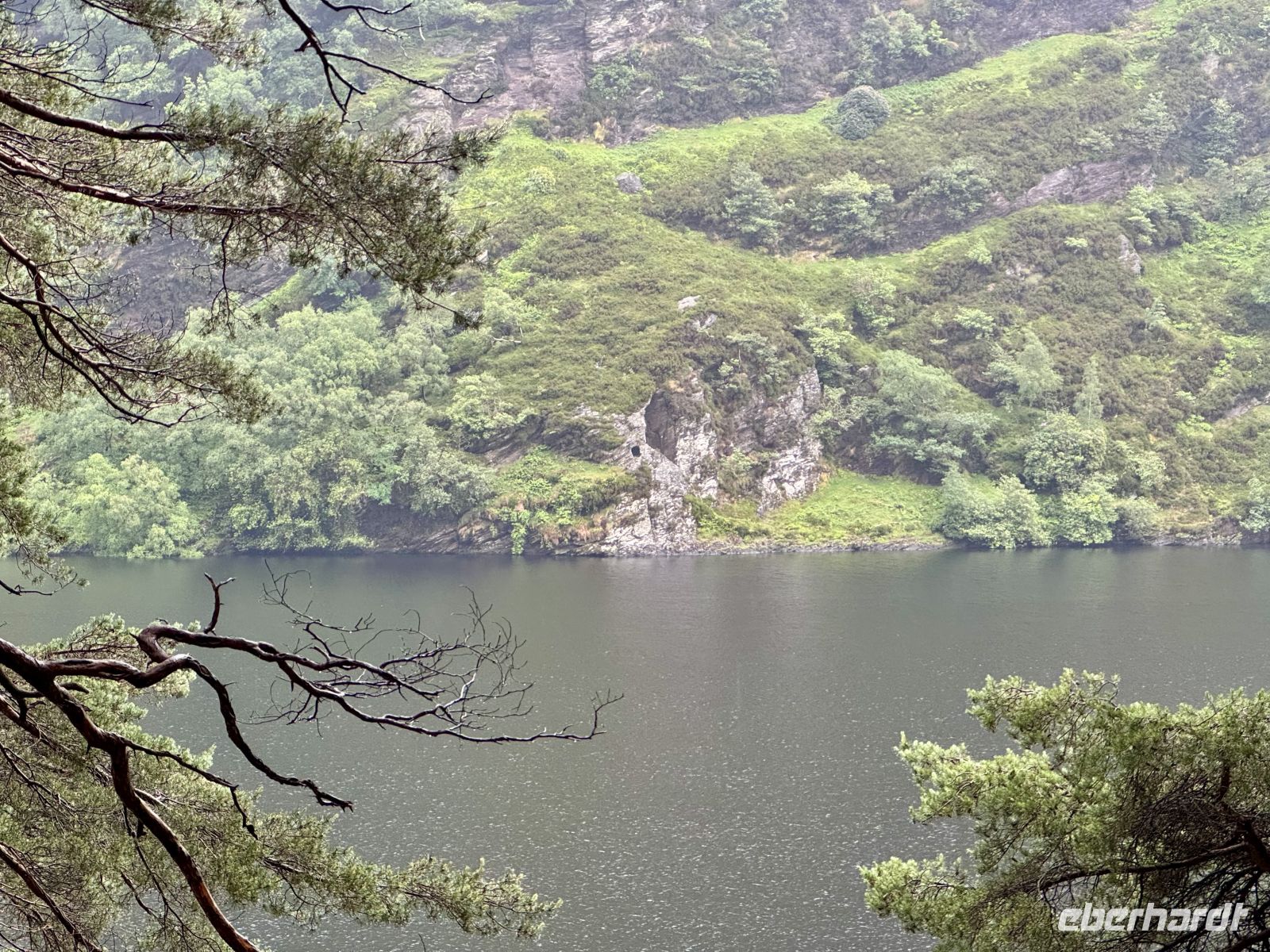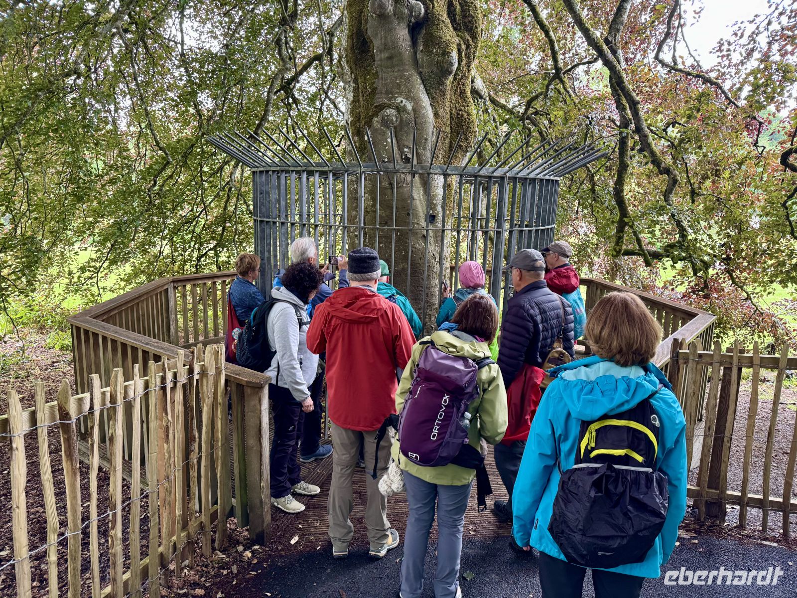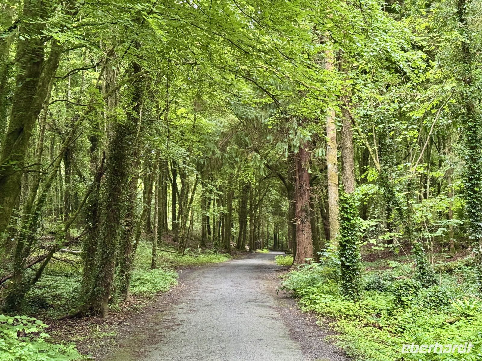 Neben den drei Nationalheiligen Patrick, Columba und Brigid gibt es auch noch den Heiligen Kevin, der inmitten der Wicklow Mountains, im schönen romantischen Tal von Glendalough, einst ein Kloster gründete. Mit seiner prächtigen Kathedrale und dem charakteristischen Rundturm entwickelte es sich sogar zu einer der größten frühchristlichen Klosteranlagen Irlands und bildete viele Missionare aus. Gewissermaßen beginnt sich mit Betreten der Ruinen der Kreis für uns zu schließen, den wir vor elf Tagen mit einem Besuch der Klosterruine von Monasterboice begonnen haben. Und ja, Irland kann auch Dauerregen. Hätten wir aber auch so geglaubt. Will uns der Wettergott einfach nur den Abschied erleichtern? Wir lassen uns unsere gute Laune nicht verderben und nehmen auch diese Wetterkapriole mit Humor. Außerdem sind wir wirklich sehr gut ausgestattet und vorbereitet. Dennoch passen wir unsere Wanderung in Glendalough etwas an und wandern zwar an beiden Seen entlang durch den herrlichen Wald, aber nur bis zum Kevin's Bed View, dem Aussichtspunkt mit Blick auf die Schlafhöhle des heiligen Klostergründers. Zuvor hatte ich demonstriert, wie er mit ausgebreiteten Armen am Ufer des oberen Sees so lange im Wasser stand und gebetet hat, bis die Vögel angefangen haben, auf seinen Armen Nester zu bauen. Beweisfotos davon sollen angeblich im Internet kursieren. Freundlicherweise warte ich sogar ab, bis der Vogelnachwuchs geschlüpft ist. Wir haben ja Zeit, der Termin an der Whiskeybrennerei ist erst um 16:00 Uhr. Nachdem wir uns mit einem Kaffee, Tee oder einer heißen Schokolade unter dem schützenden Dach eines Cafés etwas gestärkt haben, begeben wir uns für eine Filmvorführung ins Besucherzentrum. Im Video tauchen viele Orte und Namen auf, über die wir im Laufe unserer Reise bereits gestolpert sind. Am Nachmittag besuchen wir außerdem die Powerscourt Gardens, wenngleich es uns wetterbedingt zunächst nur ins Restaurant im großen Herrenhaus zieht. Zwischenzeitlich klart es aber auf, sodass sich doch noch die Gelegenheit für eine Runde durch die verschiedenen Gartenbereiche ergibt. Donal fährt uns dann freundlicherweise hinüber zur Powerscourt Distillery, wo wir bereits von Callum erwartet werden. Er zeigt uns das alte Mühlengebäude, die moderne Produktionshalle und eine der Lagerhallen mit vielen, vielen Fässern. Allein der Geruch in der Halle … Drei ganz unterschiedliche, aber jeweils prämierte Whiskeys dürfen wir schließlich verkosten. Das kostbare Lebenswasser wärmt (und desinfiziert) unsere Kehlen. Bei diesem Wetter genau das richtige Getränk! Schnell sind wir dann wieder zurück im Hotel und treffen uns zum Abschiedsabendessen – mit Donal, dem besten Busfahrer Irlands, als Ehrengast!