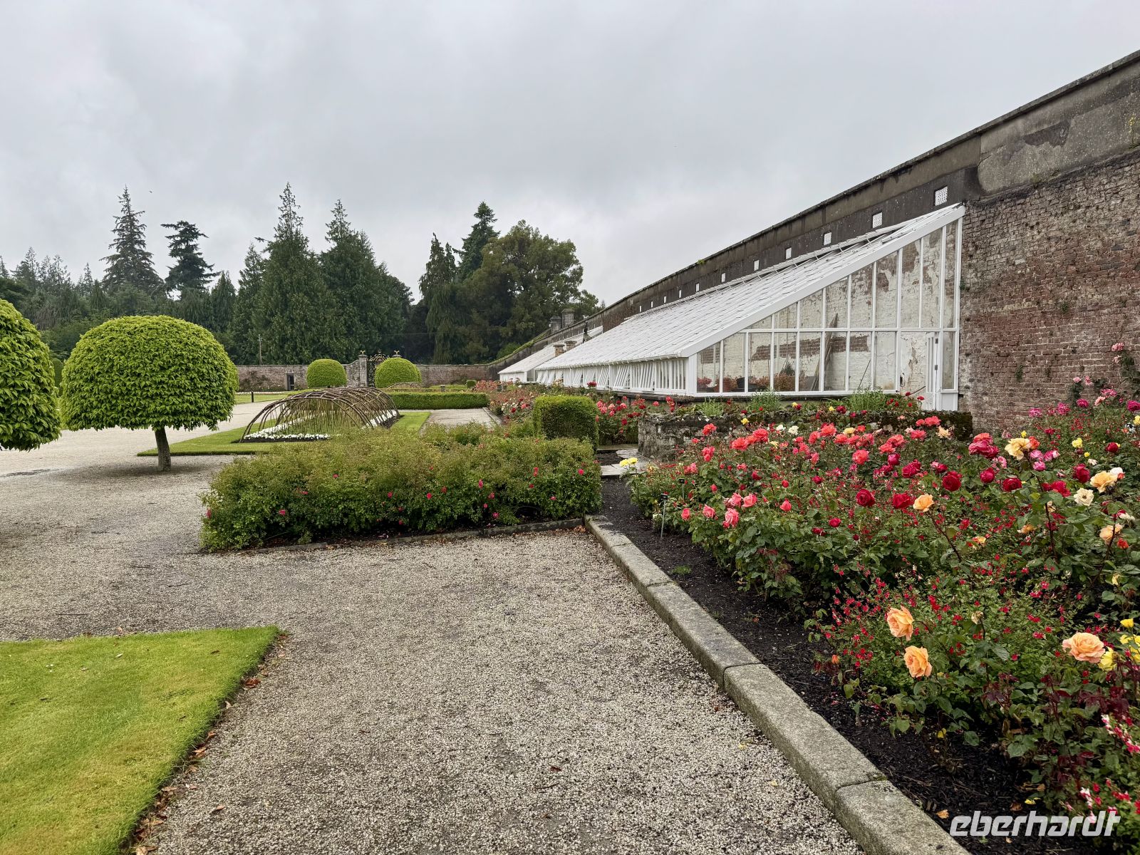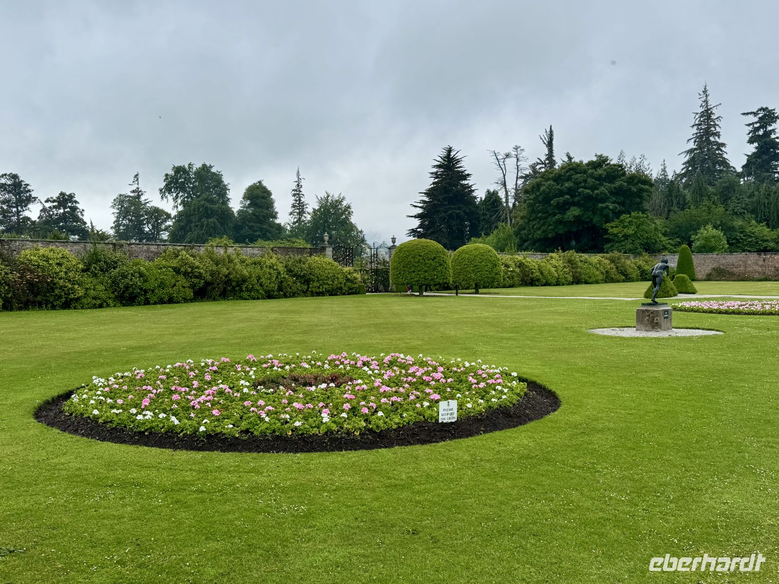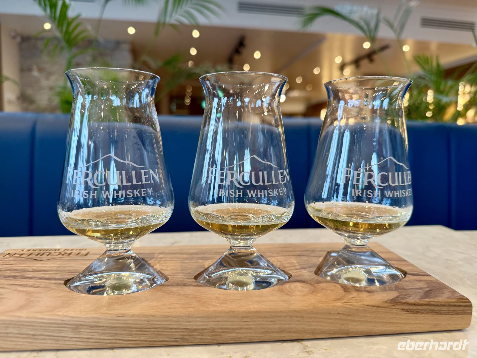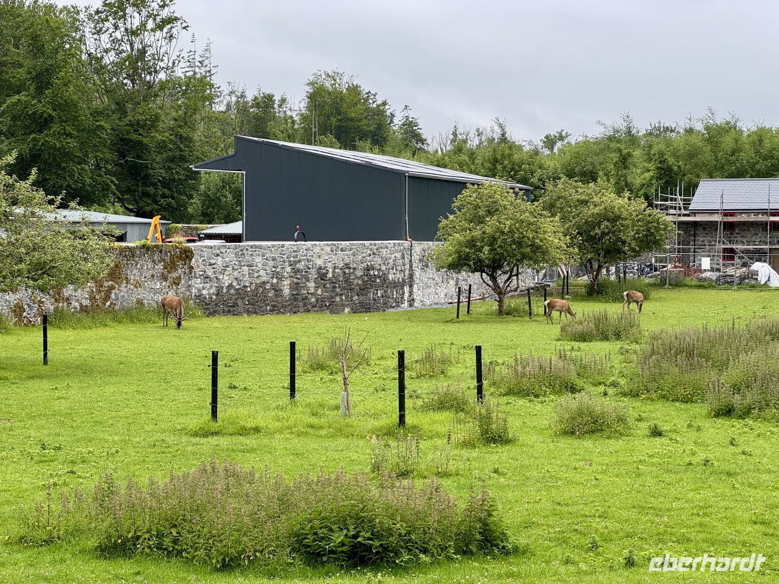 Neben den drei Nationalheiligen Patrick, Columba und Brigid gibt es auch noch den Heiligen Kevin, der inmitten der Wicklow Mountains, im schönen romantischen Tal von Glendalough, einst ein Kloster gründete. Mit seiner prächtigen Kathedrale und dem charakteristischen Rundturm entwickelte es sich sogar zu einer der größten frühchristlichen Klosteranlagen Irlands und bildete viele Missionare aus. Gewissermaßen beginnt sich mit Betreten der Ruinen der Kreis für uns zu schließen, den wir vor elf Tagen mit einem Besuch der Klosterruine von Monasterboice begonnen haben. Und ja, Irland kann auch Dauerregen. Hätten wir aber auch so geglaubt. Will uns der Wettergott einfach nur den Abschied erleichtern? Wir lassen uns unsere gute Laune nicht verderben und nehmen auch diese Wetterkapriole mit Humor. Außerdem sind wir wirklich sehr gut ausgestattet und vorbereitet. Dennoch passen wir unsere Wanderung in Glendalough etwas an und wandern zwar an beiden Seen entlang durch den herrlichen Wald, aber nur bis zum Kevin's Bed View, dem Aussichtspunkt mit Blick auf die Schlafhöhle des heiligen Klostergründers. Zuvor hatte ich demonstriert, wie er mit ausgebreiteten Armen am Ufer des oberen Sees so lange im Wasser stand und gebetet hat, bis die Vögel angefangen haben, auf seinen Armen Nester zu bauen. Beweisfotos davon sollen angeblich im Internet kursieren. Freundlicherweise warte ich sogar ab, bis der Vogelnachwuchs geschlüpft ist. Wir haben ja Zeit, der Termin an der Whiskeybrennerei ist erst um 16:00 Uhr. Nachdem wir uns mit einem Kaffee, Tee oder einer heißen Schokolade unter dem schützenden Dach eines Cafés etwas gestärkt haben, begeben wir uns für eine Filmvorführung ins Besucherzentrum. Im Video tauchen viele Orte und Namen auf, über die wir im Laufe unserer Reise bereits gestolpert sind. Am Nachmittag besuchen wir außerdem die Powerscourt Gardens, wenngleich es uns wetterbedingt zunächst nur ins Restaurant im großen Herrenhaus zieht. Zwischenzeitlich klart es aber auf, sodass sich doch noch die Gelegenheit für eine Runde durch die verschiedenen Gartenbereiche ergibt. Donal fährt uns dann freundlicherweise hinüber zur Powerscourt Distillery, wo wir bereits von Callum erwartet werden. Er zeigt uns das alte Mühlengebäude, die moderne Produktionshalle und eine der Lagerhallen mit vielen, vielen Fässern. Allein der Geruch in der Halle … Drei ganz unterschiedliche, aber jeweils prämierte Whiskeys dürfen wir schließlich verkosten. Das kostbare Lebenswasser wärmt (und desinfiziert) unsere Kehlen. Bei diesem Wetter genau das richtige Getränk! Schnell sind wir dann wieder zurück im Hotel und treffen uns zum Abschiedsabendessen – mit Donal, dem besten Busfahrer Irlands, als Ehrengast!