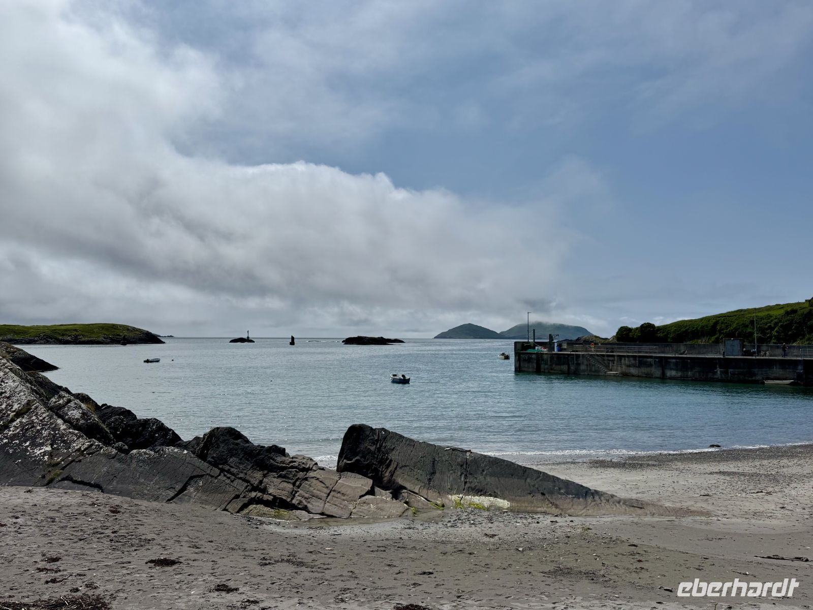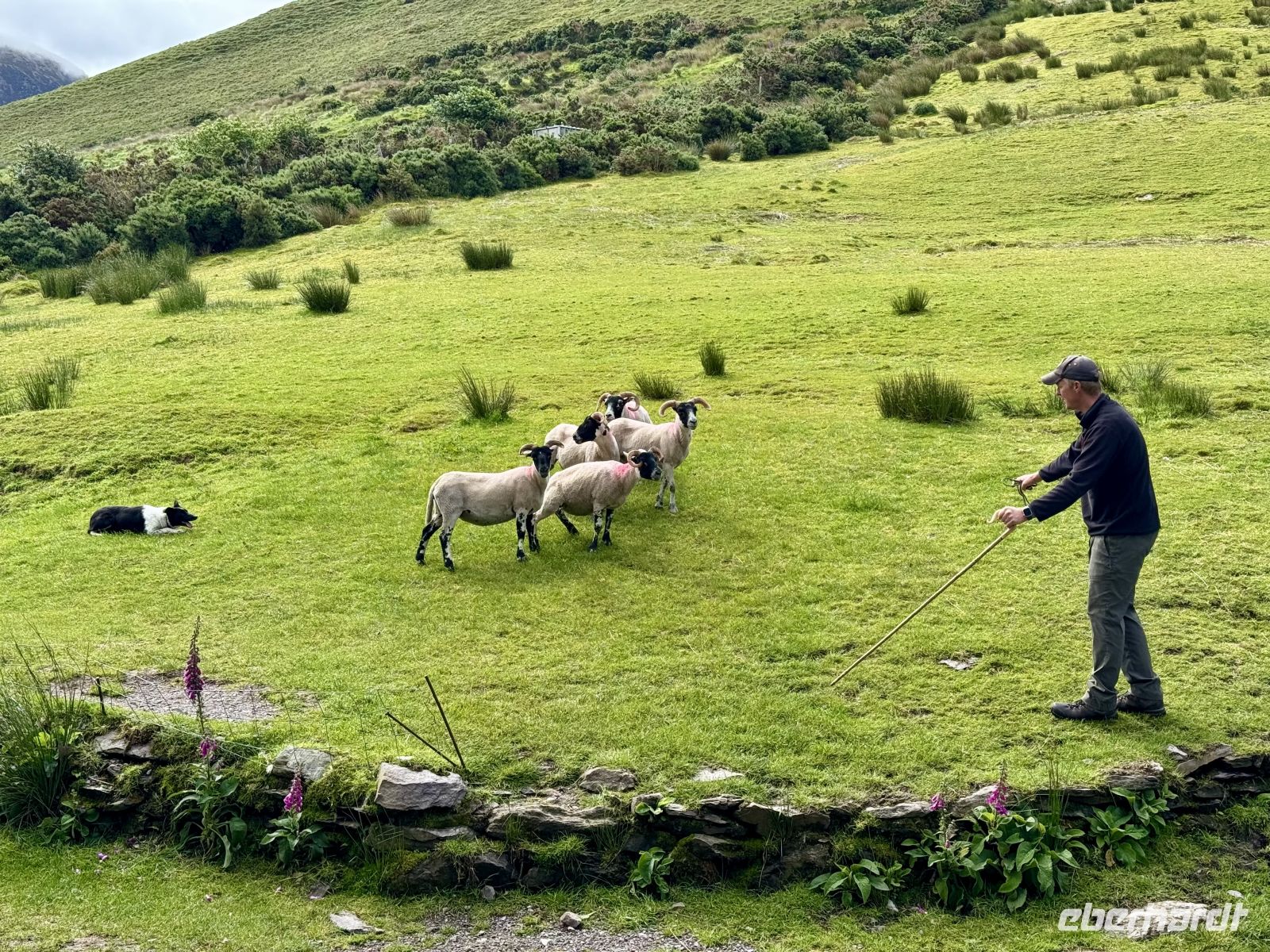 Ein banger Blick zum Himmel. Wird es regnen oder nicht? Können wir auf dem Ring of Kerry eine zusätzliche Wanderung machen oder nicht? Zwischen Tralee und Killorglin fällt tatsächlich nochmal etwas Regen, dann bleibt es aber für den Rest des Tages trocken. In Killorglin erfolgt der inzwischen obligatorische Einkaufsstopp für die Mittagspause, gefolgt von der ersten Überraschung des Tages: einem Besuch bei Claire, Tess, Peg und Schäfer Tom in der Nähe von Kells. Wir erhalten einen Einblick in ihre tägliche Arbeit und bewundern das enge Band zwischen Hündinnen und Herrchen. Hinter Cahersiveen biegt Donal plötzlich vom Ring of Kerry auf eine schmale Straße ab. Was hat er vor? Er will uns den kleinen Strand an der St Finian's Bay zeigen sowie die tolle Aussicht auf die Skellig Islands. Auch hier gibt es rein zufällig eine Schokoladenfabrik, an der wir spontan unsere Mittagspause machen. Sandwiches haben wir mit, Heißgetränke gibt es an der Theke. Perfekt. Nun aber zurück zum Ring of Kerry, denn Charlie Chaplin erwartet uns schon in Waterville! Und gleich danach wartet die spektakuläre Aussicht am Coomakista Pass! Und danach geht dann die Zusatzwanderung los! Nun folgt Höhepunkt auf Höhepunkt. Anfangs wird die Sicht durch Wolken getrübt, die uns regelrecht einhüllen, doch je mehr wir hinabsteigen, je näher wir dem Meer kommen, desto besser wird die Aussicht. Kleine Buchten mit tanzenden Booten, verwunschene Rhododendronwälder, felsige Inseln, am Ende ein traumhafter Strand zum Baden. Die Wanderung bietet alles, obgleich sie nicht ganz einfach ist. Und das Derrynane House bietet uns am Ende die Gelegenheit zu einer Kaffee- und Kuchenpause. Und Eis gibt es natürlich auch. Gewohnt zügig geht es mit Donal dann bis zum Aussichtspunkt Ladies' View im Killarney-Nationalpark voran. Danach sind seine Fahrkünste jedoch wirklich gefragt, denn aufgrund einer Umleitung durch einen Verkehrsunfall kommen uns sehr, sehr, sehr viele Autos entgegen, sogar Transporter und kleinere Busse. Wir ziehen unseren Hut vor der Fahrerin im Bus vor uns, die uns mit unendlich viel Geduld und viel Fingerspitzengefühl den Weg bahnt. Auch wenn wir etwas Zeit verloren haben, machen wir dennoch unseren geplanten Spaziergang vom Torc Waterfall zum Muckross House inmitten des Nationalparks. Erstens ist es eine wirklich schöne Parkanlage und zweitens wird es nochmal sehr schön und sonnig. Hat sich also auch wieder gelohnt! Ein weiterer Unfall auf der Hauptstraße zwischen Killarney und Tralee zwingt uns auf eine Nebenstrecke, die aber landschaftlich viel reizvoller ist. Weil wir einfach den allerbesten Fahrer haben, müssen wir das Abendessen im Grand Hotel nur um 15–20 Minuten verschieben — und obendrein spendiert die Agentur noch einen Drink für alle!