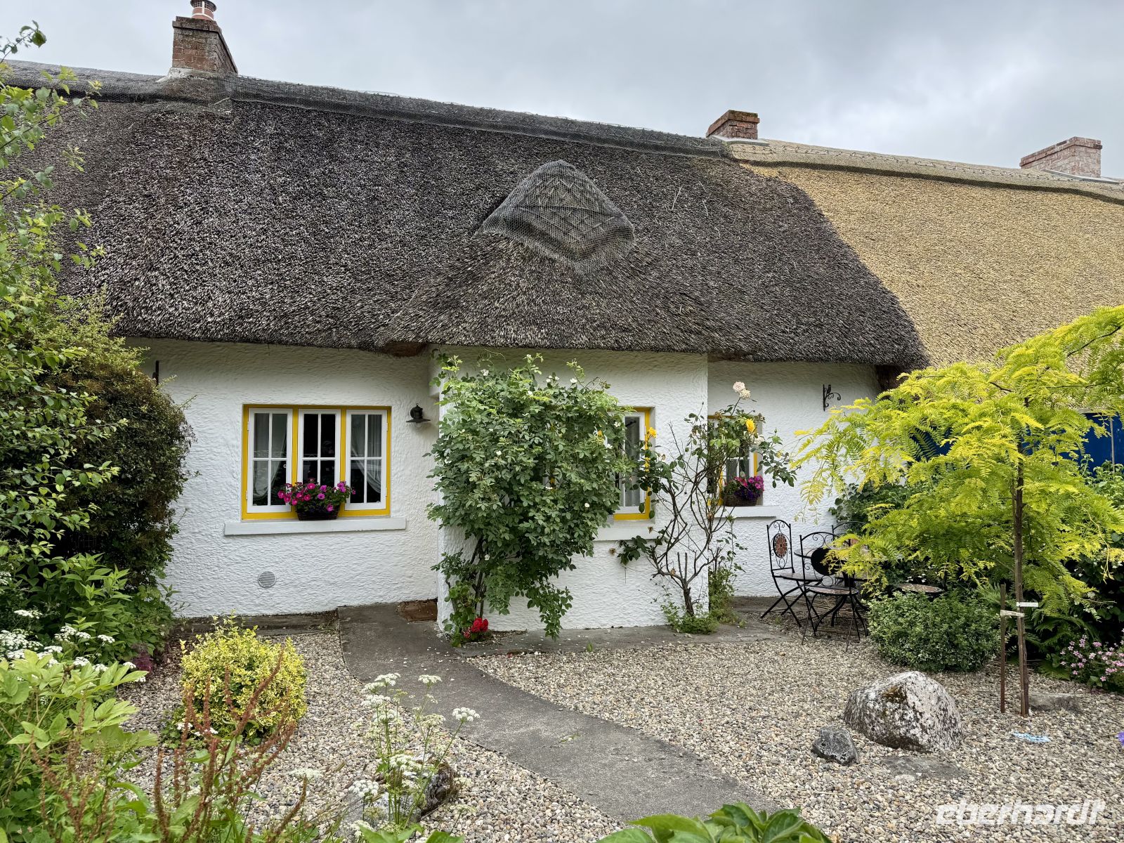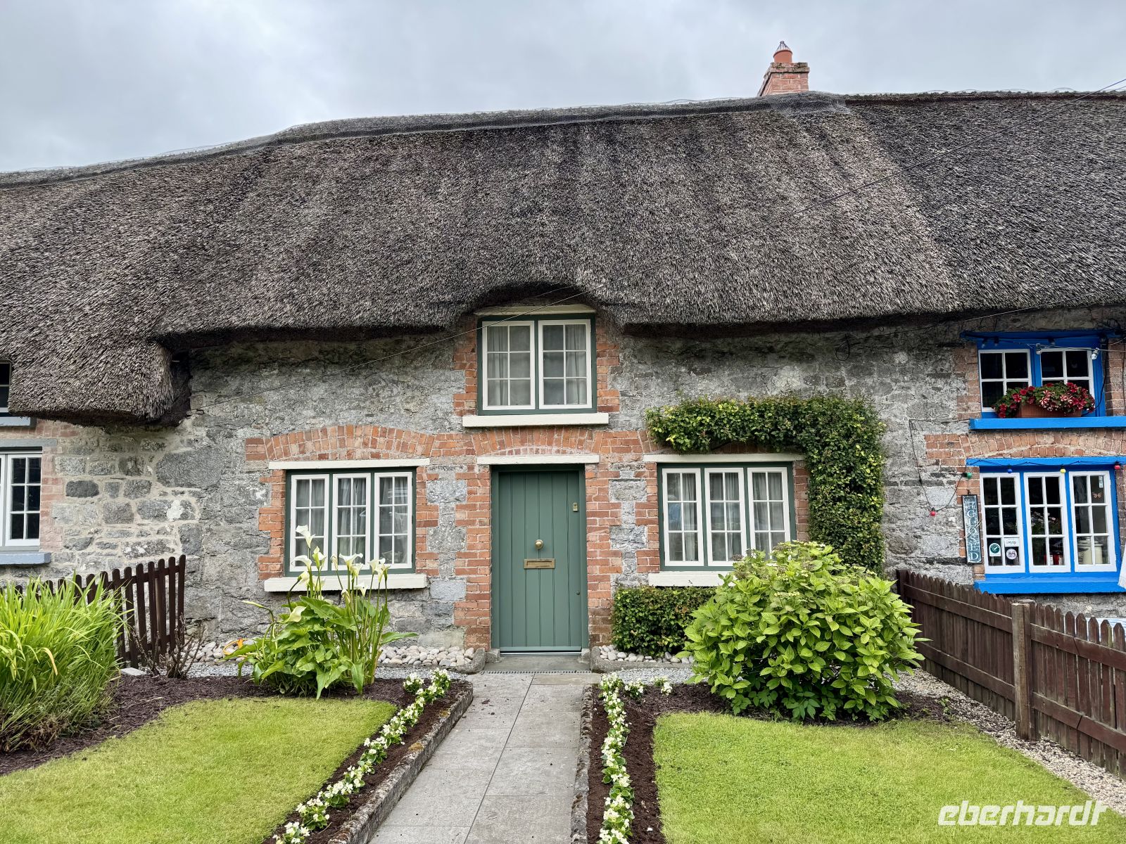 Der Abschied von der schönen Westküste fällt schwer, vor allem nach dem gestrigen Tag mit unserer zusätzlichen Wanderung. Unsere Fahrt in die Wicklow Mountains südlich von Dublin unterbrechen wir mit zwei Zwischenstopps: In Adare besichtigen wir das Desmond Castle und in Kildare das Nationalgestüt, jeweils verbunden mit einer Führung. Unseren ersten Guide namens Mark treffen wir am Besucherzentrum in Adare und fahren gemeinsam zur Ruine der normannischen Burg. Während der Besichtung erklärt er uns viele Details der Anlage, u. a. die normannische Variante des Gerüstbaus und den Ursprung des Wortes Garderobe. Im Anschluss bleiben wir noch eine Weile in Adare, machen gleich unsere Mittagspause und fotografieren die hübschen strohgedeckten Cottages an der Hauptstraße. Kurz hinter Limerick sorgt Donal für gleich zwei Überraschungen. Wir lernen seine Frau kennen und er singt uns ein Ständchen! Den Nachmittag verbringen wir dann mit unserem zweiten Guide Ross auf dem Gestüt. Die süßen Fohlen — gerade drei Monate alt — verzaubern uns mit ihren rührenden Blicken. Aber wir treffen natürlich auch die Zuchthengste und vier Legenden des Springreitens. Feen soll es auf dem Gestüt ebenfalls geben und im Japanischen Garten können meine Gäste den Pfad des Lebens beschreiten. Und alles ohne Regen! Sogar die Sonne lässt sich am Nachmittag und Abend blicken. (Bloß nicht auf den Wetterbericht für morgen schauen …) Unser letztes Hotel in Newtownmountkennedy in den Wicklow Mountains erreichen wir fast planmäßig kurz nach 18 Uhr, nachdem wir uns durch den — zum Glück schon nachlassenden — Feierabendverkehr bei Dublin und Bray gekämpft haben. Also eigentlich Donal, aber wir haben ihm alle moralische Unterstützung geleistet. Das Hotelrestaurant haben wir glücklicherweise ganz für uns und verbringen deshalb einen sehr ruhigen und entspannten Abend.