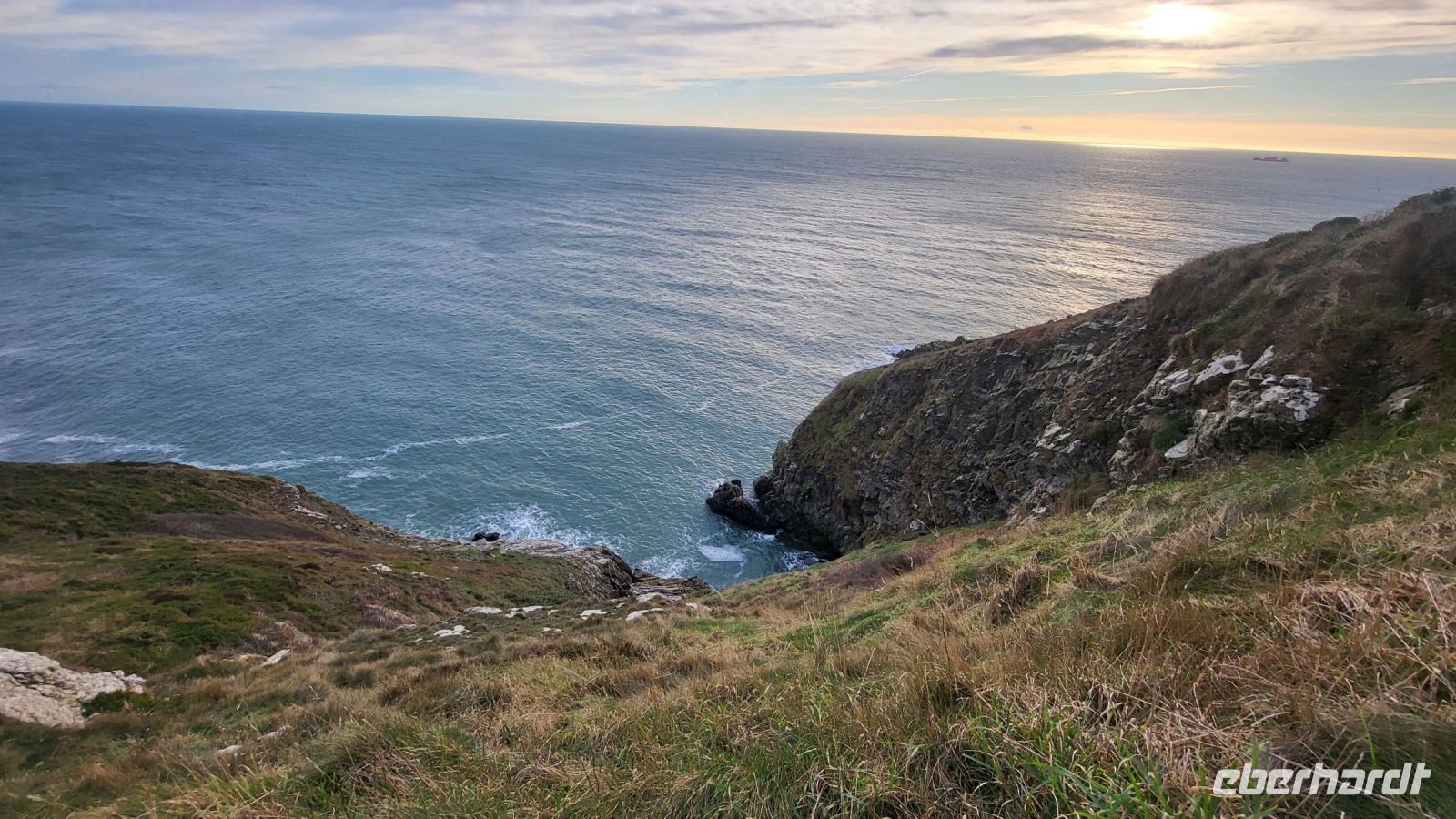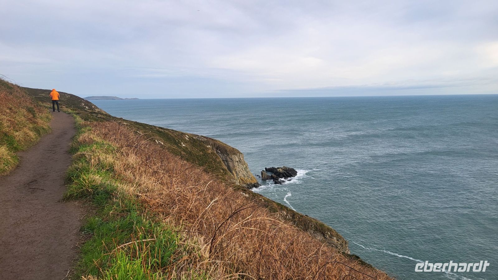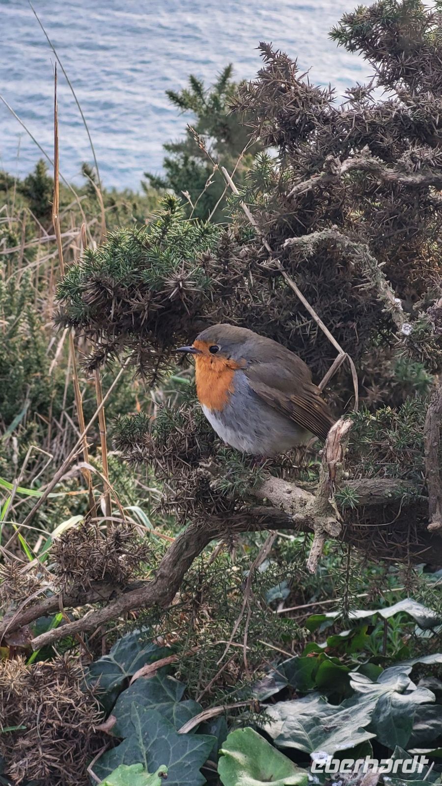 Am Aussichtspunkt „The Summit“ angekommen, beginnen wir unsere Wanderung entlang der Küste. Die Sonne glitzert auf dem ruhigen Wasser, und mit jedem Schritt eröffnet sich ein neuer, atemberaubender Blick auf die irische See. Ein kleines Rotkehlchen begleitet uns dabei fast wie ein kleiner Reiseführer, setzt sich immer wieder in Szene und scheint es zu genießen, für unsere Kameras zu posieren. Besonders faszinierend ist der blühende Stechginster, der mit seinen gelben Tupfern den Winter für einen Moment vergessen lässt. Auch viele Einheimische sind unterwegs, sodass wir uns inmitten der entspannten Atmosphäre wie echte Iren fühlen.