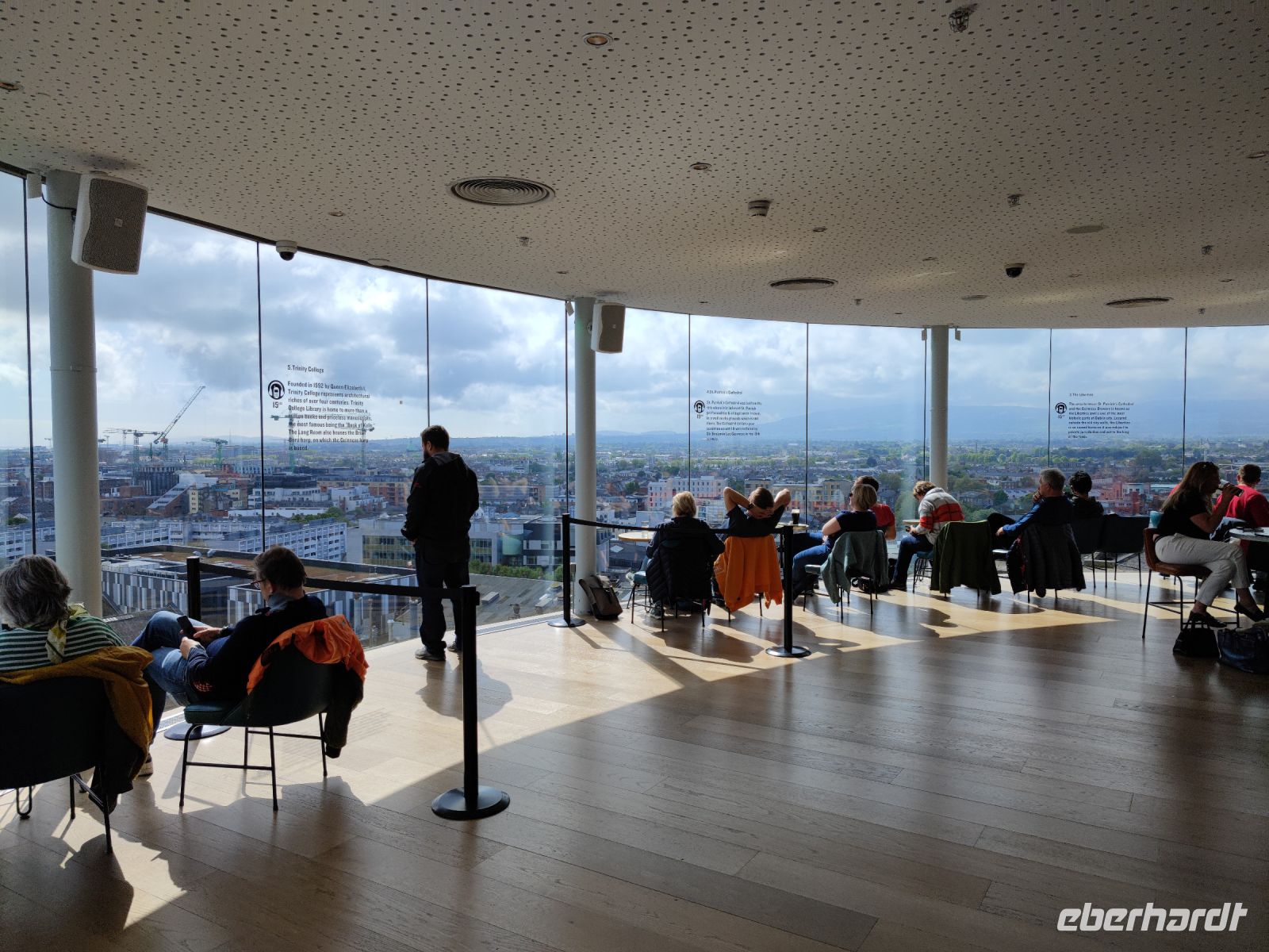 Am letzten Tag unserer Reise besuchten wir Guinness Storehouse. Auf mehreren Etagen tauchten wir in die Guinness Erlebniswelt ein und erfuhren alles über die Firmengeschichte. Im obersten Stockwerk konnte man seinen Getränkegutschein einlösen und den Rundumblick über die Dächer Dublins genießen. Natürlich wird man nicht entlassen, ohne den obligatorischen Souvenirshop passiert zu haben. Mit dem Bus fuhren wir anschließend zum Trinity-College in die Innenstadt. Hier hatten wir Freizeit für die Mittagspause und für individuelle Besichtigungen. Am Nachmittag wurden wir wieder in der Innenstadt abgeholt und zum Flughafen gefahren. Mit etwas Verspätung hob unser Flieger von Dublin ab.