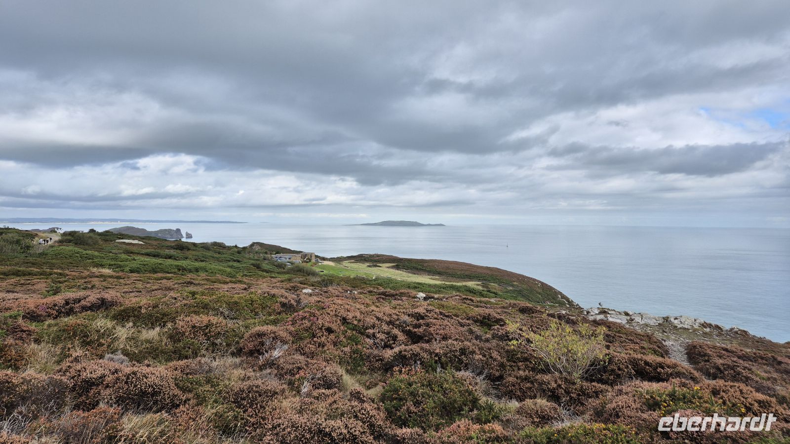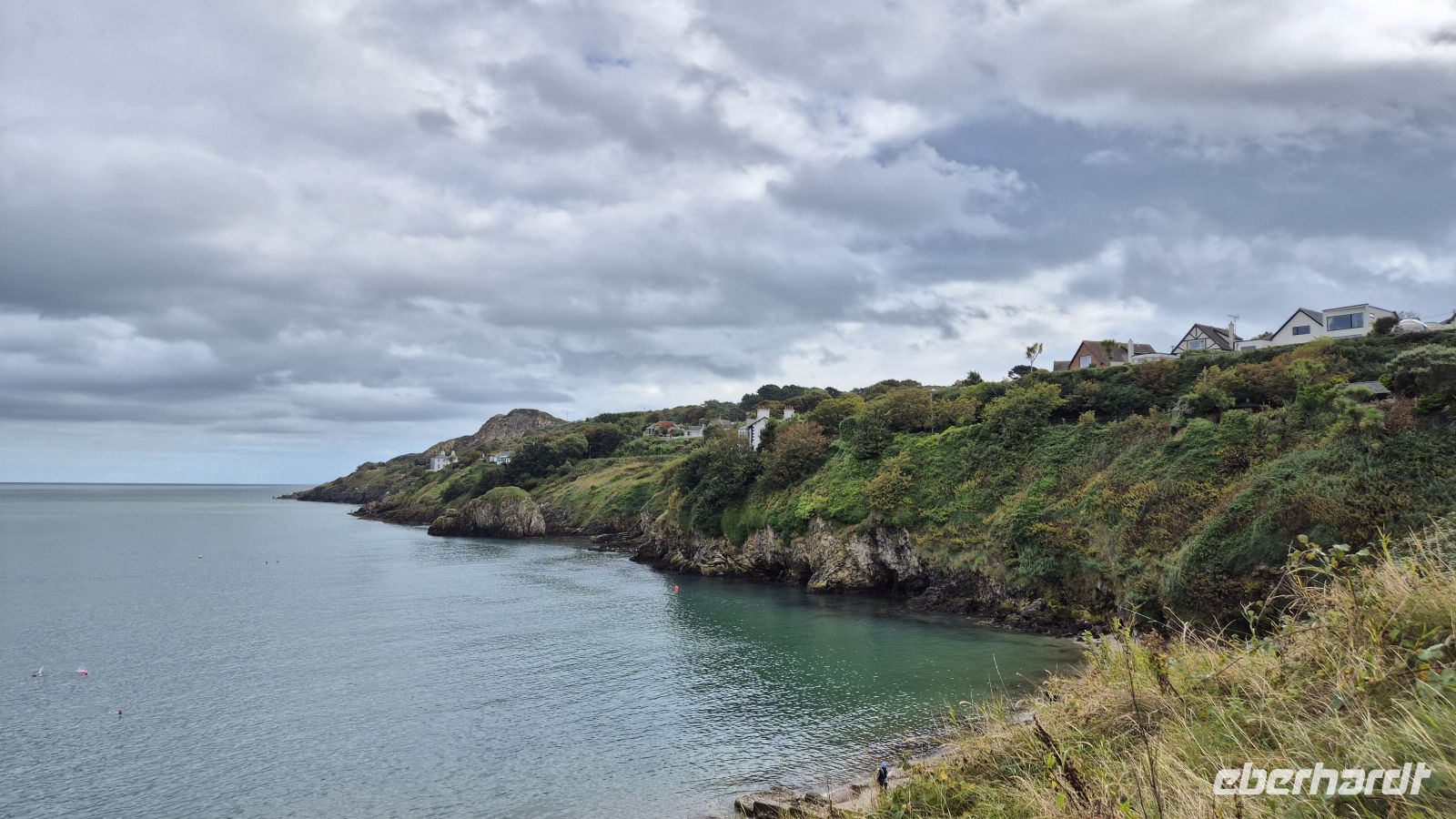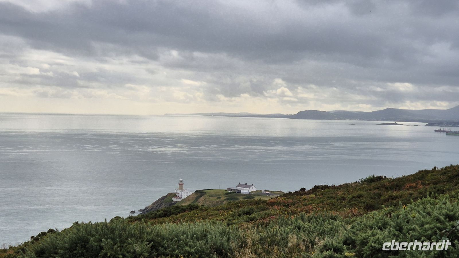Nach der Mittagspause fahren wir dann weiter nach Howth Head. Die Halbinsel ist ein sehr beliebtes Ausflugziel für die Dubliner und so ist heute am Sonntag natürlich jede Menge los. Von Igor lassen wir uns am höchsten Punkt des Howth Cliff Trails absetzen und beginnen unseren Spaziergang hinunter zum Hafen. Unterwegs erhalten wir herrliche Aussichten auf die Küstenlinie und den Baily Leuchtturm. Wir kommen auch vorbei am 1982 wiederentdeckten EIRE Sign. Ein Eire Sign besteht aus flachen hellen Steinen, die aus großer Höhe zu sehen sind. Jede Markierung besteht aus der irischen Bezeichnung für Irland und einer Zahl. Mehr als 80 solcher Gebilde wurden während des Zweiten Weltkriegs ausgelegt. Ziel war es, die Küste des neutralen Staates für Flugzeuge kenntlich zu machen, um Bombardierungen, Notlandungen oder versehentlichen Anlandungen kriegsbeteiligter Schiffe vorzubeugen. Nach dem Krieg gerieten die Eire Signs in Vergessenheit und wurden teilweise überwuchert.