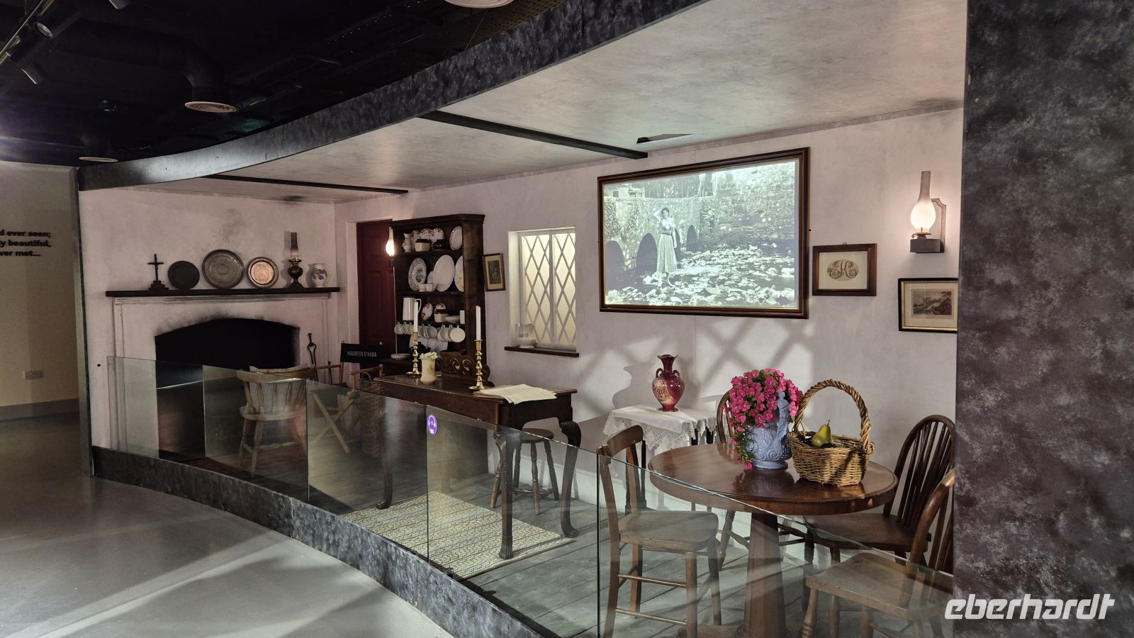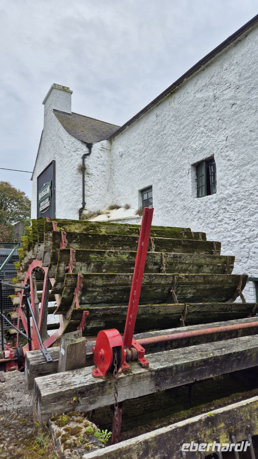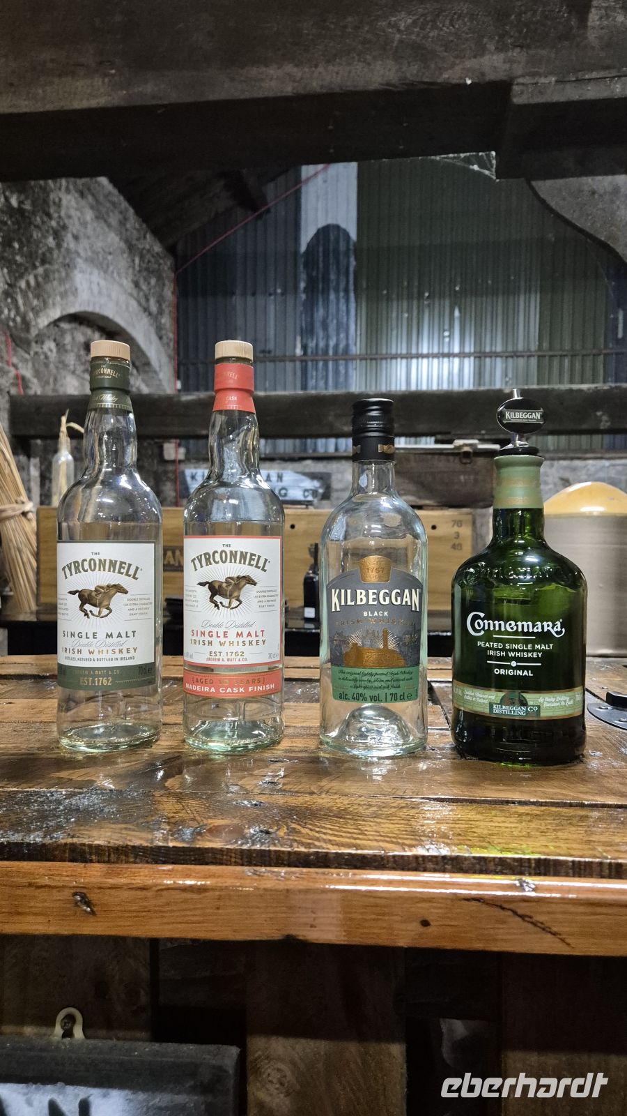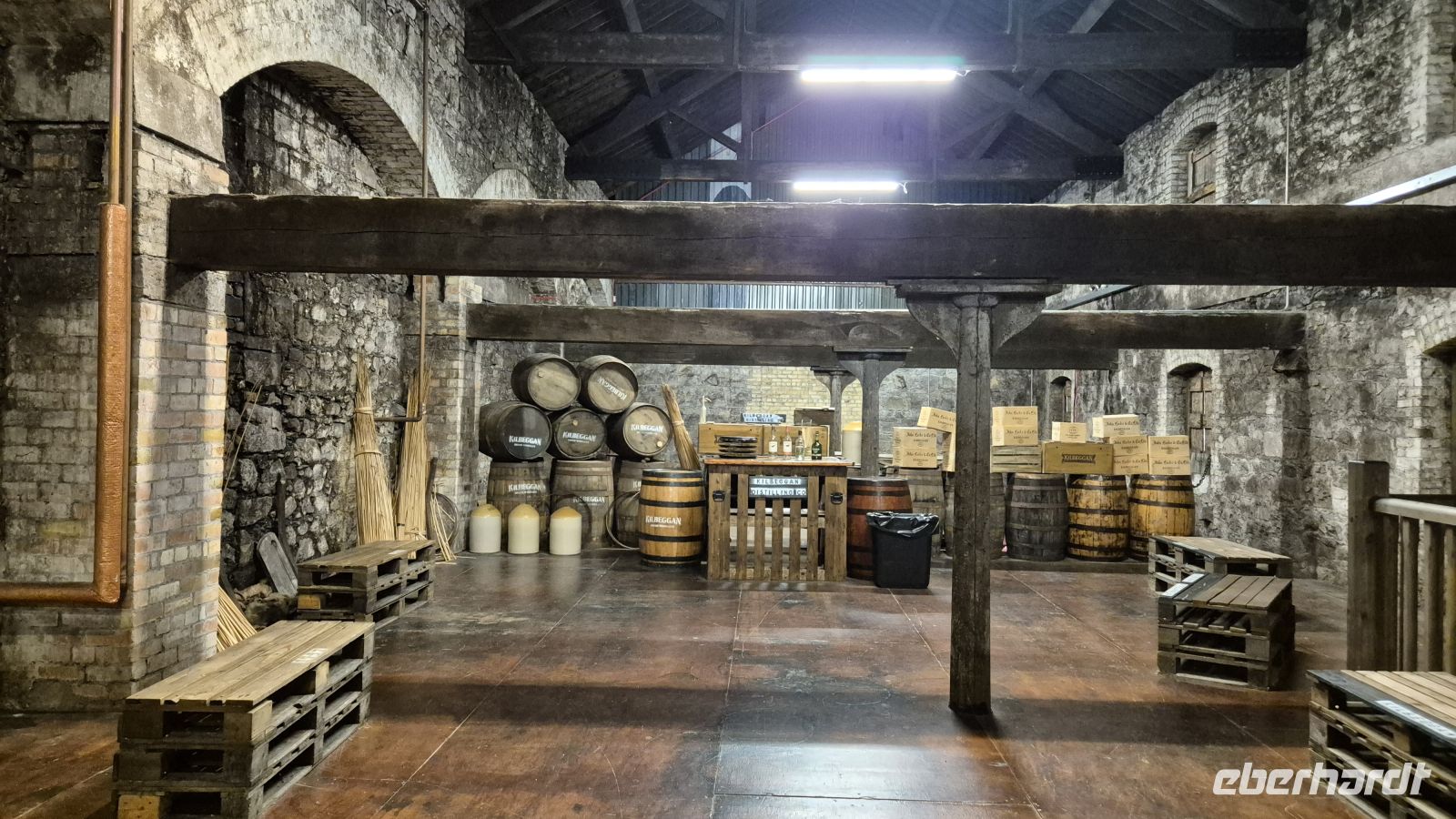 Während die meisten Whiskeys der Marke heute in der Großproduktion im nahegelegenen Cooley hergestellt werden, können wir uns direkt in Kilbeggan die historischen Örtlichkeiten ansehen und hören von unserer Führerin Carol viel Interessantes über die Geschichte der ätestesten Whiskey-Destillerie der Welt. 1757 wurde der Betrieb eröffnet und bis 1953 betrieben. Danach musste man die Produktion einstellen, da die Absatzmärkte in den USA weggebrochen waren, die Örtlichkeiten wurden in den folgenden Jahren als Schweinefarm genutzt, die Brennlizenz jedoch niemals aufgegeben. Zum 250-jährigen Jubliläum 2007 wurde dann schließlich die Herrstellung wieder aufgenommen. Bei der Führung werden wir natürlich auch wieder mitgenommen, um den Herrstellungsprozess zu verfolgen. Zum Abschluss werden dann selbstverständlich die Produkte der Kilbeggan und Cooley Distillery verköstigt: unter anderem einer der wenigen getorften irischen Whiskeys, der Connemara.