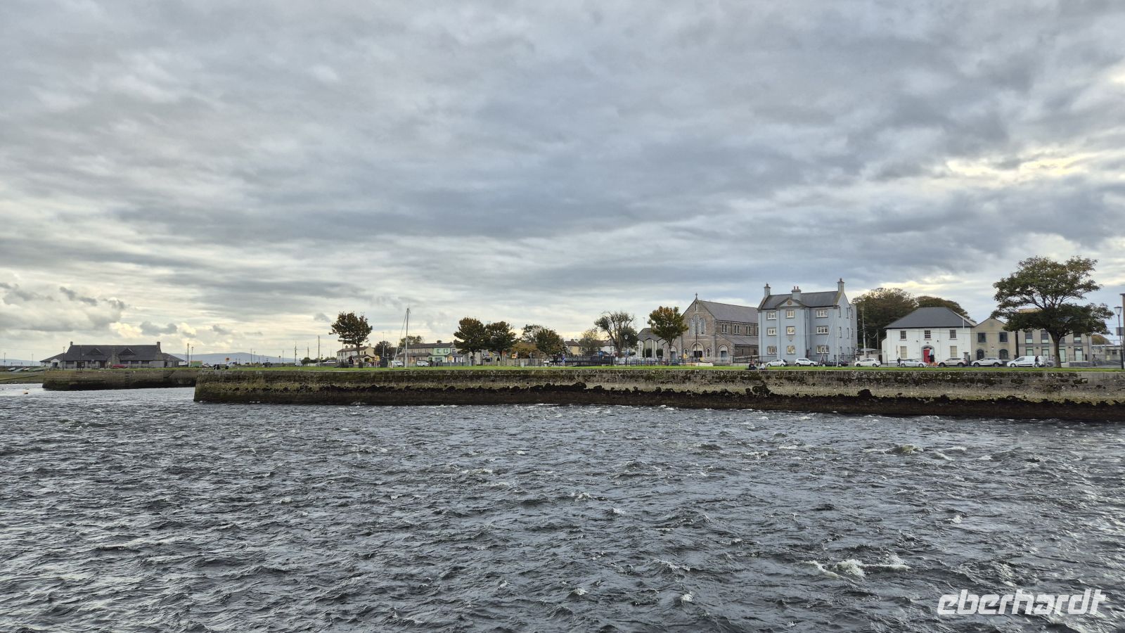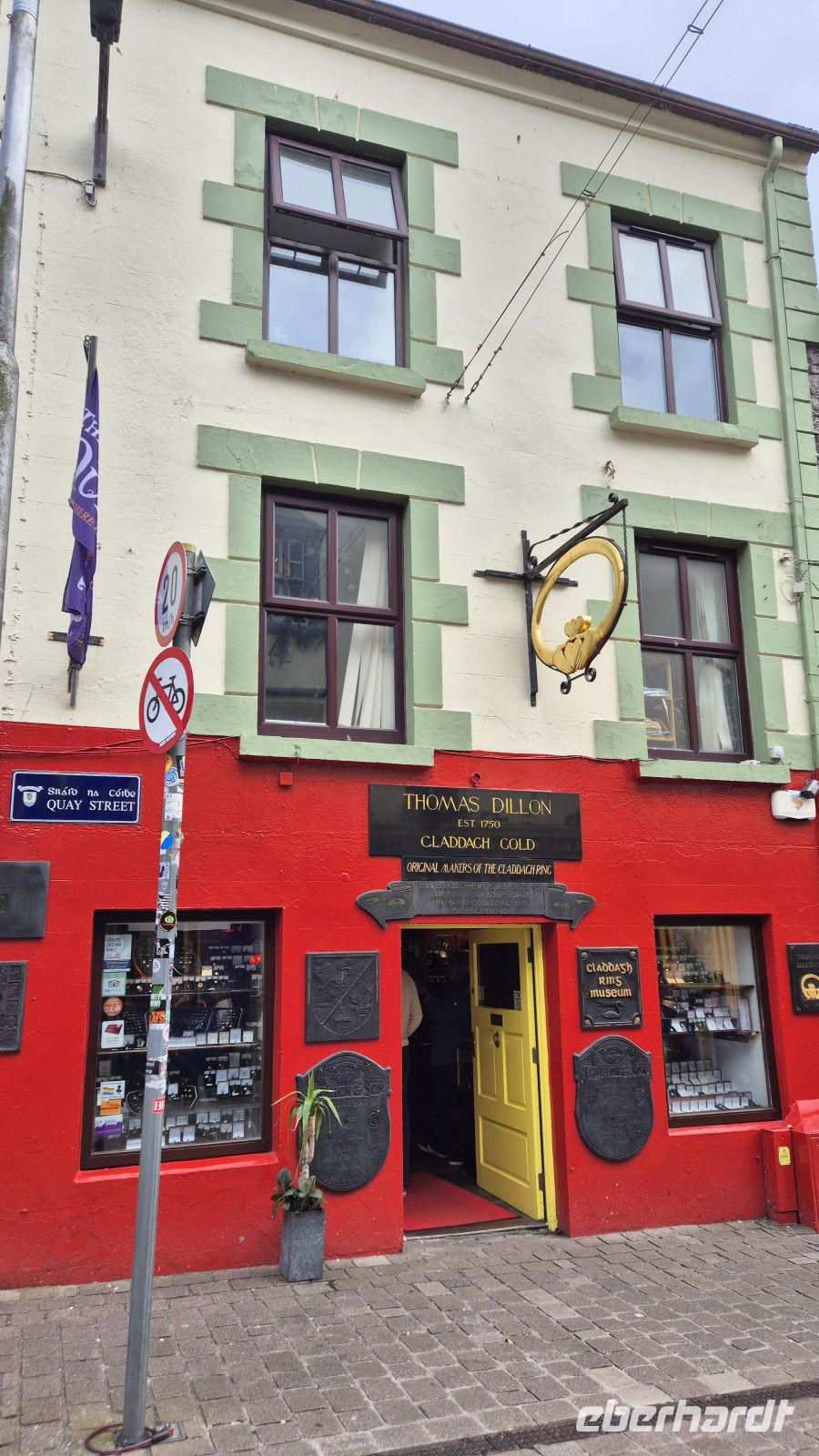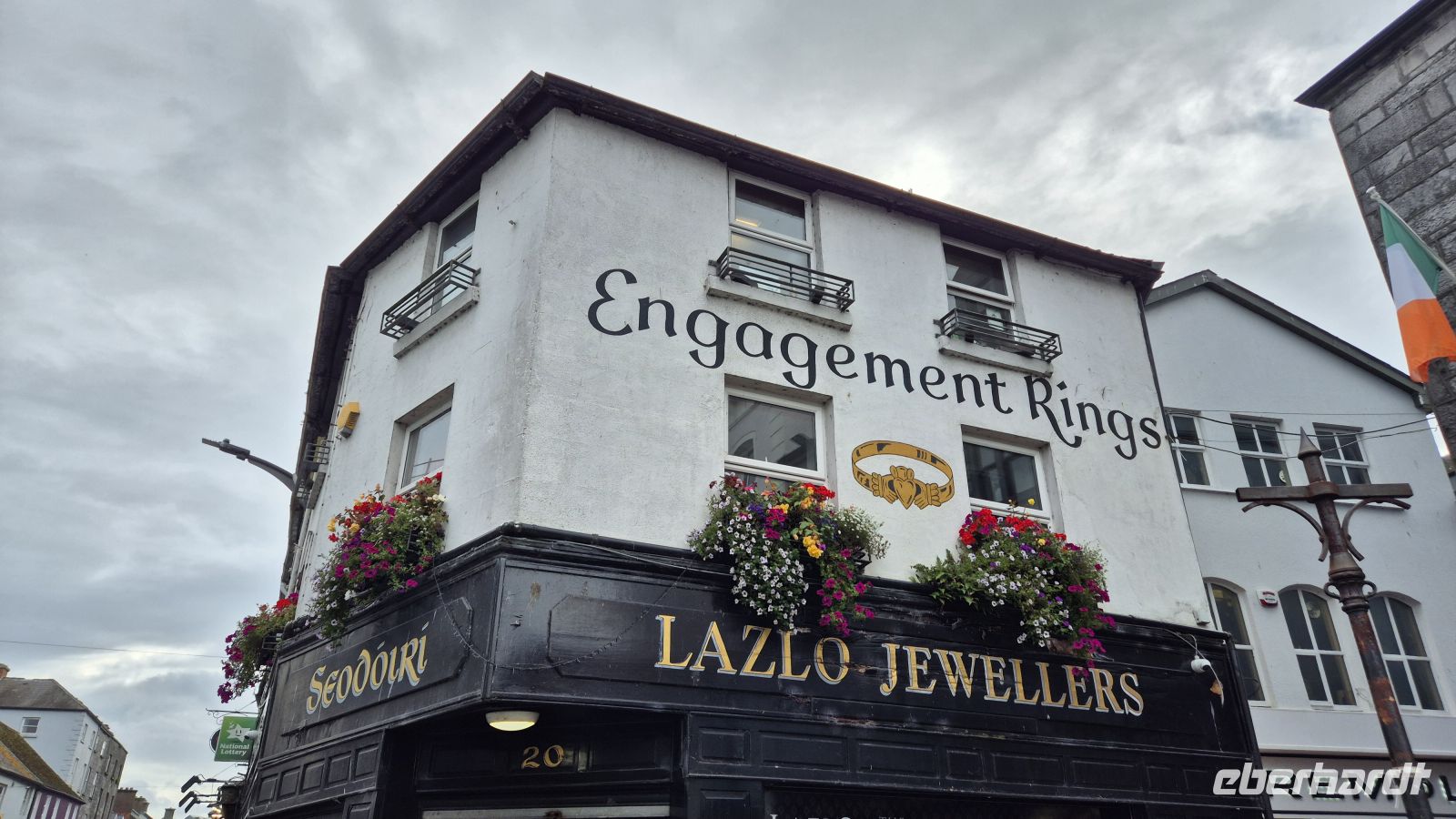 Am Nachmittag erreichen wir dann schließlich Galway, Hauptstadt der gleichnamigen Provinz. Die Stadt an der Mündung des Flusses Corrib an der Galway-Bucht ist heute vor allem für seine lebhafte Pub- und Musikerszene bekannt und die bunten Gassen des Stadtzentrums laden zum Bummeln ein. Besonders markant sind die zahlreichen Geschäfte, in denen man die typischen Claddagh-Ringe kaufen kann. Der Ring zeigt zwei Hände, die ein Herz mit einer Krone halten. Das Herz symbolisiert Liebe, die Hände Freundschaft und Vertrauen, die Krone Treue und Loyalität. Er wird als Partner- oder Freundschaftsring, gleichsam von Frauen und Männern getragen. Natürlich ragt sich um die Erfindung des Ringes eine dramatische Geschichte, allerdings eine mit Happy End.