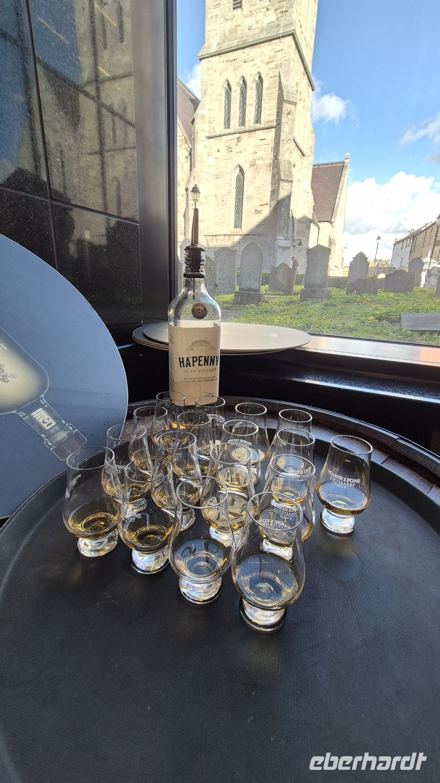 Heute besitzt die Familie Slazenger das Anwesen aus dem 18. Jahrhundert, die dazugehörigen Gärten und war auch treibende Kraft bei der Realisierung des Destillerieprojekts. Wir werden herzlich empfangen von unserem Guide Keiran, der uns durch das historische Gebäude führt. Ursprünglich war hier einmal eine Sägemühle, die Arbeitsplätze für das ganze Dorf Enniskerry bot. Heute werden in den alten Gemäuern Besucher bewirtet und in die Geschichte der Umgebung eingeführt. Die brandneue moderne Destille ist in einem neuen Gebäudetrakt untergebracht und zu unserer Freude dürfen wir zum Abschluss auch noch eines Lagerhäuser besichtigen. Und natürlich folgt im Anschluss auch eine Verkostung – mit Aussicht hinunter in die Destille. Auch hier probieren wir verschiedene Whiskeys, einige davon hat der Chefbrennmeister von seiner vorherigen Tätigkeit mitgebracht und hier gefinisht, aber einen eigenen Whiskey gibt es auch schon. Als wir das Gebäude wieder verlassen scheint auch endlich die Sonne wieder und es geht für uns durch den Dubliner Feierabendverkehr zurück zum ersten Hotel unserer Reise.