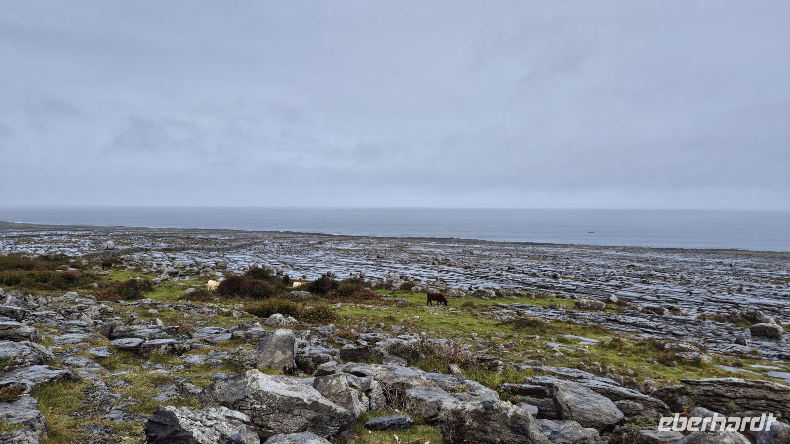 Unser Tag heute startet zwar früh und mit etwas verhangenem Himmel, dennoch erwarten uns einige Highlights, auf die man sich freuen kann. Wir verlassen die Stadt in Richtung Süden und fahren entlang der Küste der Galway Bay. Nach kurzer Fahrt erreichen wir das pittoreske Dunguaire Castle, ein Wohnturm aus dem 16. Jahrhundert der in einer kleinen Bucht liegt und im 19. Jahrhundert Treffpunkt eines Literatenzirkels war, zu dem auch Nationaldichter William Butler Yeats gehörte. Über enge Landstraßen, geht es dann durch die in Irland einzigartige Landschaft des Burren. Die Karstlandschaft ist durch etwa knietiefe Karren in rechteckige Felder gegliedert. Sie wurden durch Oberflächenwasser gebildet, das sich noch immer nach stärkeren Regenfällen in sogenannten Turloughs sammelt. Nach seinem Kriegszug in die Gebiete des Burrens, soll Oliver Cormwell sie wiefolgt charakterisiert haben: „Kein Baum, an dem man einen Mann aufhängen, kein Tümpel, worin man ihn ersäufen, keine Erde, in der man ihn verscharren könnte.“ Nichtsdestotrotz ist die Landschaft Heimat für zahlreiche mediterrane, alpine und sogar arktische Pflanzen, die sonst nur selten in Irland vorkommen. Ebenso wie die bizzaren Felsformationen im Hinterland gehören auch zerklüftete Küstenabschnitte zum Charakter des Burren. Während ein Teil davon recht flach zum Wasser hin verläuft, führt die Straße und dann plötzlich steil bergauf.