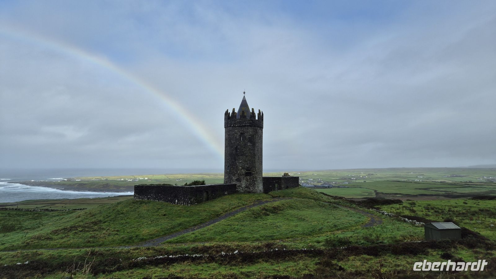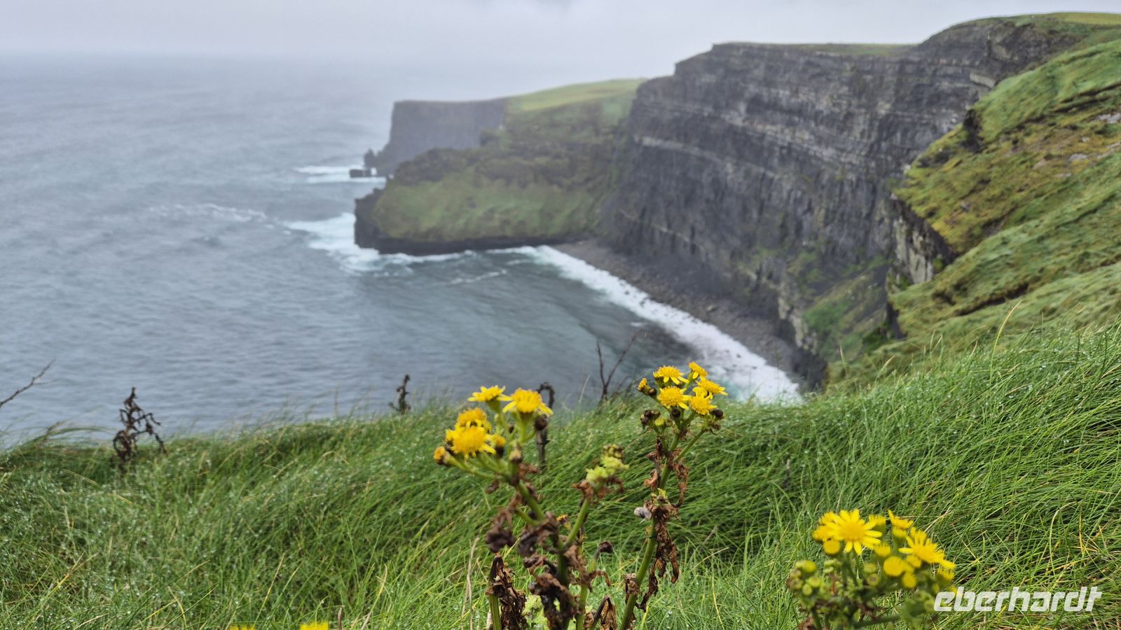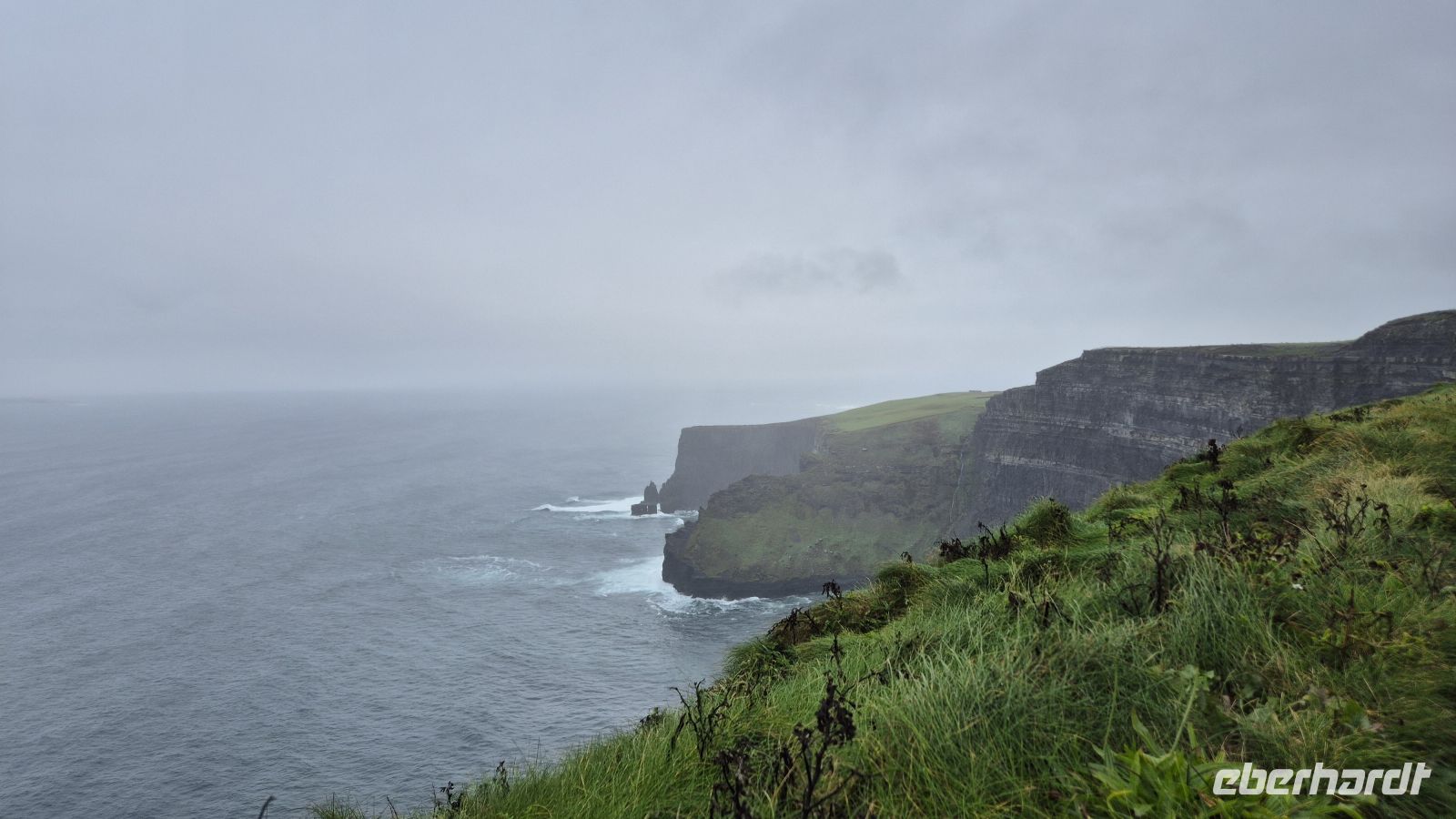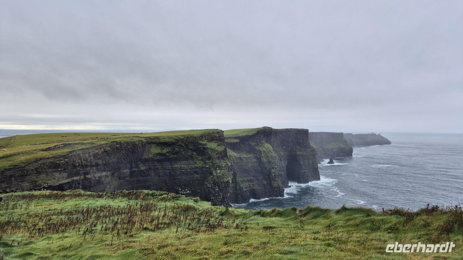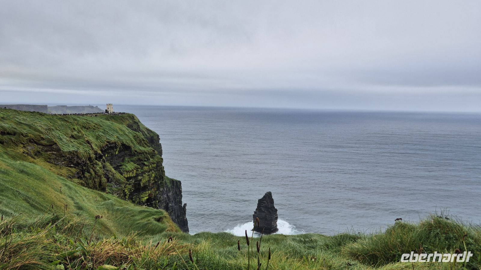 Die fast zehn Kilometer lange Steilklippenformation der Cliffs of Moher ragt fast senkrecht aus dem Atlantik. Am Südende, dem Hag’s Head, haben sie eine Höhe von ungefähr 120 m, nördlich des O’Brien’s Tower erreichen sie sogar 214 m. Am Kliff leben 30 Arten von Seevögeln, die bekanntesten sind die winzigen Papageientaucher, die sich in die entlegendsten Ecken zurückziehen um dort zu Brüten. Das launische irische Wetter meint es relativ gut mit uns und so können wir einen guten Ausblick auf den Atlantik und die vorgelagerten Aran Inseln genießen. Wer noch ein wenig mehr Hintergrund zu Flora und Fauna, sowie zur Regionalgeschichte möchte, kann das informative Besucherzentrum besichtigen.