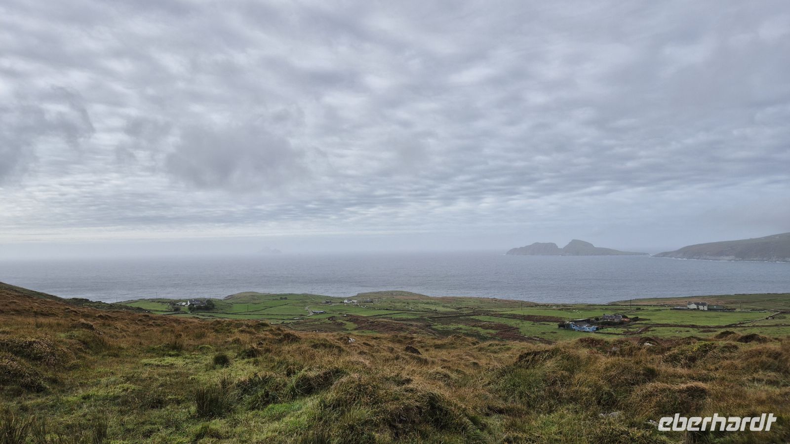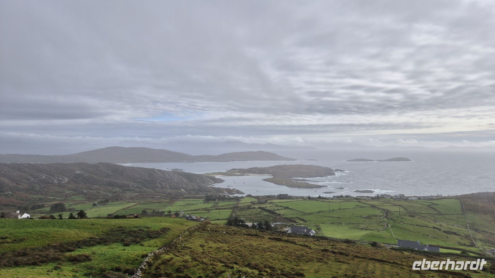 Zurück auf dem Festland geht es dann später weiter über den Skellig Ring nach Süden. Langsam fahren wir durch die engen Straßen und arbeiten uns dann den schmalen Coomanaspig Pass hinauf – leider hängen die Wolken tief und wir können die Skelligs erst ein wenig später am Horizont erkennen. In der Saint Finnian's Bay auf der anderes Seite des Passes erwartet uns noch eine weitere Überraschung: hier befindet sich die Skelligs Chocolate Factory, wo wir mit einer großzügigen Verkostung begrüßt werden.