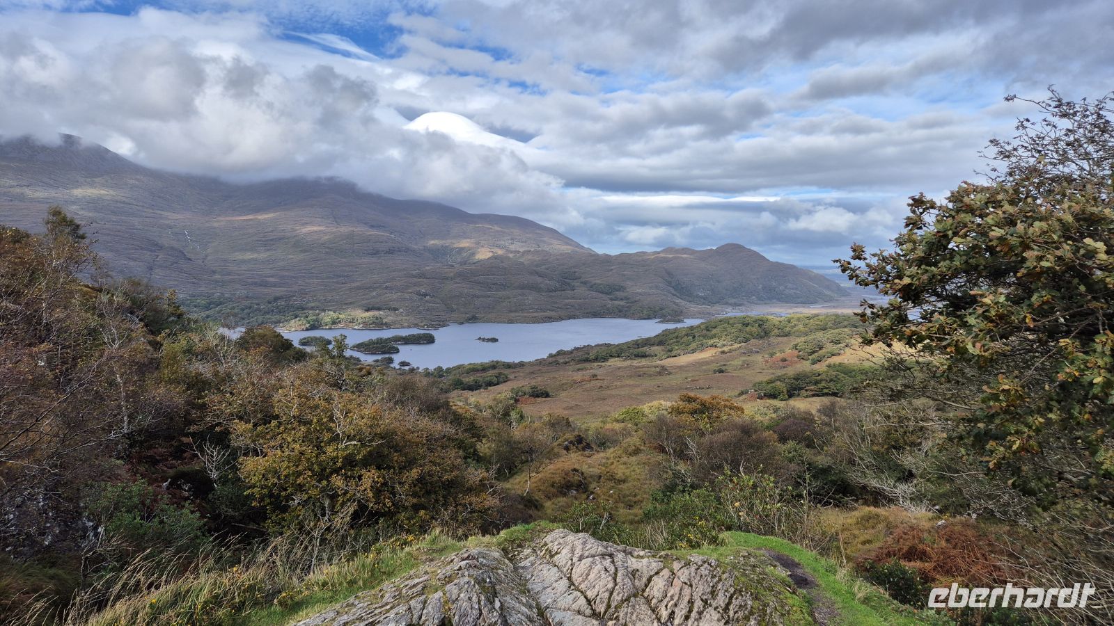 Über den kurvenreichen Skellig Ring geht es anschließend wieder für uns zurück in Richtung N70. Wir legen einen kurzen Stopp ein in Waterville, wo viele Reiche und Prominente, unter anderem auch Charlie Chaplin, gerne ihren Urlaub verbrachten und immer noch verbringen. Am 210 Meter hohen Coomakesta Pass, dem höchsten Punkt des Ring of Kerry haben wir anschließend einen tollen Blick auf die Bucht des Kenmare River. Im pittoresken Örtchen Sneem legen wir einen weiteren kurzen Stopp ein, bevor wir ein Stück landeinwerts bis nach Moll's Gap fahren. Von hier aus hat man eine fantastische Aussicht in das weite Tal mit den Macgillycuddy's Reeks im Hintergrund. Seinen Namen hat der Ort von Moll Kissane, welche hier in den 1820er Jahren einen illiegalen Gasthof betrieb, zu Zeiten als die Straße gerade im Bau gewesen ist. Wenige Minuten später bekommen wir am sogenannten Lady's View noch einmal einen wunderbaren Ausblick, diesmal über die oberen Seen des Killarney Nationalparks.