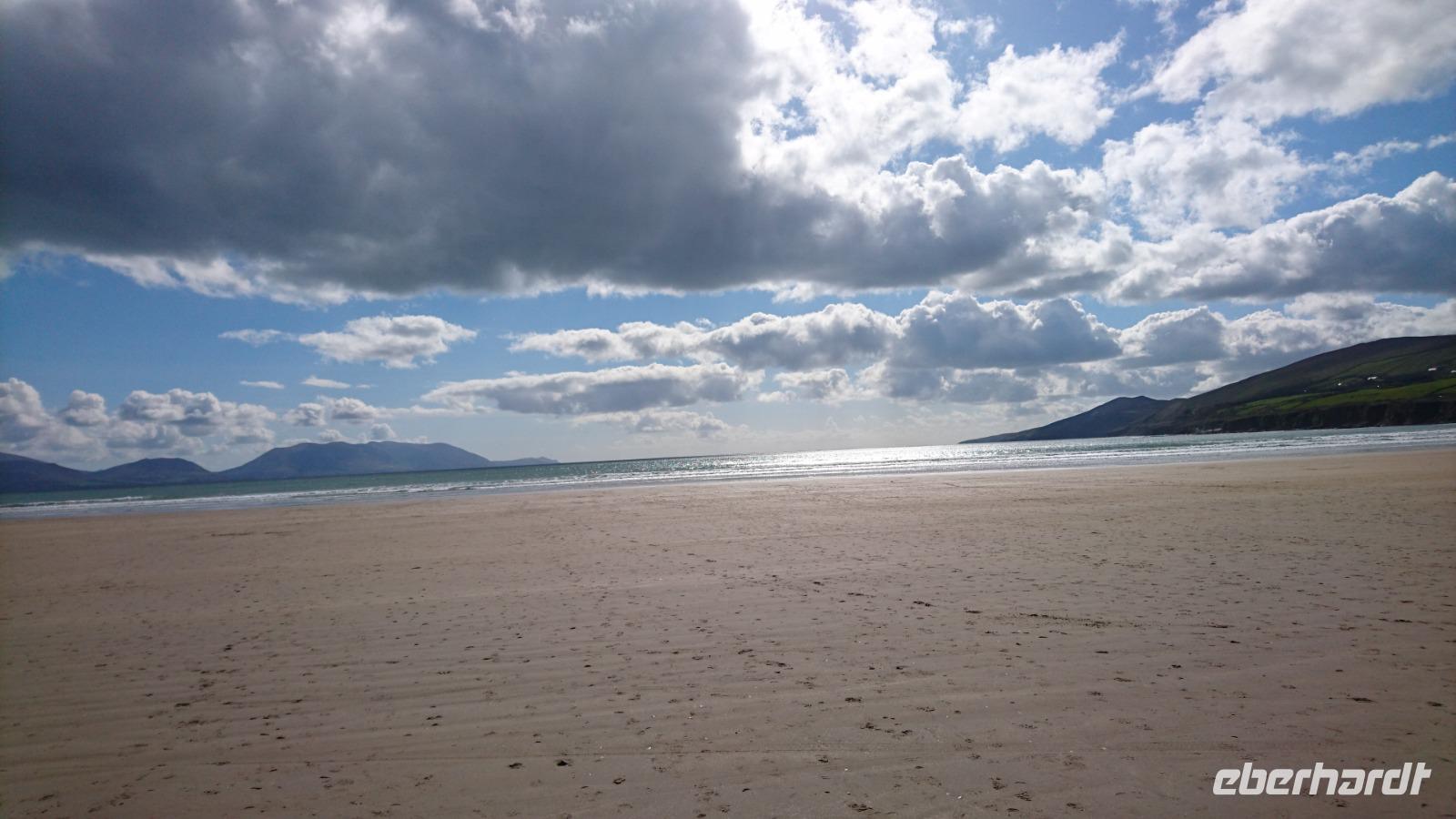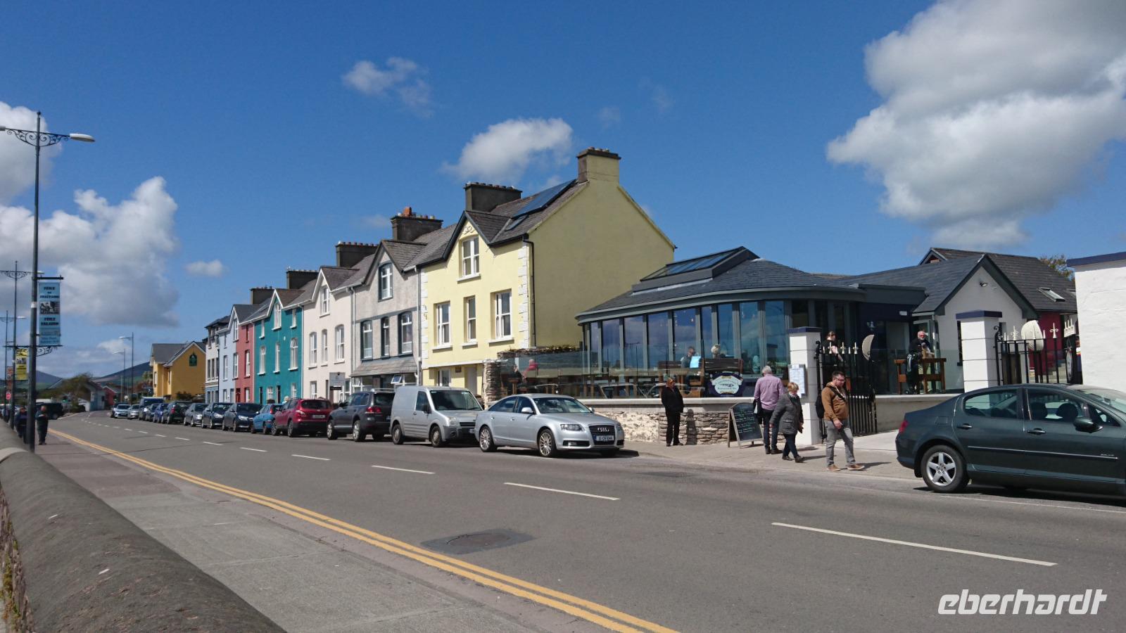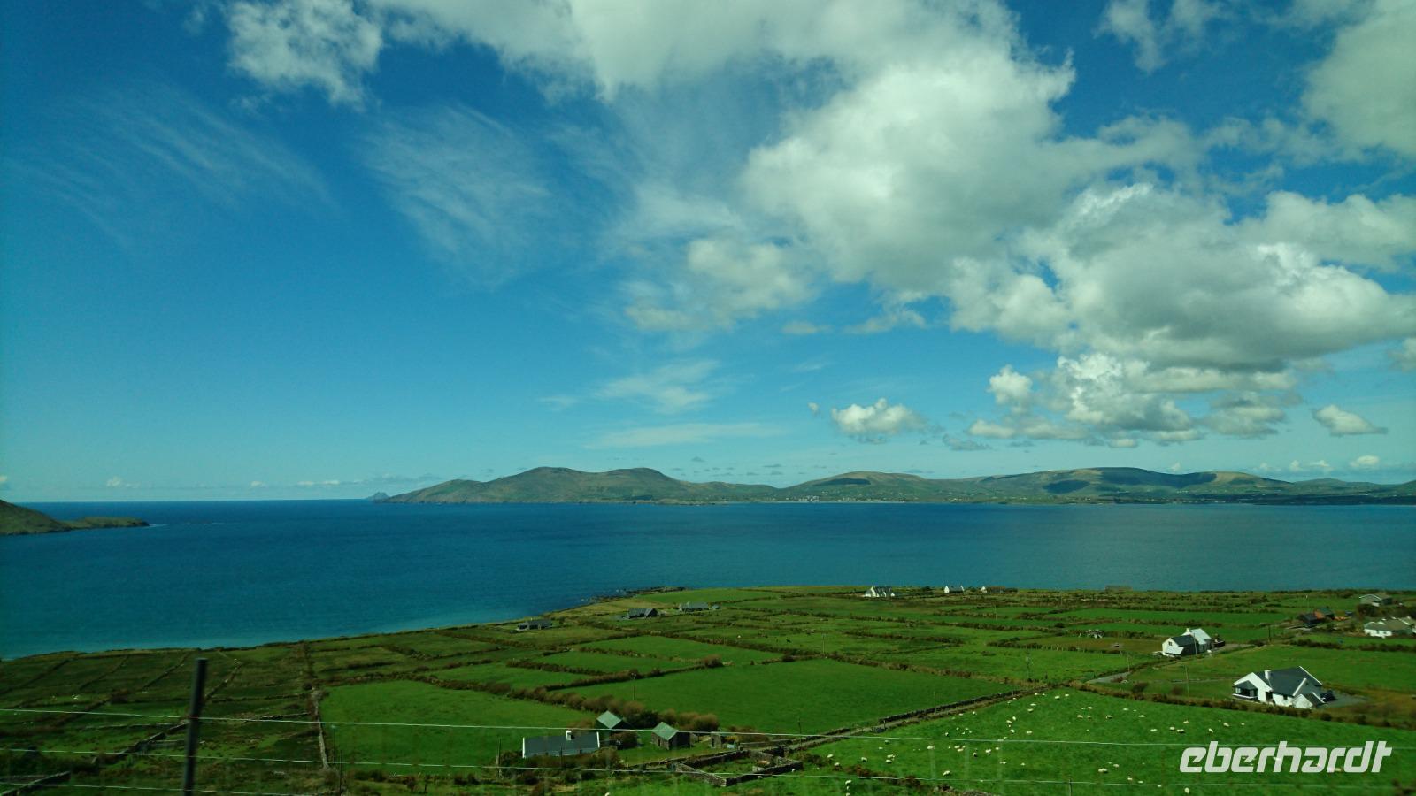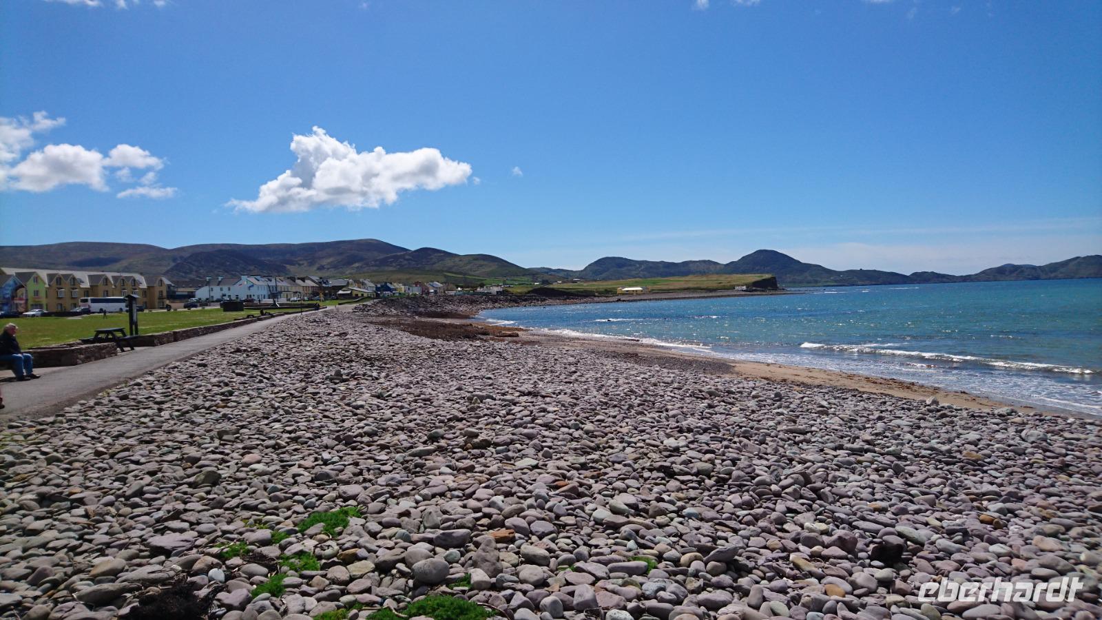 Nach Süden sollte es heute gehen. Dazu nahmen wir Abschied von unserem Hotel und ließen unsere Koffer wieder im Bus verladen. Die berühmten Halbinseln in Kerry wollten wir in den kommenden drei Tagen bestaunen und fuhren dazu erst einmal nach Killimer und von da mit der Fähre über den Shannon nach Tarbet in Kerry. Von hier ging es vorbei an Tralee nach Dingle Town, den Hauptort auf der Halbinsel Dingle und gleichzeitig unser Mittagspausenort, durch den wir dazu noch ausgiebig bummelten. Weiter ging es entlang der Dingle Bay nach Slea Head und weiter zu den bekannten Drehorten alter und neuer Filme, wie z.B. Ryans Daughter oder Star Wars. Dazu hatten wir auch noch Blick auf die Skelly Islands, wo ebenso Episoden von Star Wars spielten. Nahe der fiktiven Geschichte, doch gleichzeitig inmitten des irischen Lebens erreichten wir bald wieder Dingle und machten Halt am Strand von Inche, einem kilometerlangen Sandstrand mitten in der Dingle Bay und idealer Ort für einen Nachmittags-Kaffee. Von hier ging es später nach Tralee, wo wir dank Stefans einfacher Check-in-Vorbereitung schnell unsere Zimmer beziehen konnten und wenig später im großen Restaurant zu Abend aßen, uns dazu ein irisches Bier, Tee, Wein oder Wasser schmecken ließen und die Erlebnisse der ersten vier Tage in Irland rekapitulierten. Waren wir wirklich erst vier Tage hier bei alledem, was wir bereits sahen? Kaum zu glauben!