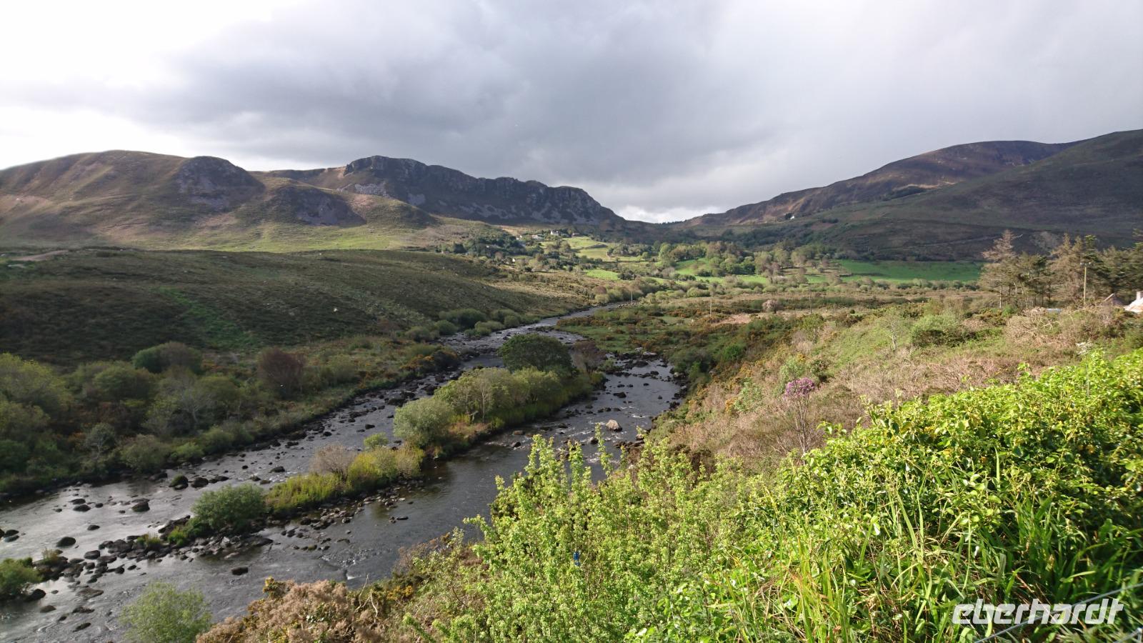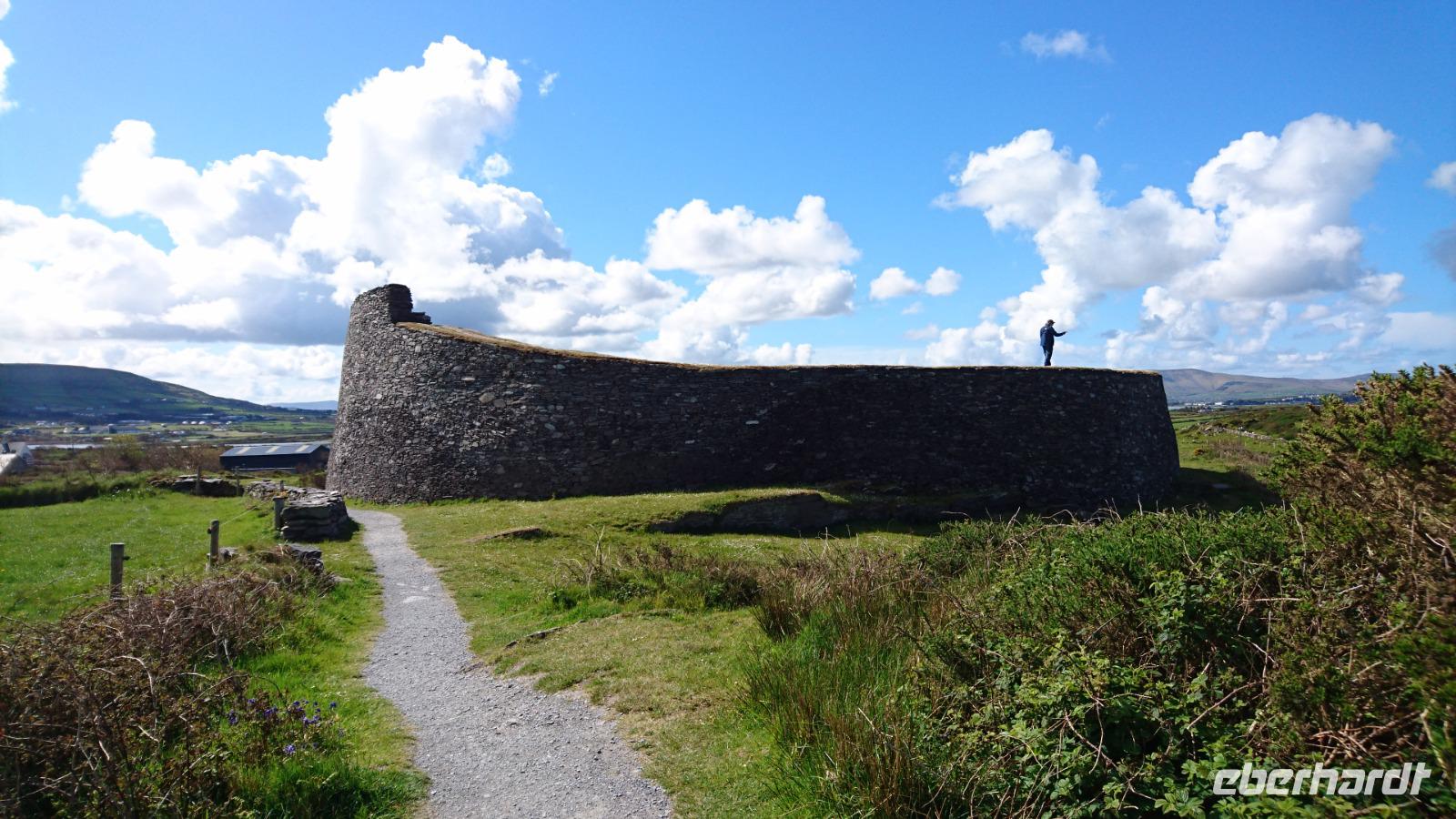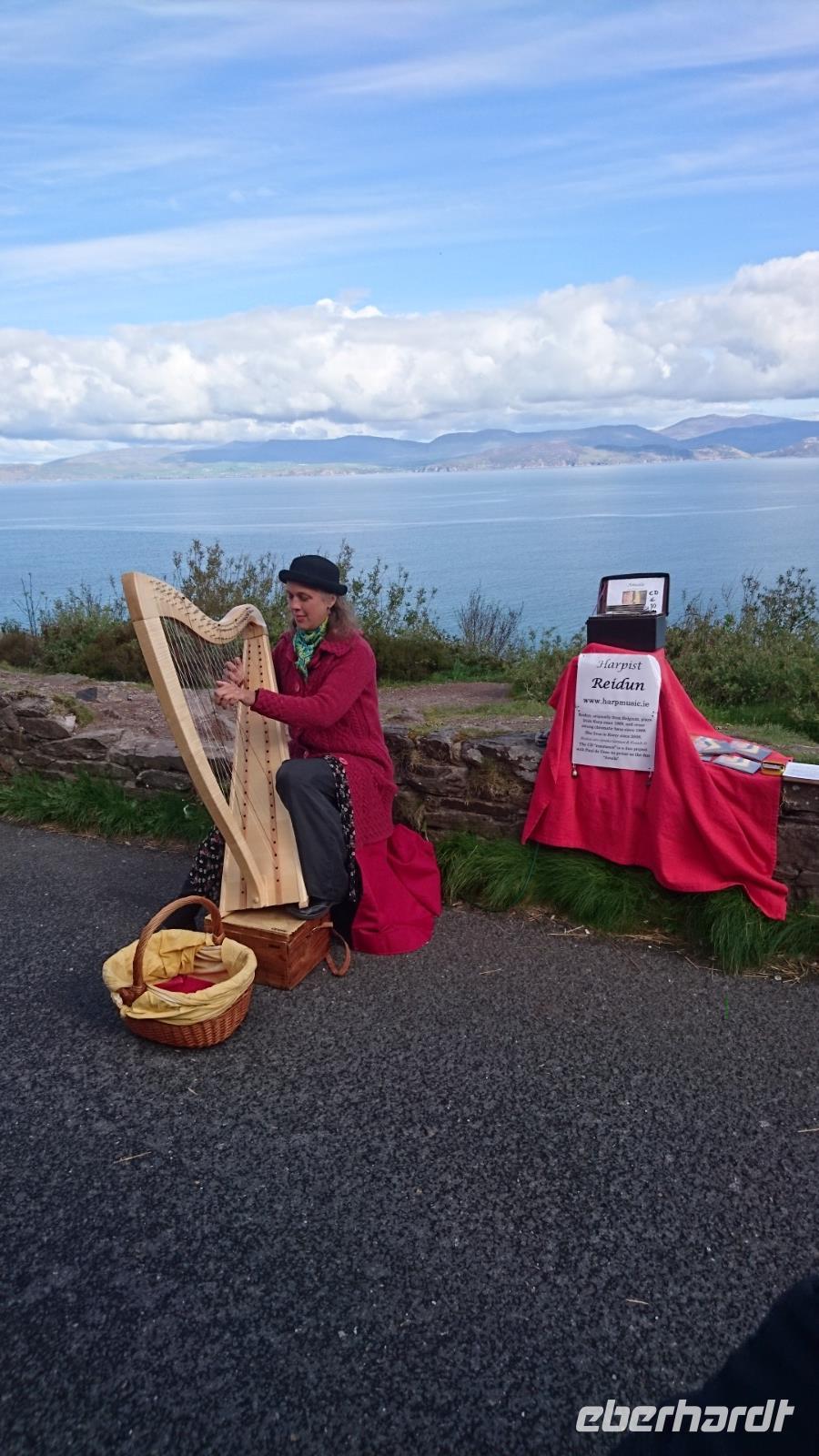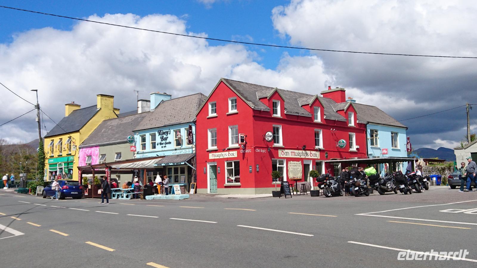 Am Morgen begrüßte uns neben Heike und Stefan noch eine nette Dame, Eileen, unsere örtliche Reiseleiterin für die kommenden zwei Tage. Mit ihr starteten wir bald gen Halbinsel Iveragh, auf dem sich der von Bussen nur in eine Richtung zu befahrende legendäre Ring of Kerry befindet. Wir erlebten viele Fotostopps und Eileen erläuterte uns einiges zusätzlich zu Stefans Ausführungen der letzten Tage über Land und Leute, Einkommen, Bevölkerungsstruktur, soziales Gefälle, Geschichte und spannende Gegenwart. Dazu sahen wir bei Caherciveen ein altes Ringfort der ehemaligen Clans hier auf der Halbinsel Iveragh und hatten später Pause in Waterville, wo einst Charlie Chaplin und seine Familie so gern Urlaub machten. Herrliche Sichten boten sich uns bei der Fahrt durch die Berge zur Südküste der Halbinsel und später schleckten wir gern noch ein Eis in Sneem, einem hübschen, kleinen Ort am Ring of Kerry. Zu spät wollten wir heute nicht zurück sein im Hotel, denn es gab zeitiges Abendessen. Der Großteil von uns hatte Theaterkarten für das irische Nationaltheater Siamsa Tire gebucht. Also kamen wir bald zurück zum Hotel und stärkten uns für die Nacht. Dann trafen wir Stefan in der Lobby und mit den eben ausgegebenen Karten in der Hand ging es ab zur nächsten Überraschung, wenn man die schöne Natur, die vielen Erlebnisse und oft zusätzlichen Stopps und Sichten unserer Reise gern als Überraschungen bezeichnen mag. Im Theater wurden wir herzlich willkommen geheißen und man verwöhnte uns sofort mit Irish Coffee und einigen Souvenirs, die uns, neben der genialen Show Anam, die wir kurz darauf im Theater sahen, die Erinnerung an diesen Abend und die gesamte Reise noch lange lebendig halten werden. Nach dieser wunderbaren Aufführung mit viel Lebensfreude, Irish Stepdance, Gesang und irischen Instrumenten ging es quer über den großen Parkplatz vor dem Theater herüber zu unserem Hotel, wo wir noch einmal mehr gut schliefen in dieser nun beginnenden Nacht.