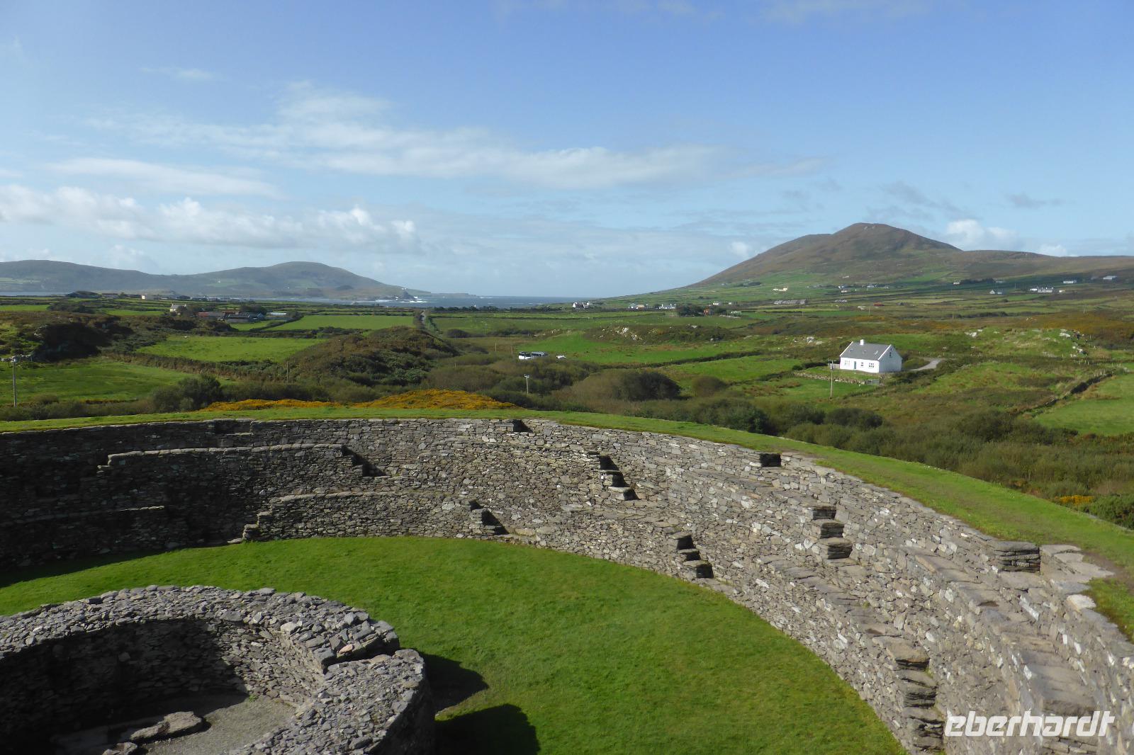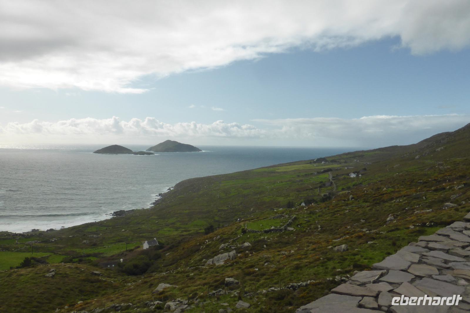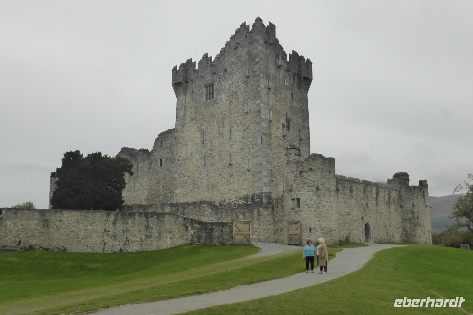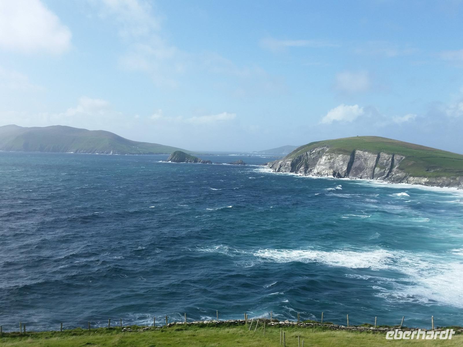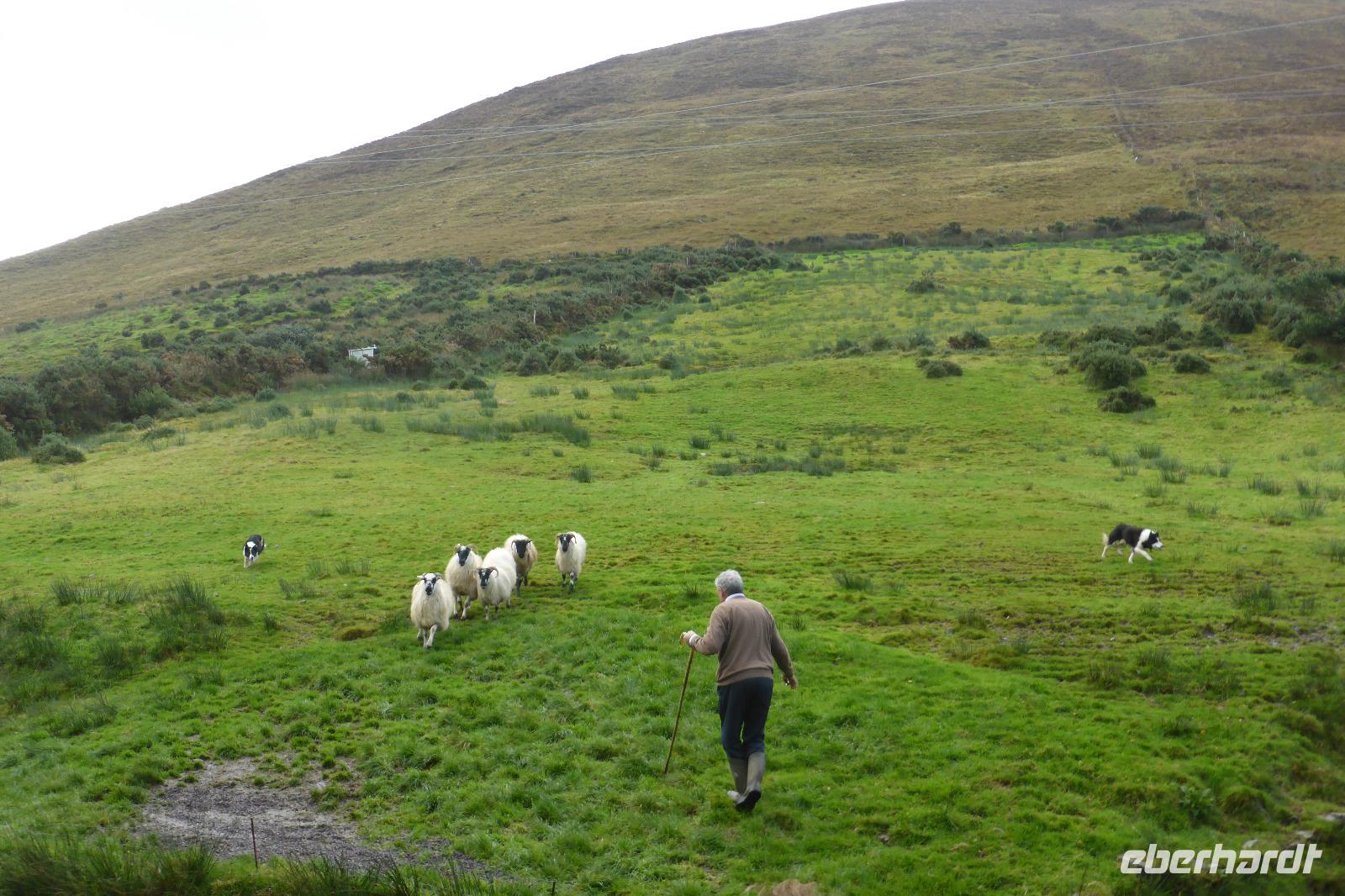 Nach dem Frühstück starteten wir zu unserer Rundfahrt auf dem Ring of Kerry, der einmal um die Halbinsel Iveragh herumführt. Zuerst hielten wir an der alten Eisenbahnstrecke der Western Railway, wo die Fotomodelle „Paddy", der Esel, und auf seinem Rücken „Rose", der Hund, bereits auf uns warteten. Anschließend ging es nach Kells zum Schäfer Brendan. Er stellte uns verschiedene Schafrassen vor und zeigte uns, wie seine Border-Collie-Hunde seinen Kommandos folgen und die Schafe zusammentreiben. Danach fuhren wir nach Cahersiveen, der Geburtsstadt Daniel O'Connells. Außerhalb der Stadt, auf der anderen Seite des Flusses, liegt das Cahergall Stone Fort (Cathair Geal). Einige dieser Steinforts sind bis zu 2500 Jahre alt, dieses ca. 1000. Es war beeindruckend zu sehen, wie massiv das Fort errichtet wurde und wie akkurat die Steine aufgeschichtet worden sind. Vom Cahergall Stone Fort ging es weiter nach Waterville. Hier legten wir unsere Mittagspause ein und hatten Zeit für einen Spaziergang. Danach fuhren wir auf zum Coomakesta Pass und hatten aus 210 m Höhe einen tollen Blick auf die Ballinskelligs Bay und die Bucht des Kenmare River. Anschließend brachte uns der Bus in den Derrynane-Nationalpark zum Strand am Derrynane-House. Am Strand angekommen, ließen wir es uns nicht entgehen, mit den nackten Füßen durchs Wasser zu laufen. Einige von uns gingen gleich vollständig ins Wasser baden. Vom Nationalpark aus fuhren wir danach in den Killarney Nationalpark zum Aussichtspunkt Ladies View. Die Hofdamen Königin Victorias sollen beim Anblick der Berge und Seen so begeistert gewesen sein, dass man den Aussichtspunkt seitdem „Ladies View" nennt. Mit dem Bus fuhren wir danach zu unserem Hotel zurück. Nach dem Abendessen besuchten wir gemeinsam einen Pub mit Live-Musik.