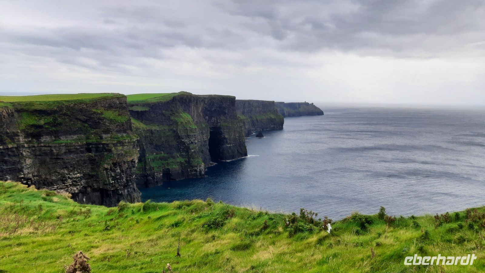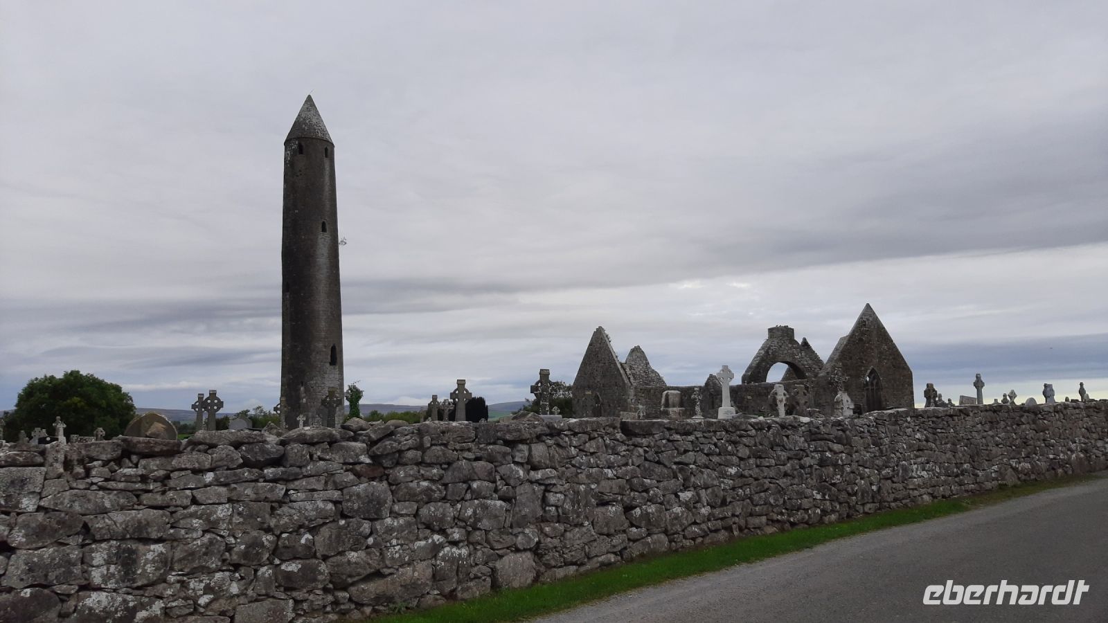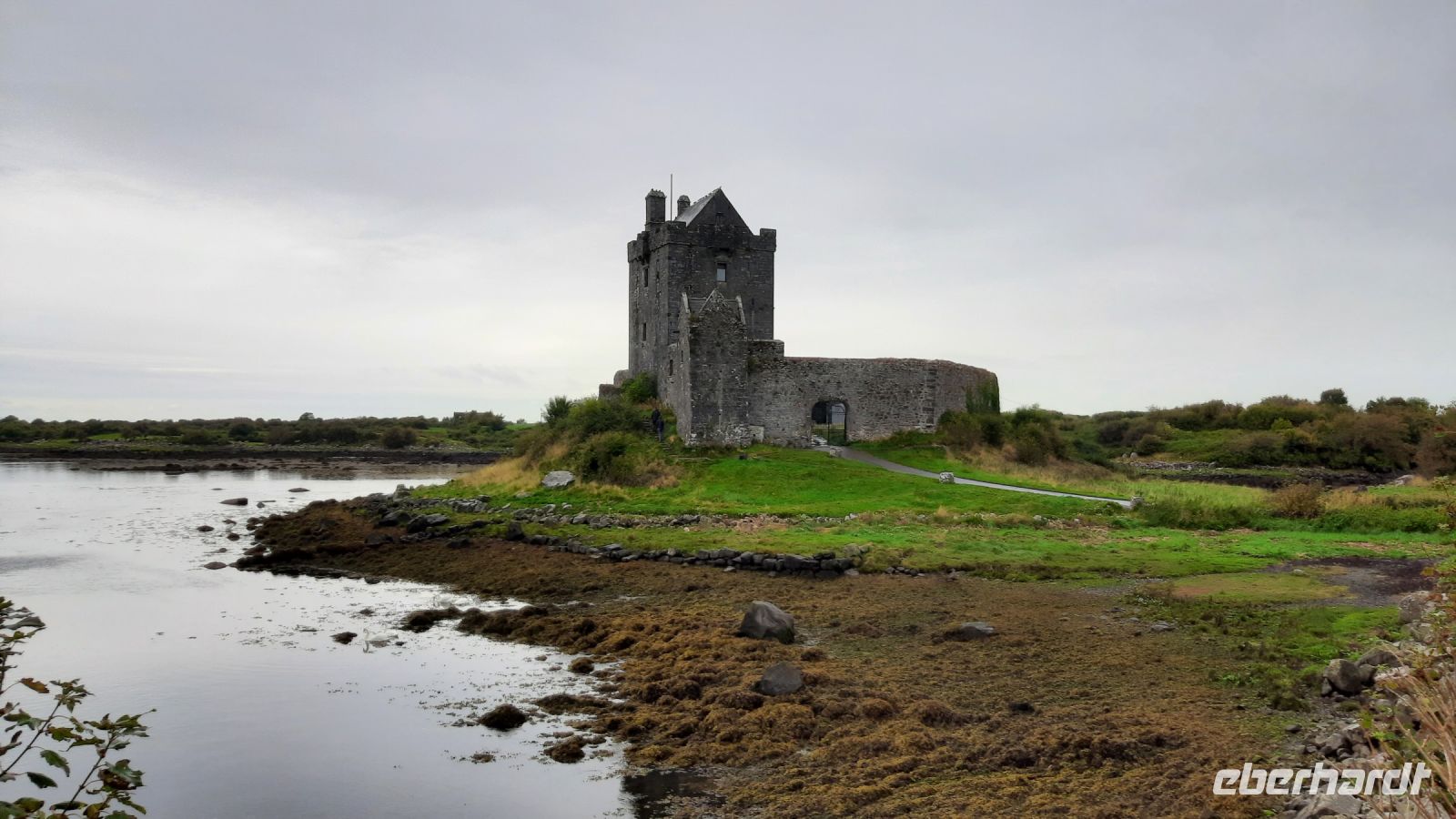Wir verließen Gort und fuhren in Richtung Südwesten, um zum Burren zu gelangen. Wir fotografierten die Reste der Kilmacduagh Abbey mit dem wohl besterhaltenen Rundturm Irlands, der zwar etwas schief aber dennoch seit dem 12. Jahrhundert steht. Er ist 30 Meter hoch. Wir fuhren vorbei am Leamaneh Castle, wo angeblich heute noch die Rote Mary nachts als Gespenst ihr Unwesen treibt. Der Burren ist eine Karstlandschaft. Flache Kalksteinplatten bedecken das Gelände, fast hat man das Gefühl, in einer Mondlandschaft zu sein. Prähistorische Monumente gibt es zahlreich in dieser einzigartigen Gegend. So hielten wir an am sogenannten Mühlsteintor, dem Poulnabrone Dolmen mitten im Burren. Wir staunten über die frühzeitlichen Menschen, die dieses Steingebilde vor etwa fünfeinhalb Tausend Jahren errichtet haben sollen. Nach einigen weiteren Kilometern erreichten wir schließlich eine der bedeutendsten Sehenswürdigkeiten im Land: die Cliffs of Moher. Wir erkundeten die weltberühmten Felsen von verschiedenen Aussichtspunkten aus. Die imposanten Klippen erheben sich hier in einer Höhe von bis zu 214 Metern aus dem Meer. Danach fuhren wir ein Stück auf dem Wild Atlantic Way. Am Aussichtspunkt Poulsallagh konnten wir auf dem markanten Karstgestein des Burren bis zur felsigen Küste laufen. Hier konnten wir den Ausblick auf die Aran Inseln und die Galway Bucht genießen. Wir stießen mit einem echten irischen Whiskey an auf eine weitere schöne gemeinsame Reise. Unser weiterer Weg führte uns entlang der Galway Bucht. In Kinvarra machten wir eine Pause für Kaffee und ein paar Einkäufe, bevor wir noch einen kurzen Spaziergang zum Dunguaire Castle unternahmen. Auch hier wurde noch das ein oder andere Foto gemacht. Den weiteren Nachmittag verbrachten wir in Gort. Unser Abendessen hatten wir wieder in unserem Lady Gregory Hotel.