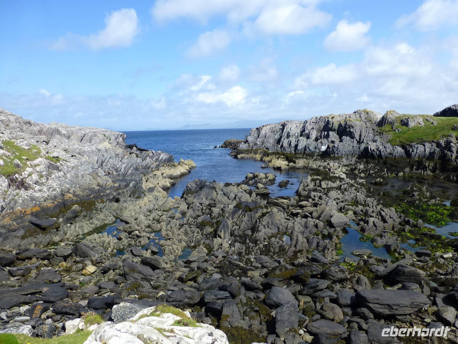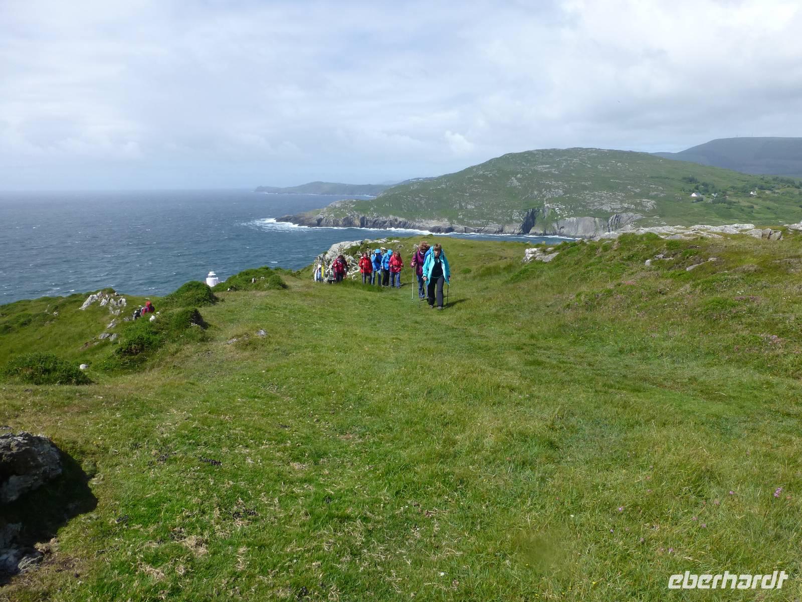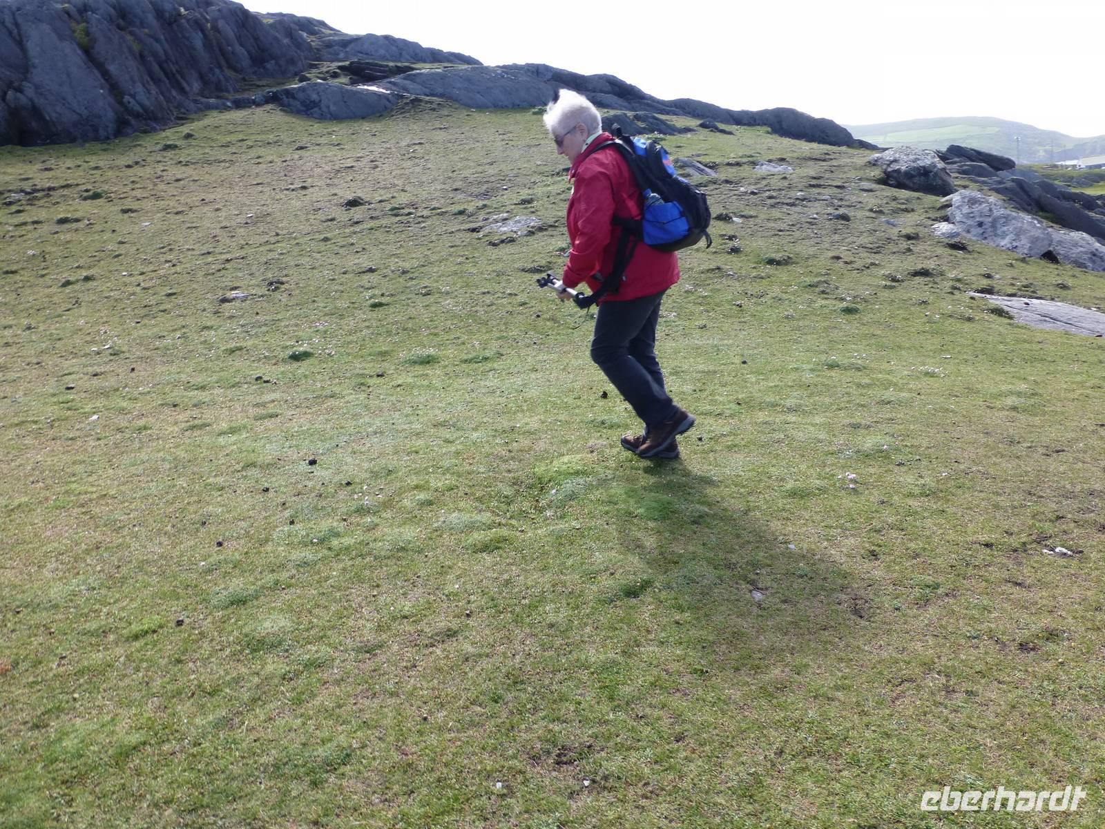 Auch heute werden wir wieder einen sonnigen Wandertag haben, was allerdings am Morgen noch nicht so richtig absehbar war. Über Bantry und Durrus geht es auf die Halbinsel mit dem Namen "Schafskopf". Wir passieren Ahakista und Kilcrohan und danach wird die Straße immer schmaler. Auf schmaler Straße, sie ist gerade so breit wie unser Bus, erreichen wir unseren Wanderausgangspunkt Cahergal. Auf unserem Weg passieren wir die Reste des alten Minersvillage, auch hier am Sheeps Head hat man versucht im 19. Jh. Kupfer abzubauen. Mit Blick auf die Bantry Bay führt der Weg entlang einer bezaubernden Klippenlandschaft und wir können schon unser Wanderziel für den morgigen Tag sehen, Beare Island. Der Weg ist allerdings die meiste Zeit sehr nass und teilweise rutschig, was unsere ganze Aufmerksamkeit beim Laufen erfordert. Unsere Mittagpause machen wir an einem Platz mit Miniwasserfall und natürlich jeder Menge Sonne. Es ist fast zu schön um wahr zu sein. Der Weg führt uns dann langsam aufwärts, immer mal wieder müssen wir kleine Feuchtwiesen überwinden. Später teilt sich unsere Gruppe, einige Gäste gehen mit Jan den direkten Weg zum Parkplatz nach Toreen, die anderem mit mir weiter zum Leuchtturm. Schließlich erreichen wir den 1965 errichteten Leuchtturm ganz im Westen der Sheeps Head Halbinsel. Vom Leuchtturm gehen wir nochmals bergan zum Endziel unserer Tour am Parkplatz von Toreen. Hier wartet nicht nur Paul mit dem Bus auf uns sondern auch ein kleines Cafe mit reichlich Belohnung für die hinter uns liegende Wanderung. Über Bantry führt uns dann am späten Nachmittag der Weg wieder nach Glengariff zurück.