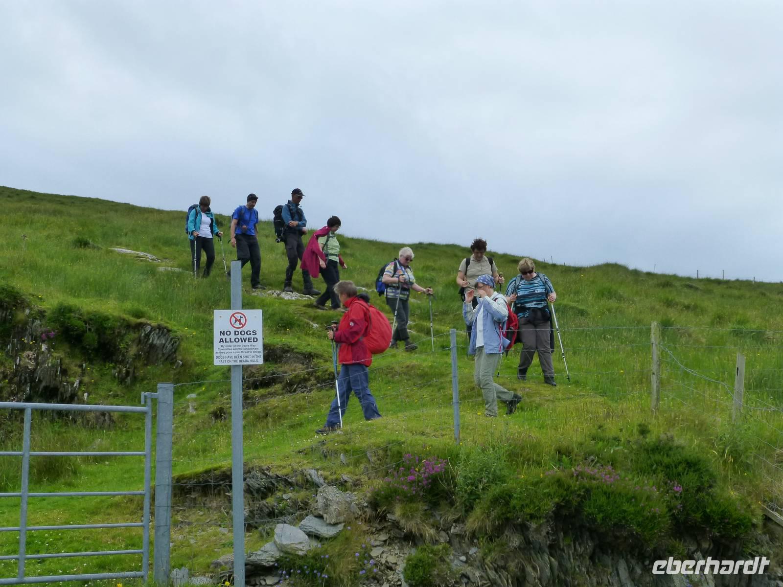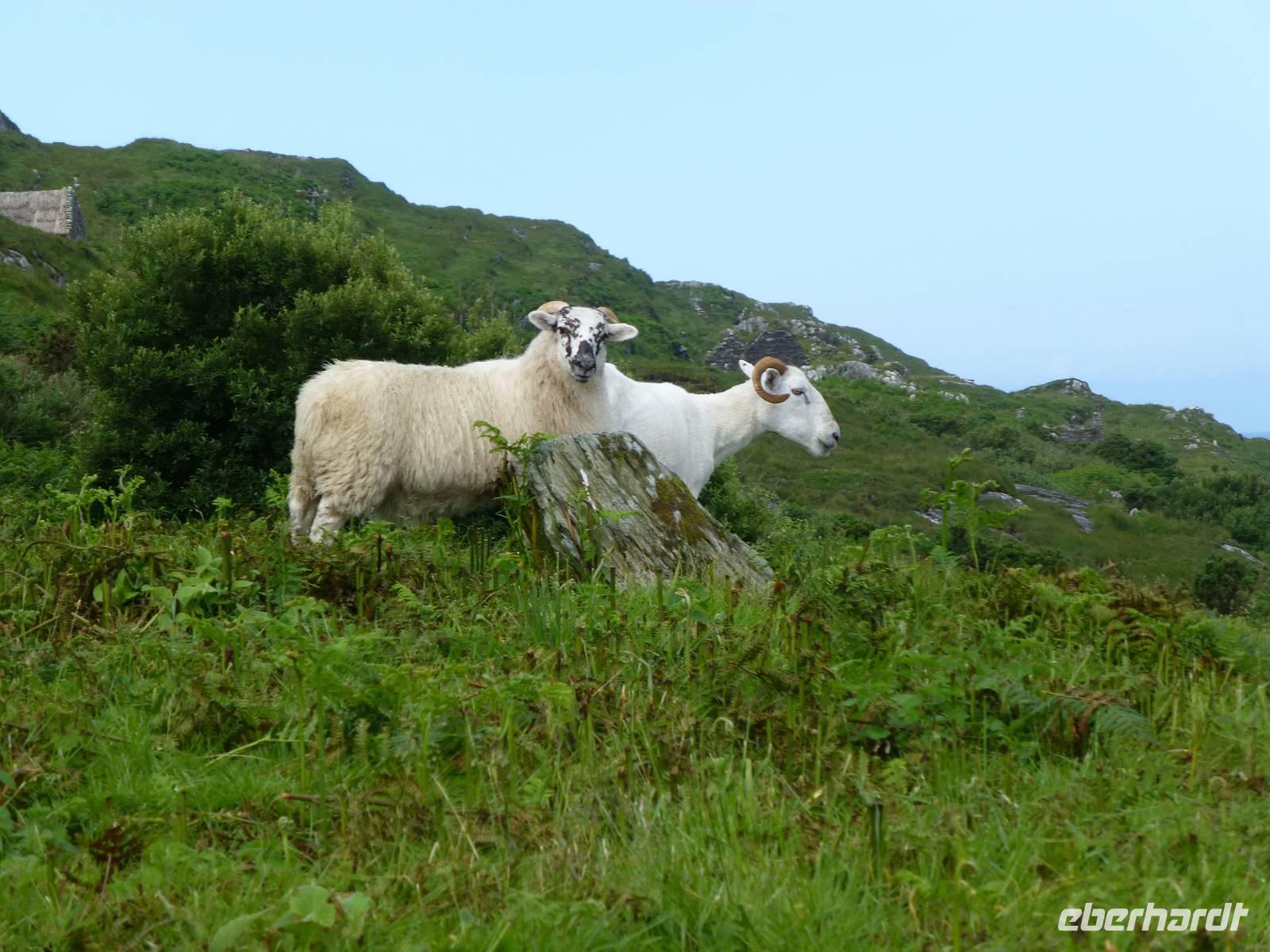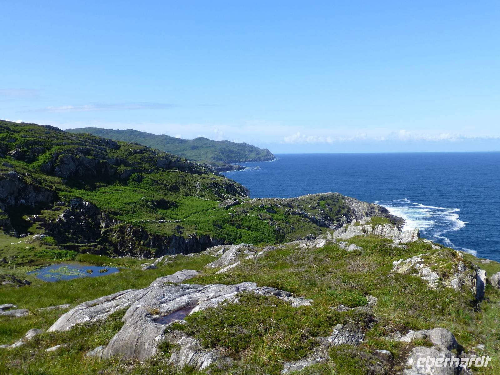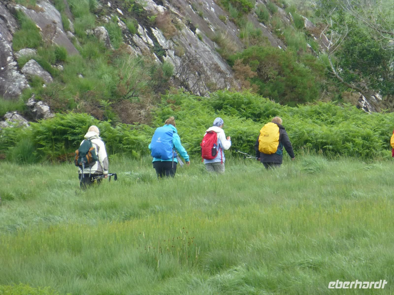 Auch heute werden wir wieder einen sonnigen Wandertag haben, was allerdings am Morgen noch nicht so richtig absehbar war. Über Bantry und Durrus geht es auf die Halbinsel mit dem Namen "Schafskopf". Wir passieren Ahakista und Kilcrohan und danach wird die Straße immer schmaler. Auf schmaler Straße, sie ist gerade so breit wie unser Bus, erreichen wir unseren Wanderausgangspunkt Cahergal. Auf unserem Weg passieren wir die Reste des alten Minersvillage, auch hier am Sheeps Head hat man versucht im 19. Jh. Kupfer abzubauen. Mit Blick auf die Bantry Bay führt der Weg entlang einer bezaubernden Klippenlandschaft und wir können schon unser Wanderziel für den morgigen Tag sehen, Beare Island. Der Weg ist allerdings die meiste Zeit sehr nass und teilweise rutschig, was unsere ganze Aufmerksamkeit beim Laufen erfordert. Unsere Mittagpause machen wir an einem Platz mit Miniwasserfall und natürlich jeder Menge Sonne. Es ist fast zu schön um wahr zu sein. Der Weg führt uns dann langsam aufwärts, immer mal wieder müssen wir kleine Feuchtwiesen überwinden. Später teilt sich unsere Gruppe, einige Gäste gehen mit Jan den direkten Weg zum Parkplatz nach Toreen, die anderem mit mir weiter zum Leuchtturm. Schließlich erreichen wir den 1965 errichteten Leuchtturm ganz im Westen der Sheeps Head Halbinsel. Vom Leuchtturm gehen wir nochmals bergan zum Endziel unserer Tour am Parkplatz von Toreen. Hier wartet nicht nur Paul mit dem Bus auf uns sondern auch ein kleines Cafe mit reichlich Belohnung für die hinter uns liegende Wanderung. Über Bantry führt uns dann am späten Nachmittag der Weg wieder nach Glengariff zurück.