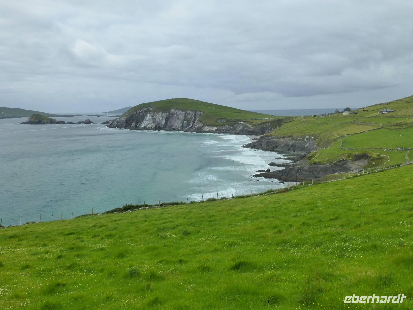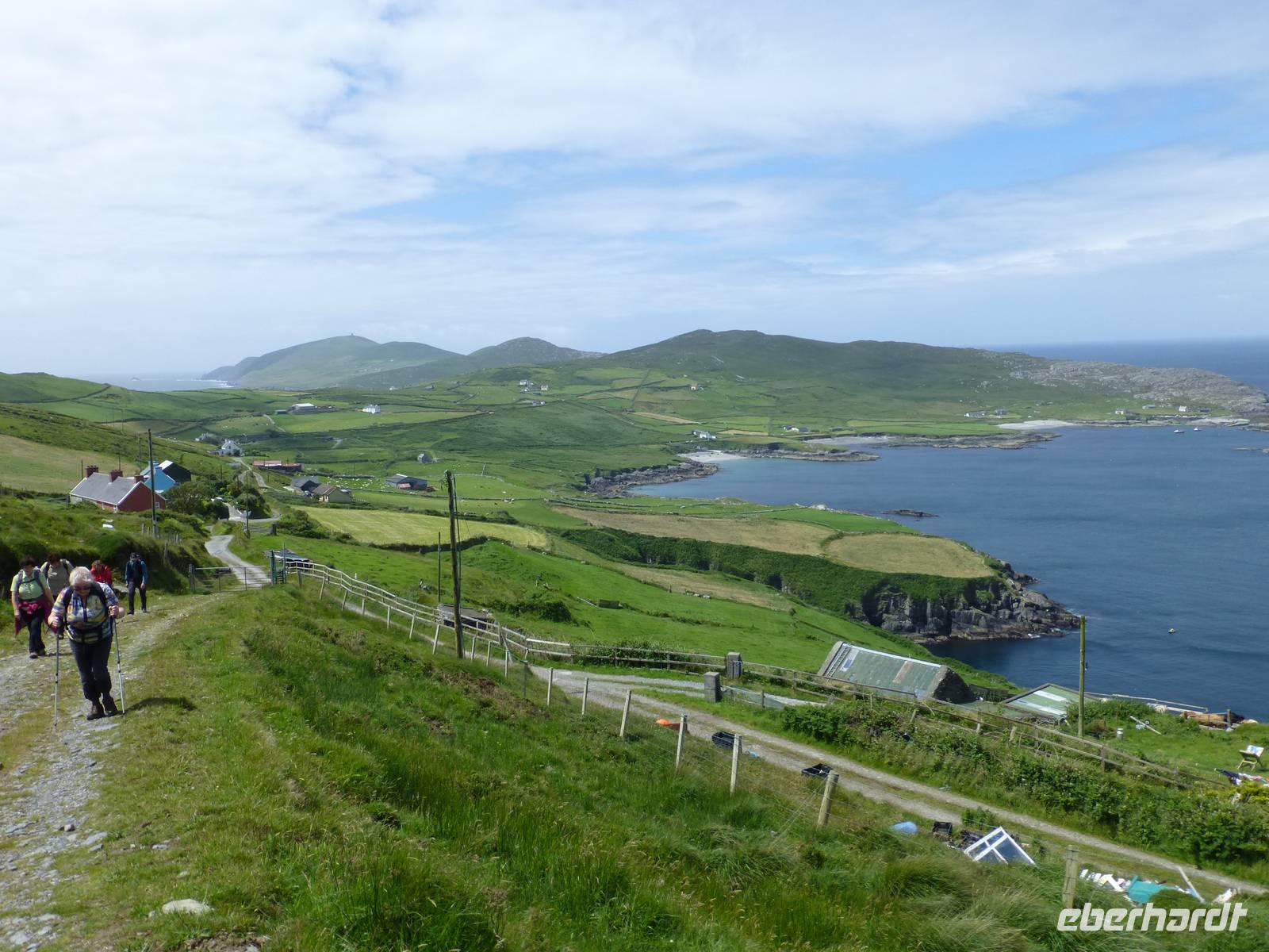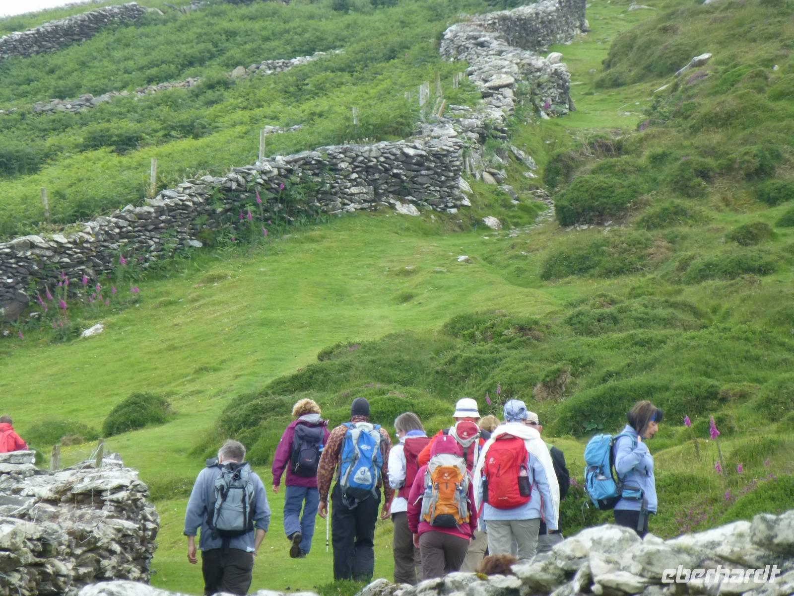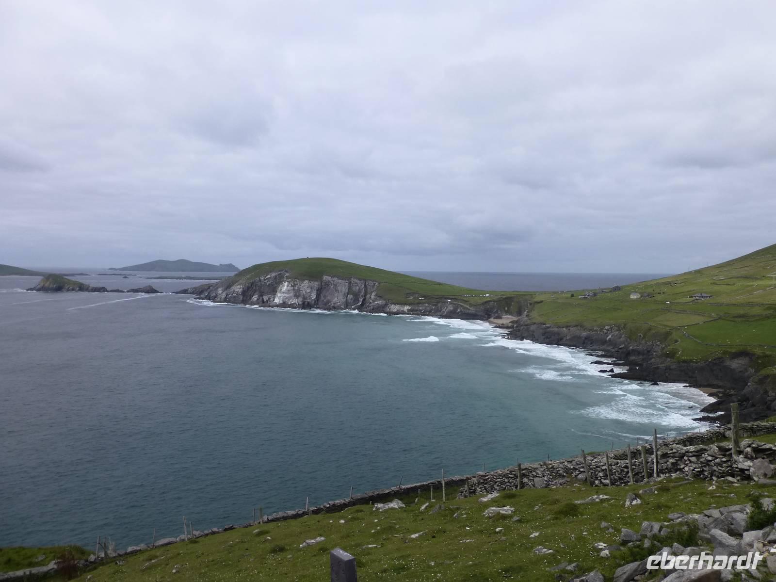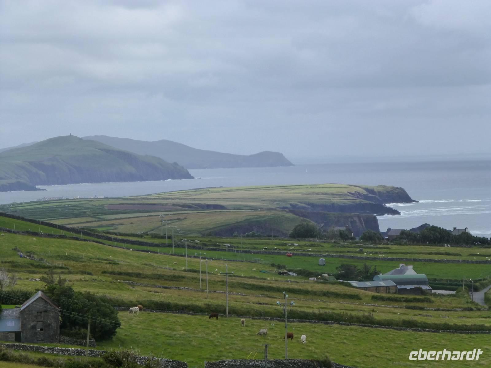 Nach dem Frühstück und der Verteilung der Lunchpakete machen wir uns auf den Weg. Das Wetter zeigt sich von seiner besten Seite, bereits am Morgen scheint die Sonne. Einen ersten kurzen Halt mache wir an "Inch Beach", einer 3,5 Kilometer langen Sanddüne vor Castlemaine Harbour. Bei einem kurzen Spaziergang lassen wir und den Wind um die Nase wehen. Vorbei an Dingle erreichen wir Ventry Harbour. An Paddie O'Shea's Pub beginnt unser Wanderung. Zuerst entlang des Strandes, laufen wir später durch eine kleine Siedlung und zwischen Weideflächen entlang. Nach einem Stück entlang der Straße zum Slea Head, geht es wieder leicht bergan und wir machen eine Pause mit schönem Blick auf die Küste und die gegenüber der Dingle Bay liegenden Iveragh Halbinsel. Neugierige Kühe wollen scheinbar gern etwas von unseren Sandwiches haben. Die Sicht ist recht gut und so können wir am Horizont auch die Inseln Skellig Michael und Little Skellig sehen. Später erreichen wir oberhalb des Slea Head bei Dunquinn das Ende unserer Wanderung. Heute war Dan unser Fahrer, er erwartet uns an dieser Stelle. Das Wetter hat es grundsätzlich gut gemeint, neben vielen Wolken hat sich auch einige Male die Sonne kurz gezeigt. Auf dem Weg zurück nach Dingle stoppen wir noch beim Galarus Oratory. Bei diesem Gebäude handelt es sich um ein frühchristliches Gebetshaus, welches in perfekter Trockensteinbauweise vor ca. 1300 Jahren errichtet wurde. Nach einem Stopp in Dingle erreichen wir am Abend wieder unser Hotel.