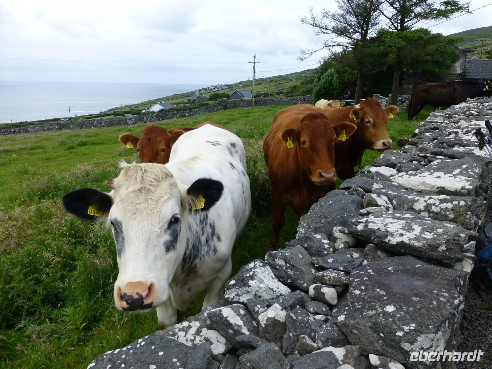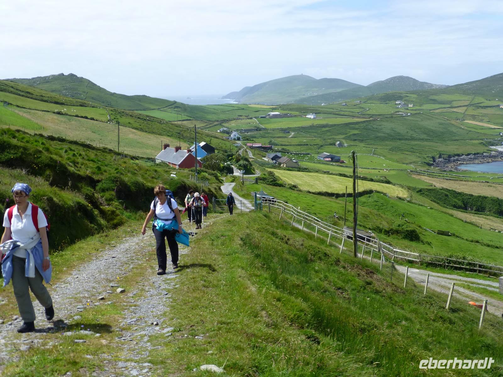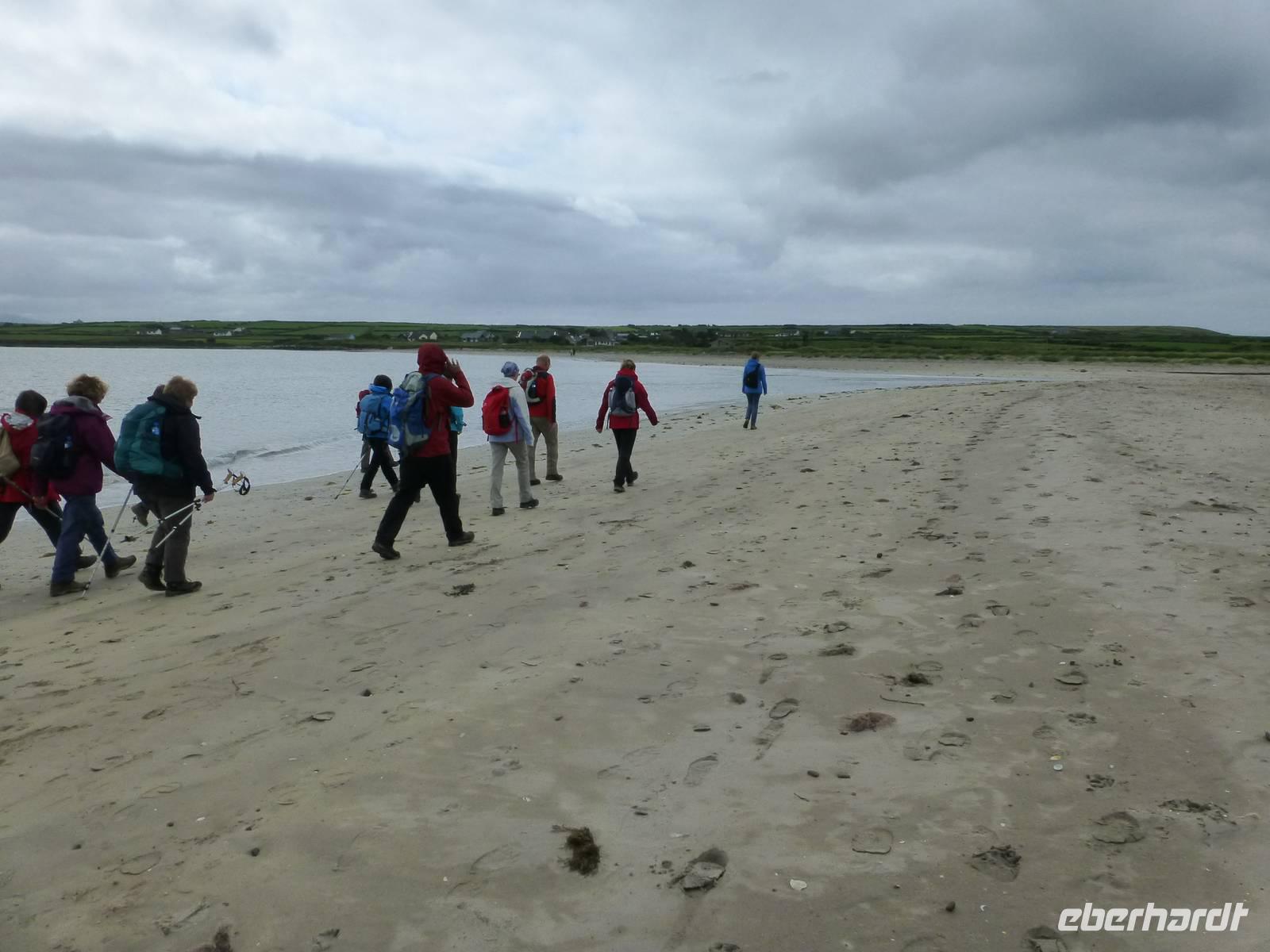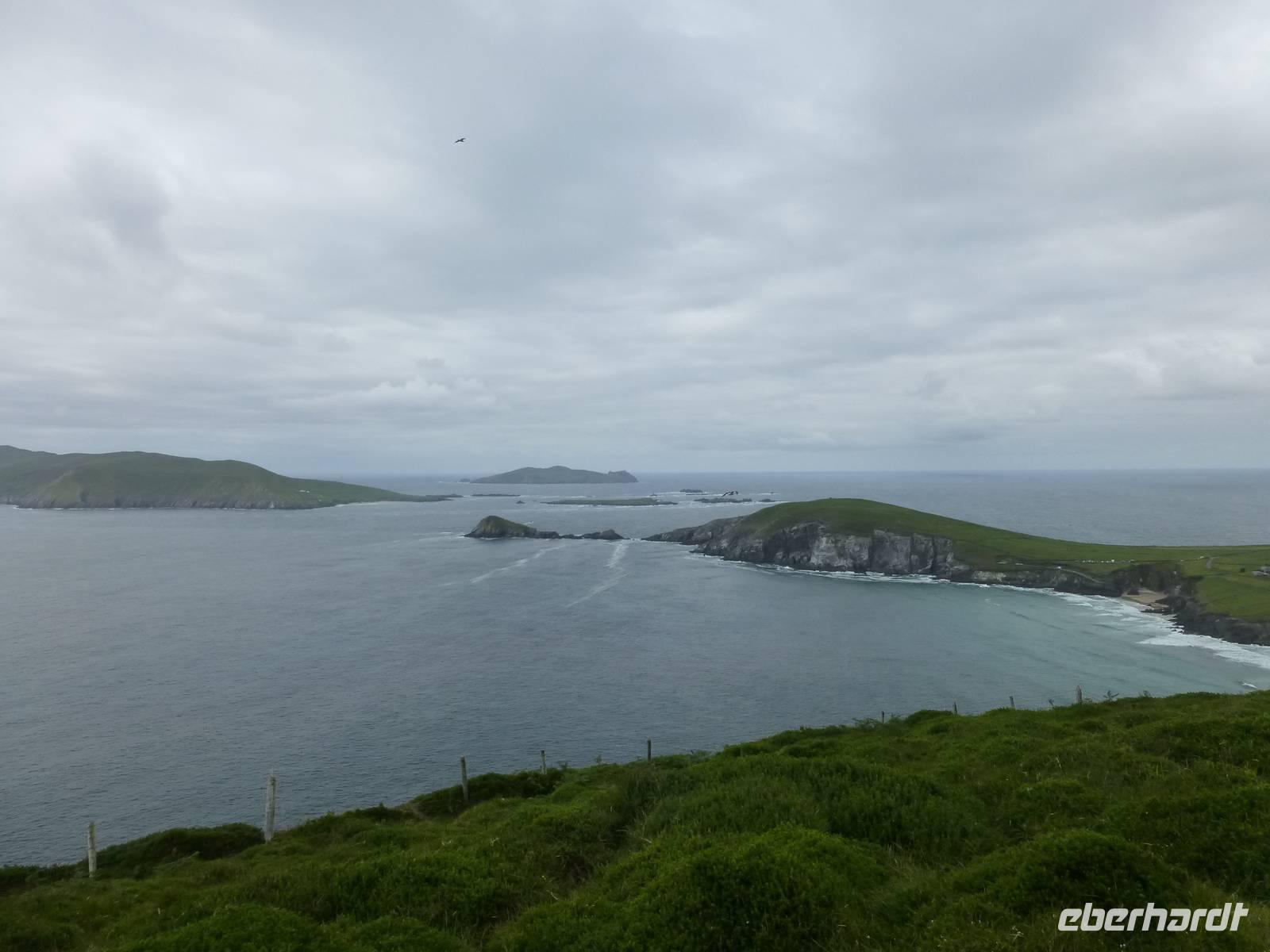 Nach dem Frühstück und der Verteilung der Lunchpakete machen wir uns auf den Weg. Das Wetter zeigt sich von seiner besten Seite, bereits am Morgen scheint die Sonne. Einen ersten kurzen Halt mache wir an "Inch Beach", einer 3,5 Kilometer langen Sanddüne vor Castlemaine Harbour. Bei einem kurzen Spaziergang lassen wir und den Wind um die Nase wehen. Vorbei an Dingle erreichen wir Ventry Harbour. An Paddie O'Shea's Pub beginnt unser Wanderung. Zuerst entlang des Strandes, laufen wir später durch eine kleine Siedlung und zwischen Weideflächen entlang. Nach einem Stück entlang der Straße zum Slea Head, geht es wieder leicht bergan und wir machen eine Pause mit schönem Blick auf die Küste und die gegenüber der Dingle Bay liegenden Iveragh Halbinsel. Neugierige Kühe wollen scheinbar gern etwas von unseren Sandwiches haben. Die Sicht ist recht gut und so können wir am Horizont auch die Inseln Skellig Michael und Little Skellig sehen. Später erreichen wir oberhalb des Slea Head bei Dunquinn das Ende unserer Wanderung. Heute war Dan unser Fahrer, er erwartet uns an dieser Stelle. Das Wetter hat es grundsätzlich gut gemeint, neben vielen Wolken hat sich auch einige Male die Sonne kurz gezeigt. Auf dem Weg zurück nach Dingle stoppen wir noch beim Galarus Oratory. Bei diesem Gebäude handelt es sich um ein frühchristliches Gebetshaus, welches in perfekter Trockensteinbauweise vor ca. 1300 Jahren errichtet wurde. Nach einem Stopp in Dingle erreichen wir am Abend wieder unser Hotel.