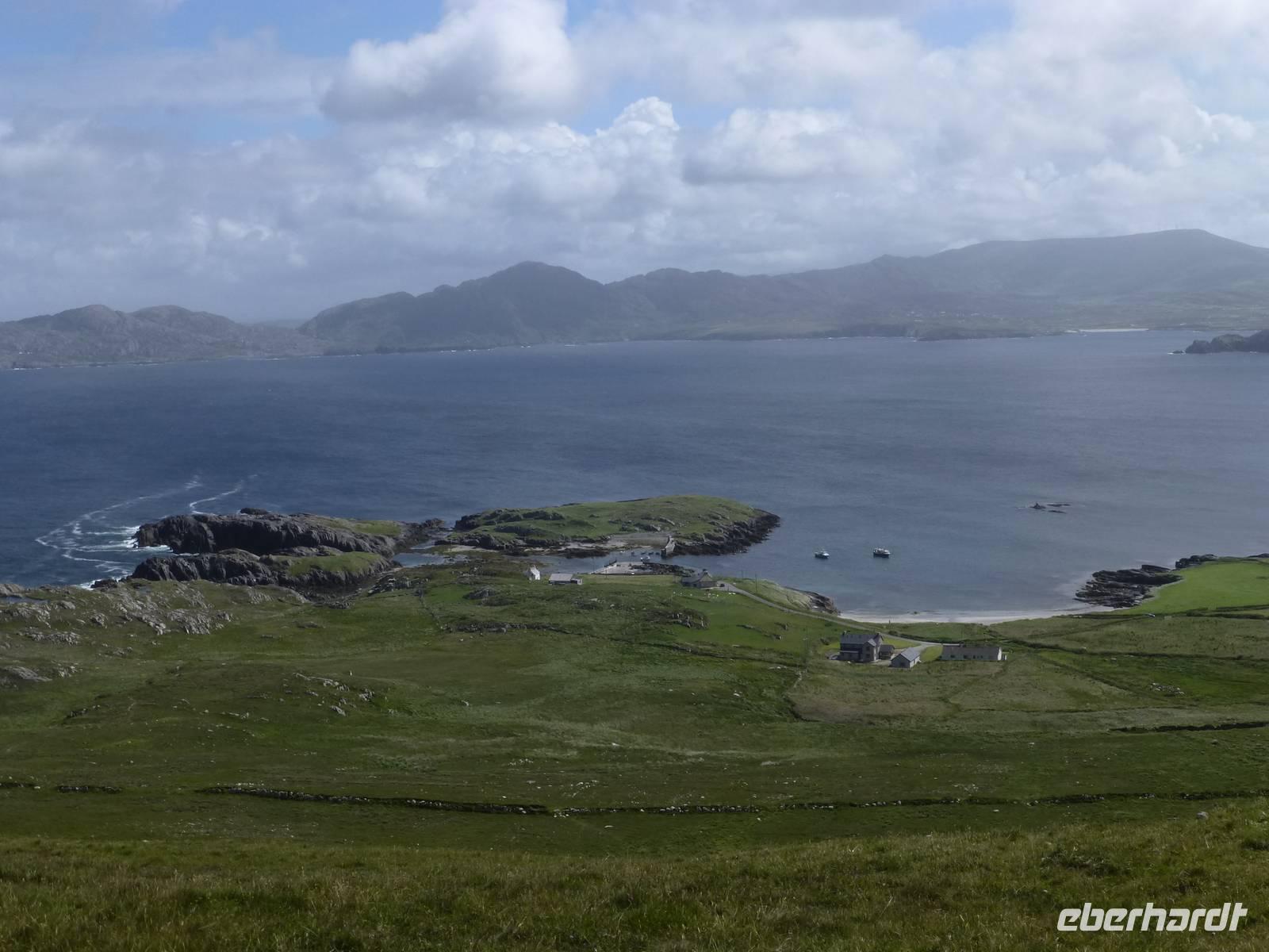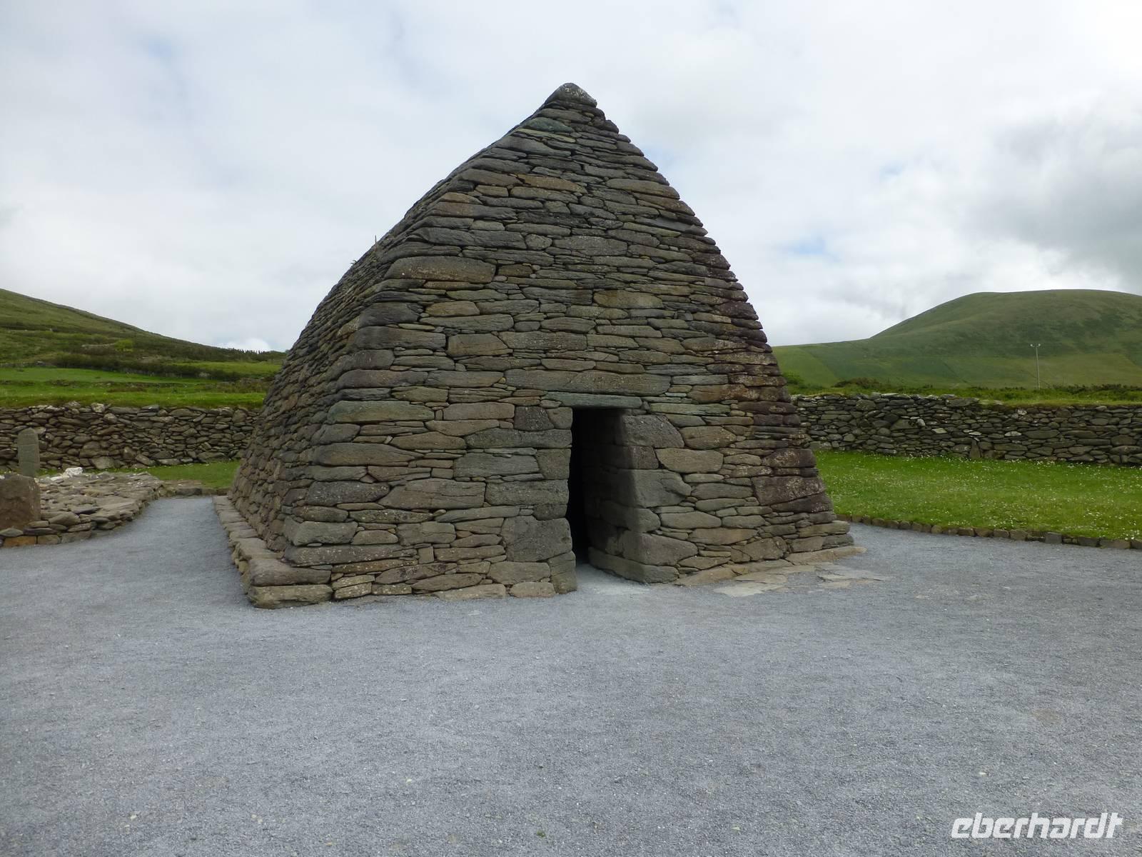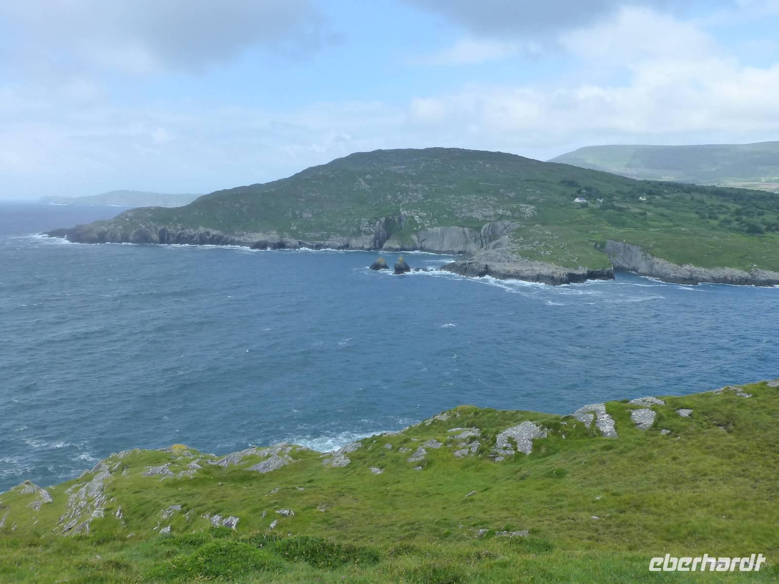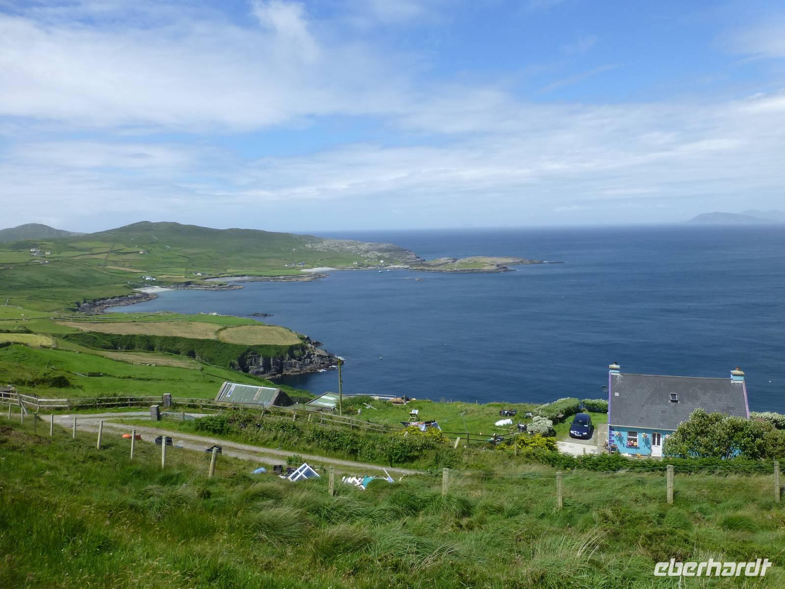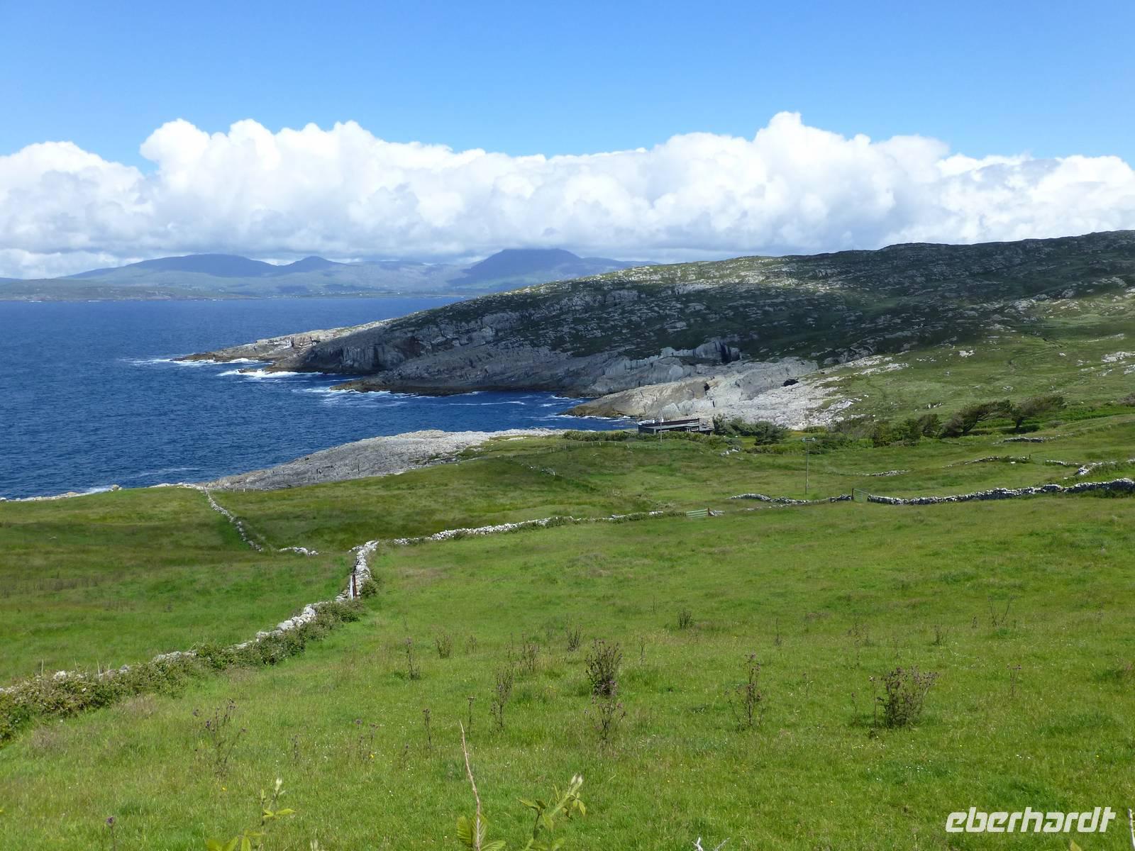 Nach dem Frühstück und der Verteilung der Lunchpakete machen wir uns auf den Weg. Das Wetter zeigt sich von seiner besten Seite, bereits am Morgen scheint die Sonne. Einen ersten kurzen Halt mache wir an "Inch Beach", einer 3,5 Kilometer langen Sanddüne vor Castlemaine Harbour. Bei einem kurzen Spaziergang lassen wir und den Wind um die Nase wehen. Vorbei an Dingle erreichen wir Ventry Harbour. An Paddie O'Shea's Pub beginnt unser Wanderung. Zuerst entlang des Strandes, laufen wir später durch eine kleine Siedlung und zwischen Weideflächen entlang. Nach einem Stück entlang der Straße zum Slea Head, geht es wieder leicht bergan und wir machen eine Pause mit schönem Blick auf die Küste und die gegenüber der Dingle Bay liegenden Iveragh Halbinsel. Neugierige Kühe wollen scheinbar gern etwas von unseren Sandwiches haben. Die Sicht ist recht gut und so können wir am Horizont auch die Inseln Skellig Michael und Little Skellig sehen. Später erreichen wir oberhalb des Slea Head bei Dunquinn das Ende unserer Wanderung. Heute war Dan unser Fahrer, er erwartet uns an dieser Stelle. Das Wetter hat es grundsätzlich gut gemeint, neben vielen Wolken hat sich auch einige Male die Sonne kurz gezeigt. Auf dem Weg zurück nach Dingle stoppen wir noch beim Galarus Oratory. Bei diesem Gebäude handelt es sich um ein frühchristliches Gebetshaus, welches in perfekter Trockensteinbauweise vor ca. 1300 Jahren errichtet wurde. Nach einem Stopp in Dingle erreichen wir am Abend wieder unser Hotel.