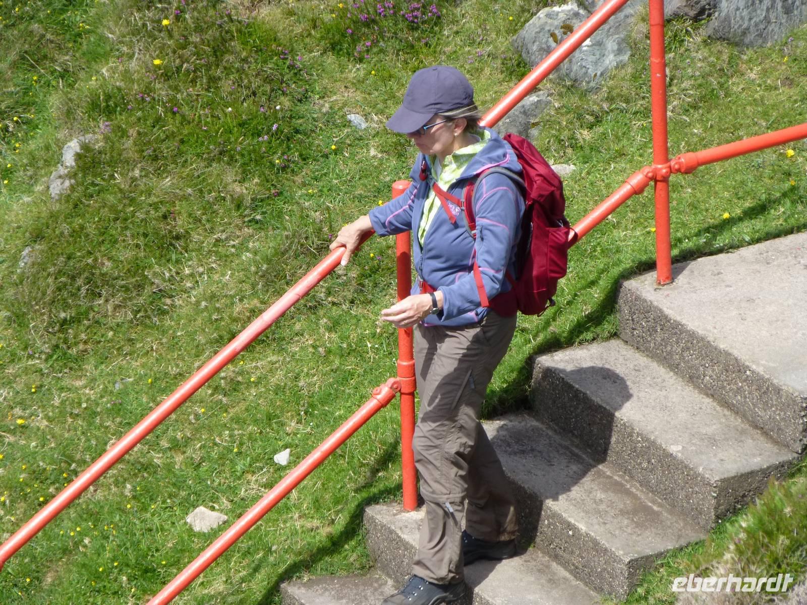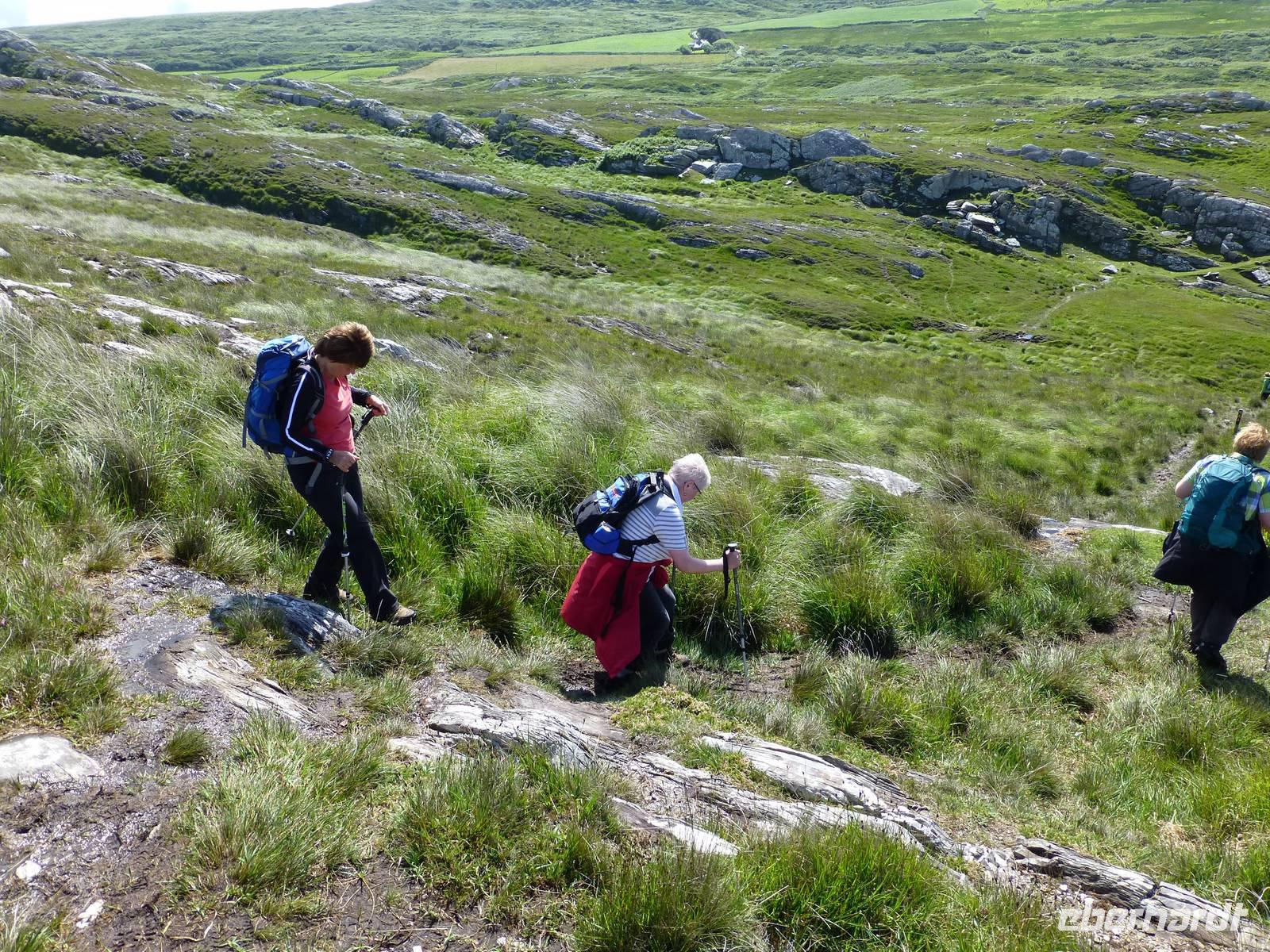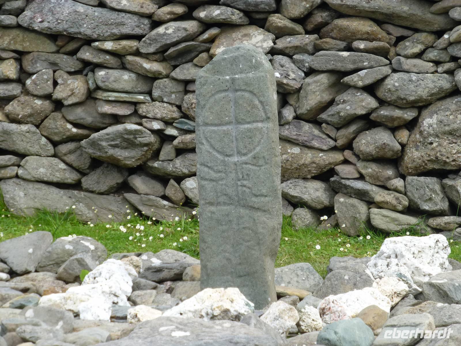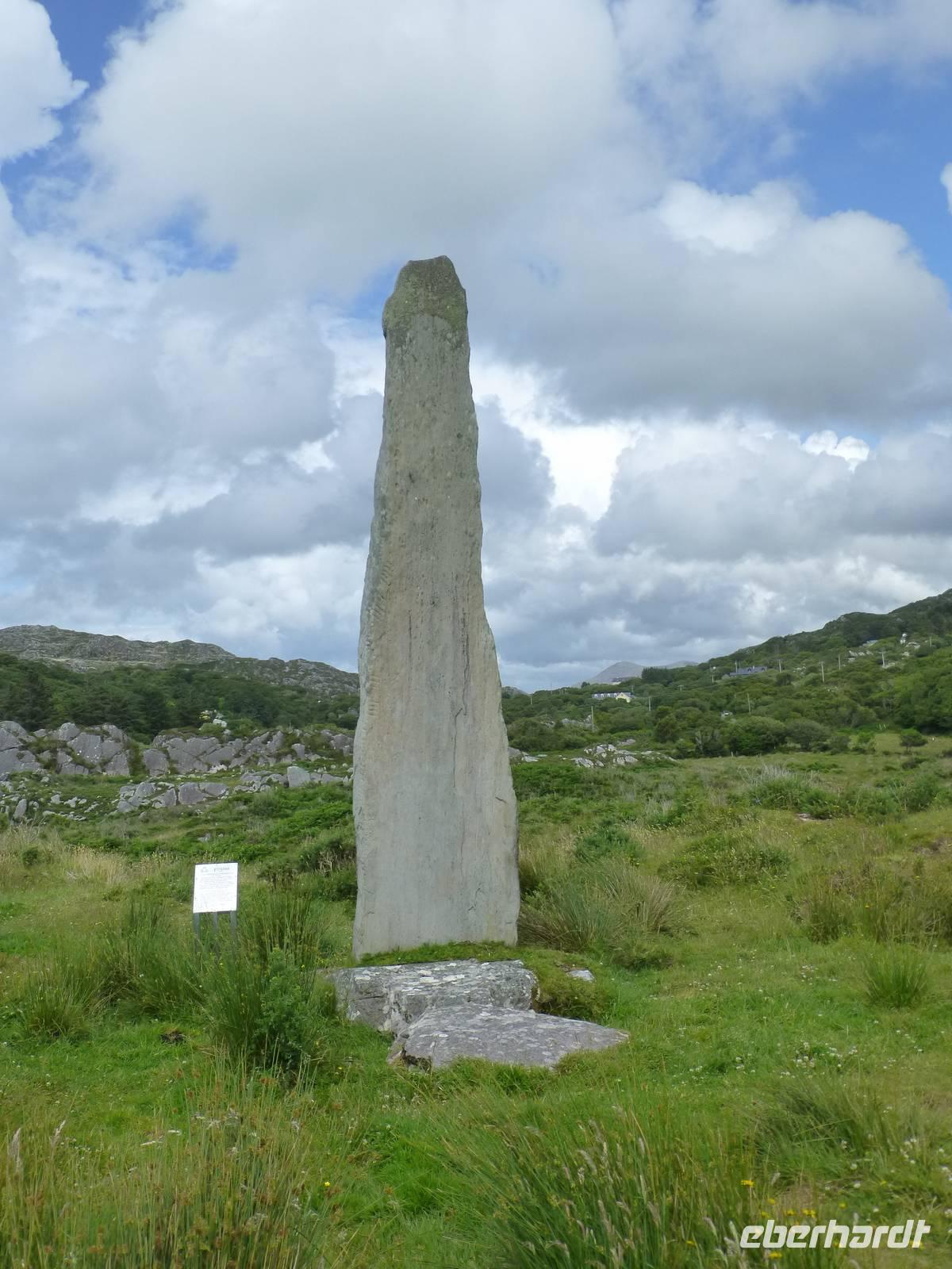 Nach einer regnerischen Nacht hat sich das Wetter am Morgen wieder beruhigt. Vom Hotel fahren wir über Casteltownbere zur Dursey Cable Car Station. Diese liegt ganz im Westen der Beara Halbinsel. 1969 als erste und einzige Seilbahn Irlands erbaut, befördert sie in erster Linie Tiere auf oder von der 400 m entfernt liegenden Insel Dursey Island. Als wir ankommen ist die Bahn auch gerade in Betrieb. Inzwischen lacht die Sonne, was sich auch auf dem ganzen Weg nicht ändern wird. Wir machen uns auf den Weg, es geht bergan, wir folgen immer den gelben Wegmarkierungen. Vom höchsten Punkt des ersten Teilabschnittes, 121 m ü.N.N., öffnet sich der Blick zurück auf Dursey Island bzw. voraus auf Garinish Pier und dem Strand von Ballydonegan. In Garinish machen wir unsere Mittagspause mit den sehr guten "Homemade Sandwiches" aus unserem Hotel. Noch einmal steigt unser Weg an, dann verläuft der Weg über sehr feuchtes Weideland bevor er steil zur Küste abfällt. An der Straße nach Alihies treffen wir unseren Bus wieder. Im O'Neils Pub in Alihies gibt es die Möglichkeit für ein Bier oder auch einen Kaffee. Zum Abschluss des Tages sehen wir uns noch den Ogham Stone von Ballycrovane an. Mit 5,3 m Höhe ist er der höchste seiner Art in Europa.