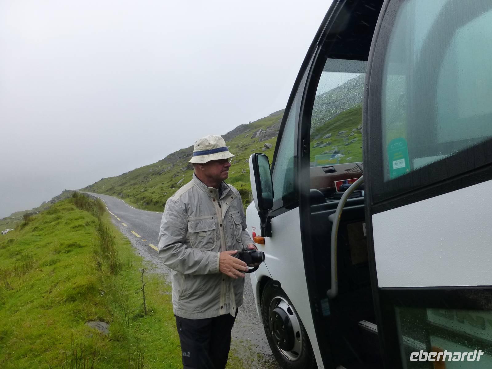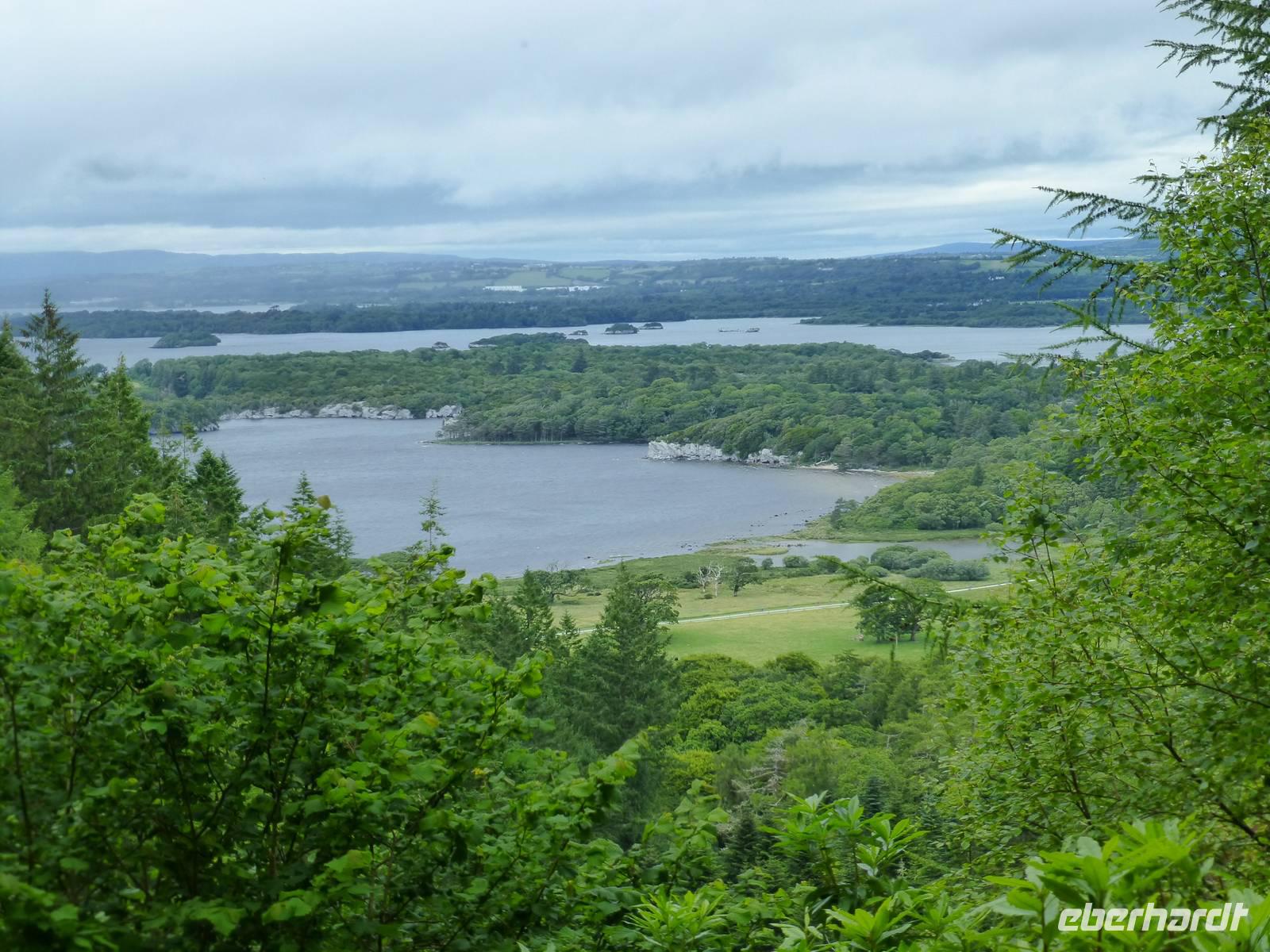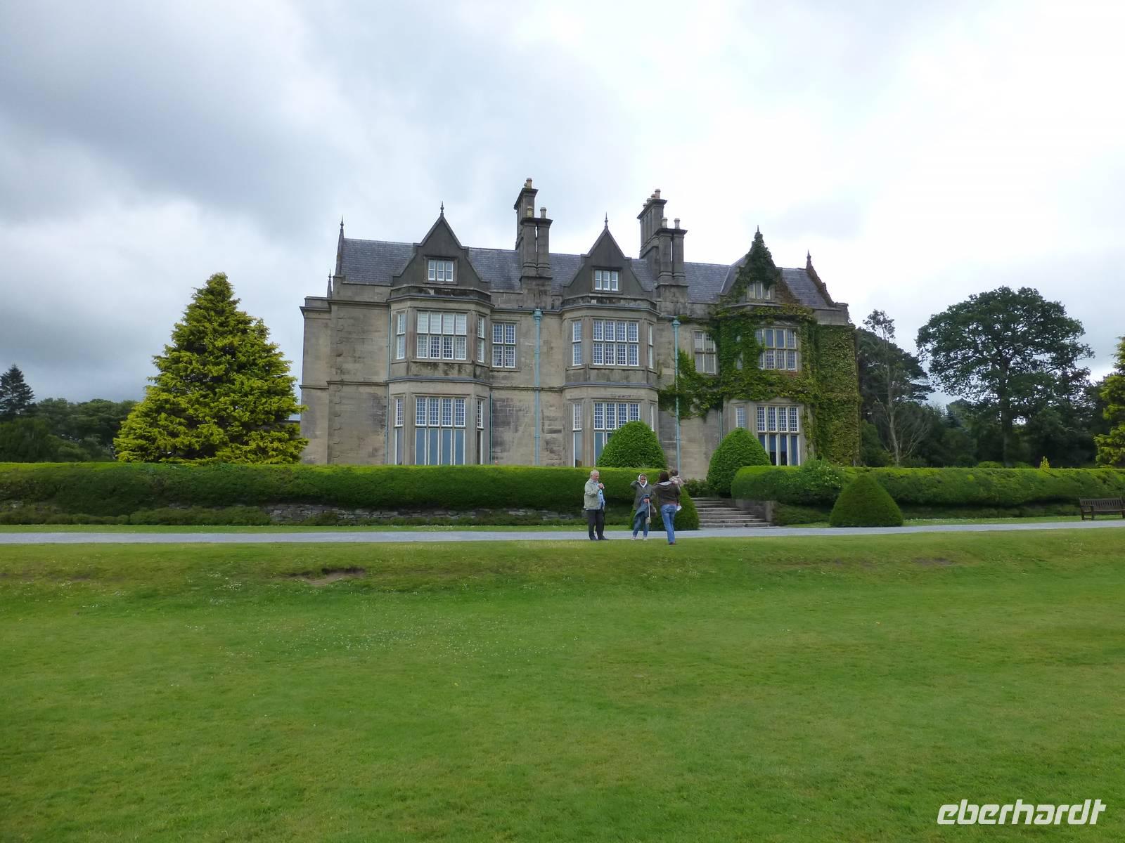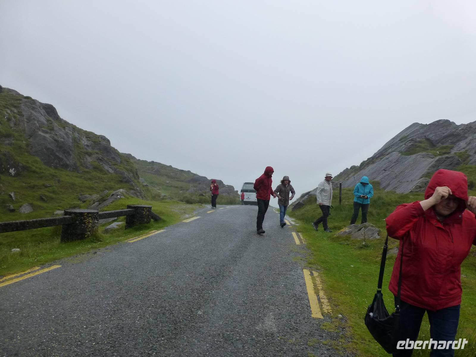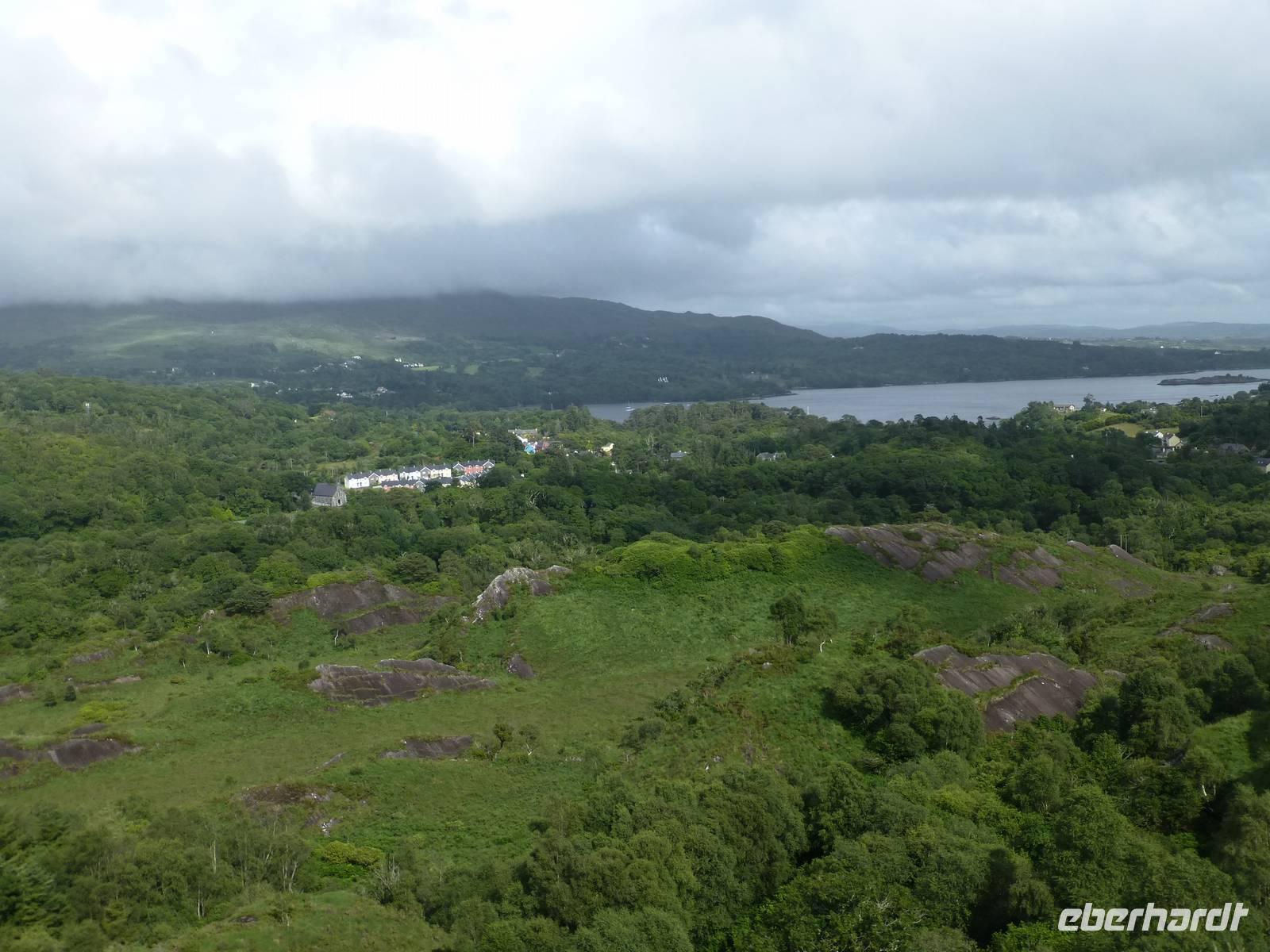 Bereits in der Nacht setzt starker Regen ein und auch am Vormittag bleibt dies unverändert. So bleiben die Wanderschuhe heute im Hotel und wir ziehen unseren wanderfreien Tag vor. Wir haben heute unsern "Transfer Day", wir wechseln das Hotel und verlegen uns nach Glengarriff. Über den Healey Pass fahren wir vom County Cork ins County Kerry und trotz Regen trauen sich einige aus dem Bus um nochmal einen Blick auf die Serpentinen zu nehmen. Auch ein Foto von einem sonst nicht vorhandenen Wasserfall wird unterwegs gemacht. Weiter fahren wir jetzt nach Kenmare. Das Landstädtchen mit seinen bunten Häusern weist ein reges Treiben auf. Etwas stiller wird es abseits der Hauptstraße. Mit der Besichtigung der Cromwell's Bridge aus dem 11. Jh. und des Steinkreises von Kenmare, welcher etwa ca.2500 Jahre alt ist. Es lohnt sich hier ein Bummel durch die zahlreichen Geschäfte und zum Mittag probieren einige aus unserer Gruppe "Irish Stew", einen typisch irischen Lammeintopf mit Kartoffeln und Gemüse. Über Molls Gap erreichen wir den Killarney NP und haben, jetzt bei trockenem Wetter, eine gute Aussicht über die Seen. Im Muckross Park machen wir einen Spaziergang rund um das Muckross House. Dann heißt es schon wieder Rückfahrt nach Glengarriff. Bevor wir das Hotel erreichen machen wir noch einen Spaziergang durch den Glengarriff Wood, ein geschütztes Waldgebiet mit einem in Irland ursprünglichen Eichenwald. Vom "Lady Bantry's Lookout" haben wir einen tollen Blick auf die Bucht von Glengarriff.