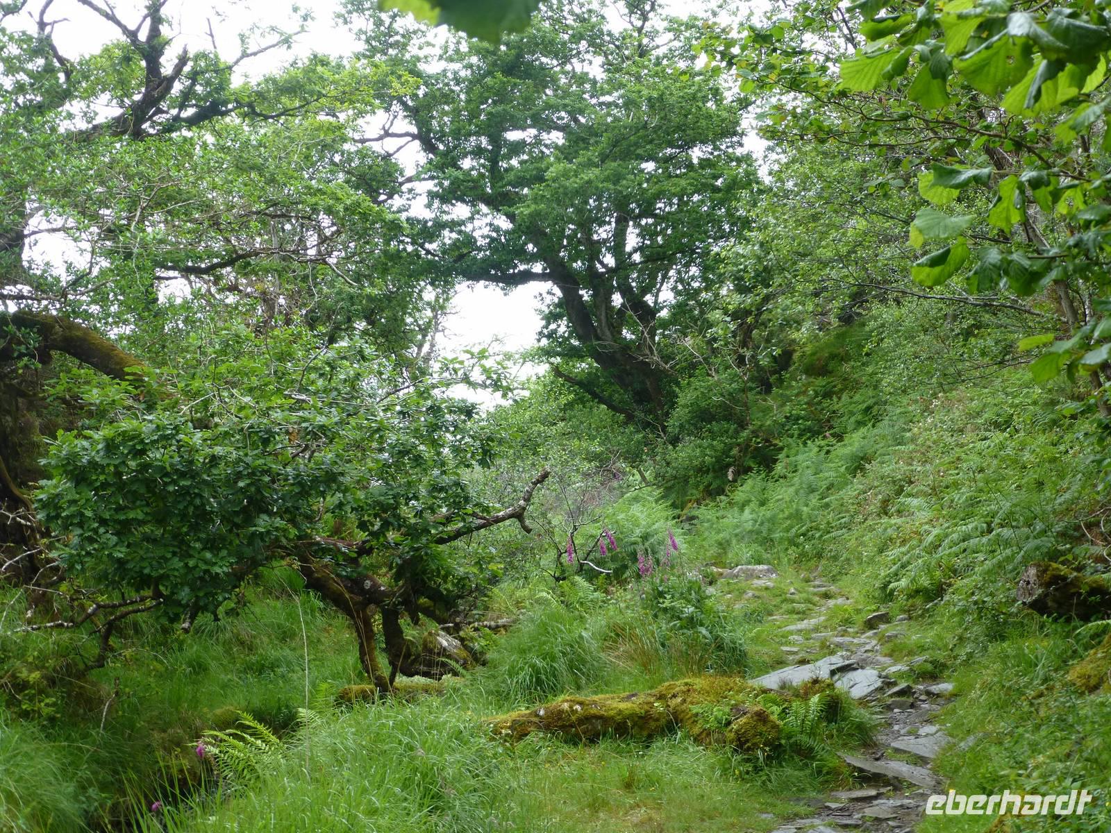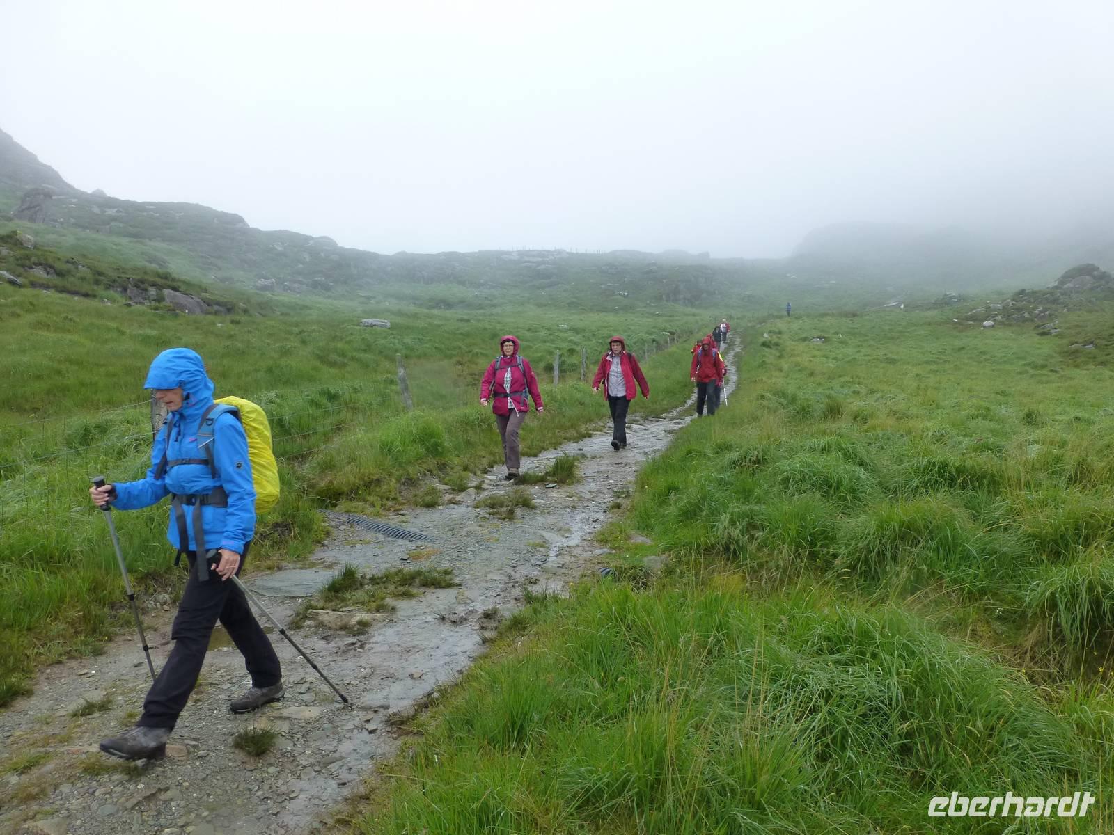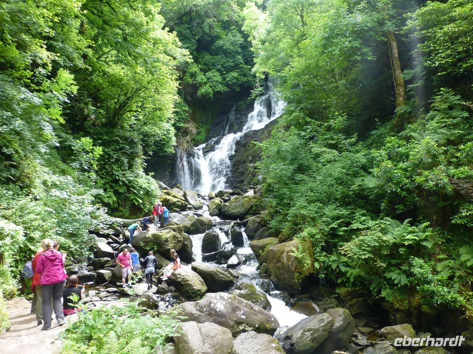 Am Morgen fahren wir von Killarney nach Kenmare. Leichter Nieselregen begleitet uns auf der Fahrt und später auch bei der Wanderung. Etwas außerhalb des Ortes beginnt unsere Wanderung auf der Old Kenmare Road. Diese Straße war in früheren Zeiten die Verbindung zwischen Kenmare und Killarney. Zuerst steigt der Weg an und nach Erreichen eines kleinen Passes, Windy Gap genannt, weitet sich der Blick in das vor uns liegende Tal. Mit dem Erreichen des Killarney Nationalpark ändert sich das Landschaftsbild, die schroffe Landschaft weicht und wir laufen in einen grünen alten Eichenwald hinein wo es eine Vielzahl an moosbedeckten Steinen gibt. Es entsteht der Eindruck als befänden wir uns in einem Märchenwald, es fehlt eigentlich nur noch die Begegnung mit einem irischen Kobold, einem Leprechaun. Auf einer freien Fläche machen wir unsere Mittagspause. Im weiteren Verlauf des Weges öffnet sich die Landschaft wieder, wir laufen zum Teil über Bohlenwege, da vielfach morastiges Gebiet vorhanden ist. Ein kleiner Wasserfall lädt zu einer kurzen Pause ein, bevor wir den letzten Teil des Weges zum Torc Waterfall in Angriff nehmen. Paul unser Busfahrer wartet dort. Vom Wasserfall fahren wir gemeinsam zum Muckross House. Nur einige wenige gehen noch die etwa 3 km zu Fuß. Nach dem Abendessen nutzen wir noch die Gelegenheit zum Besuch der Show „Celtic Steps" im Killarney Racecourse.
