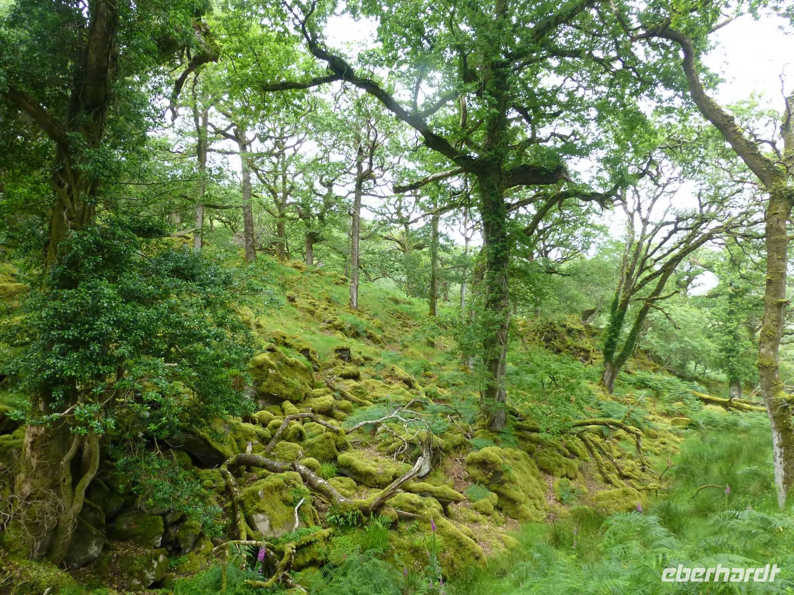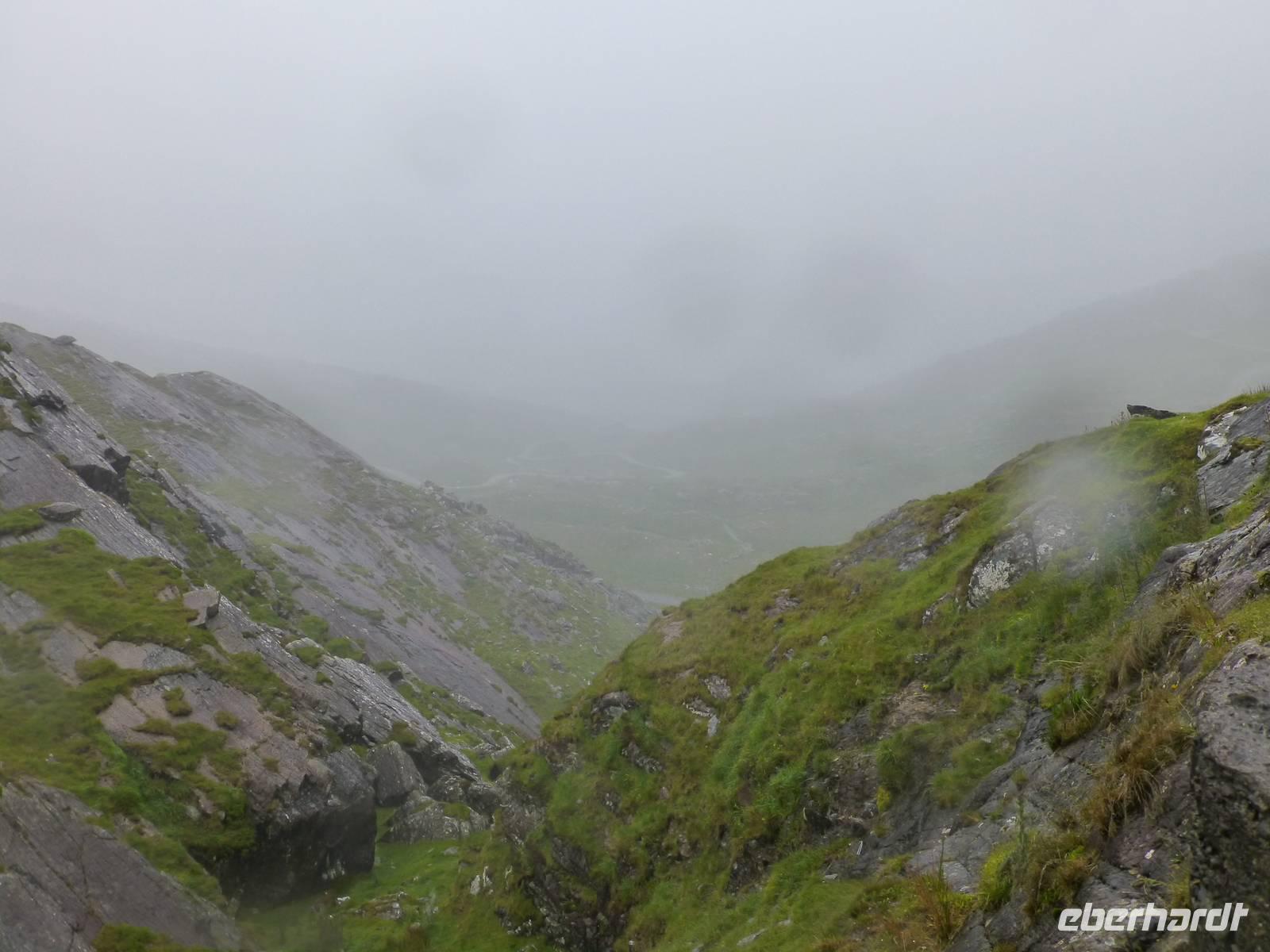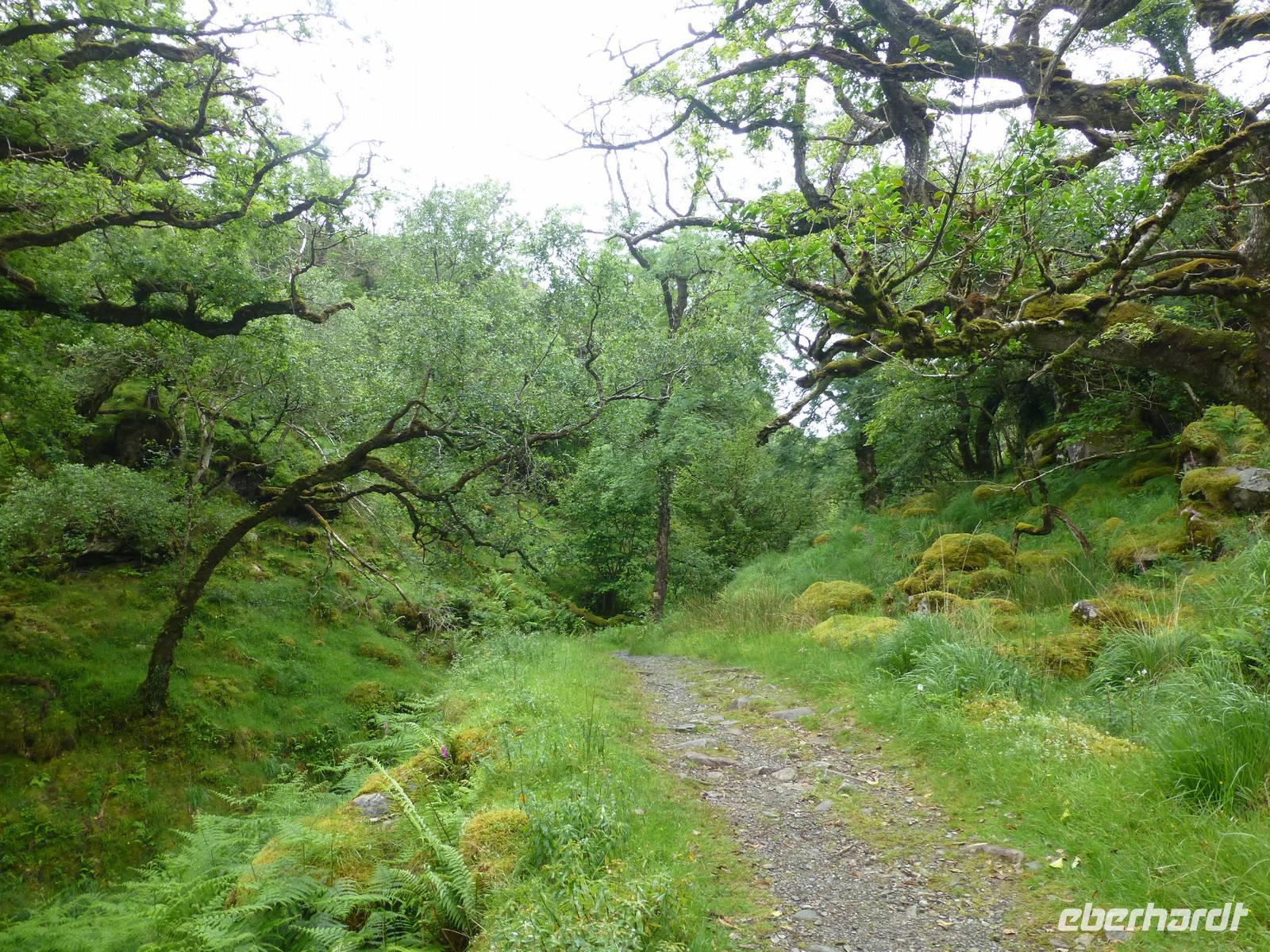 Am Morgen fahren wir von Killarney nach Kenmare. Leichter Nieselregen begleitet uns auf der Fahrt und später auch bei der Wanderung. Etwas außerhalb des Ortes beginnt unsere Wanderung auf der Old Kenmare Road. Diese Straße war in früheren Zeiten die Verbindung zwischen Kenmare und Killarney. Zuerst steigt der Weg an und nach Erreichen eines kleinen Passes, Windy Gap genannt, weitet sich der Blick in das vor uns liegende Tal. Mit dem Erreichen des Killarney Nationalpark ändert sich das Landschaftsbild, die schroffe Landschaft weicht und wir laufen in einen grünen alten Eichenwald hinein wo es eine Vielzahl an moosbedeckten Steinen gibt. Es entsteht der Eindruck als befänden wir uns in einem Märchenwald, es fehlt eigentlich nur noch die Begegnung mit einem irischen Kobold, einem Leprechaun. Auf einer freien Fläche machen wir unsere Mittagspause. Im weiteren Verlauf des Weges öffnet sich die Landschaft wieder, wir laufen zum Teil über Bohlenwege, da vielfach morastiges Gebiet vorhanden ist. Ein kleiner Wasserfall lädt zu einer kurzen Pause ein, bevor wir den letzten Teil des Weges zum Torc Waterfall in Angriff nehmen. Paul unser Busfahrer wartet dort. Vom Wasserfall fahren wir gemeinsam zum Muckross House. Nur einige wenige gehen noch die etwa 3 km zu Fuß. Nach dem Abendessen nutzen wir noch die Gelegenheit zum Besuch der Show „Celtic Steps" im Killarney Racecourse.
