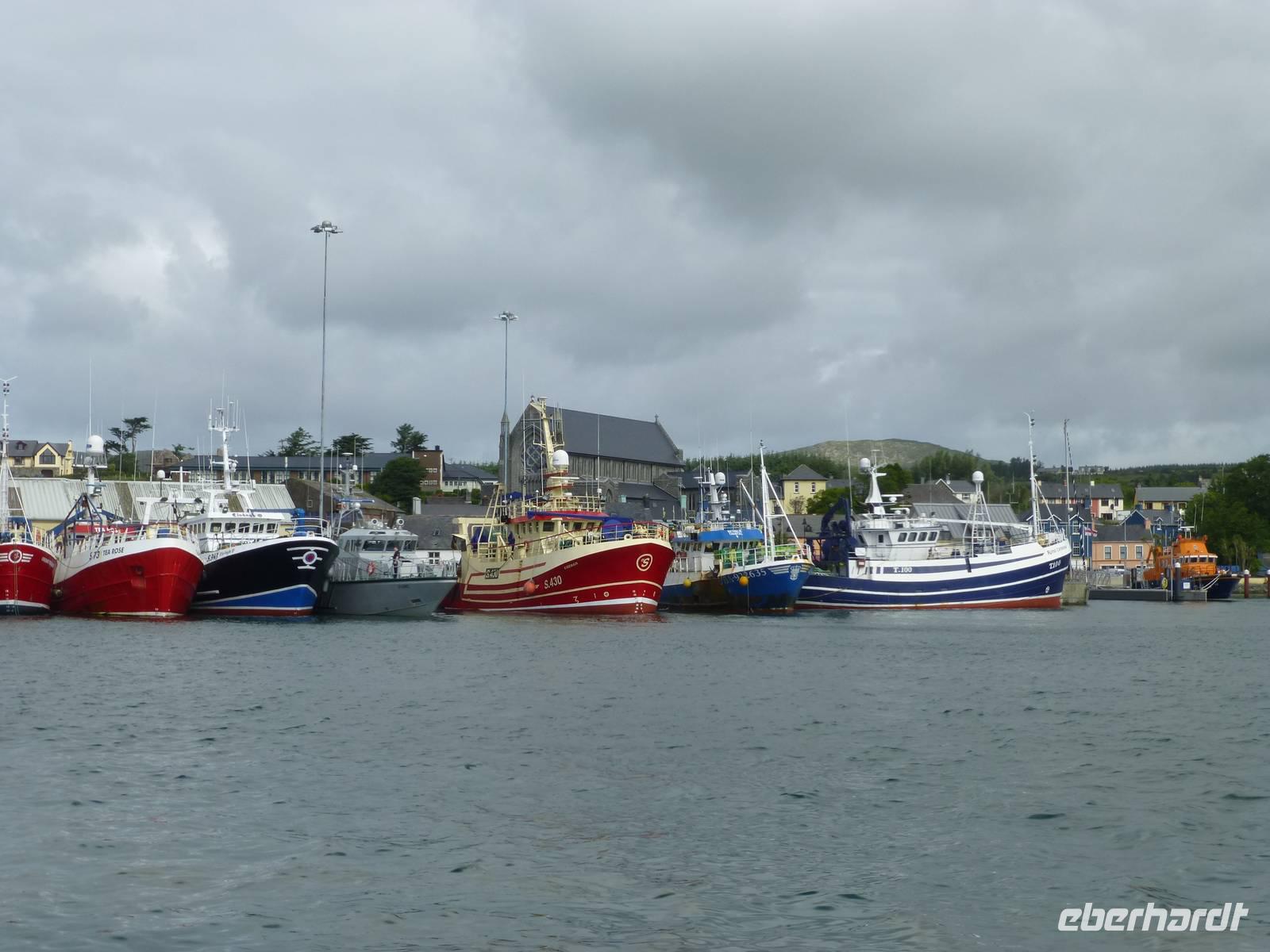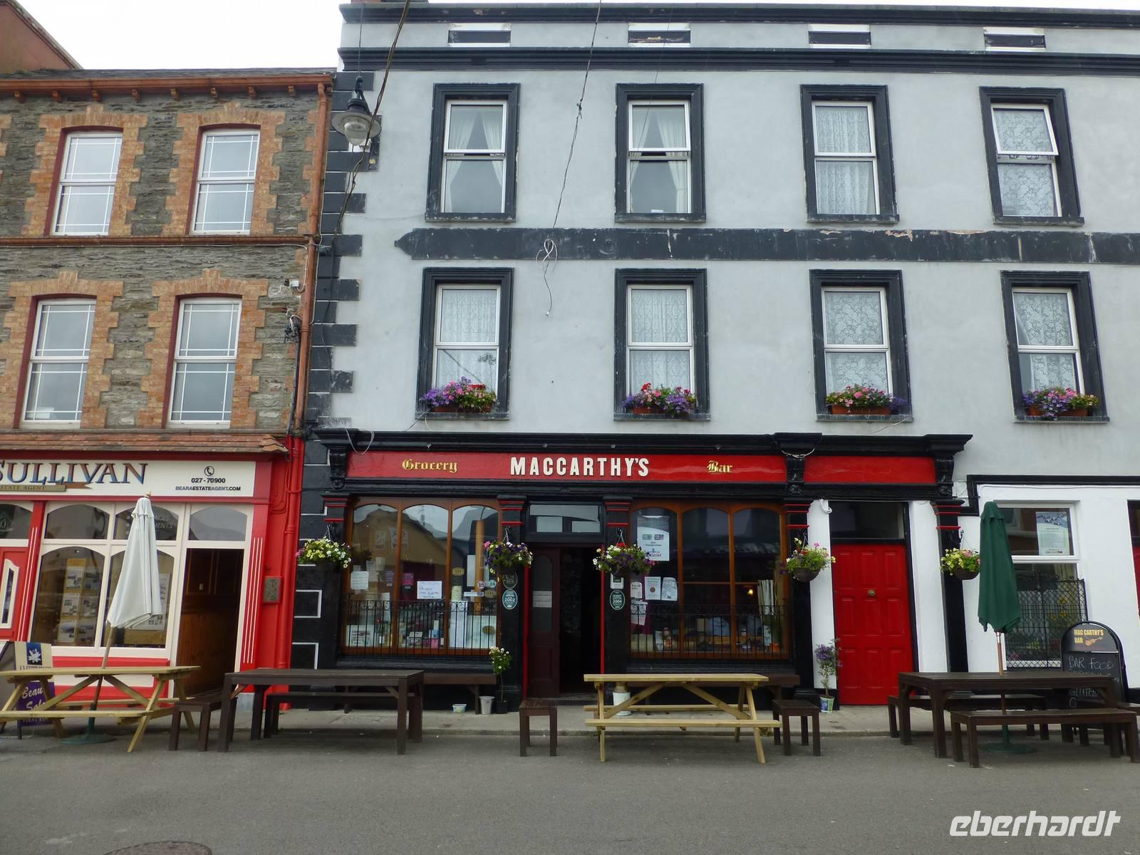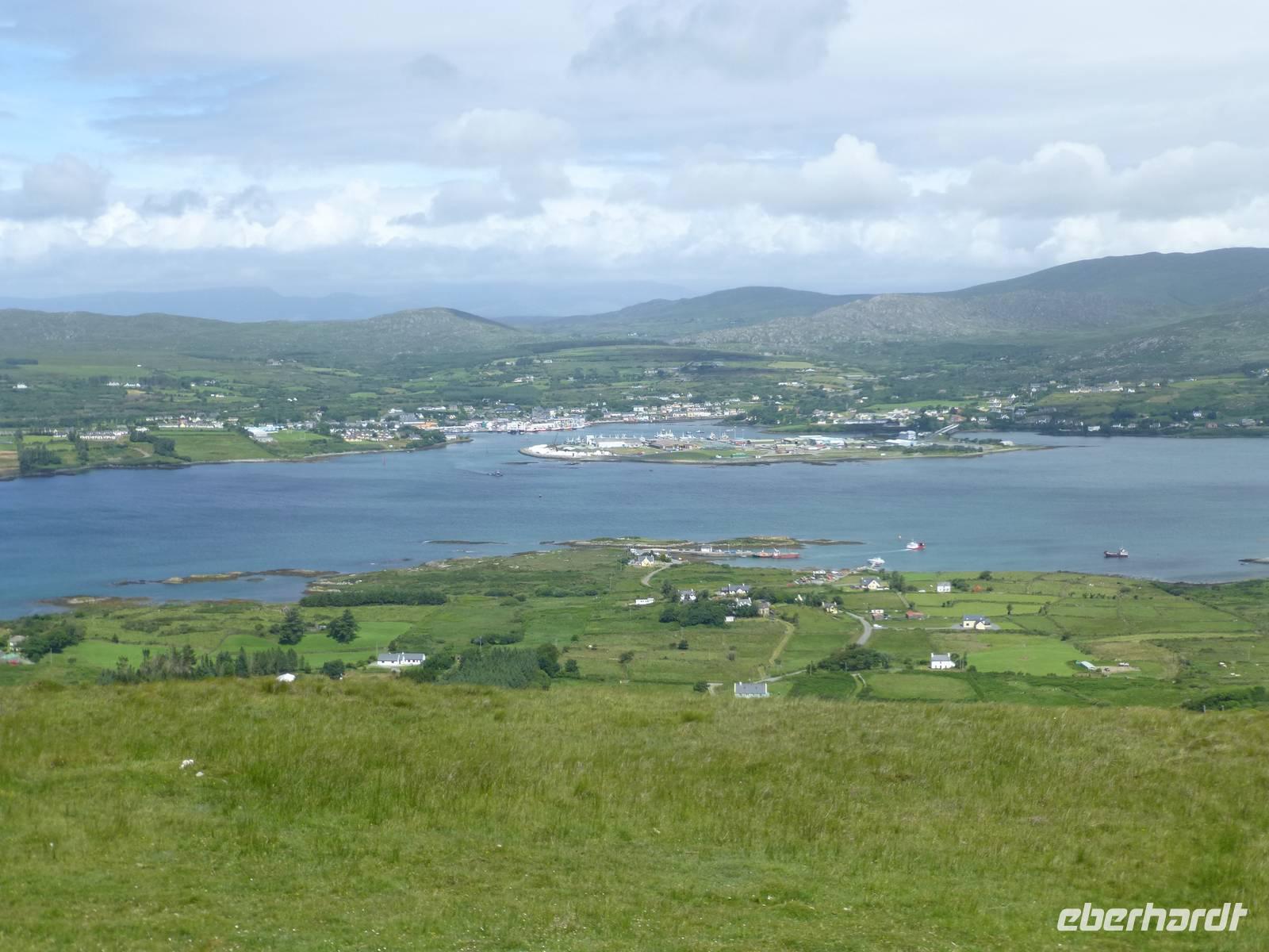 Unser Weg führt uns heute noch einmal nach Castletownbere, einem Ort mit natürlichem Tiefseehafen und der irischen Fischereischule. Nach der kurzen Überfahrt mit Bere Island Ferrys beginnen wir unsere Wanderung. Unterwegs begegnen wir alten Geschützstellungen der britischen Armee, dieses hatte bis 1936 Schiffe der Royal Navy hier in einem Vertragshafen stationiert. Über einen alten Fahrweg erreichen wir an der Westspitze von Bere Island den Ardnakinna Leuchtturm, welcher seit 1965 in Betrieb ist. Von jetzt an weht uns meist auch eine steife Brise ins Gesicht, wir werden mit reichlich Sauerstoff versorgt. Bergan, ab und zu durch feuchte Stellen geht es bis zum ehemaligen Signalturm, welcher 1964 bei einem Sturm einstürzte. Die Aussicht ist fantastisch, die Sonne lacht obwohl einige dicke Wolkenfelder über uns hinweg ziehen. Wir nutzen diesen Platz für unsere Mittagspause. Paul, der heute mit uns wanderte ist froh, dass hier eine Pause ist. Wir gehen bergab, erreichen später einen Fahrweg und steigen hinauf zum weithin sichtbaren Kreuz, welches im Heiligen Jahr 1950 von den Bewohnern Bere Islands aufgestellt wurde. Nach dem Abstieg sehen wir noch einen "Standing Stone" aus vergangener Zeit und laufen dann auf der Straße wieder zur Fähre zurück. Zurück in Castletownbere besuchen wir noch Mac Cartys's Bar. Dieser Pub ist durch das gleichnamige Buch bekannt geworden. Im inneren fühlt man sich zurückversetzt in vergangene Zeiten, kann man doch hier auch noch Waschmittel, Kekse und reichlich andere Dinge kaufen und natürlich gibt es auch Irish Coffee. Und so lassen wir uns eben diesen nach der Wanderung gut schmecken. Anschlißend fahren wir nach Killarney zum Oaks Hotel.