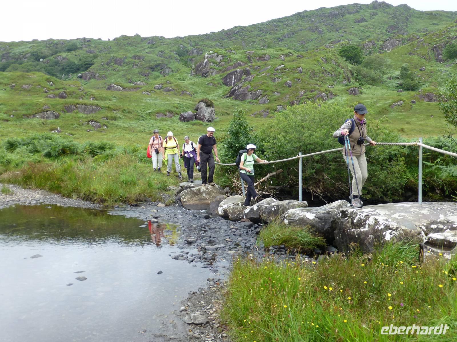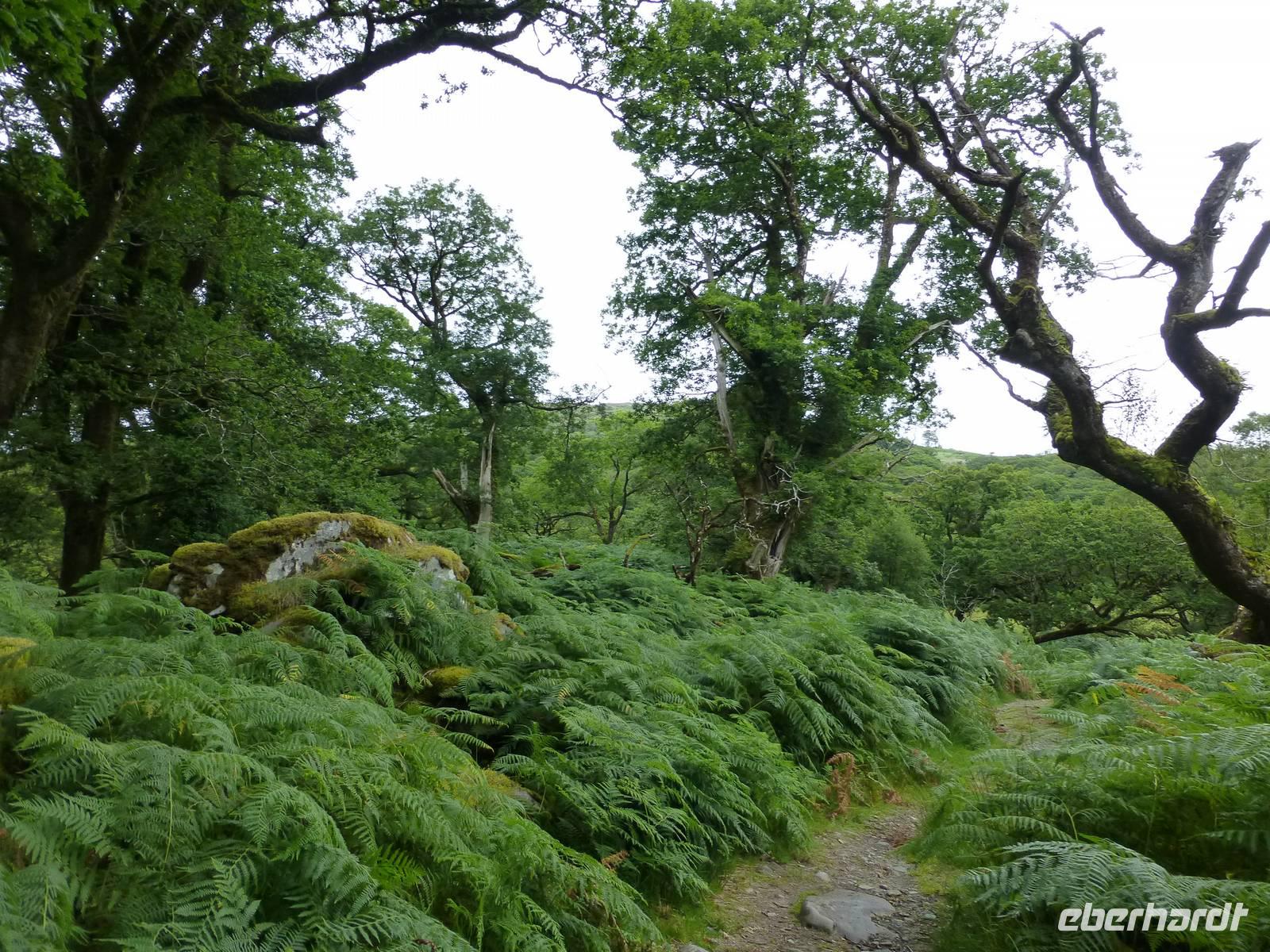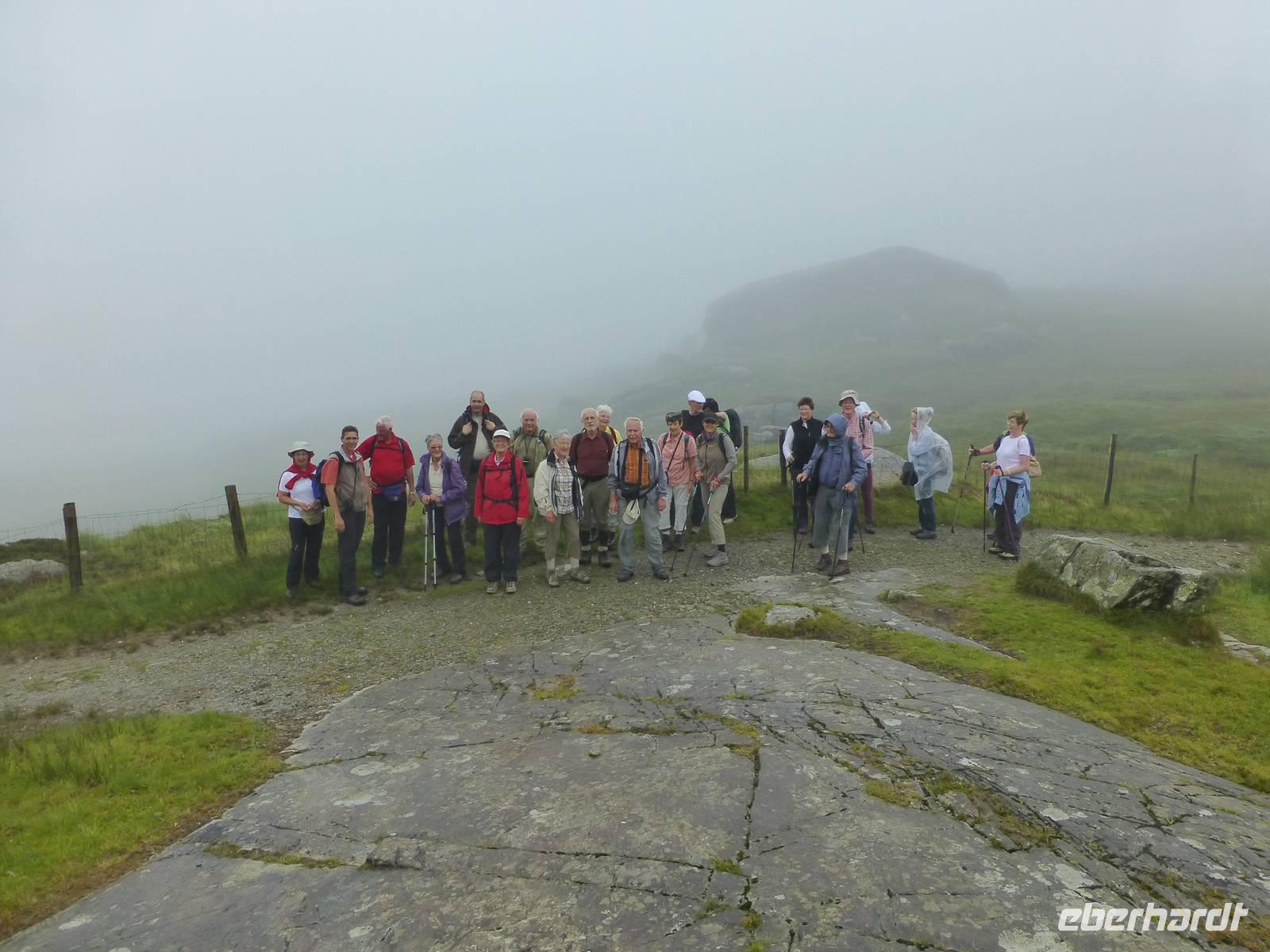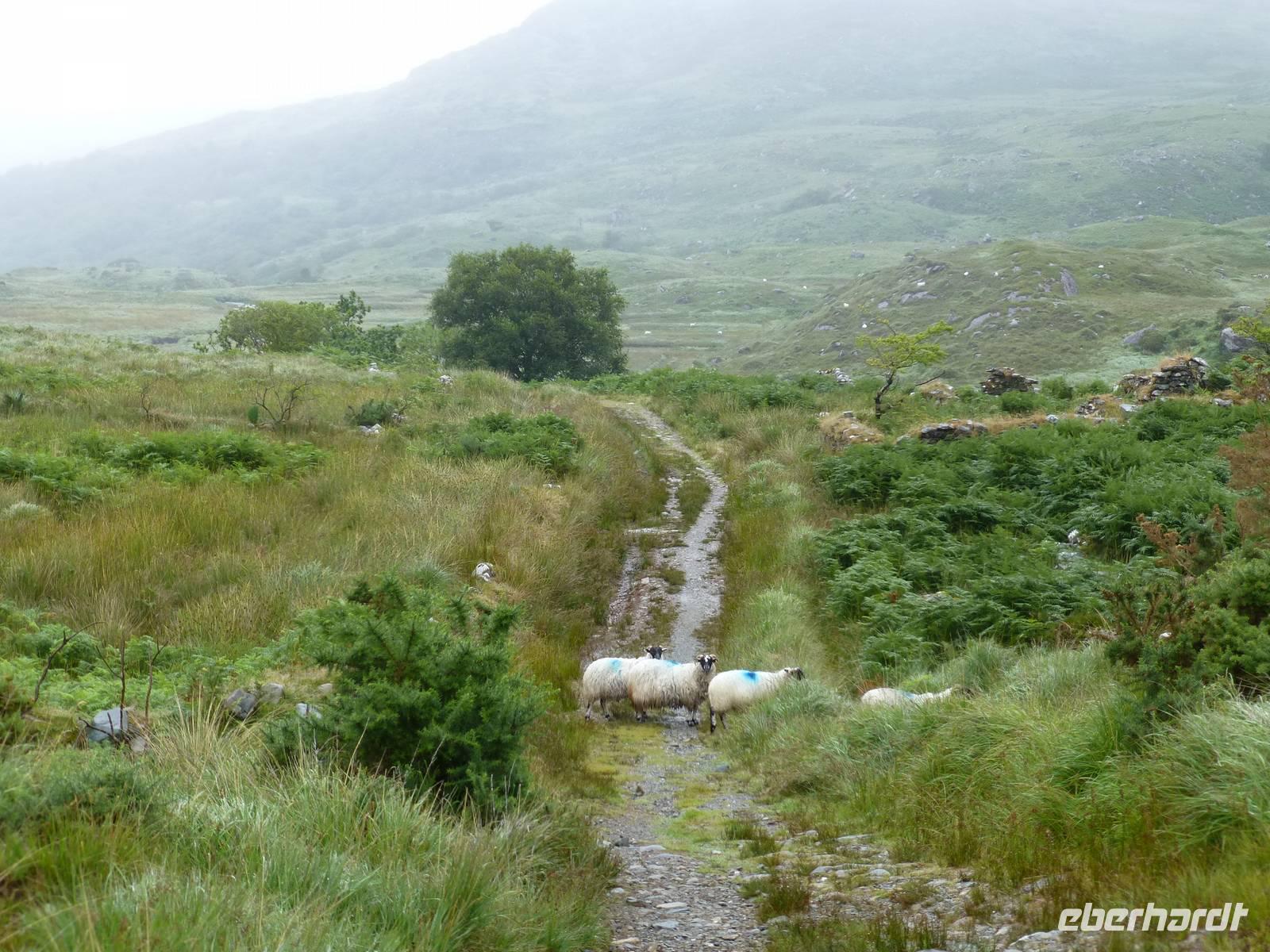 Am Morgen fahren wir von Killarney nach Kenmare. Dort steigt noch Jan zu, der als zweiter Wanderreiseleiter die Gruppe am Schluss absichert. Etwas außerhalb des Ortes beginnt unsere Wanderung auf der Old Kenmare Road. Diese Straße war in früheren Zeiten die Verbindung zwischen Kenmare und Killarney. Zuerst steigt der Weg an und nach erreichen eines kleinen Passes weitet sich normalerweise der Blick in das vor uns liegende Tal. Nicht so am heutigen Tag, denn Nebel versperrt uns die Sicht. Bei wechselnder Bewölkung und manchmal ein paar Tropfen vom Himmel erreichen wir den Killarney Nationalpark. Jetzt ändert sich das Landschaftsbild, die schroffe Landschaft weicht und wir laufen in einen grünen alten Eichenwald hinein mit einer Vielzahl an mit Moos bedeckten Steinen. Es entsteht der Eindruck als befänden wir uns in einem Märchenwald, es fehlt eigentlich nur noch die Begegnung mit einem irischen Kobold, einem Leprechaun. Im weiteren Verlauf des Weges wird die Landschaft wieder offen, wir laufen zum Teil über Bohlenwege, da vielfach morastiges Gebiet vorhanden ist, aber auch über steiniges Gelände, welches die ganze Aufmerksamkeit beim erfordert. Ein kleiner Wasserfall lädt zu einer Pause ein, bevor wir den letzten Teil des Weges zum Torc Waterfall in Angriff nehmen. Am Wasserfall wartet Tony auf uns. Mit dem Bus fahren wir in den Muckross Park. Nach einem Blick auf Muckross House, das ehemalige Herrenhaus der Familie Herbert mit seinem exzellenten Garten und Landschaftspark ist eine Augenweide, bleibt noch Zeit für einen Kaffee. Einige Gäste fahren dann mit dem Bus und einige laufen mit mir über die Muckross Abbey zu unserem Hotel.