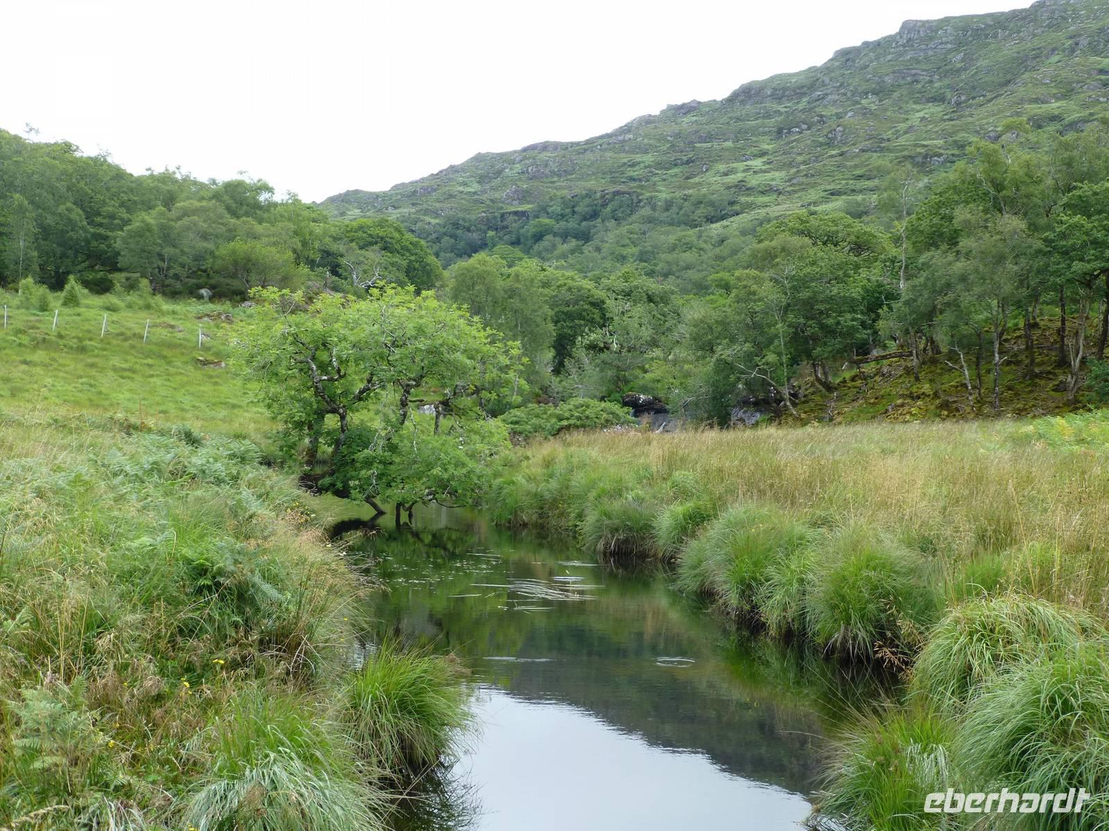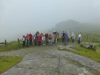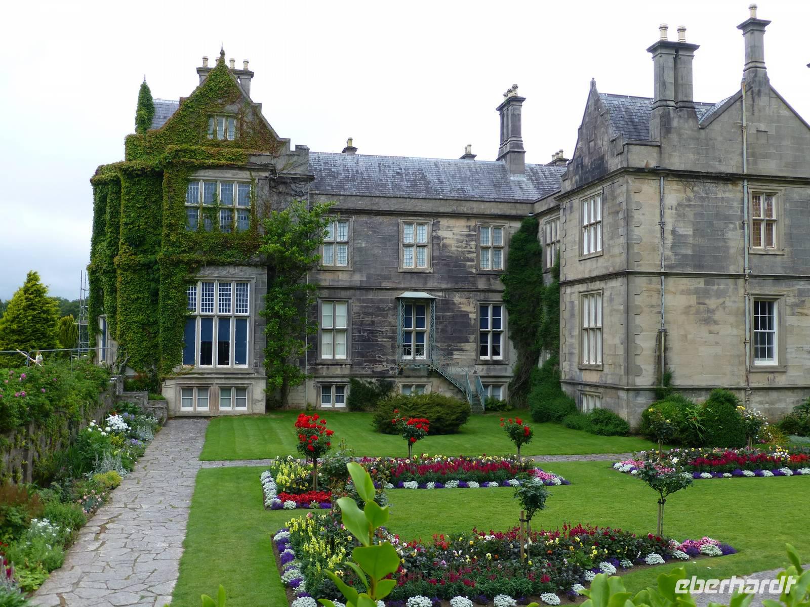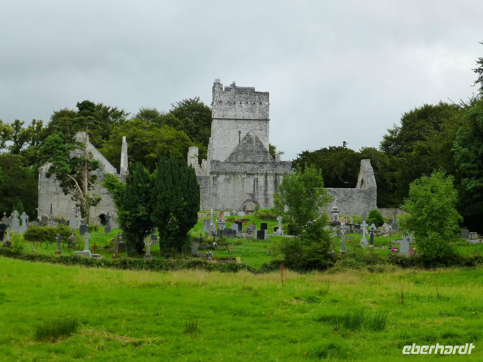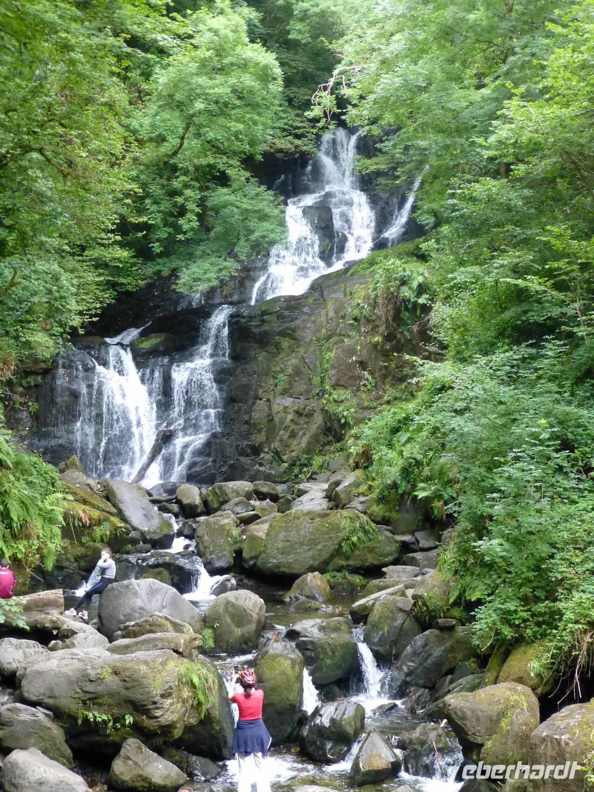 Am Morgen fahren wir von Killarney nach Kenmare. Dort steigt noch Jan zu, der als zweiter Wanderreiseleiter die Gruppe am Schluss absichert. Etwas außerhalb des Ortes beginnt unsere Wanderung auf der Old Kenmare Road. Diese Straße war in früheren Zeiten die Verbindung zwischen Kenmare und Killarney. Zuerst steigt der Weg an und nach erreichen eines kleinen Passes weitet sich normalerweise der Blick in das vor uns liegende Tal. Nicht so am heutigen Tag, denn Nebel versperrt uns die Sicht. Bei wechselnder Bewölkung und manchmal ein paar Tropfen vom Himmel erreichen wir den Killarney Nationalpark. Jetzt ändert sich das Landschaftsbild, die schroffe Landschaft weicht und wir laufen in einen grünen alten Eichenwald hinein mit einer Vielzahl an mit Moos bedeckten Steinen. Es entsteht der Eindruck als befänden wir uns in einem Märchenwald, es fehlt eigentlich nur noch die Begegnung mit einem irischen Kobold, einem Leprechaun. Im weiteren Verlauf des Weges wird die Landschaft wieder offen, wir laufen zum Teil über Bohlenwege, da vielfach morastiges Gebiet vorhanden ist, aber auch über steiniges Gelände, welches die ganze Aufmerksamkeit beim erfordert. Ein kleiner Wasserfall lädt zu einer Pause ein, bevor wir den letzten Teil des Weges zum Torc Waterfall in Angriff nehmen. Am Wasserfall wartet Tony auf uns. Mit dem Bus fahren wir in den Muckross Park. Nach einem Blick auf Muckross House, das ehemalige Herrenhaus der Familie Herbert mit seinem exzellenten Garten und Landschaftspark ist eine Augenweide, bleibt noch Zeit für einen Kaffee. Einige Gäste fahren dann mit dem Bus und einige laufen mit mir über die Muckross Abbey zu unserem Hotel.
