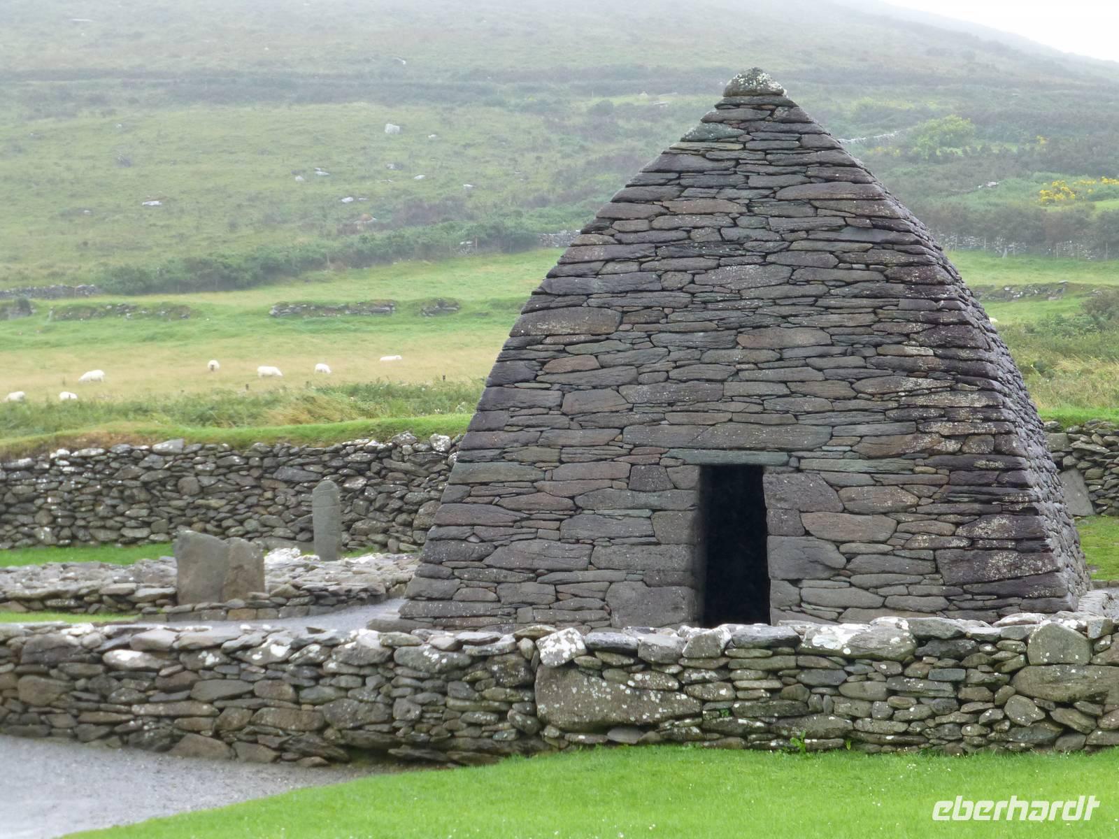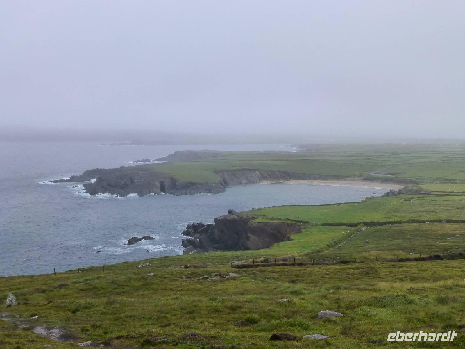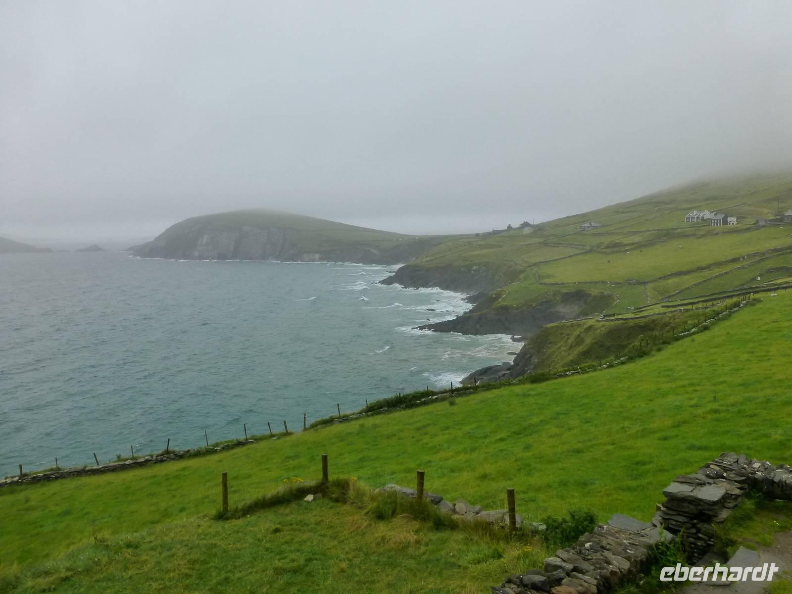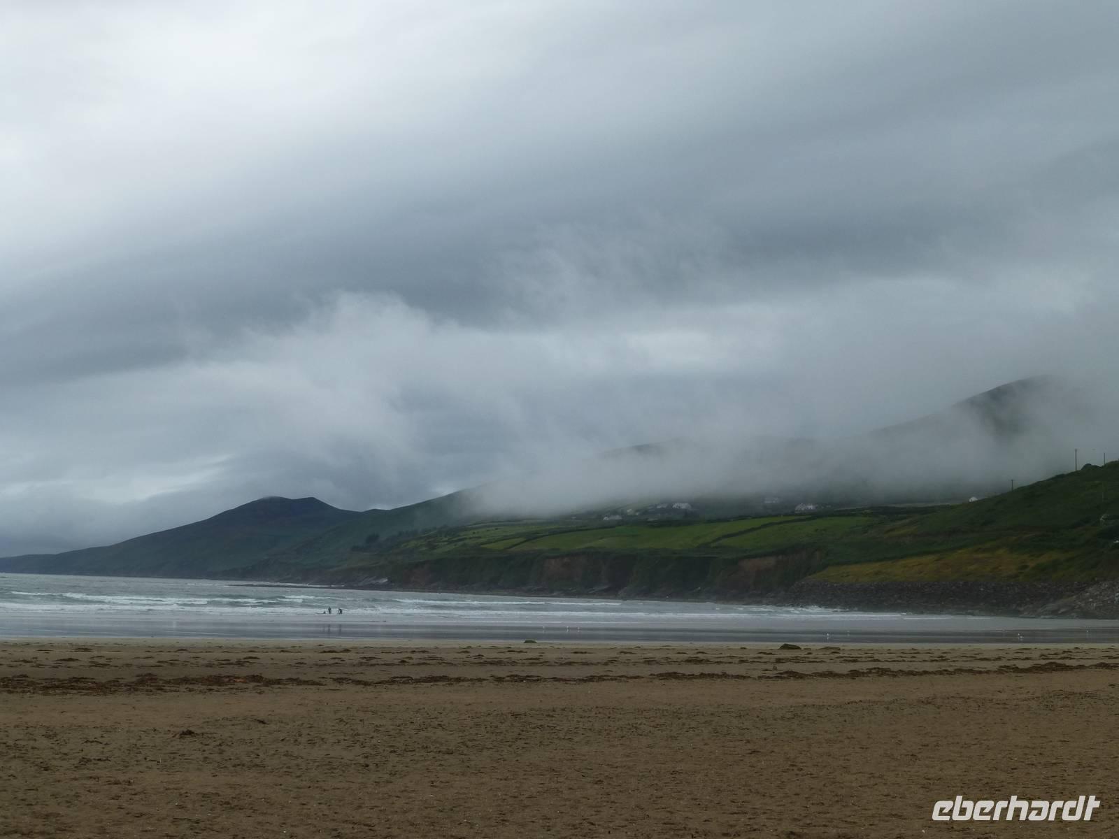 Nach dem Frühstück und der Verteilung der Lunchpakete machen wir uns auf den Weg. Das Wetter zeigt sich von seiner schlechtesten Seite, ein dickes Regengebiet zieht über die irische Insel hinweg. Vorbei an Dingle erreichen wir Ventry Harbour. An Paddie O'Shea's Pub beginnt unser Wanderung.Es gießt in strömen und guter Rat ist teuer. Und das heutige Wetter kann sogar einen Reisleiter zum verzweifeln bringen. Dennoch beweist ein großer Teil der Gruppe den Mut zu einer kleinen Tour entlang von Ventry Harbour. Der Wind peitscht das Wasser in unsere Gesichter und lässt die Regencapes fliegen. Auf einmal endet der Regen und lässt hoffen, der Wind und die milden Temperaturen lassen uns schon wieder trocknen. Zuerst entlang des Strandes laufen wir später durch eine kleine Siedlung und zwischen Weideflächen entlang. Zurück an der Hauptstraße erwartet uns Tony mit dem Bus und schon beginnt wieder der Regen. Weiter fahren wir mit dem Bus zum Slea Head und machen dann eine Mittagspause im Blasket Center. Hier können wir uns auch einen Film über das Leben und die Menschen auf den Blasket Islands ansehen, welche der Dingle Halbinsel vorgelagert sind. Bis 1953 waren die Inseln bewohnt. Einen weiteren Halt legen wir noch beim Galarus Oratory ein. Bei diesem Gebäude handelt es sich um ein frühchristliches Gebetshaus, welches in perfekter Trockensteinbauweise vor ca. 1300 Jahren errichtet wurde. Nach einem kurzen Stopp in Dingle fahren wir wieder Richtung Killarney. Jetzt am Späten Nachmittag beruhigt sich das Wetter und es zieht auf. So können wir noch einen Stopp an Inch Beach machen. Mit reichlich nassen Schuhen und Sachen erreichen wir am Abend wieder unser Hotel und genießen hier das Abendessen.