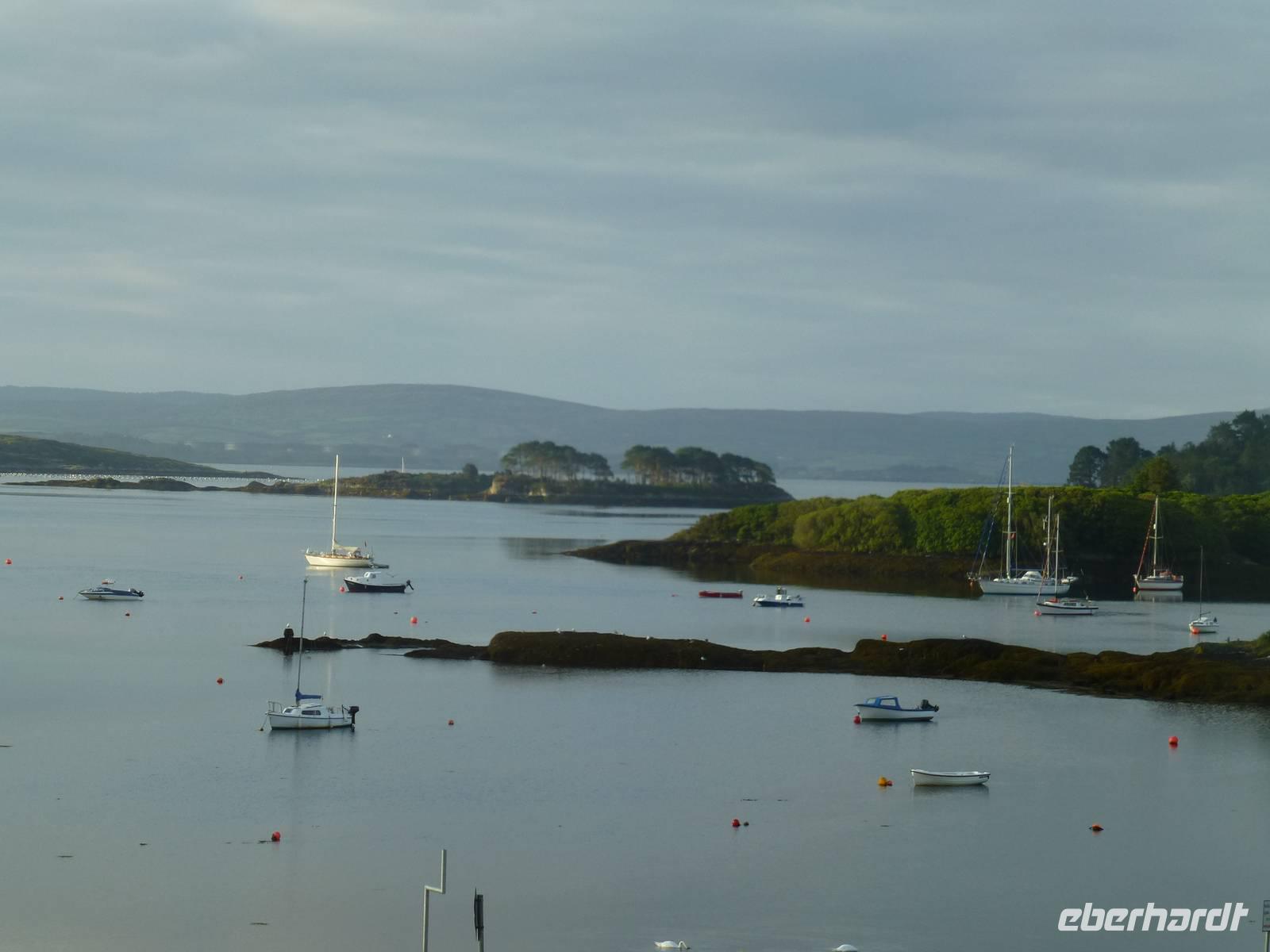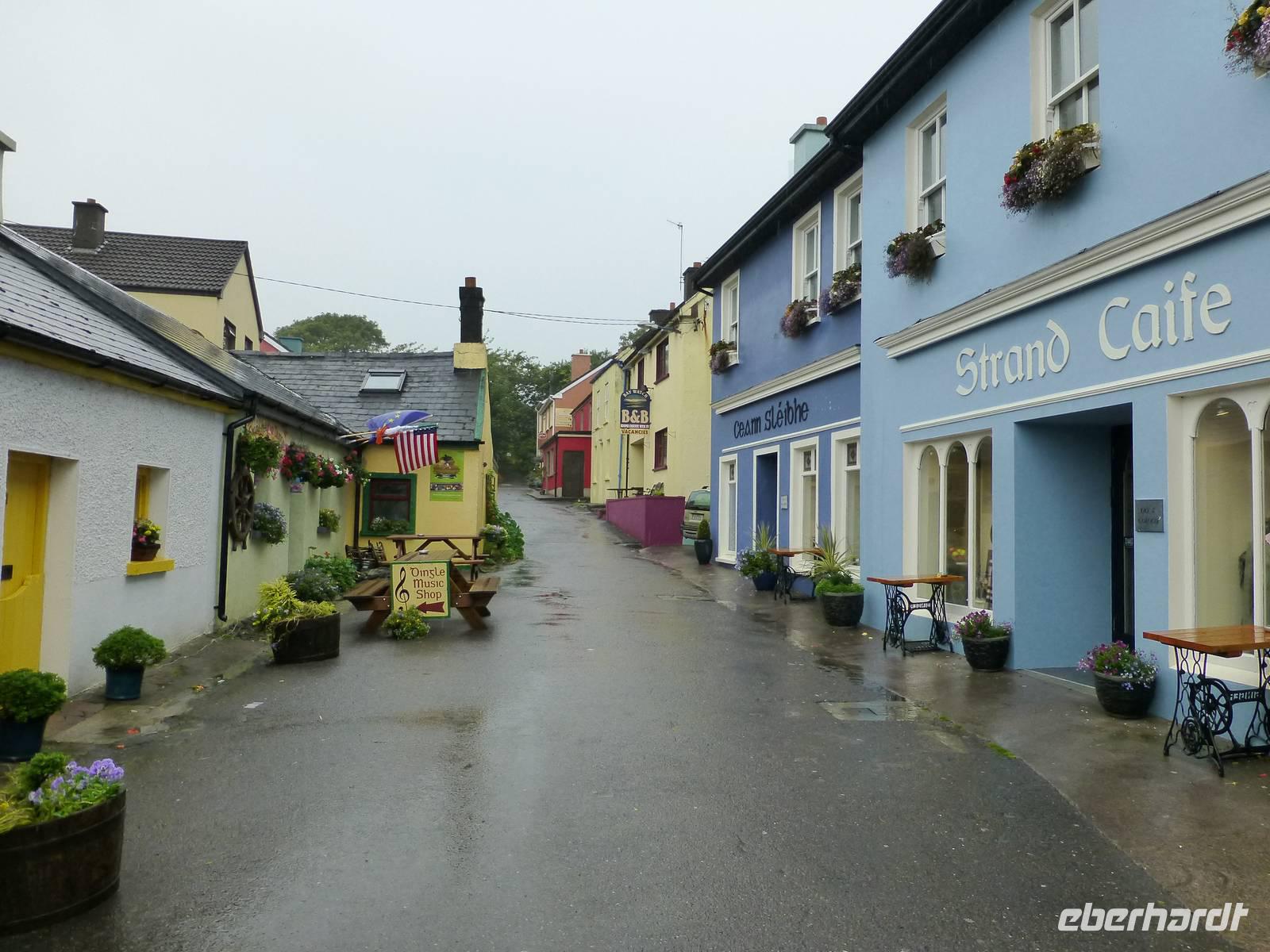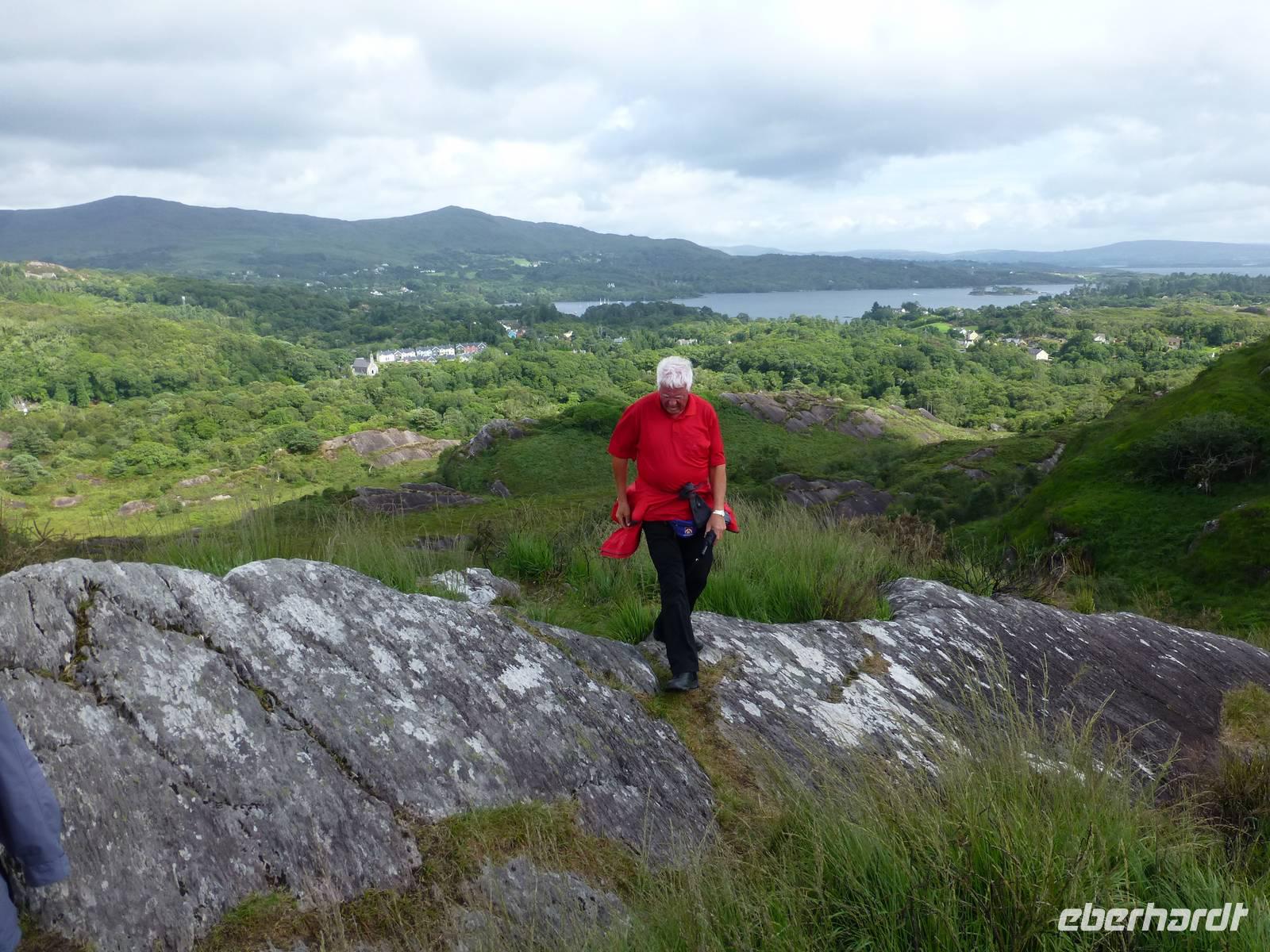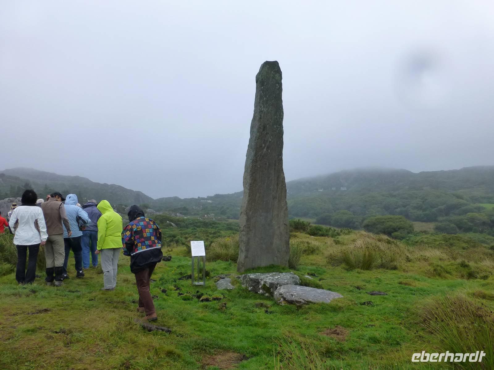 Heute bleiben die Wanderschuhe im Koffer. Wir holen heute unseren wanderfreien Tag nach. Das Wetter ist wie vorausgesagt regnerisch. Am Steuer unseres Busses sitzt heute Georg, Tony hat seinen freien Tag und genießt diesen bei einer Runde Golf in Glengariff. Über Castletownbere fahren wir nach Eyries und weiter zum Ballycrovan Ogham Stone. Dieser alte „Schriftstein" ist mit einer Höhe von 5,30 m der höchste Irlands. Der Regen hat inzwischen nachgelassen. Weiter fahren wir nach Kenmare. Das von William Petty, 1. Marquis of Lansdowne, angelegte Landstädtchen mit seinen bunten Häuser weist ein reges Treiben auf. Es lohnt sich hier ein Bummel durch die zahlreichen Geschäfte und zum Mittag probieren einige aus unserer Gruppe "Irish Stew", einen typisch irischen Lammeintopf mit Kartoffeln und Gemüse. Etwas stiller ist es abseits der Hauptstraße. Mit der Besichtigung des Steinkreises von Kenmare gehen wir in der Geschichte ca. 2500 Jahre zurück. Mit seinen 15 Steinen und dem mittigen Boulder Thomb ist es der größte Steinkreis in Südwestirland. Inzwischen lugt auch die Sonne heraus und blauer Himmel zeigt sich. Wir fahren weiter zum Healey Pass, benannt nach dem ersten Generalgouverneur Irland. Gleichzeiig ist hier die Grenze zwischen dem County Kerry und Cork. So haben wir nach beiden Seiten einen wunderbaren Ausblick, wenn auch bei stürmischem Wind. Zum Abschluss des Tages machen wir noch einem Spaziergang auf „Lady Bantrys Lookout" im Glengariff Wood. Hier öffnet sich ein wunderbarer Blick über die Bucht von Glengariff und Bantry. Am Nachmittag bleibt dann noch ausreichend Zeit für einen Bummel durch Glengariff.