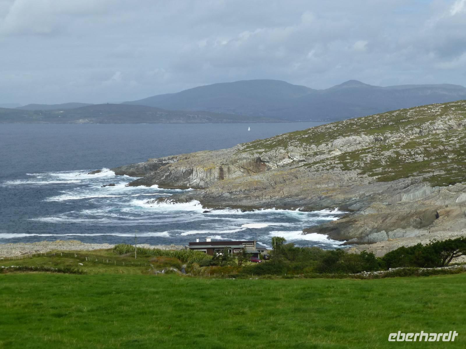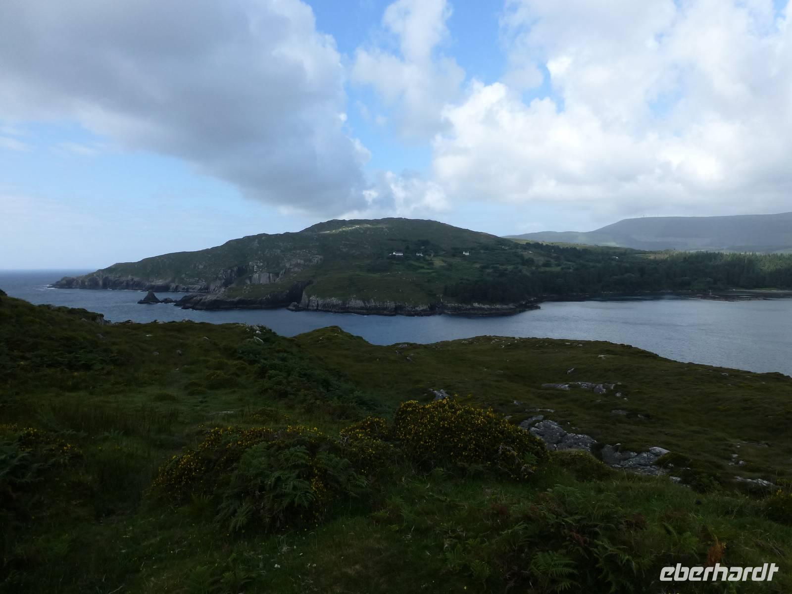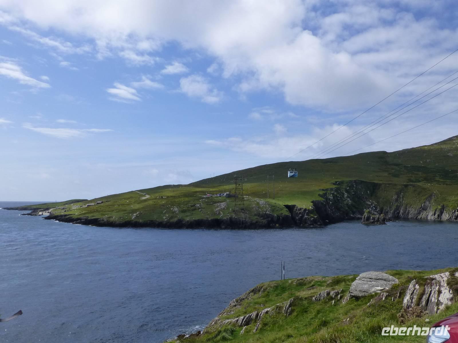 Der Wetterbericht am Abend hatte für heute gutes Wetter voraus gesagt und bereits am Morgen zeigt sich die Sonne. So reift sehr schnell der Plan heute wandern zu gehen und den wanderfreien Tag zu verlegen. Eine kurze Rücksprache mit der Gruppe, mit Jan und mit Tony und schon ist alles klar. Jan organisiert in Kenmare die Möglichkeit für Lunch und dann fahren wir über Glengariff und Castletownbere zur Dursey Cable Car Station. Unterwegs genießen wir die tollen Ausblicke in die Landschaft, so hätten wir uns das gestern auch gewünscht. Die Station der Dursey Cable Car liegt ganz im Westen der Beara Halbinsel. 1969, als erste und einzige Seilbahn Irlands, erbaut befördert sie in erster Linie Tiere auf oder von der 400 m entfernt liegenden Insel. Als wir ankommen ist die Bahn auch gerade in Betrieb. Wir machen uns auf den Weg, es geht bergan, wir folgen immer den gelben Wegmarkierungen. Vom höchsten Punkt des ersten Teilabschnittes, 151 m ü.N.N., öffnet sich der Blick zurück auf Dursey Island bzw. vorraus auf Garinish Pier. Dort machen wir unsere Mittagspause mit den "Homemade Sandwiches" und ganz leckeren Gurken aus Jan Garten. Unser Weg wird immer wieder von vielen Blumen gesäumt, z.B. Monbretien, Fuchsien, Mädesüß und Gewöhnlichem Blutwegerich. Glücklich und zufrieden heute das Programm auf den Kopf gestellt zu haben fahren wir wieder über Castletownbere nach Glengariff zum Eccles Hotel, welches für die nächsten vier Nächte unsere Bleibe ist.
