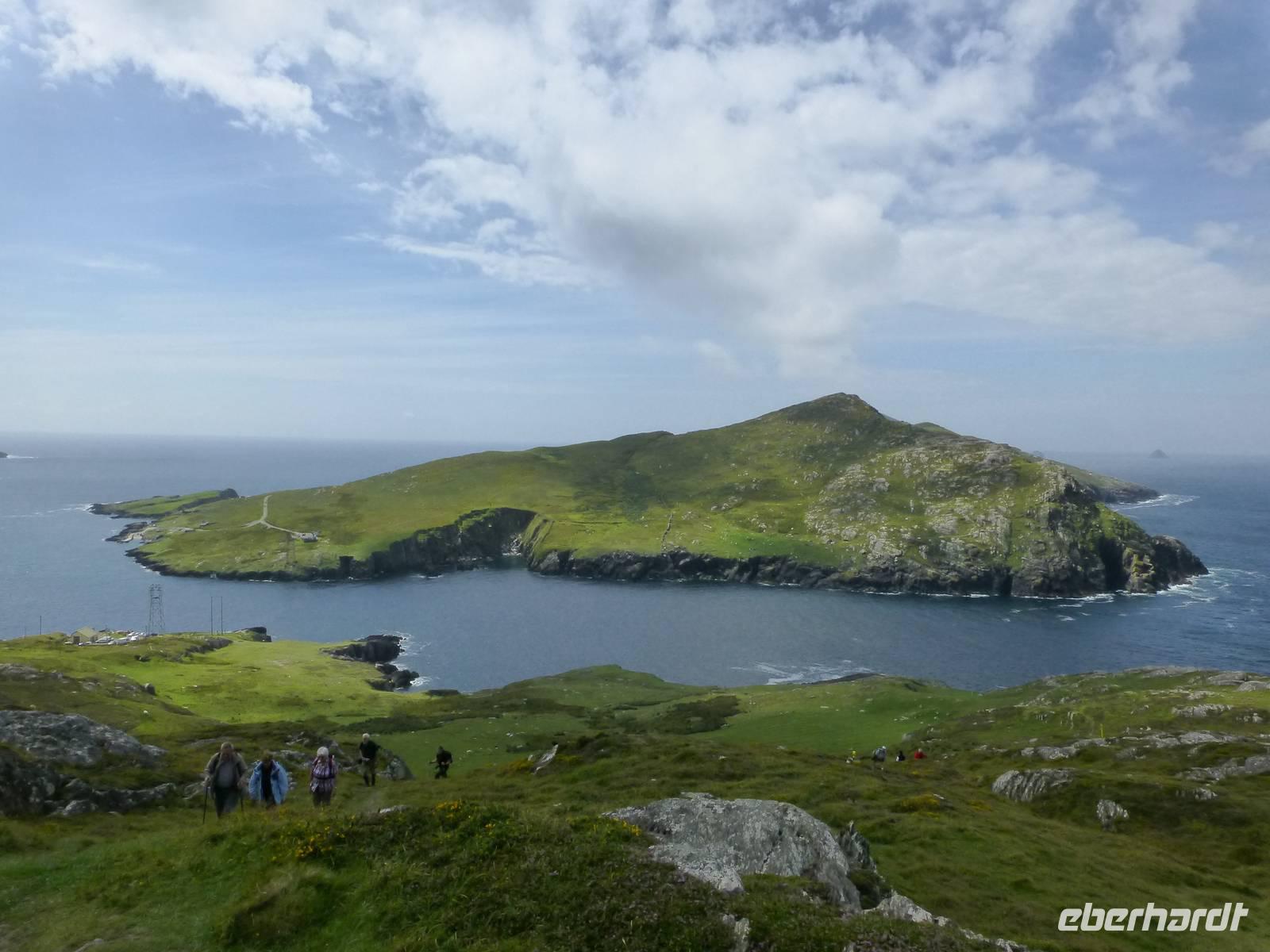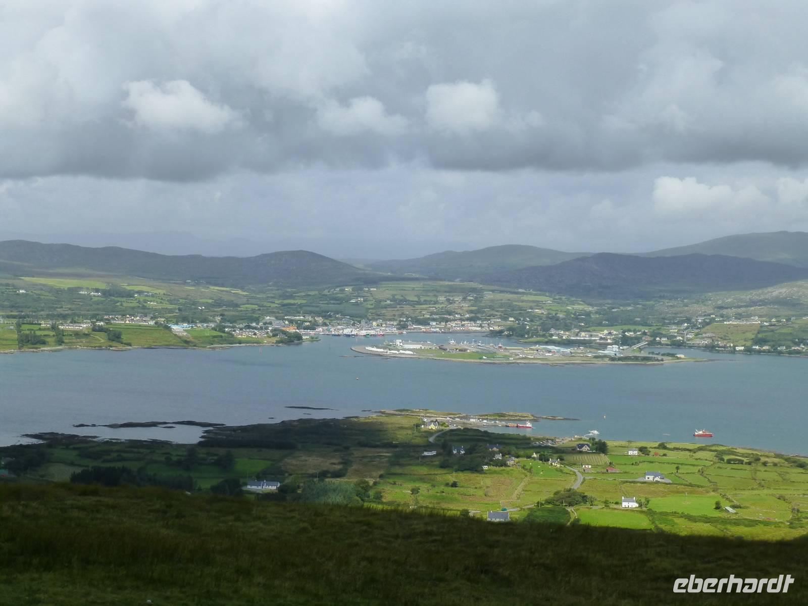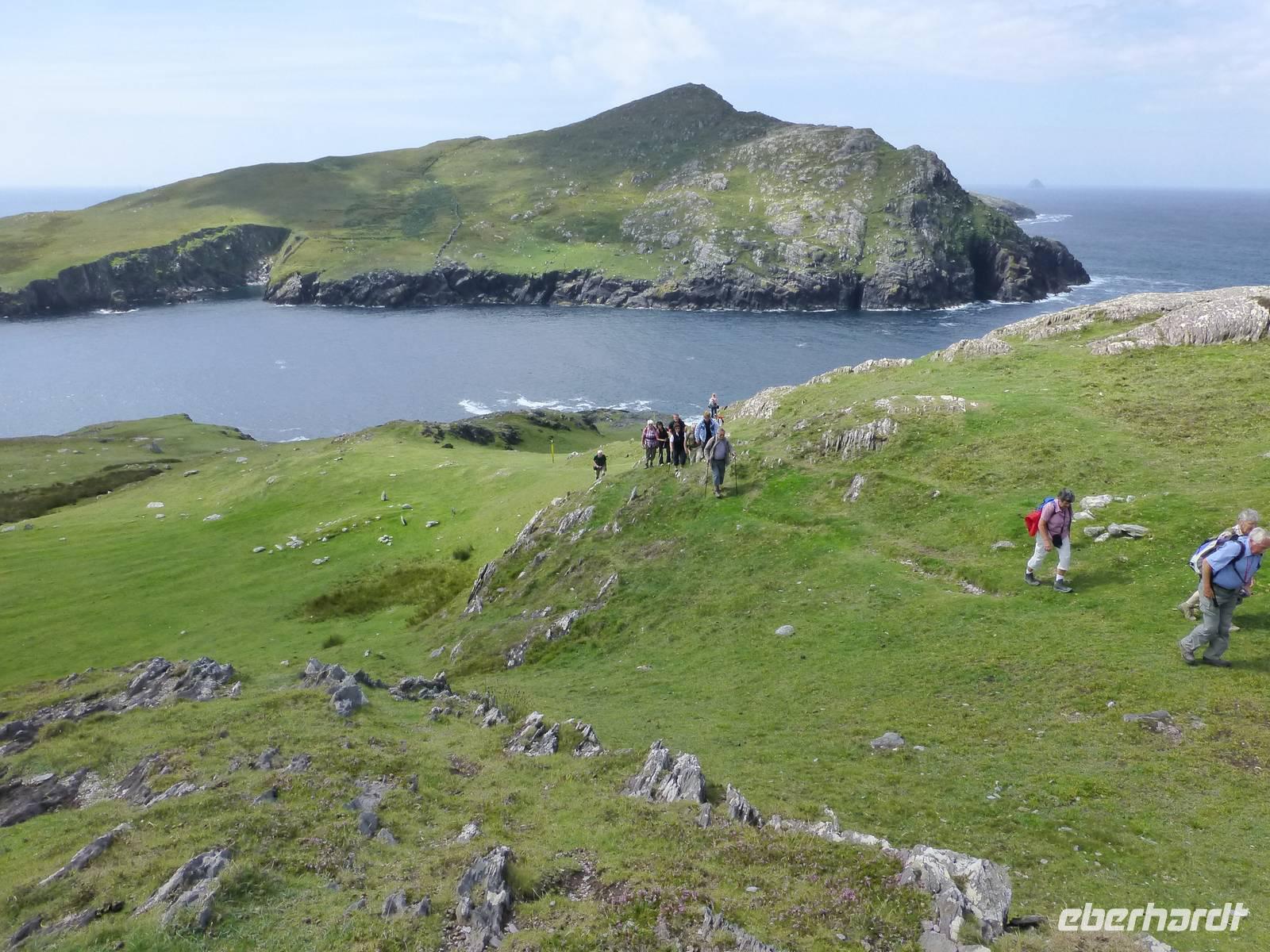 Bereits am Morgen zeichnet sich ab, das es ein Tag mit irischem Bilderbuchwetter wird. Unser Weg führt uns noch einmal nach Castletownbere, einem Ort mit natürlichem Tiefseehafen und der irischen Fischereischule. Nach einer kurzen Überfahrt nach Beare Island beginnen wir unsere Wanderung. Unterwegs begegnen wir alten Batteriestellungen der britischen Armee, diese hatte bis 1938 Schiffe der Royal Navy hier in einem Vertragshafen stationiert. Über einen alten Fahrweg erreichen wir an der Westspitze von Beare Island den Arnakinna Leuchtturm, welcher seit 1965 in Betrieb ist. Bergan geht es bis zum ehemaligen Signalturm welcher 1964 bei einem Sturm einstürzte. Die Aussicht ist nach allen Seiten fantastisch. Hier oben mache wir auch unsere Mittagspause. Wir gehen bergab, erreichen später einen Fahrweg, und steigen hinauf zum weithin sichtbaren Kreuz, welches im heiligen Jahr 1950 von den Bewohnern Beare Islands aufgestellt wurde. Nach dem Abstieg sehen wir noch einen "Standing Stone" aus vergangener Zeit, welcher die Mitte der Insel markiert und laufen dann auf der Straße wieder zur Fähre zurück. Zurück in Castletownbere besuchen wir noch Mac Cartys's Bar. Dieser Pub ist durch das Buch „McCarthy's Bar" von Pete McCarthy bekannt geworden. Im inneren fühlt man sich zurückversetzt in vergangene Zeiten, kann man doch hier auch noch Waschmittel, Kekse und reichlich andere Sachen kaufen und natürlich gibt es auch ein Pint Guinnes oder einen Kaffee. Und wir lassen es uns natürlich schmecken, bevor wir zurück zum Hotel nach Glengariff fahren.