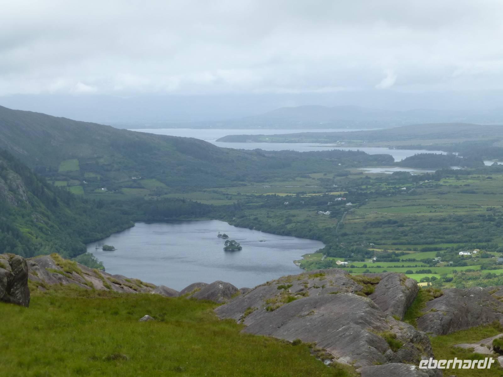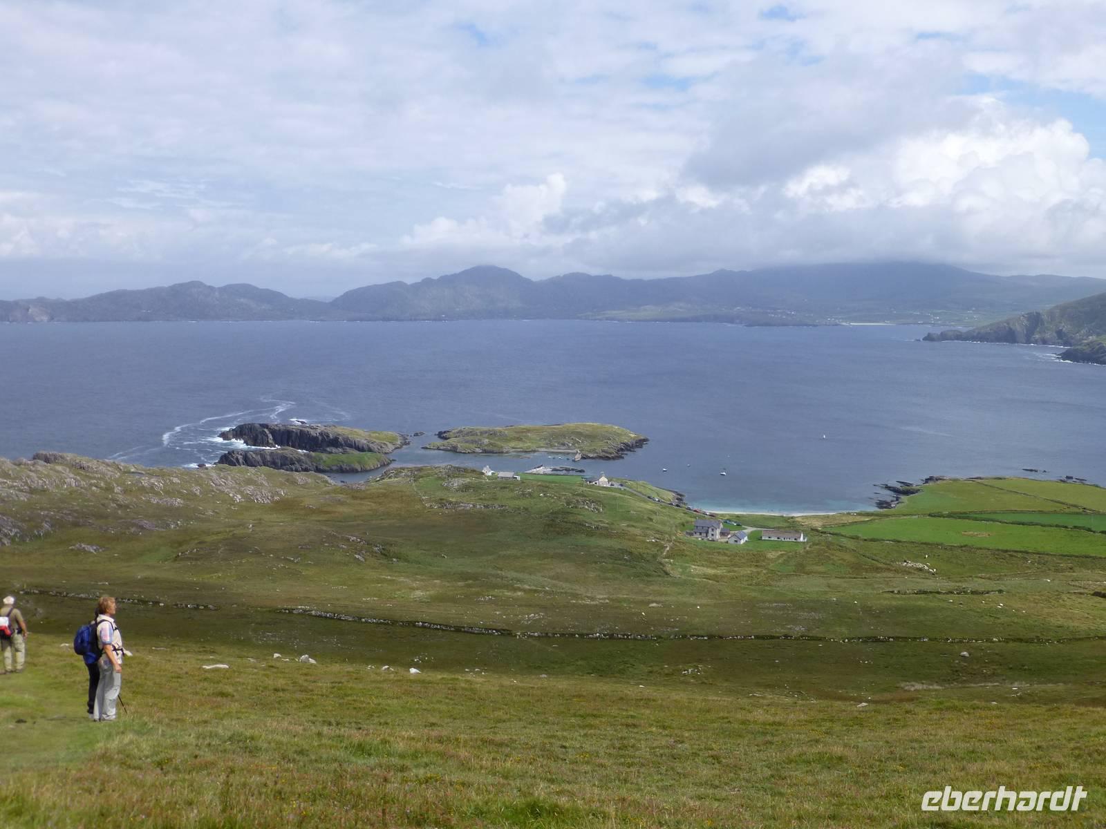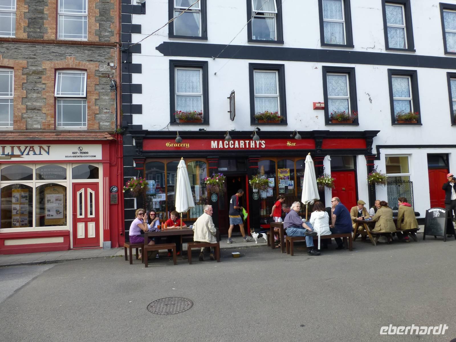 Bereits am Morgen zeichnet sich ab, das es ein Tag mit irischem Bilderbuchwetter wird. Unser Weg führt uns noch einmal nach Castletownbere, einem Ort mit natürlichem Tiefseehafen und der irischen Fischereischule. Nach einer kurzen Überfahrt nach Beare Island beginnen wir unsere Wanderung. Unterwegs begegnen wir alten Batteriestellungen der britischen Armee, diese hatte bis 1938 Schiffe der Royal Navy hier in einem Vertragshafen stationiert. Über einen alten Fahrweg erreichen wir an der Westspitze von Beare Island den Arnakinna Leuchtturm, welcher seit 1965 in Betrieb ist. Bergan geht es bis zum ehemaligen Signalturm welcher 1964 bei einem Sturm einstürzte. Die Aussicht ist nach allen Seiten fantastisch. Hier oben mache wir auch unsere Mittagspause. Wir gehen bergab, erreichen später einen Fahrweg, und steigen hinauf zum weithin sichtbaren Kreuz, welches im heiligen Jahr 1950 von den Bewohnern Beare Islands aufgestellt wurde. Nach dem Abstieg sehen wir noch einen "Standing Stone" aus vergangener Zeit, welcher die Mitte der Insel markiert und laufen dann auf der Straße wieder zur Fähre zurück. Zurück in Castletownbere besuchen wir noch Mac Cartys's Bar. Dieser Pub ist durch das Buch „McCarthy's Bar" von Pete McCarthy bekannt geworden. Im inneren fühlt man sich zurückversetzt in vergangene Zeiten, kann man doch hier auch noch Waschmittel, Kekse und reichlich andere Sachen kaufen und natürlich gibt es auch ein Pint Guinnes oder einen Kaffee. Und wir lassen es uns natürlich schmecken, bevor wir zurück zum Hotel nach Glengariff fahren.