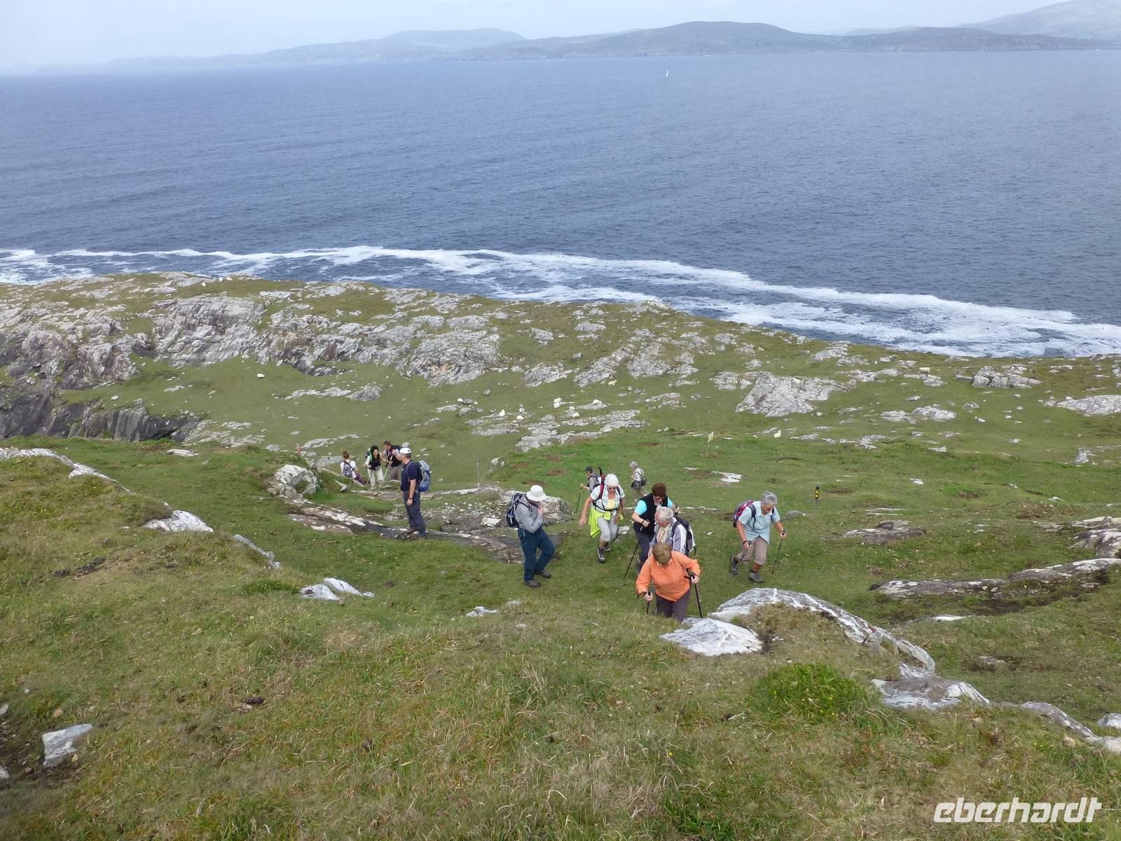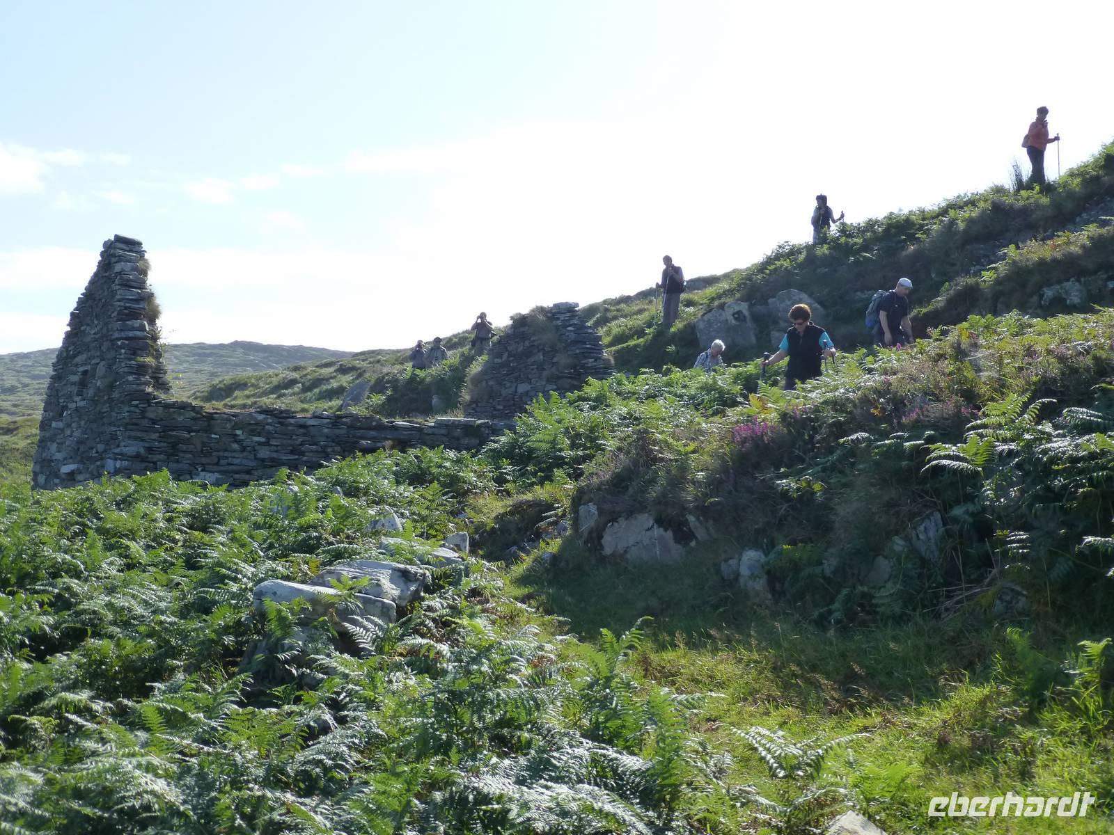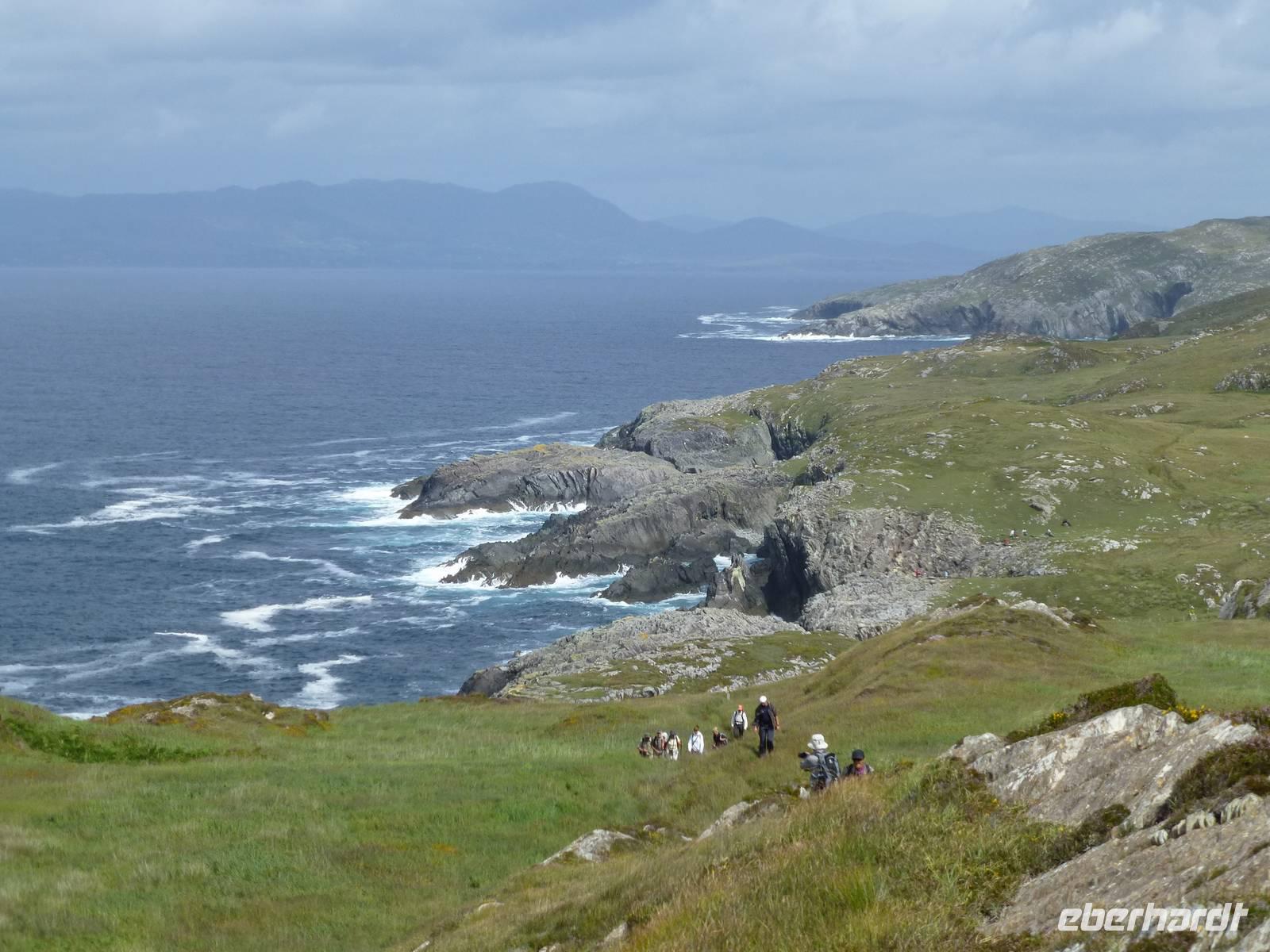 Der Morgen zeigt sich heute leicht bewölkt und die Sonne zeigt sich auch schon. Nach dem Frühstückfahren wir über Bantry auf die Halbinsel mit dem Namen "Schafskopf". Vorbei an Durrus, Ahakista und Kilcrohan erreichen unseren Wanderausgangspunkt Cahergall. Auf unserem Wanderweg passieren wir die Reste des alten Minersvillage, auch hier am Sheeps Head hat man versucht im 19. Jh. Kupfer abzubauen. Mit Blick auf die Bantry Bay führt der Weg entlang einer bezaubernden Klippenlandschaft. Unsere Mittagpause machen wir an einem stillen Plätzchen mit Wasserfall. Der Weg führt uns dann langsam aufwärts, immer mal wieder müssen wir kleine Feuchtwiesen überwinden. Schließlich erreichen wir den 1968 errichteten Leuchtturm ganz im Westen der Sheeps Head Halbinsel. Von Ferne sehen wir auch den Leuchtturm auf Beare Island, an welchem wir am nächsten Tag vorbei wandern werden. Vom Leuchtturm wandern wir nochmals etwas bergan zum Endziel unserer Tour am Parkplatz von Toreen. Hier wartet nicht nur Tony mit dem Bus auf uns sondern auch ein kleines Café mit reichlich Belohnung für die hinter uns liegende Wanderung. Und das Wetter? Es hat den ganzen Tag gehalten, ein Tag so recht zum genießen.