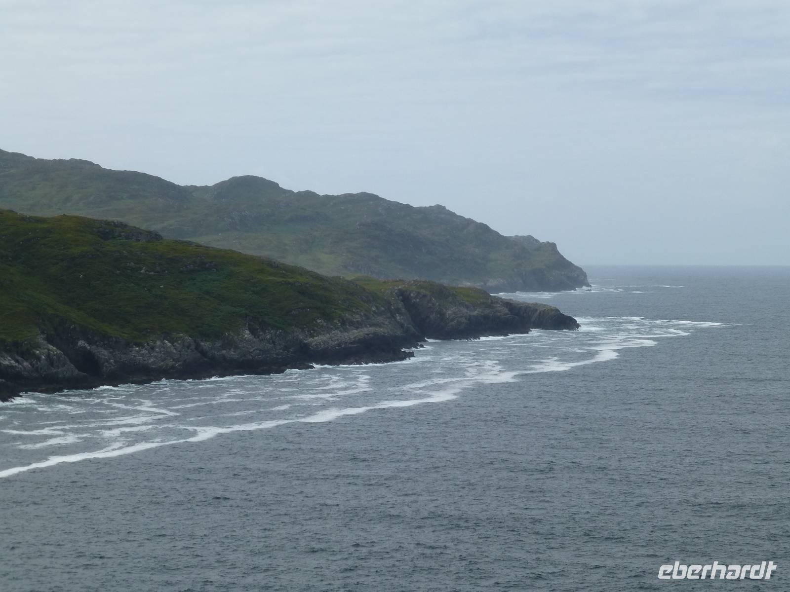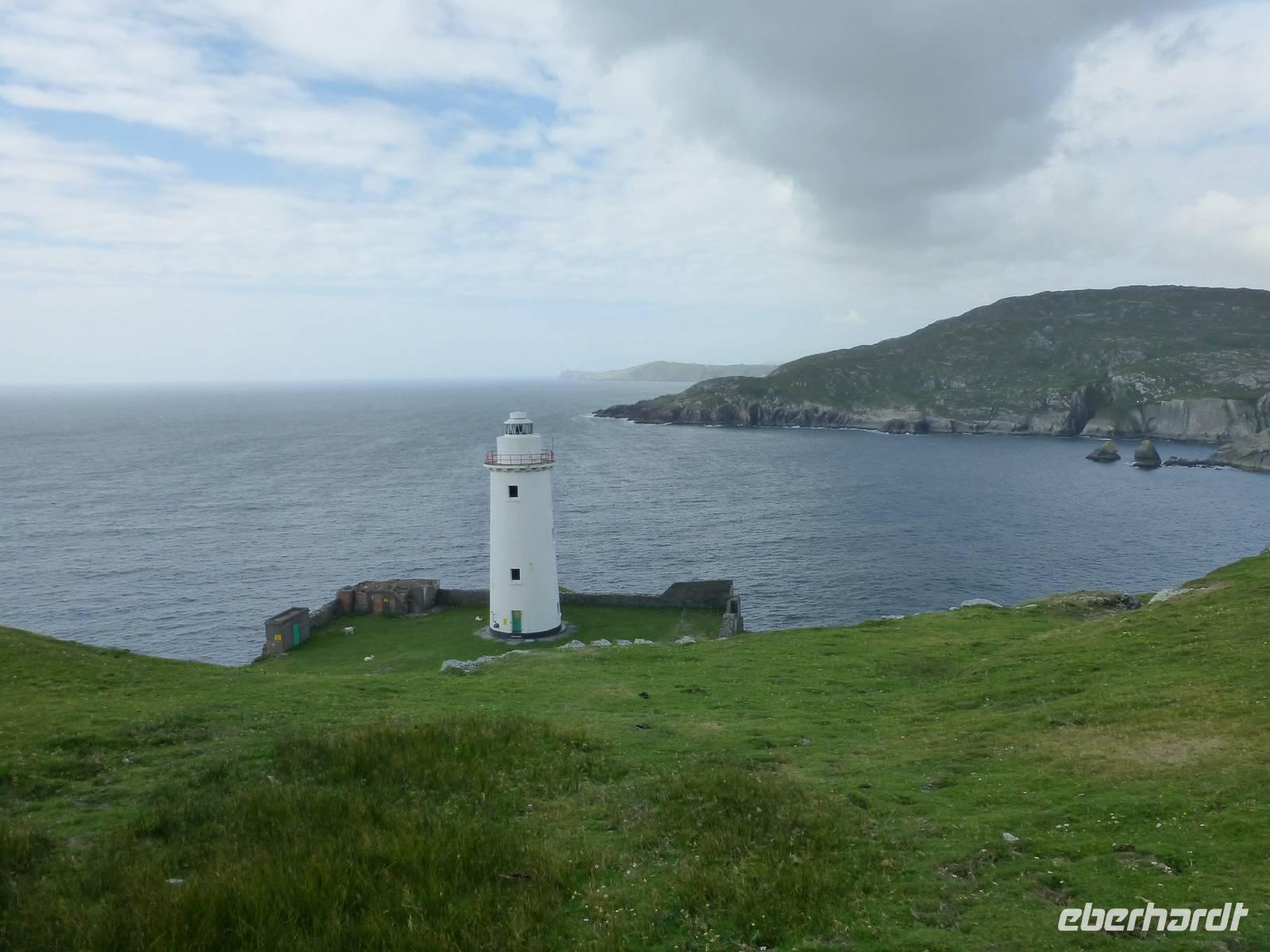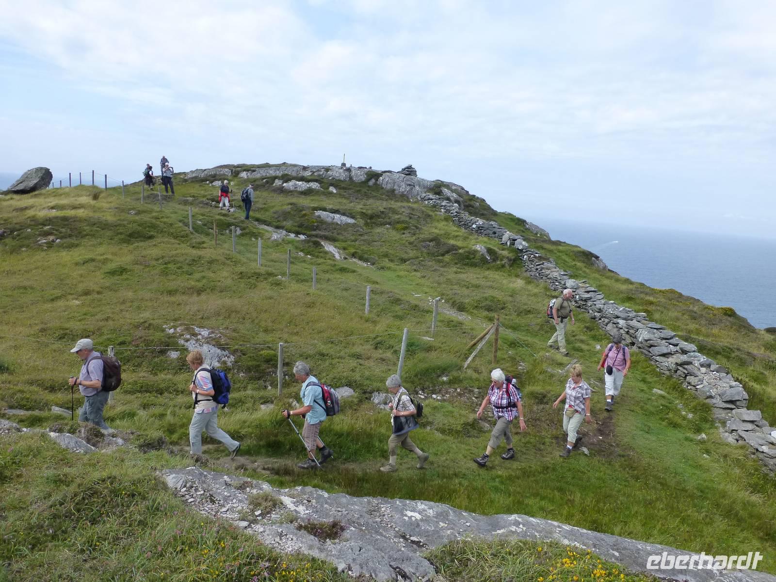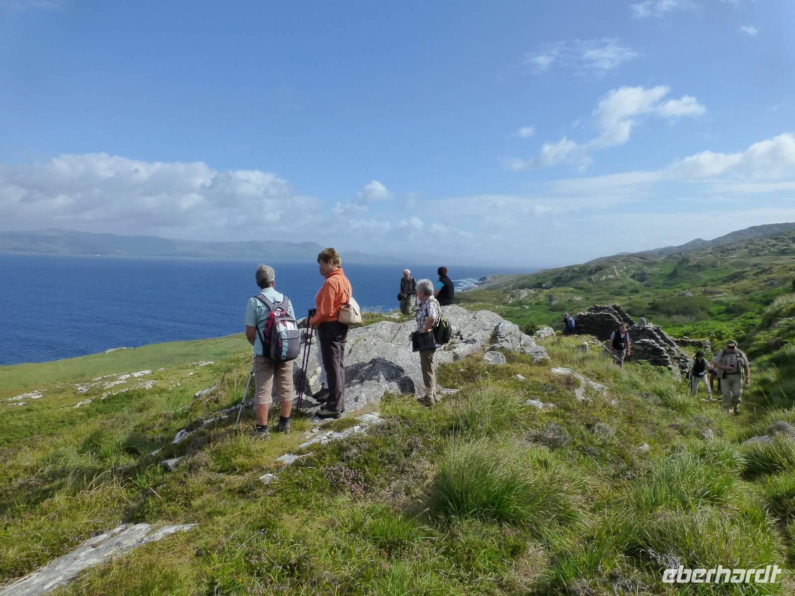 Der Morgen zeigt sich heute leicht bewölkt und die Sonne zeigt sich auch schon. Nach dem Frühstückfahren wir über Bantry auf die Halbinsel mit dem Namen "Schafskopf". Vorbei an Durrus, Ahakista und Kilcrohan erreichen unseren Wanderausgangspunkt Cahergall. Auf unserem Wanderweg passieren wir die Reste des alten Minersvillage, auch hier am Sheeps Head hat man versucht im 19. Jh. Kupfer abzubauen. Mit Blick auf die Bantry Bay führt der Weg entlang einer bezaubernden Klippenlandschaft. Unsere Mittagpause machen wir an einem stillen Plätzchen mit Wasserfall. Der Weg führt uns dann langsam aufwärts, immer mal wieder müssen wir kleine Feuchtwiesen überwinden. Schließlich erreichen wir den 1968 errichteten Leuchtturm ganz im Westen der Sheeps Head Halbinsel. Von Ferne sehen wir auch den Leuchtturm auf Beare Island, an welchem wir am nächsten Tag vorbei wandern werden. Vom Leuchtturm wandern wir nochmals etwas bergan zum Endziel unserer Tour am Parkplatz von Toreen. Hier wartet nicht nur Tony mit dem Bus auf uns sondern auch ein kleines Café mit reichlich Belohnung für die hinter uns liegende Wanderung. Und das Wetter? Es hat den ganzen Tag gehalten, ein Tag so recht zum genießen.