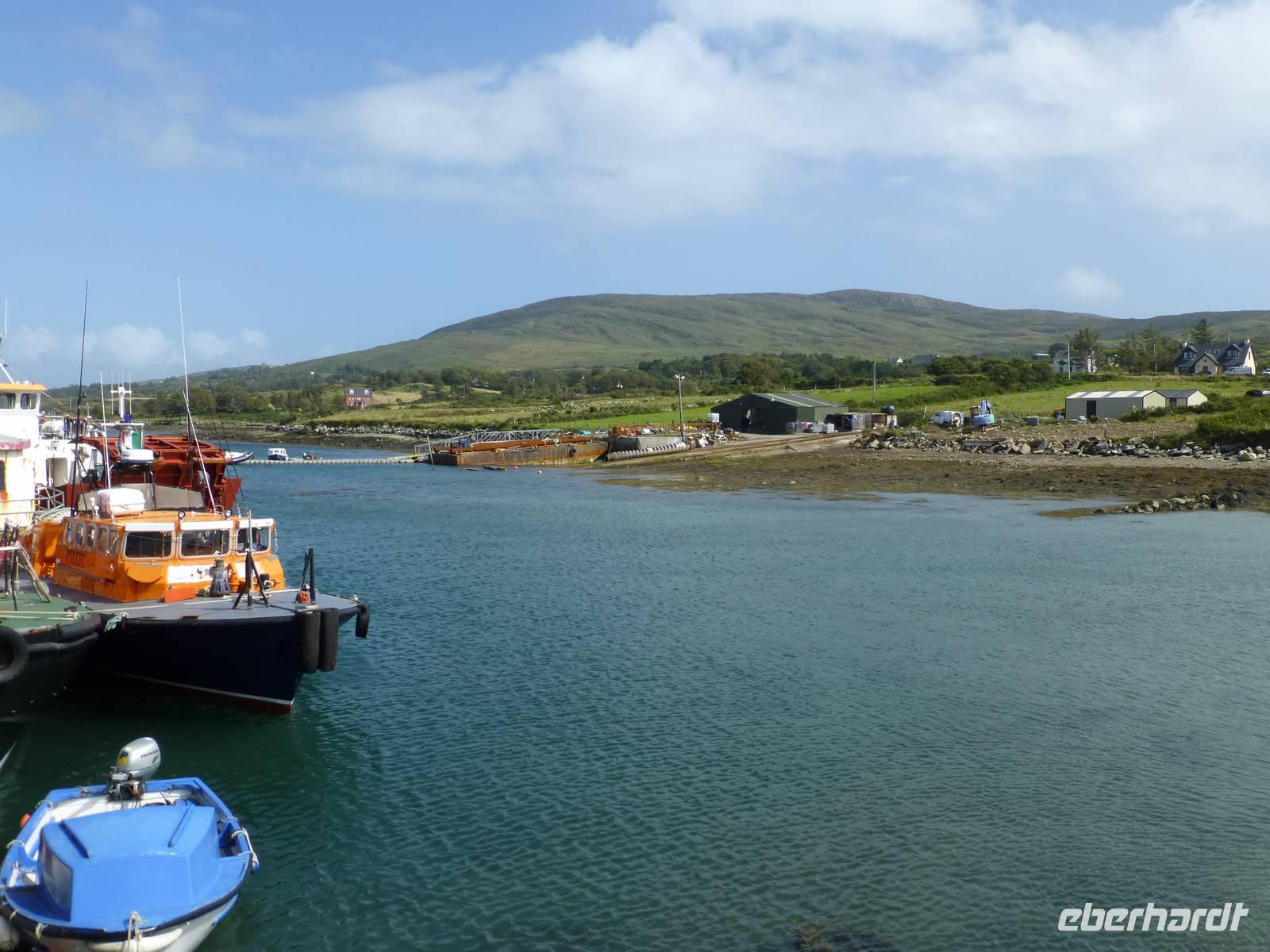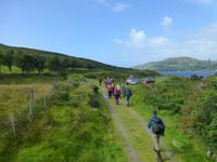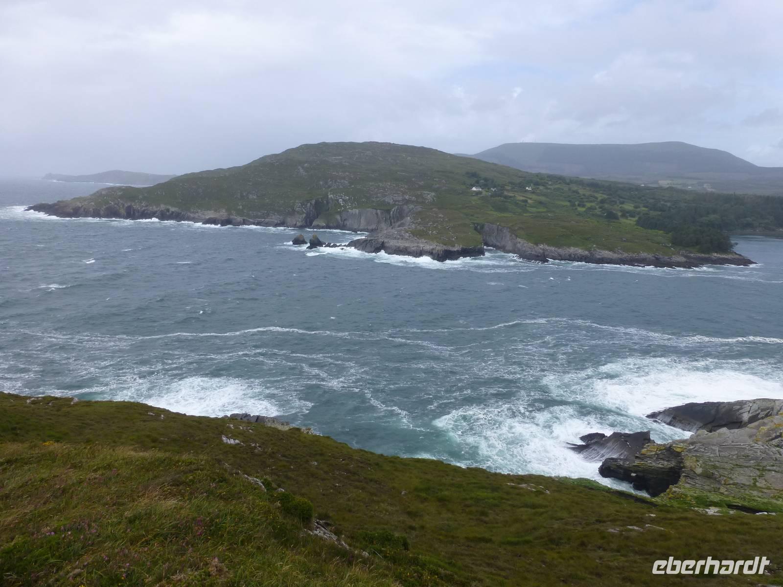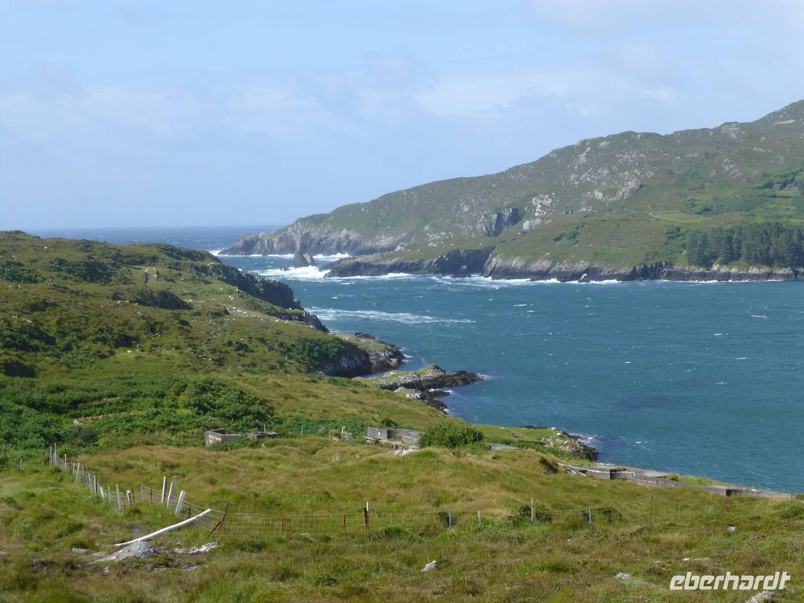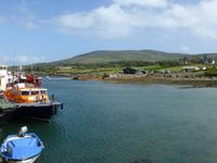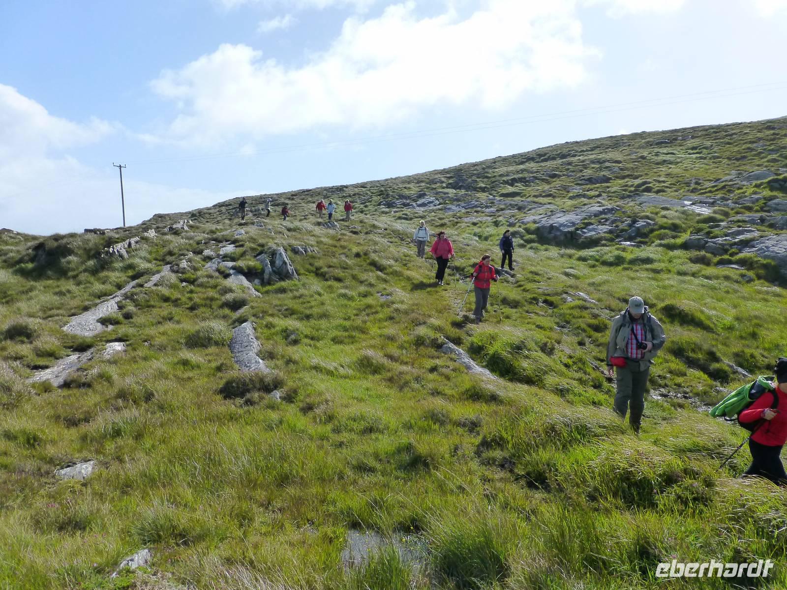 Unser Weg führt uns heute noch einmal nach Castletownbere, einem Ort mit natürlichem Tiefseehafen und der irischen Fischereischule. Nach der kurzen Überfahrt mit Bere Island Ferrys beginnen wir unsere Wanderung. Unterwegs begegnen wir alten Geschützstellungen der britischen Armee, dieses hatte bis 1936 Schiffe der Royal Navy hier in einem Vertragshafen stationiert. Über einen alten Fahrweg erreichen wir an der Westspitze von Bere Island den Ardnakinna Leuchtturm, welcher seit 1965 in Betrieb ist. Von jetzt an weht uns meist auch eine steife Brise ins Gesicht, wir werden mit reichlich Sauerstoff versorgt. Bergan, ab und zu durch feuchte Stellen geht es bis zum ehemaligen Signalturm, welcher 1964 bei einem Sturm einstürzte. Die Aussicht ist fantastisch, die Sonne lacht obwohl einige Wolkenfelder über uns hinweg ziehen. Wir nutzen diesen Platz für unsere Mittagspause. Wir gehen bergab, erreichen später einen Fahrweg und steigen hinauf zum weithin sichtbaren Kreuz, welches im Heiligen Jahr 1950 von den Bewohnern Bere Islands aufgestellt wurde. Nach dem Abstieg sehen wir noch einen "Standing Stone" aus vergangener Zeit und laufen dann auf der Straße wieder zur Fähre zurück. Zurück in Castletownbere wollen wir noch Mac Cartys's Bar besuchen. Heute ist die Kneipe jedoch so brechend voll, dass es keinen Platz gibt. In Irland ist „Bank Holiday" - verlängertes Wochenende - und gleichzeitig Regatta und Jahrmarkt in Castletownbere. Dieser Pub ist durch das gleichnamige Buch bekannt geworden. Im inneren fühlt man sich zurückversetzt in vergangene Zeiten, kann man doch hier auch noch Waschmittel, Kekse und reichlich andere Dinge kaufen. Wir fahren zurück nach Glengariff, gehen in einen Pub im Ort und lassen uns dort ein Bier oder einen Irish Coffee schmecken. Nach dem Abendessen verabschieden wir uns herzlich bei Jan, welcher die Gruppe die Tage zuvor auf allen Wanderungen geführt hat.